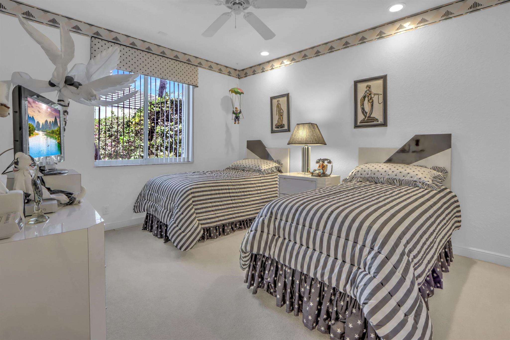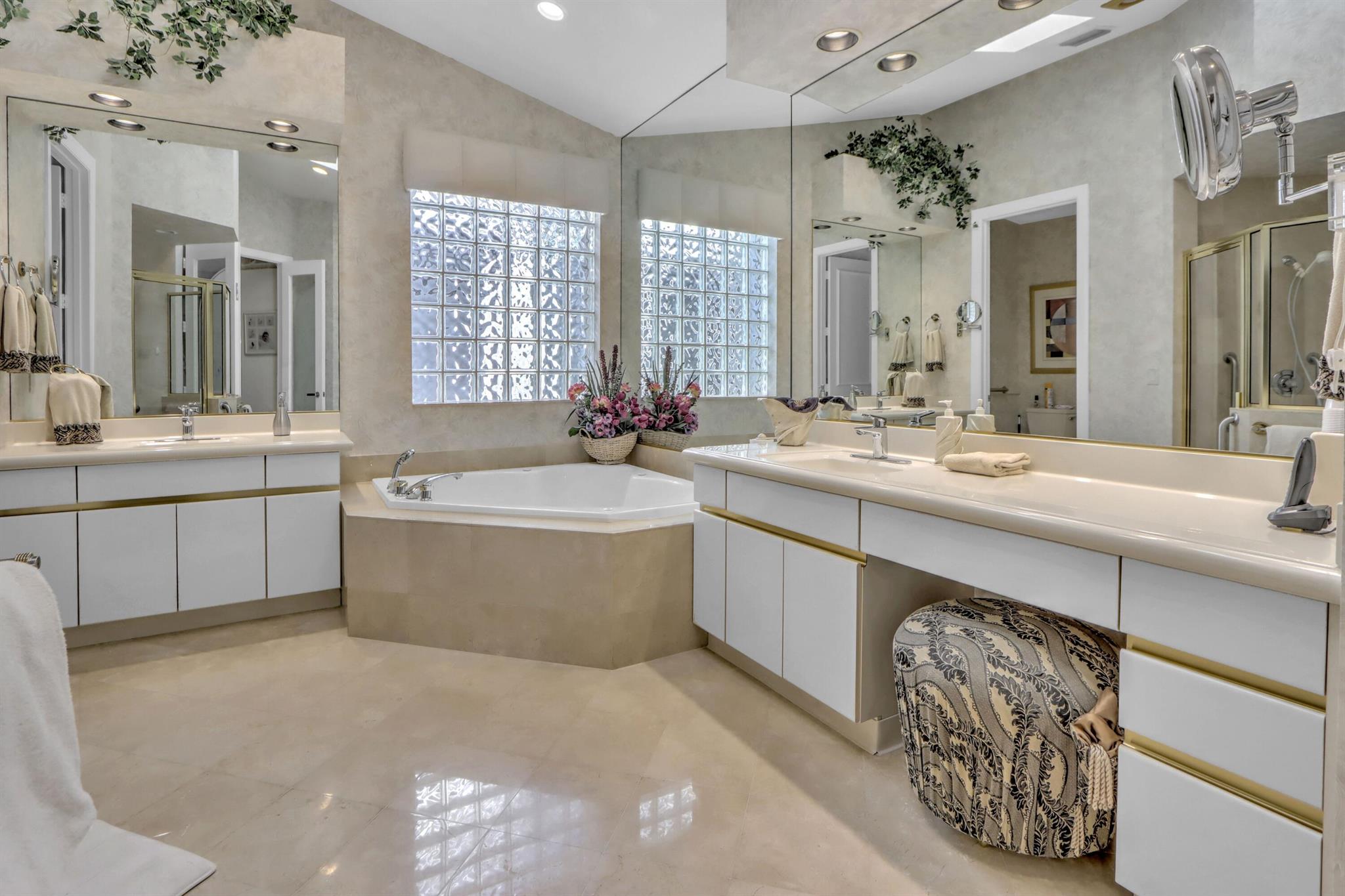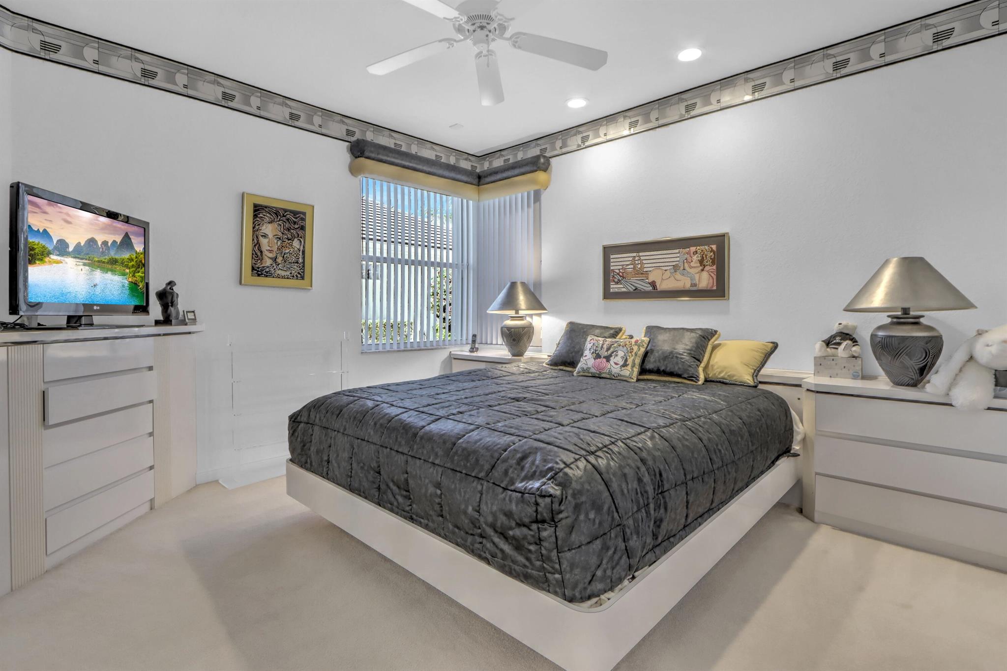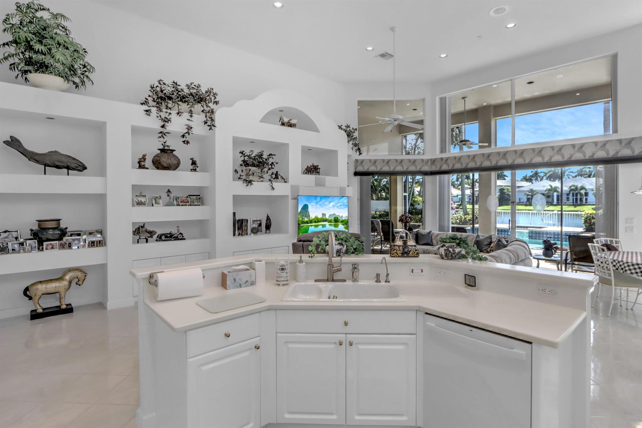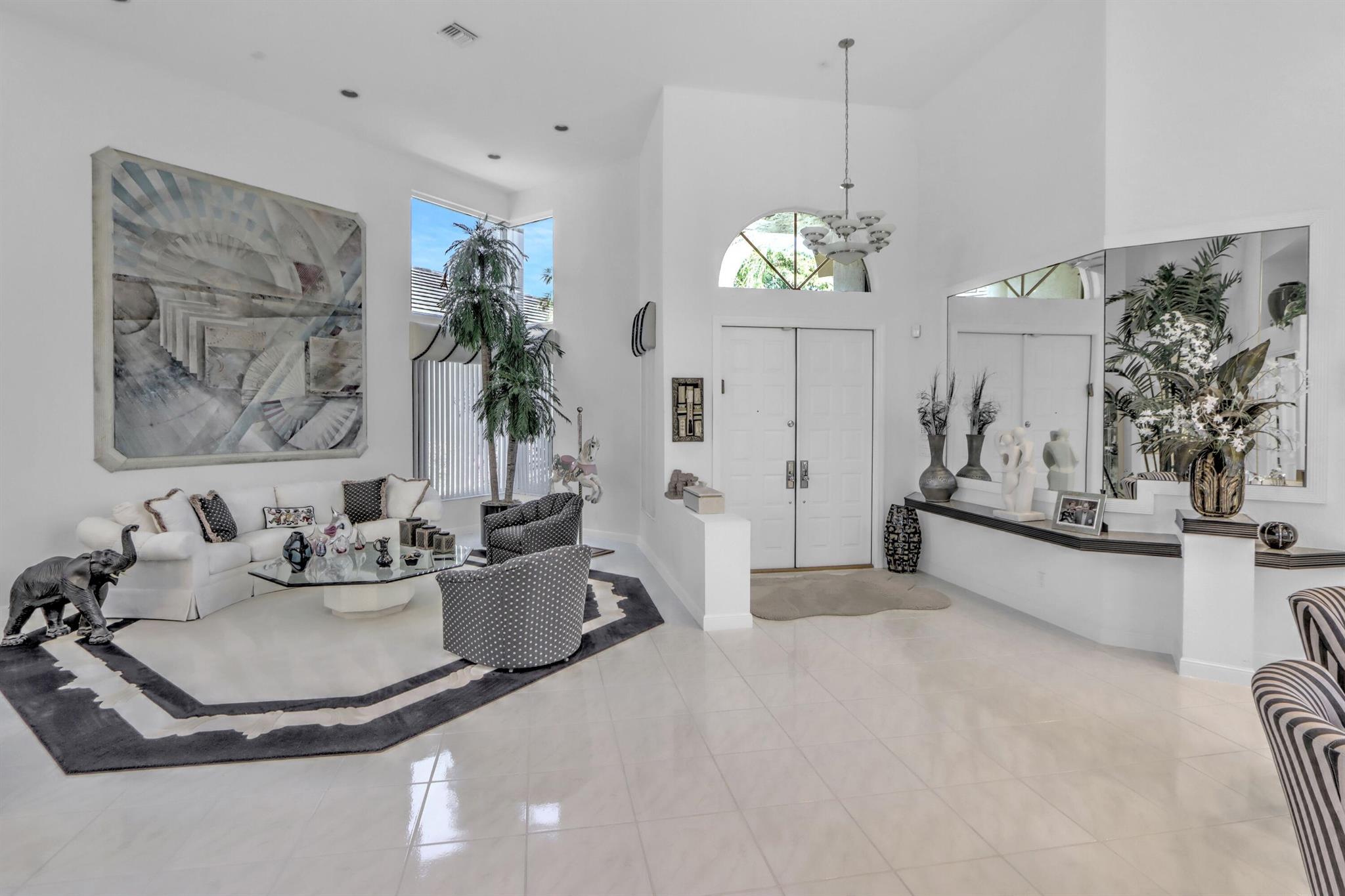 Tranquil lake views and sunlight fill this one-story home of 3 bedrooms plus an office - open & bright featuring volume ceilings with LED high-hat lighting; white neutral tile floors & beige carpeting; and a spacious open kitchen with white 42'' high-gloss cabinetry. The Primary Suite offers his & hers marble bathroom with elevated toilets; the Library has a built-in desk and shelves; the Living Room has a built-in wet bar with refrigerator and the Garage has epoxy flooring. Other features include sold core molded doors; central vacuum & water filtration systems; interior surveillance cameras. The backyard offers a screened patio & an open area with a pool & spa overlooking the lake. Offered furnished or unfurnished at the same price. Roof replaced in 2017.