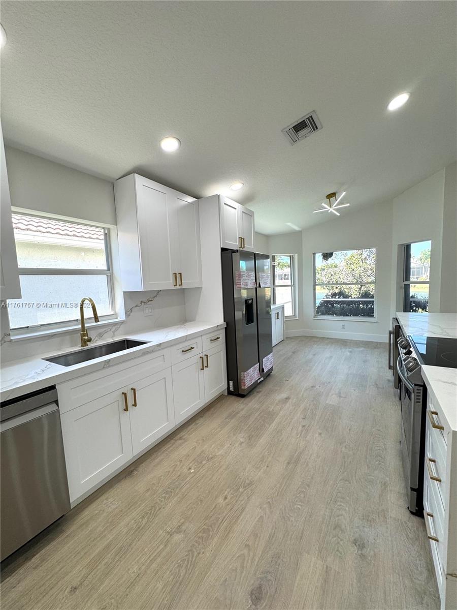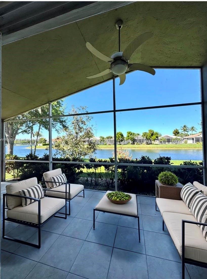 Welcome home to this beautiful 3 bed/2 bath waterfront home in Bellaggio! This highly coveted Ferrara model boasts an open/split floorpan and stunning lakefront views. Neutral, new floor runs throughout the majority of the home. Water views are enjoyed from the primary suite, living room, and oversized eat-in kitchen which also boasts white custom kitchen cabinets and a newer appliences. new bathrooms and new closets.The spacious primary suite includes two closets (one walk-in) and a gorgeous bathroom with dual sinks and walk-in tub. Take in the beautiful views and cool breeze as you enjoy your coffee or cocktail on the screened-in lanai. Bellaggio is a 55+ Active Gated Community that offers Pickle-ball, Tennis, Billiards, a Cafe/Restaurant, Clubhouse, Gym, Indoor and Outdoor Pools.