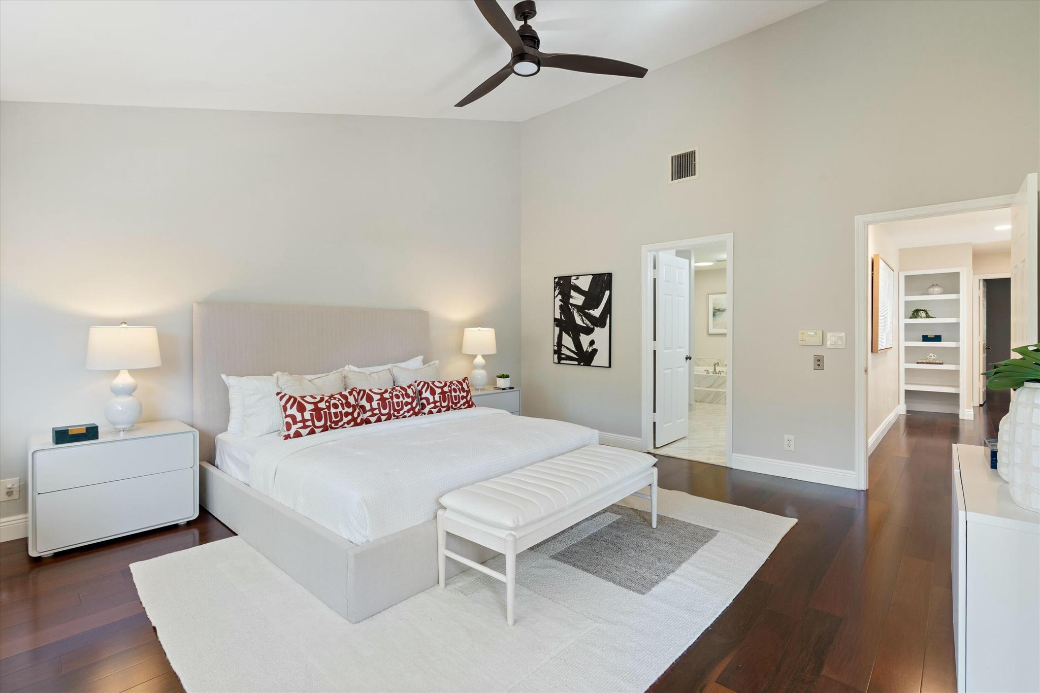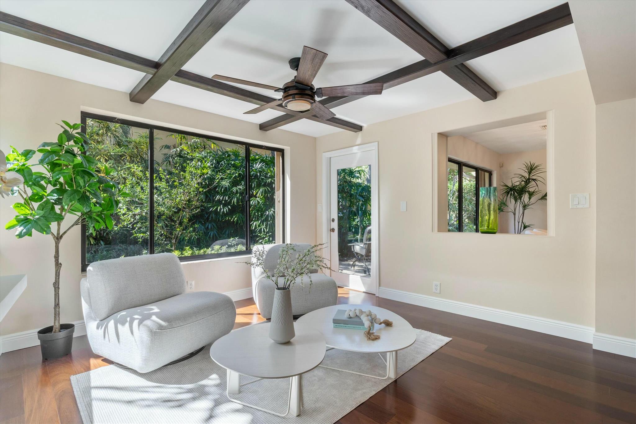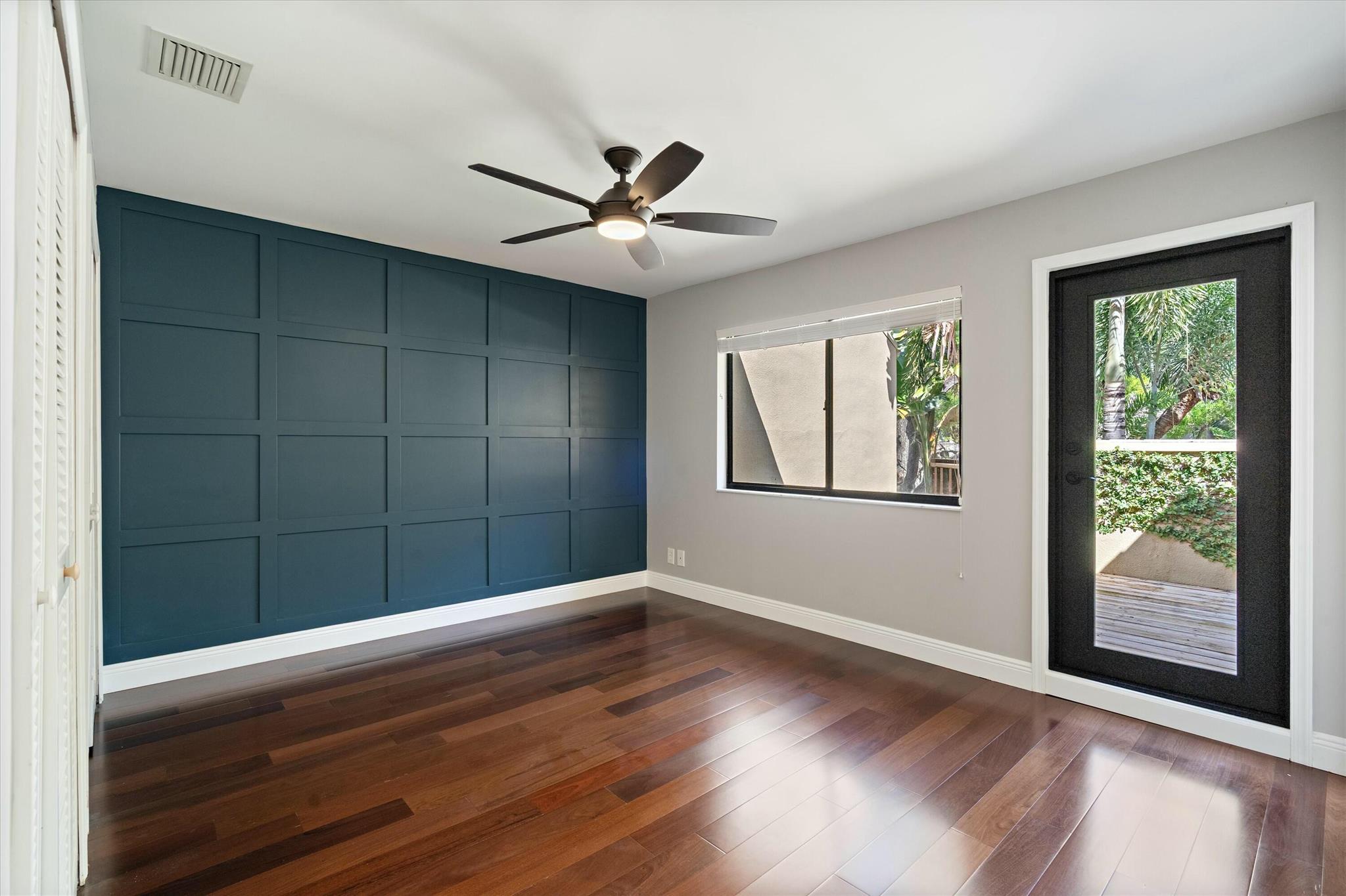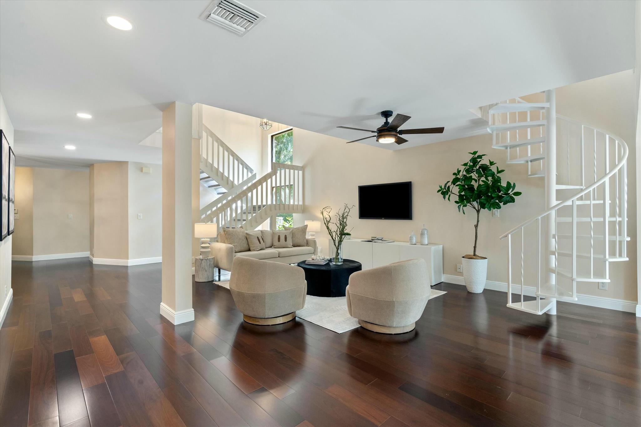 LARGEST townhome in the community! NO STEP DOWNS!!! Brazilian walnut engineered hardwood flooring throughout. large windows, lots of sunshine makes this unit bright and airy!! Soaring ceilings, large rooms, open staircase, tons of kitchen cabinets. Beautiful home office. Whimsical, secret-garden like landscaping with corner lagoon view. Primary suite has large professionally outfitted walk-in closet, Large marble bathroom with double sinks, dressing areas, separate shower and tub. Freshly painted 2+ car garage. Within walking distance to FAU Campus and Baptist/Hospital Boca Campus, 3 miles or 7 mins to the BEACH!! Close to shopping, restaurants, Mizner Park, the new Boca library, Boca Museum and I-95. This is a very special, sophisticated home.