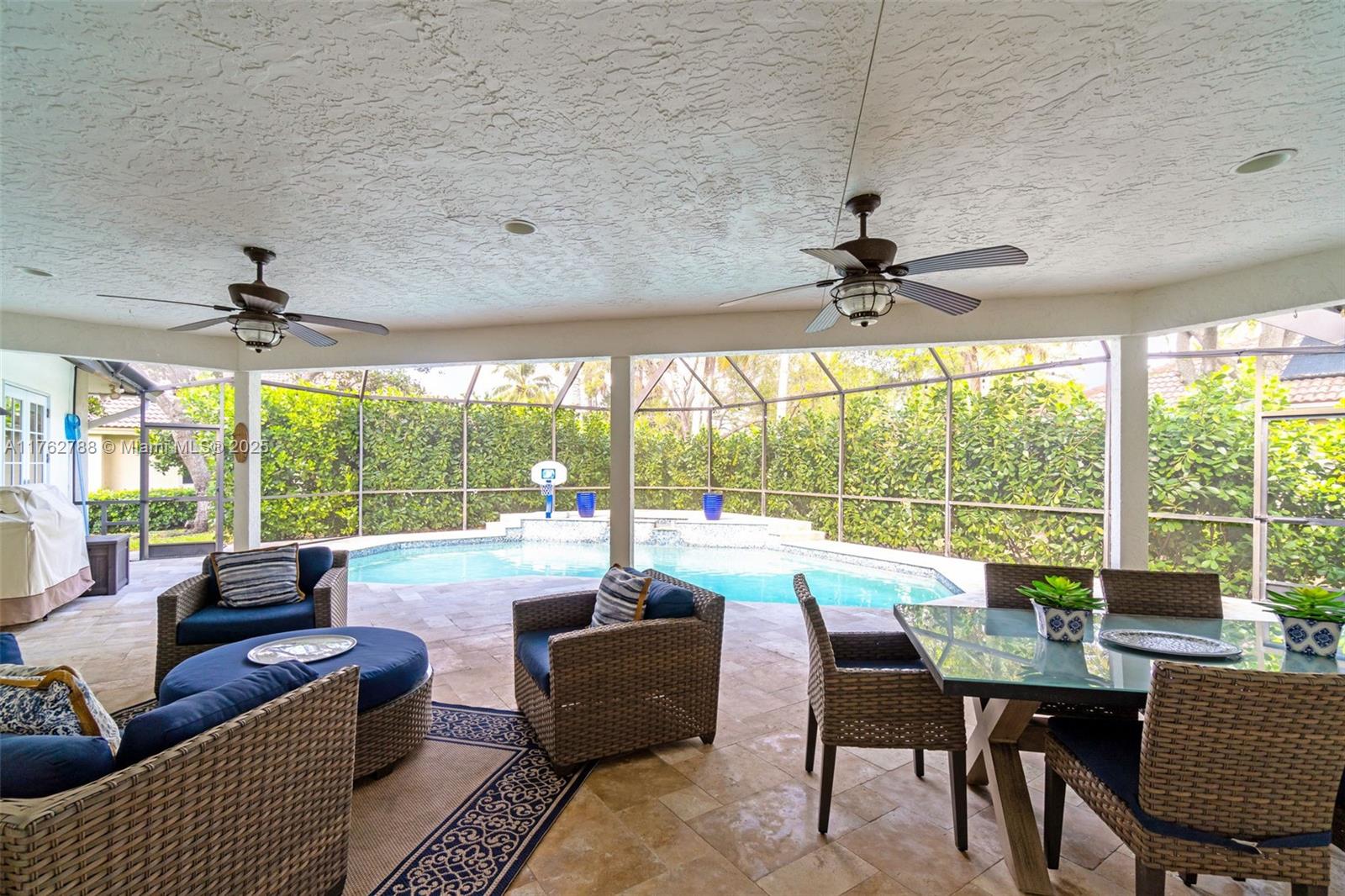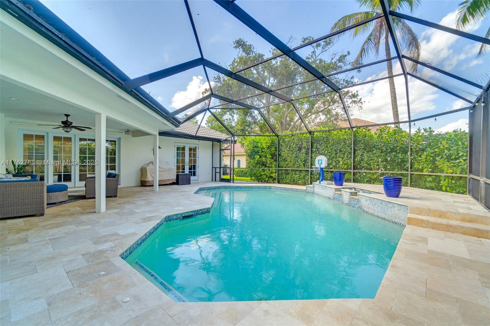 Nestled in the highly sought-after Palm Island community in Weston, this stunning corner-lot home offers A-rated schools and luxury living! Enjoy breathtaking pool view throughout, soaring ceilings, crown moldings, and abundant natural light. Gourmet kitchen features exquisite Taj Mahal countertops and a wine fridge, while custom closets provide ample storage. French doors open to a serene backyard with a saltwater pool, covered patio, and lush privacy hedges. The huge 5th bedroom can serve as a playroom or an extra master suite. Updated primary bathroom, with engineered hardwood floors in primary bedroom, Murphy bed in one of the bedrooms making it spacious. A circular driveway plus an additional side driveway offer plenty of parking. Steps from the community park—this home is a must-see!