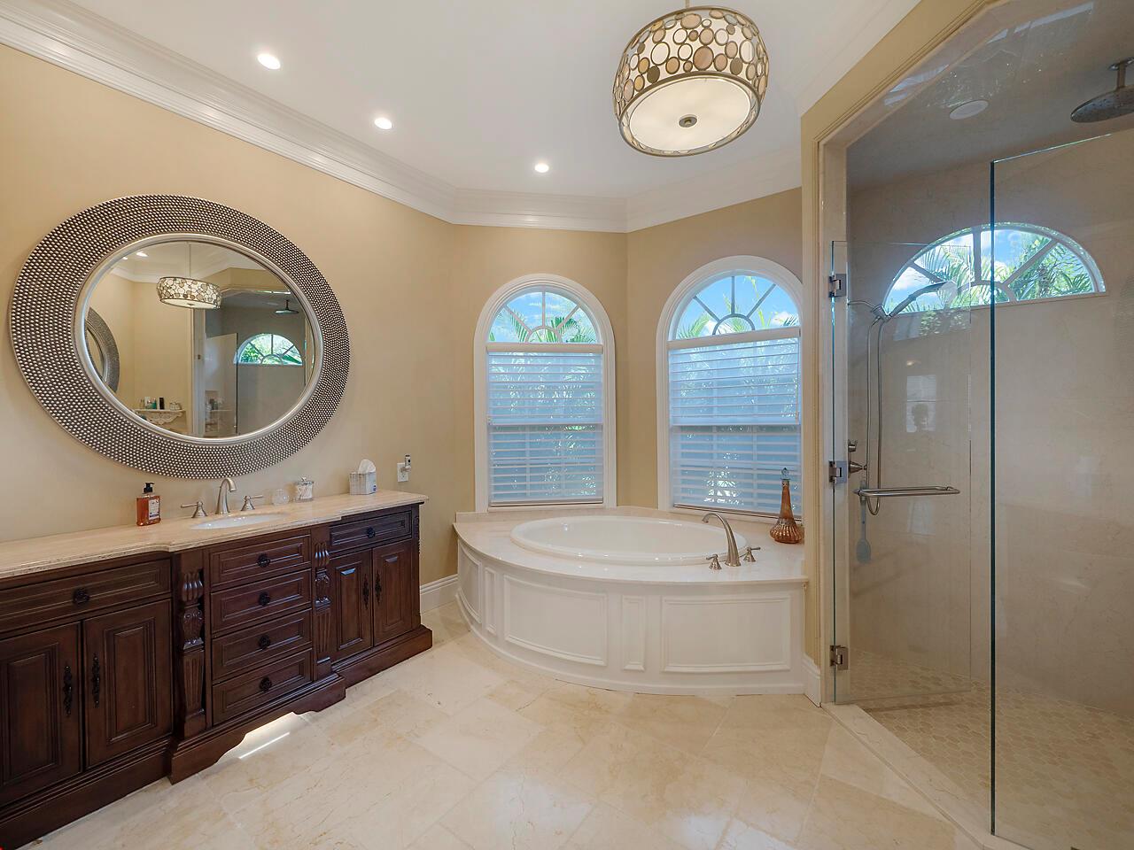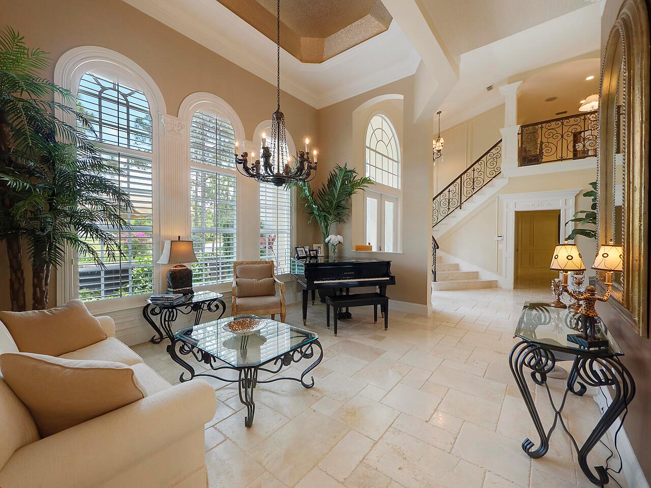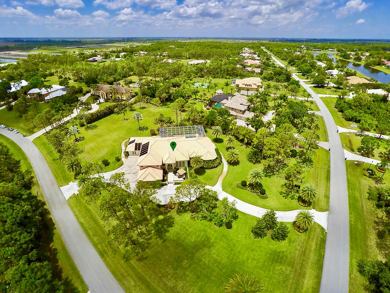Estate home located in the prestigious community of PGA Village. Found in the Sabal Creek subdivision, this 2 story Mediterranean is situated on 1.7 acres. Property has a main house and an attached guest house, 3 car garage and large circular drive. Entire residence impeccably finished. French Cut Crema Marfil Marble flooring throughout, custom trim, crown molding, plantation shutters, 4000 SF main living quarters consist of 5BD and 3BA. Dramatic 2 story formal living room. Large dining room. Family room opens to a true chef's kitchen. State of the art appliances, custom cabinetry and a 6'x12' granite island. Adjoining Guest house complete with full kitchen, living room, 2BD and full BA. Large Screened Pool area with Tiki bar and covered Loggia. Grand home. Premier community. Paradise.