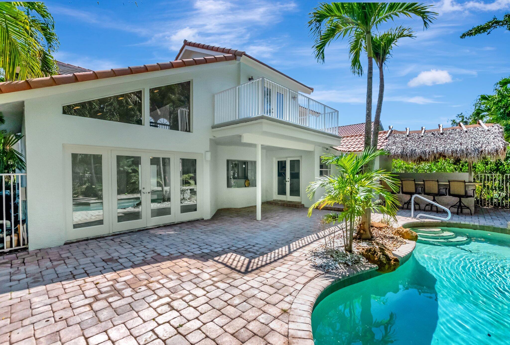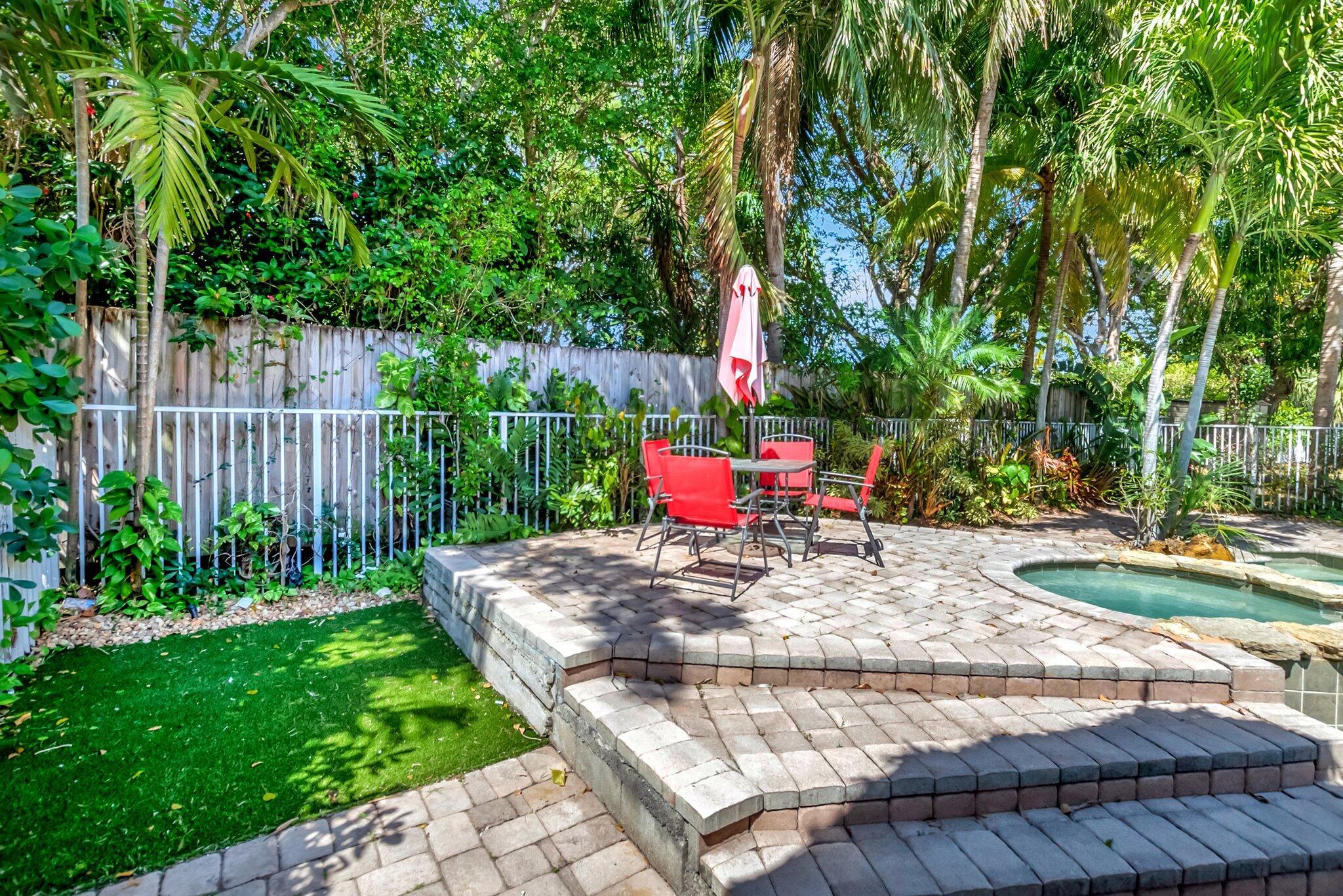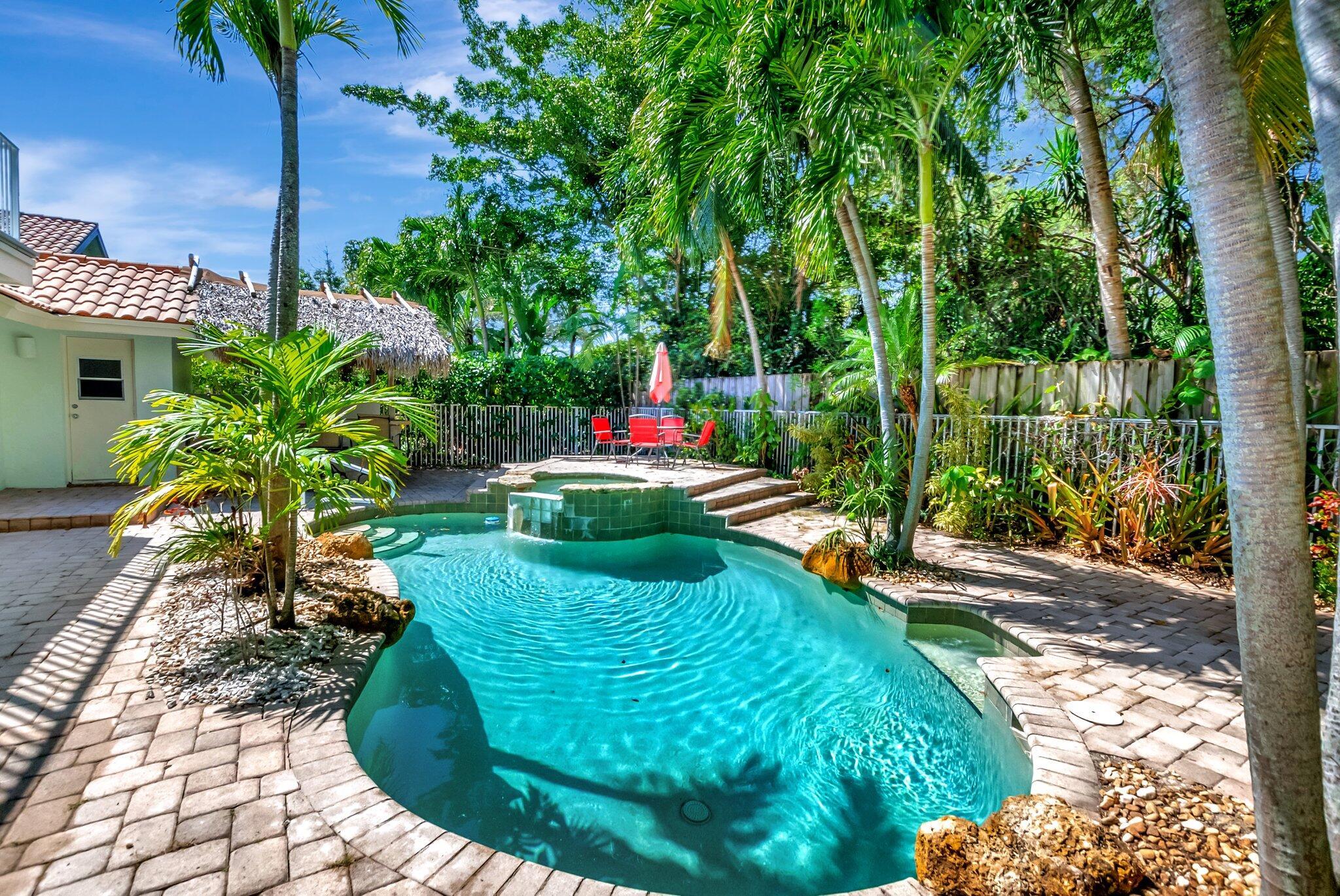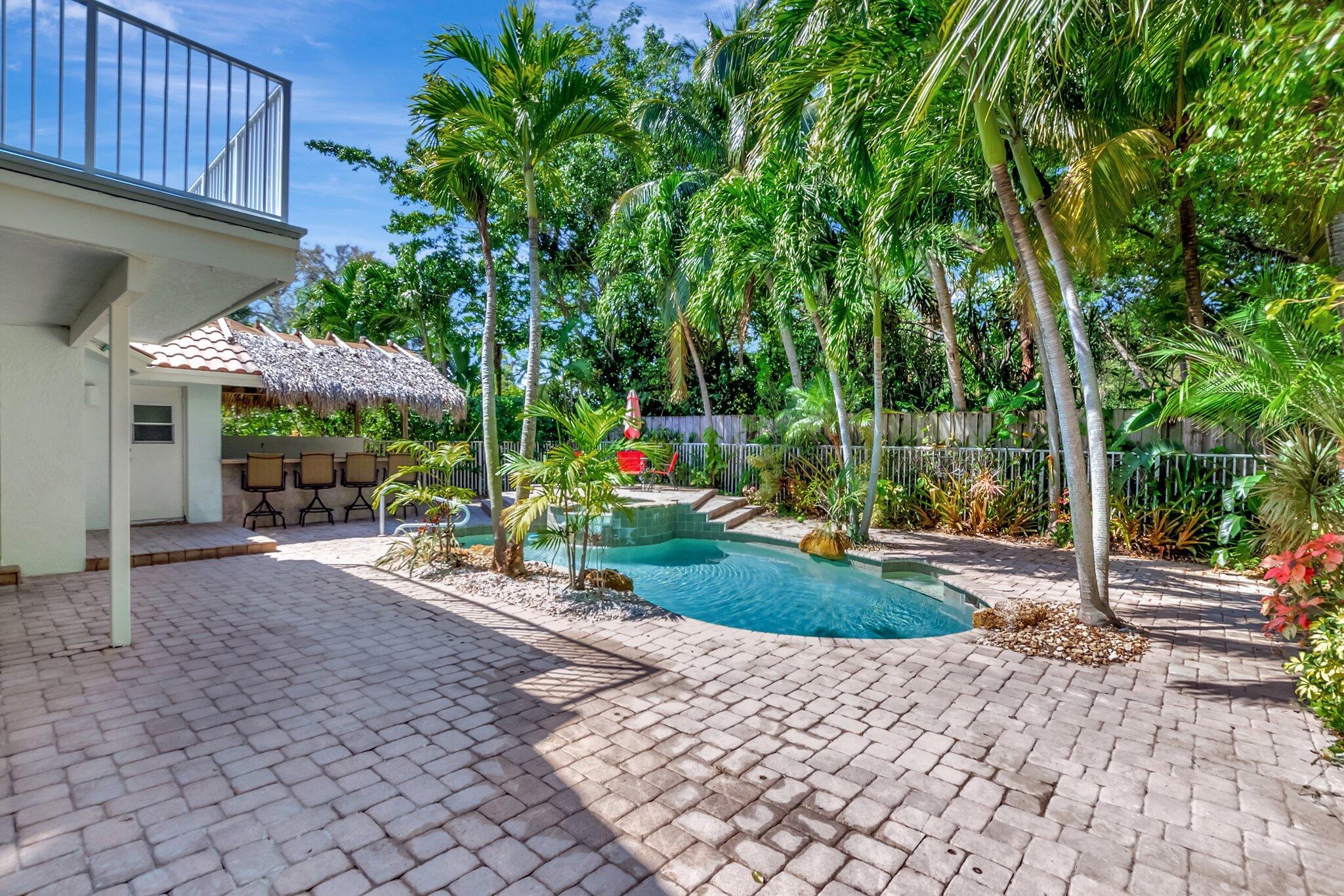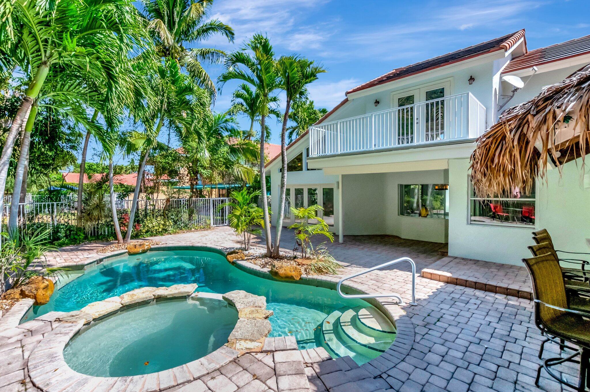 Fantastic home in a prime location! Features include Chicago brick driveway, tropical landscape, new flooring, S Tile roof (2015), A/C 2016 and 2017, Certainteed Residential Solar Tiles, large front yard, vaulted ceilings, freshly painted interior and exterior, stone fireplace with electric insert, kitchen cabinets were professionally painted, GE monogram refrigerator, Jenn Air double ovens, built in wine fridge, decorative glass cabinets, open floorplan with great space for entertaining, Good size primary bedroom with large bathroom, walk in closet, and a balcony. The back yard is a tropical paradise with a kidney shaped pool with tropical landscape, pavers, tiki bar, pool and spa are heated. All of this within walking distance to shops, restaurants and places of worship