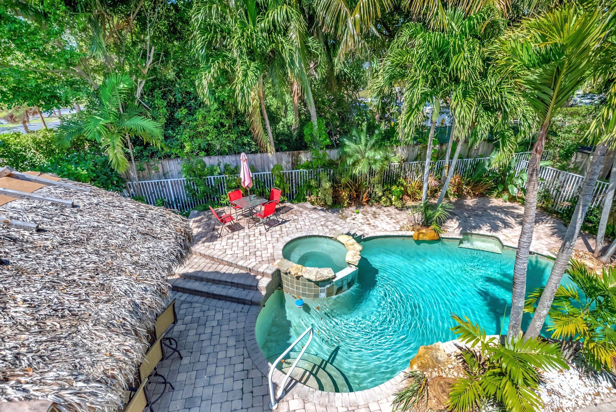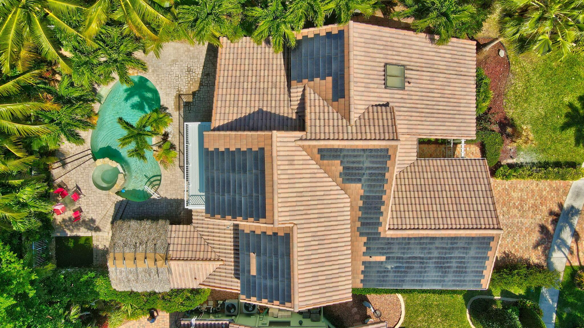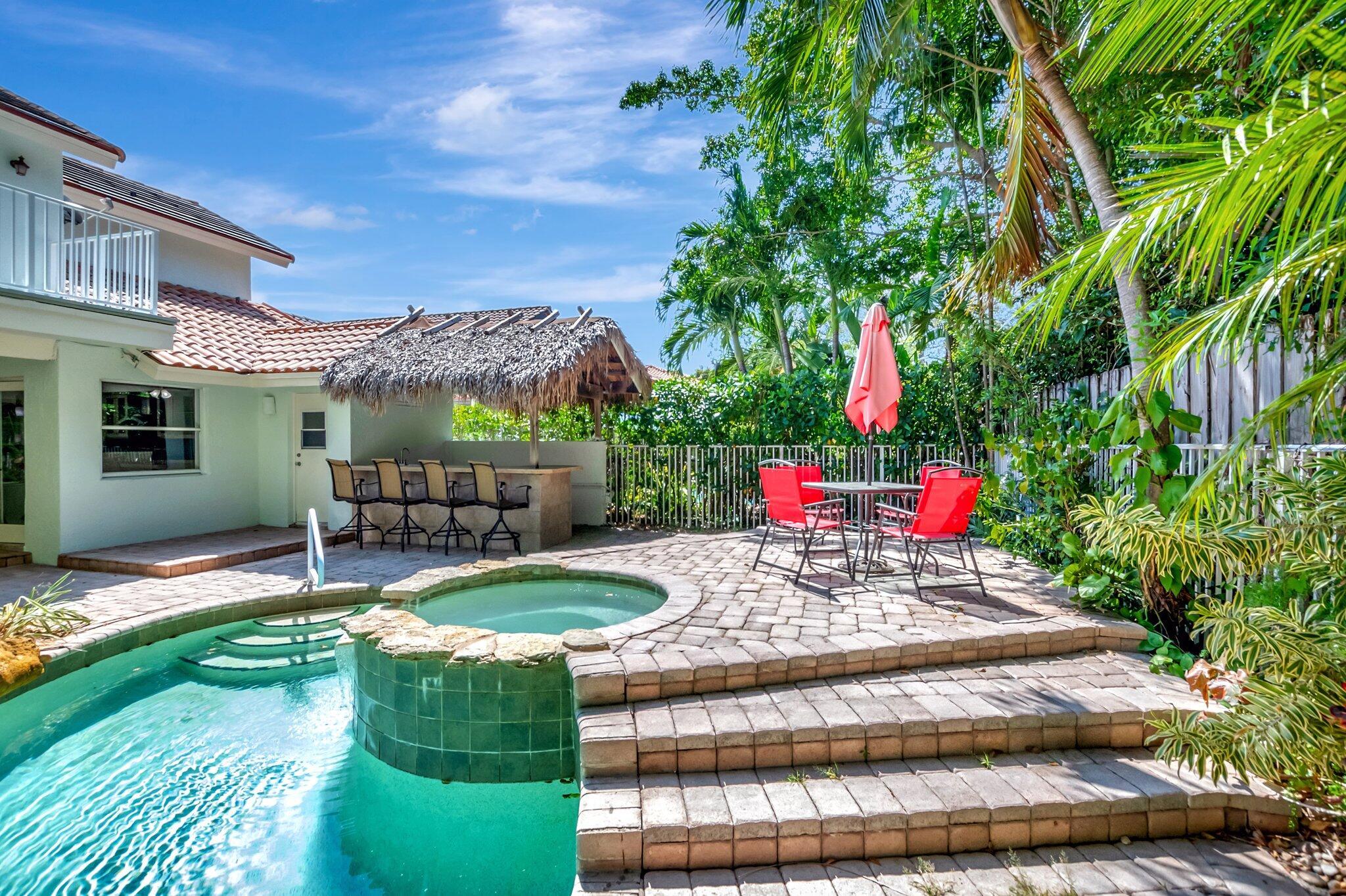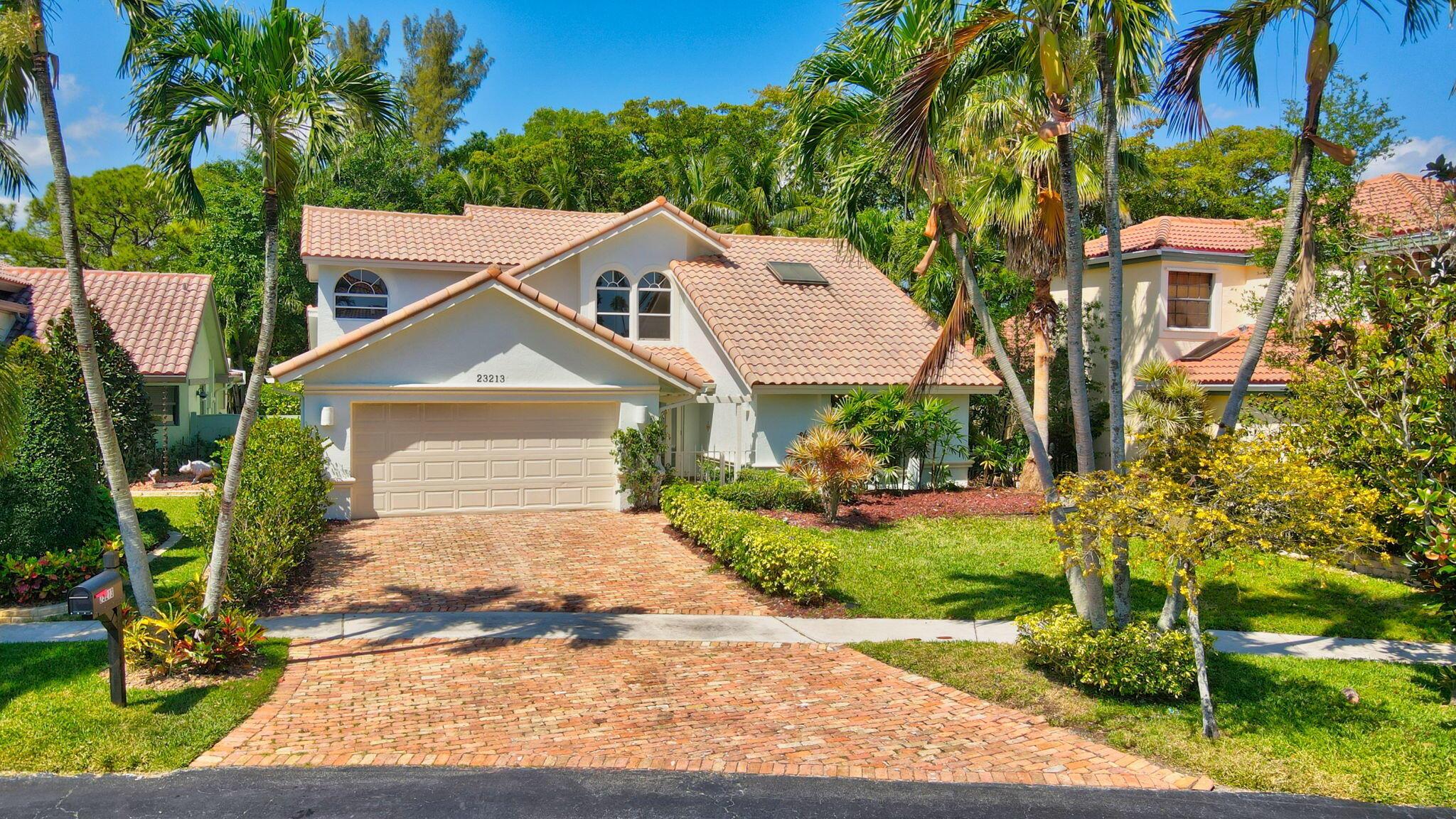 Fantastic home in a prime location! Features include Chicago brick driveway, tropical landscape, new flooring, S Tile roof (2015), A/C 2016 and 2017, Certainteed Residential Solar Tiles, large front yard, vaulted ceilings, freshly painted interior and exterior, stone fireplace with electric insert, kitchen cabinets were professionally painted, GE monogram refrigerator, Jenn Air double ovens, built in wine fridge, decorative glass cabinets, open floorplan with great space for entertaining, Good size primary bedroom with large bathroom, walk in closet, and a balcony. The back yard is a tropical paradise with a kidney shaped pool with tropical landscape, pavers, tiki bar, pool and spa are heated. All of this within walking distance to shops, restaurants and places of worship