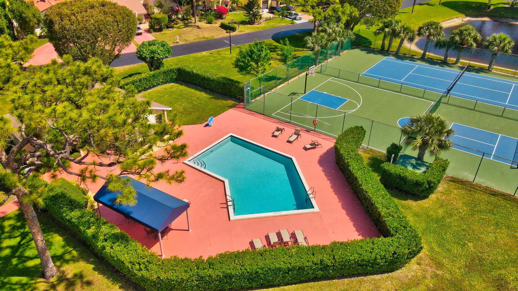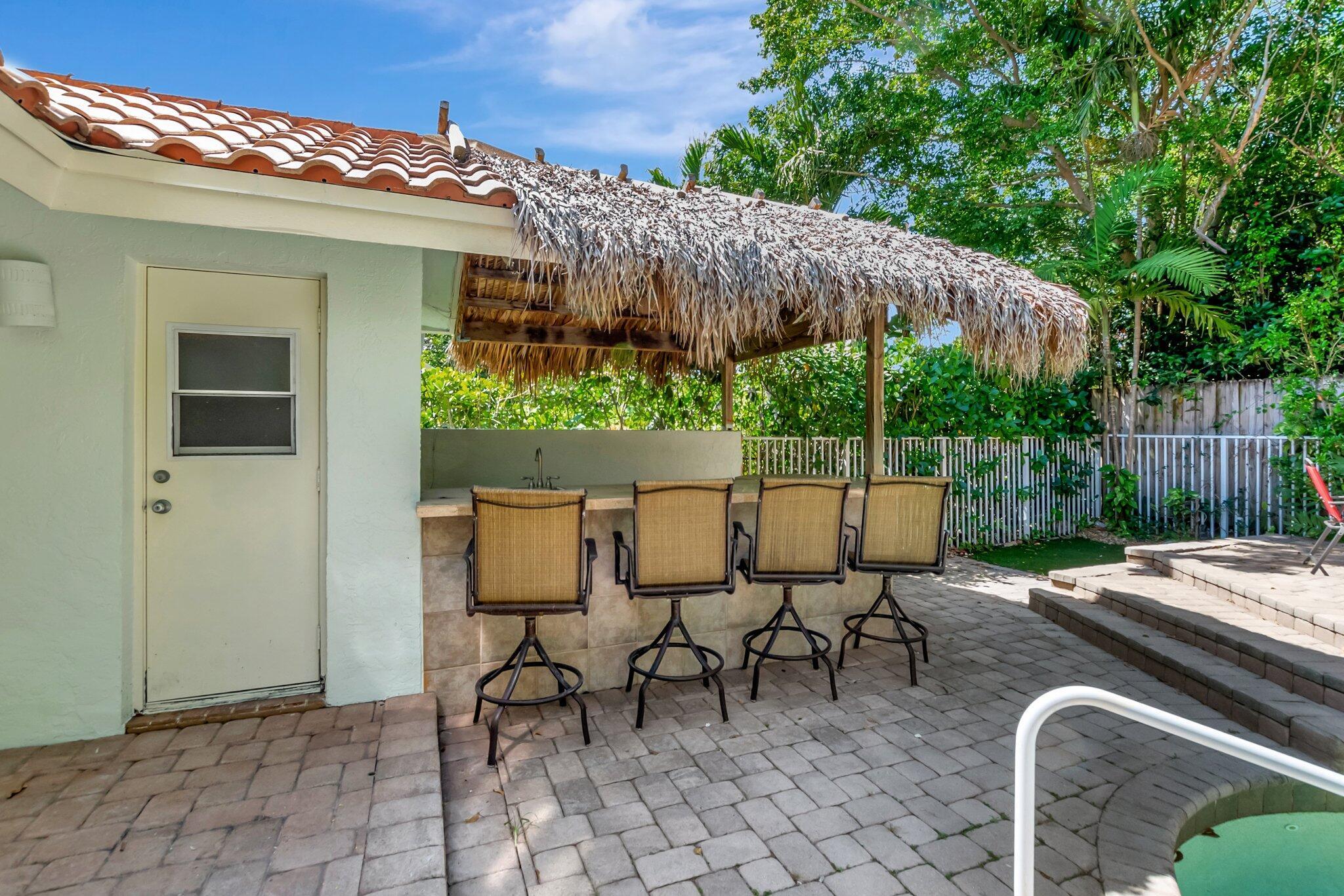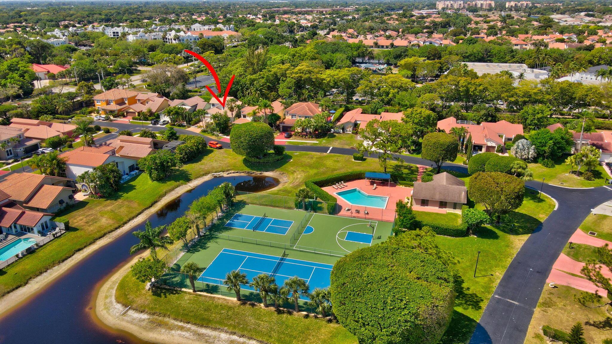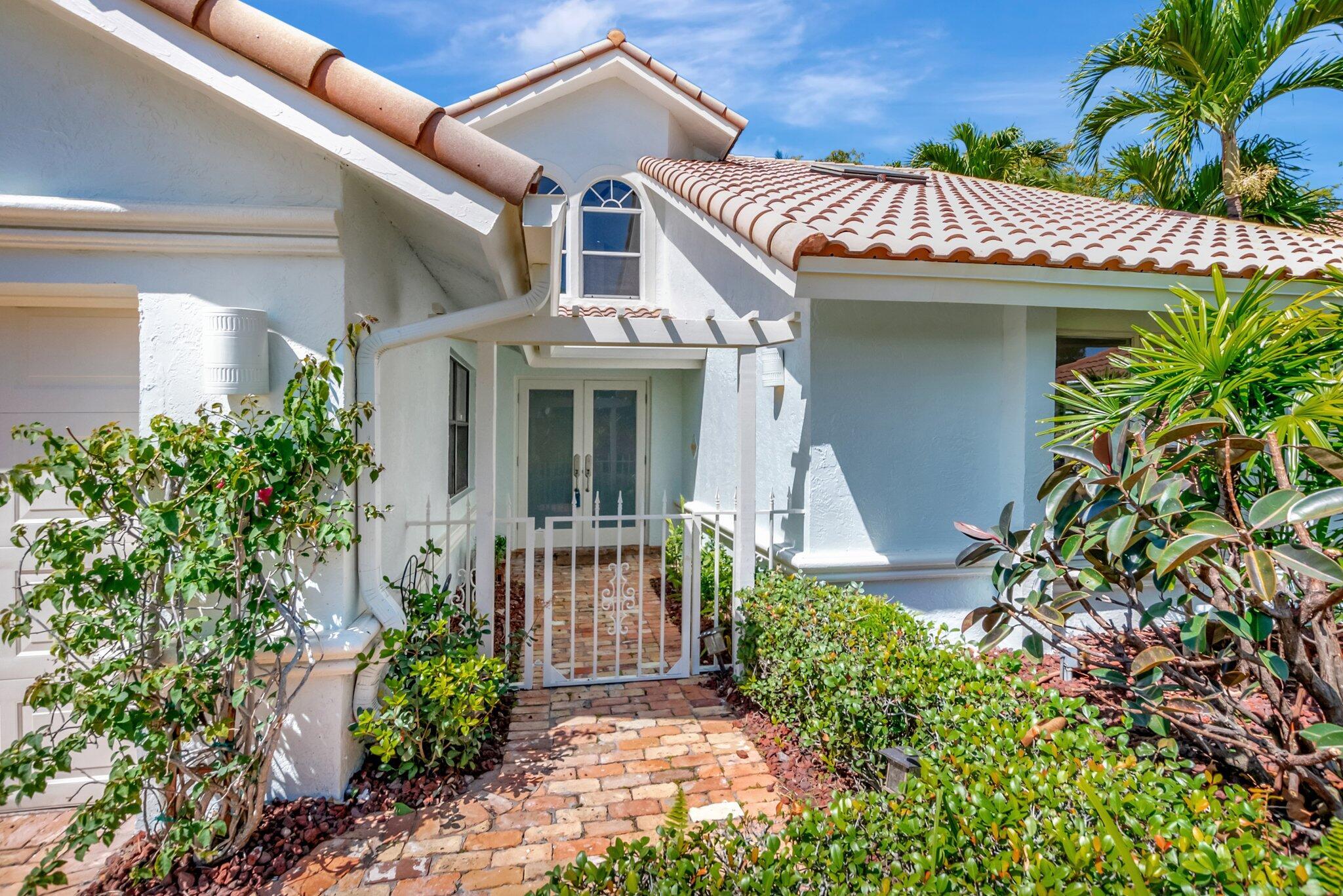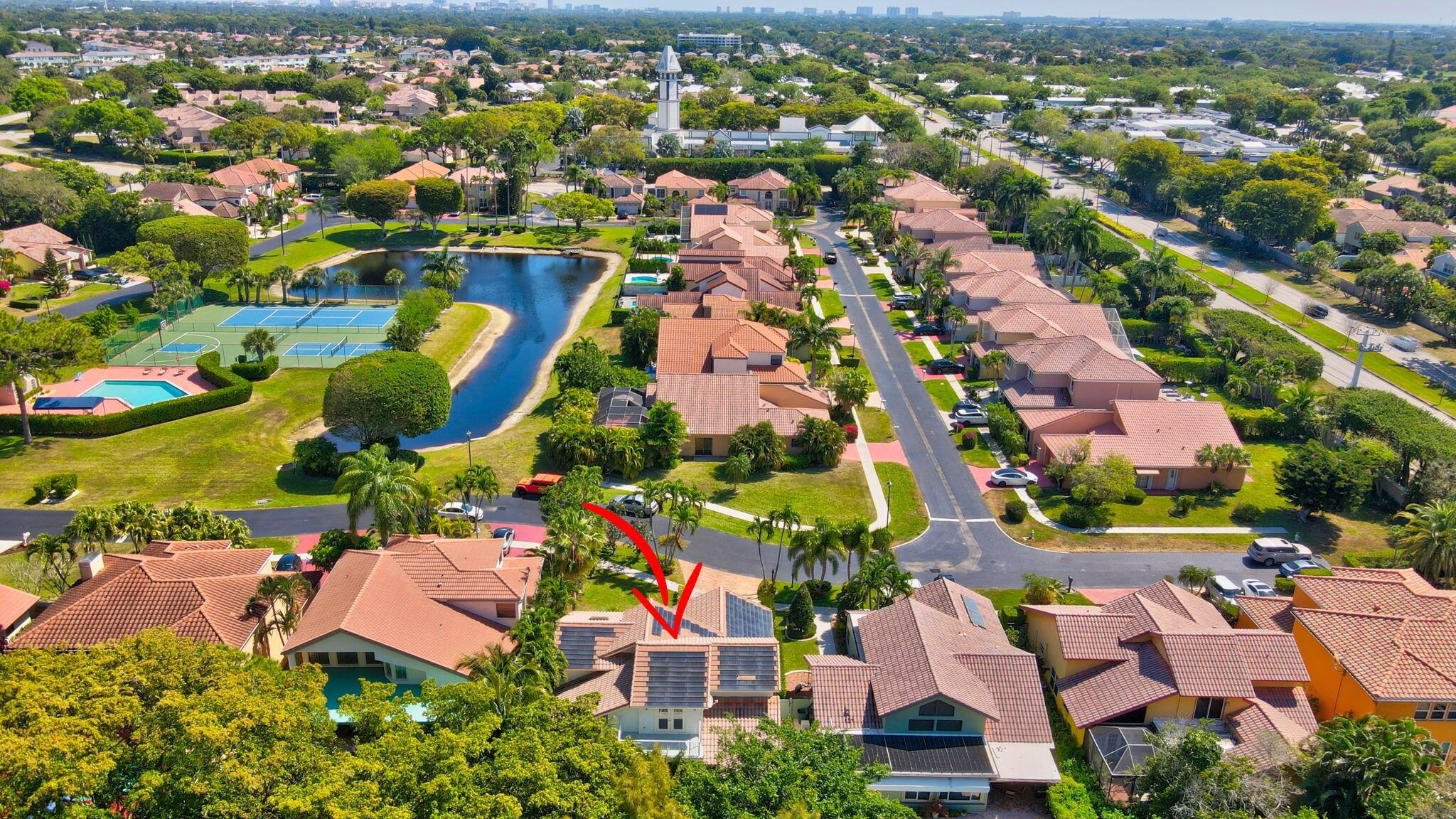 Fantastic home in a prime location! Features include Chicago brick driveway, tropical landscape, new flooring, S Tile roof (2015), A/C 2016 and 2017, Certainteed Residential Solar Tiles, large front yard, vaulted ceilings, freshly painted interior and exterior, stone fireplace with electric insert, kitchen cabinets were professionally painted, GE monogram refrigerator, Jenn Air double ovens, built in wine fridge, decorative glass cabinets, open floorplan with great space for entertaining, Good size primary bedroom with large bathroom, walk in closet, and a balcony. The back yard is a tropical paradise with a kidney shaped pool with tropical landscape, pavers, tiki bar, pool and spa are heated. All of this within walking distance to shops, restaurants and places of worship