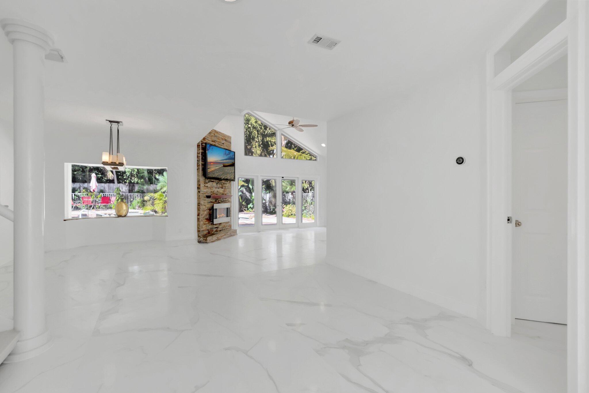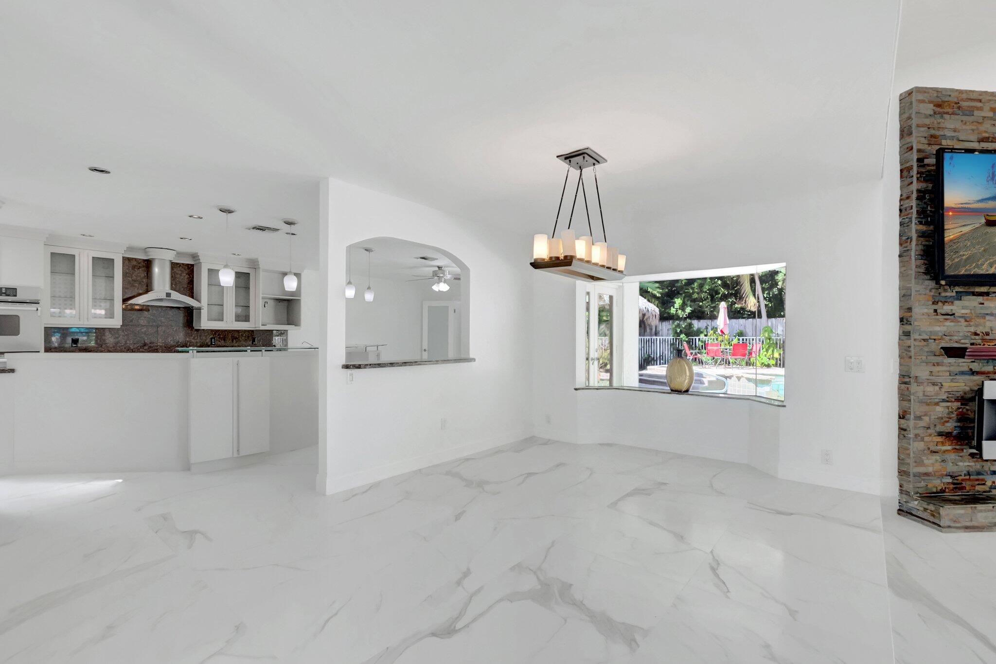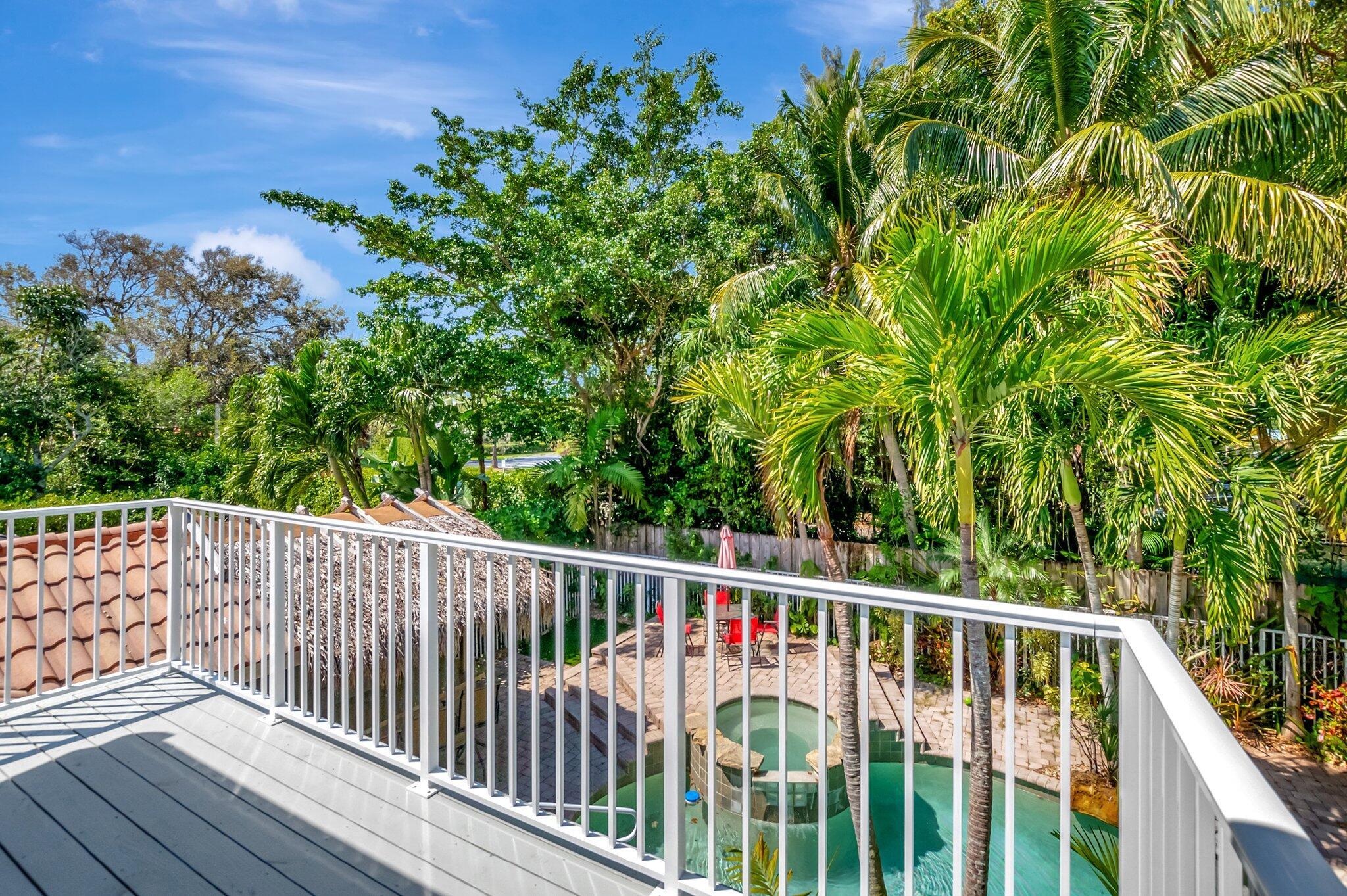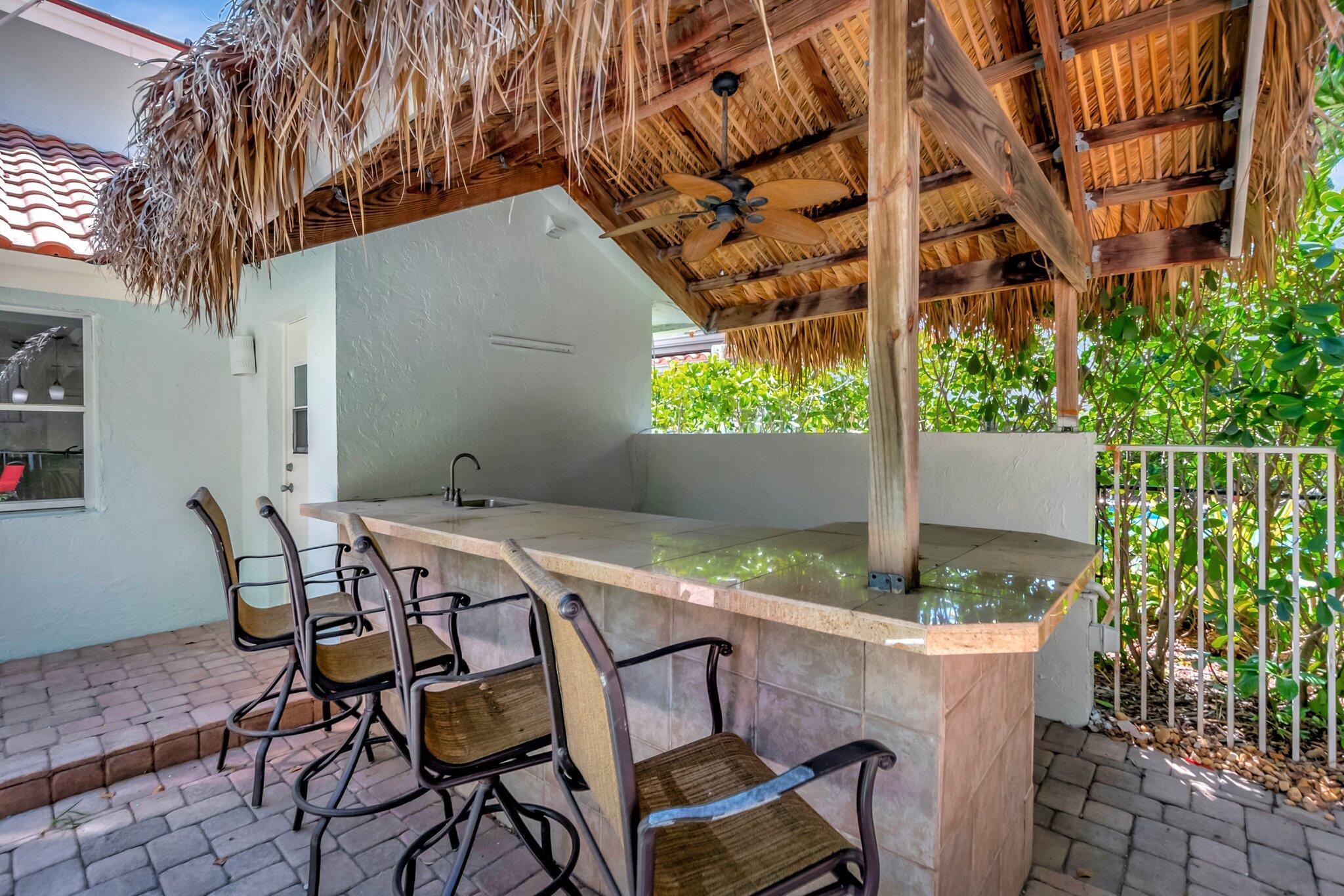 Fantastic home in a prime location! Features include Chicago brick driveway, tropical landscape, new flooring, S Tile roof (2015), A/C 2016 and 2017, Certainteed Residential Solar Tiles, large front yard, vaulted ceilings, freshly painted interior and exterior, stone fireplace with electric insert, kitchen cabinets were professionally painted, GE monogram refrigerator, Jenn Air double ovens, built in wine fridge, decorative glass cabinets, open floorplan with great space for entertaining, Good size primary bedroom with large bathroom, walk in closet, and a balcony. The back yard is a tropical paradise with a kidney shaped pool with tropical landscape, pavers, tiki bar, pool and spa are heated. All of this within walking distance to shops, restaurants and places of worship