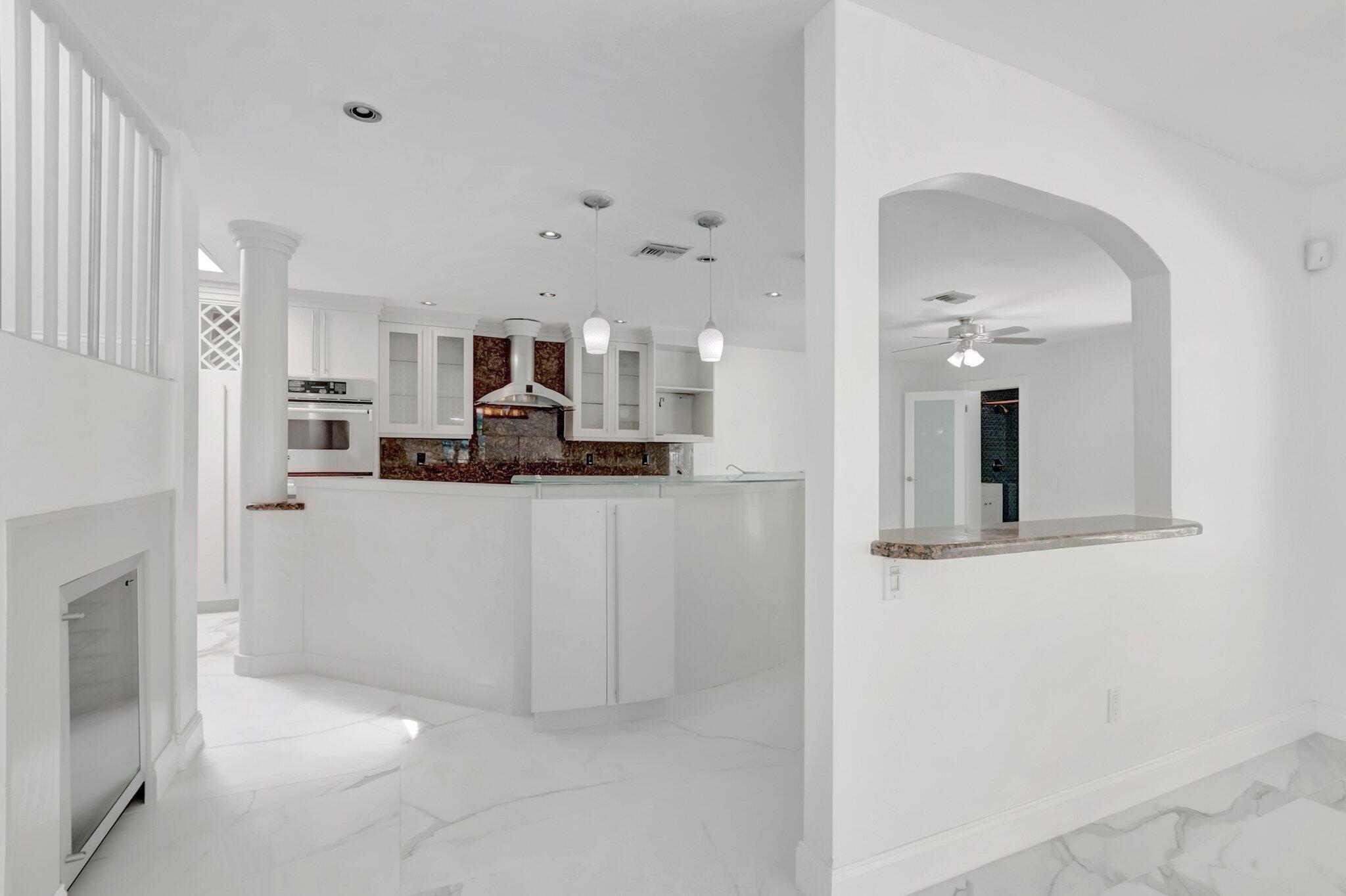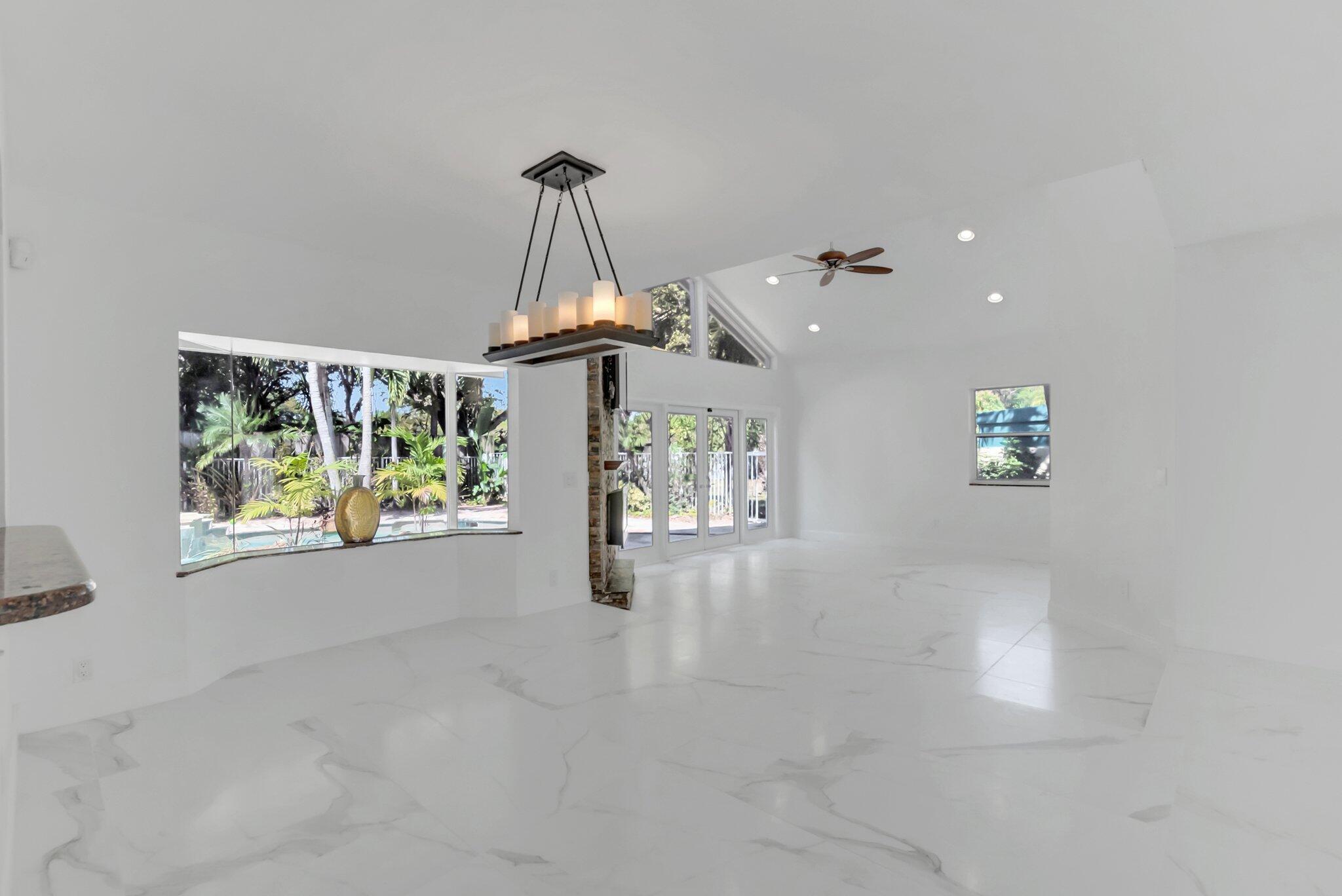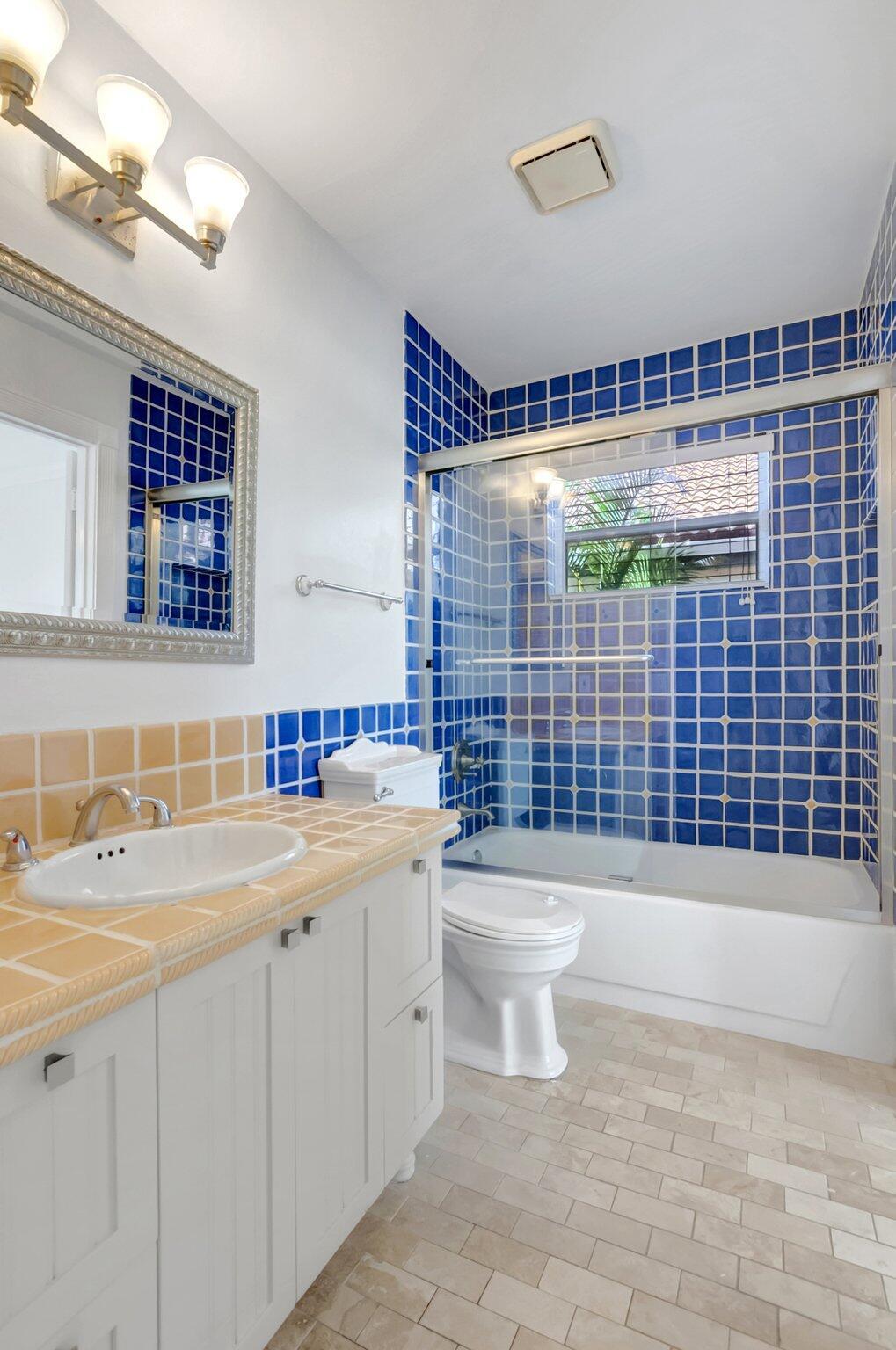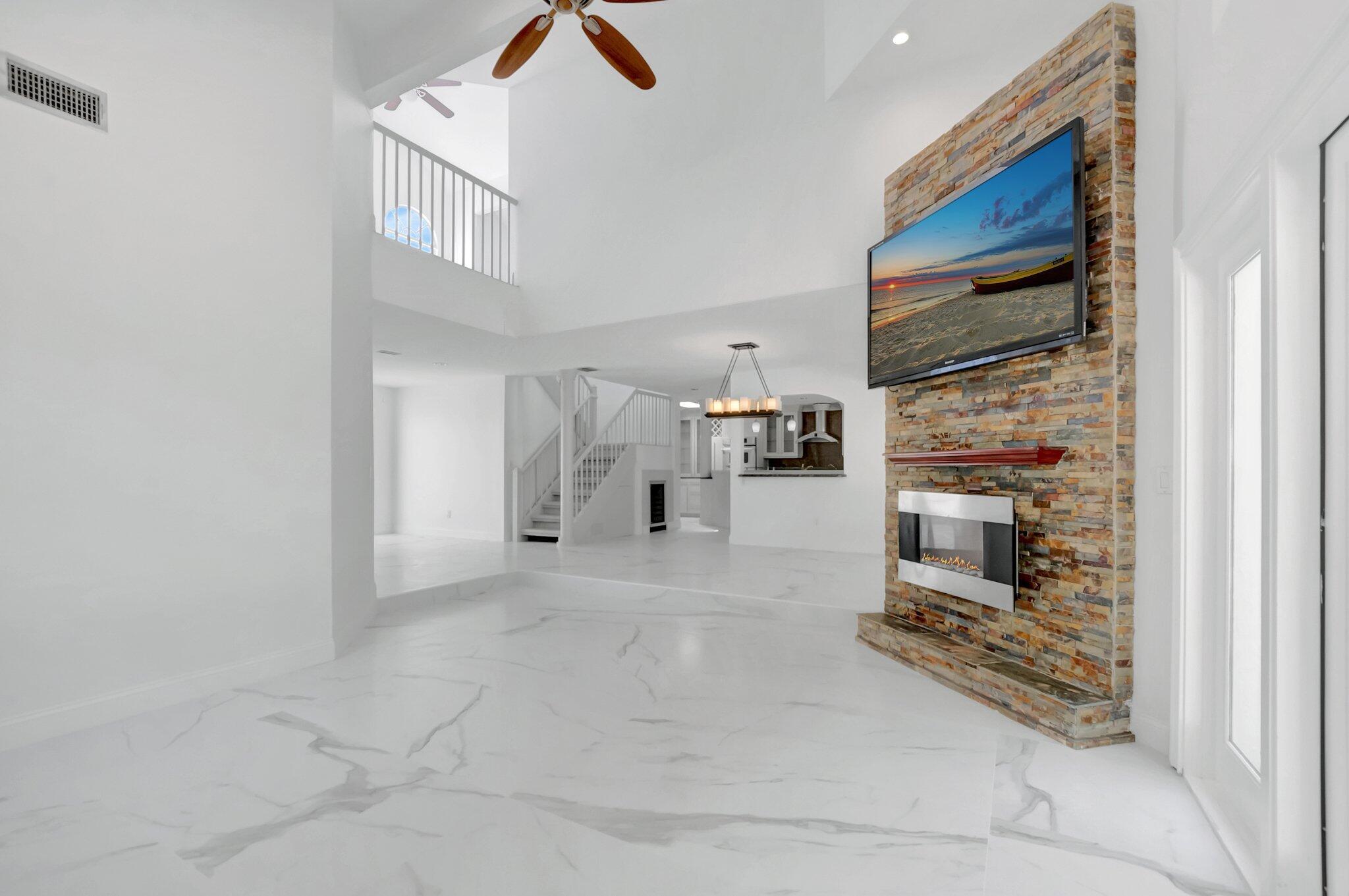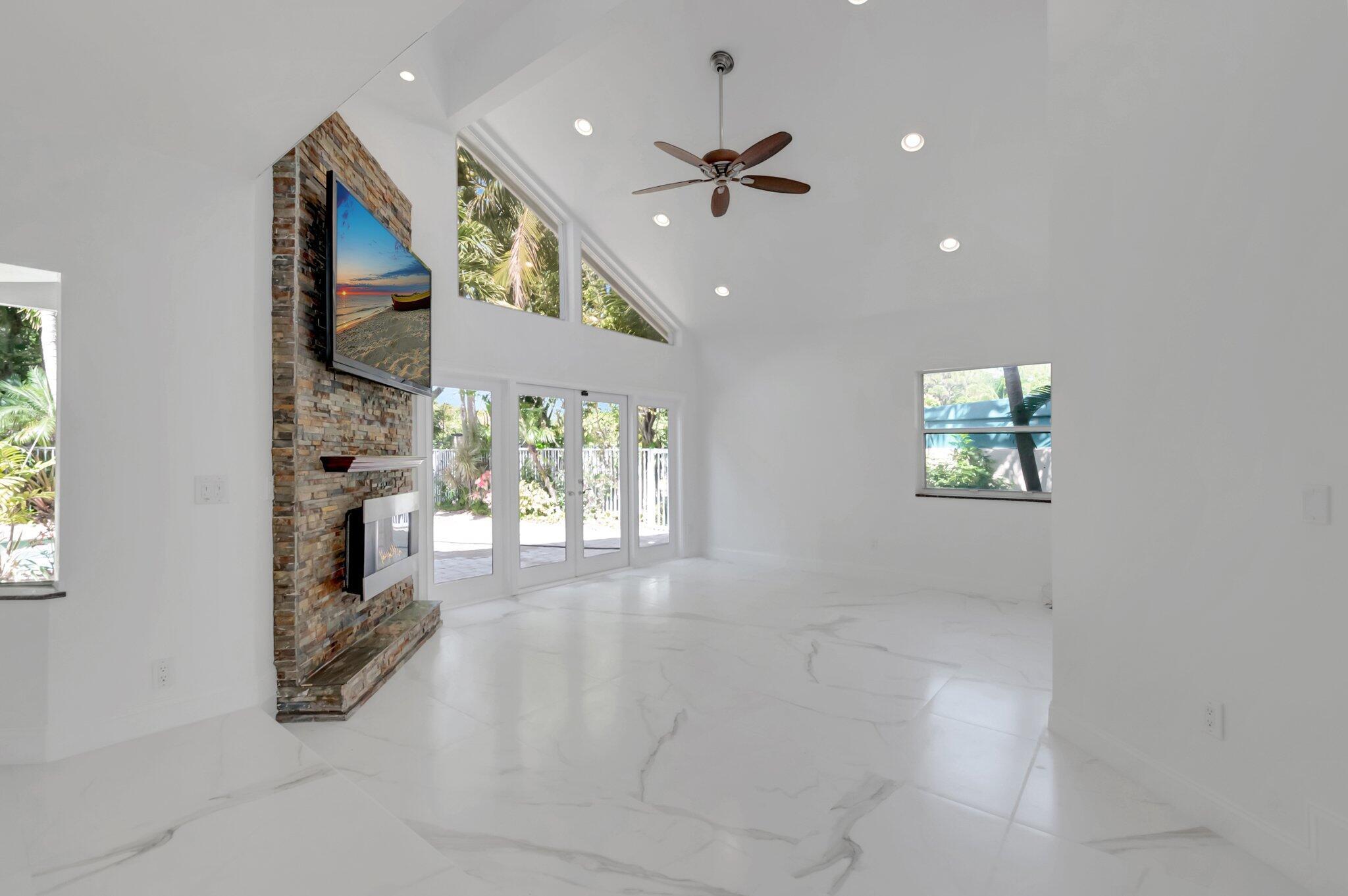 Fantastic home in a prime location! Features include Chicago brick driveway, tropical landscape, new flooring, S Tile roof (2015), A/C 2016 and 2017, Certainteed Residential Solar Tiles, large front yard, vaulted ceilings, freshly painted interior and exterior, stone fireplace with electric insert, kitchen cabinets were professionally painted, GE monogram refrigerator, Jenn Air double ovens, built in wine fridge, decorative glass cabinets, open floorplan with great space for entertaining, Good size primary bedroom with large bathroom, walk in closet, and a balcony. The back yard is a tropical paradise with a kidney shaped pool with tropical landscape, pavers, tiki bar, pool and spa are heated. All of this within walking distance to shops, restaurants and places of worship