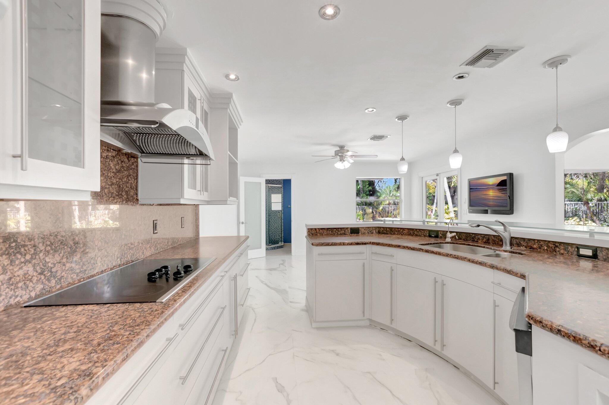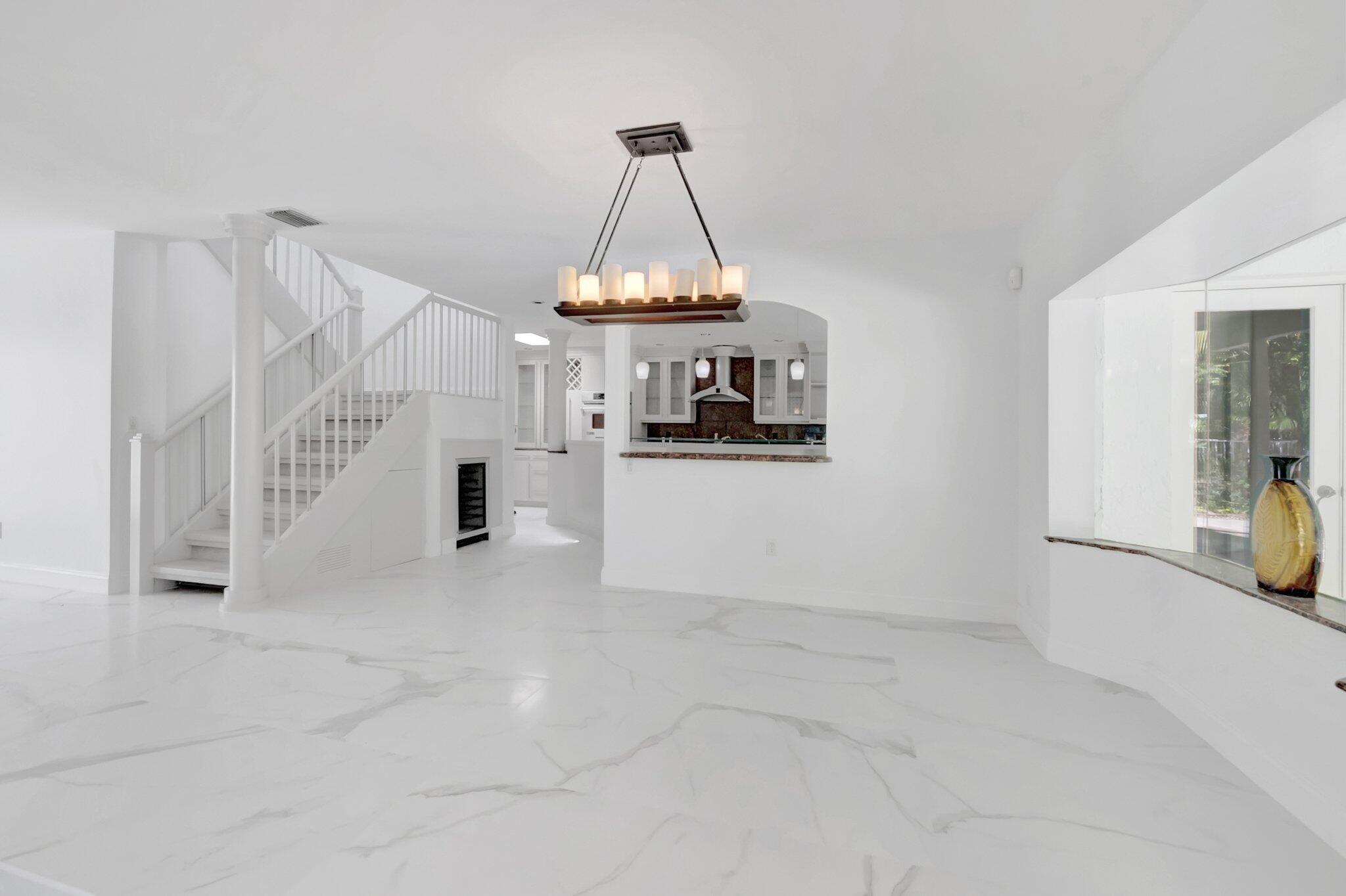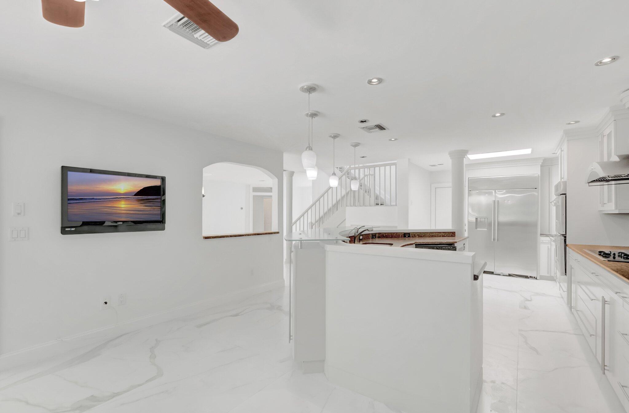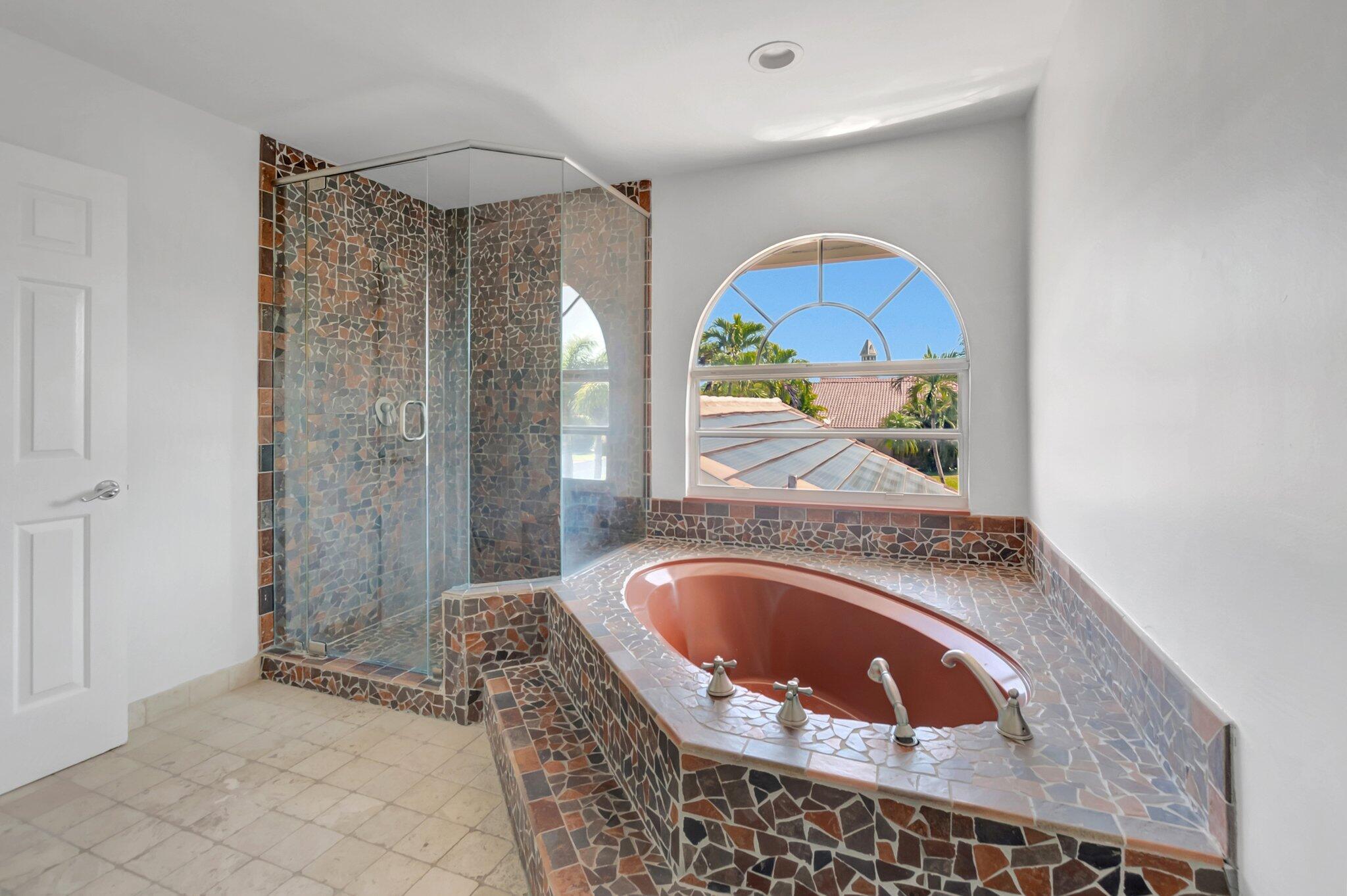 Fantastic home in a prime location! Features include Chicago brick driveway, tropical landscape, new flooring, S Tile roof (2015), A/C 2016 and 2017, Certainteed Residential Solar Tiles, large front yard, vaulted ceilings, freshly painted interior and exterior, stone fireplace with electric insert, kitchen cabinets were professionally painted, GE monogram refrigerator, Jenn Air double ovens, built in wine fridge, decorative glass cabinets, open floorplan with great space for entertaining, Good size primary bedroom with large bathroom, walk in closet, and a balcony. The back yard is a tropical paradise with a kidney shaped pool with tropical landscape, pavers, tiki bar, pool and spa are heated. All of this within walking distance to shops, restaurants and places of worship