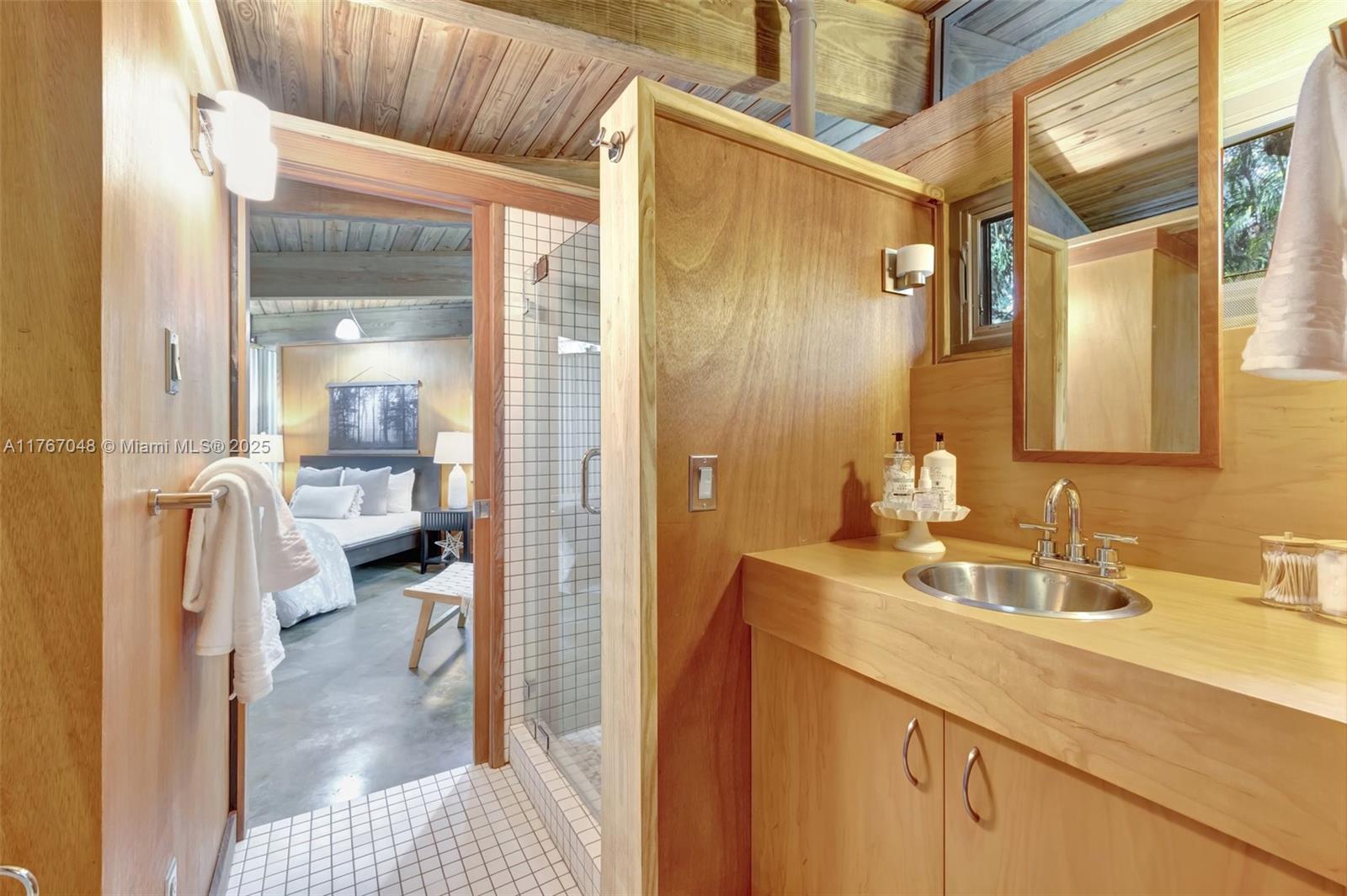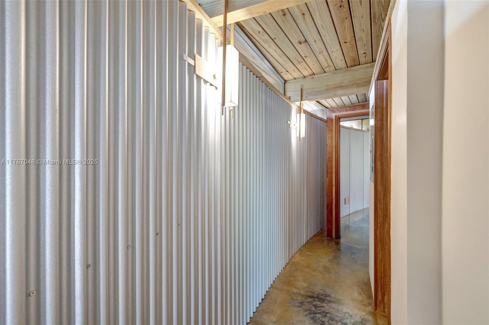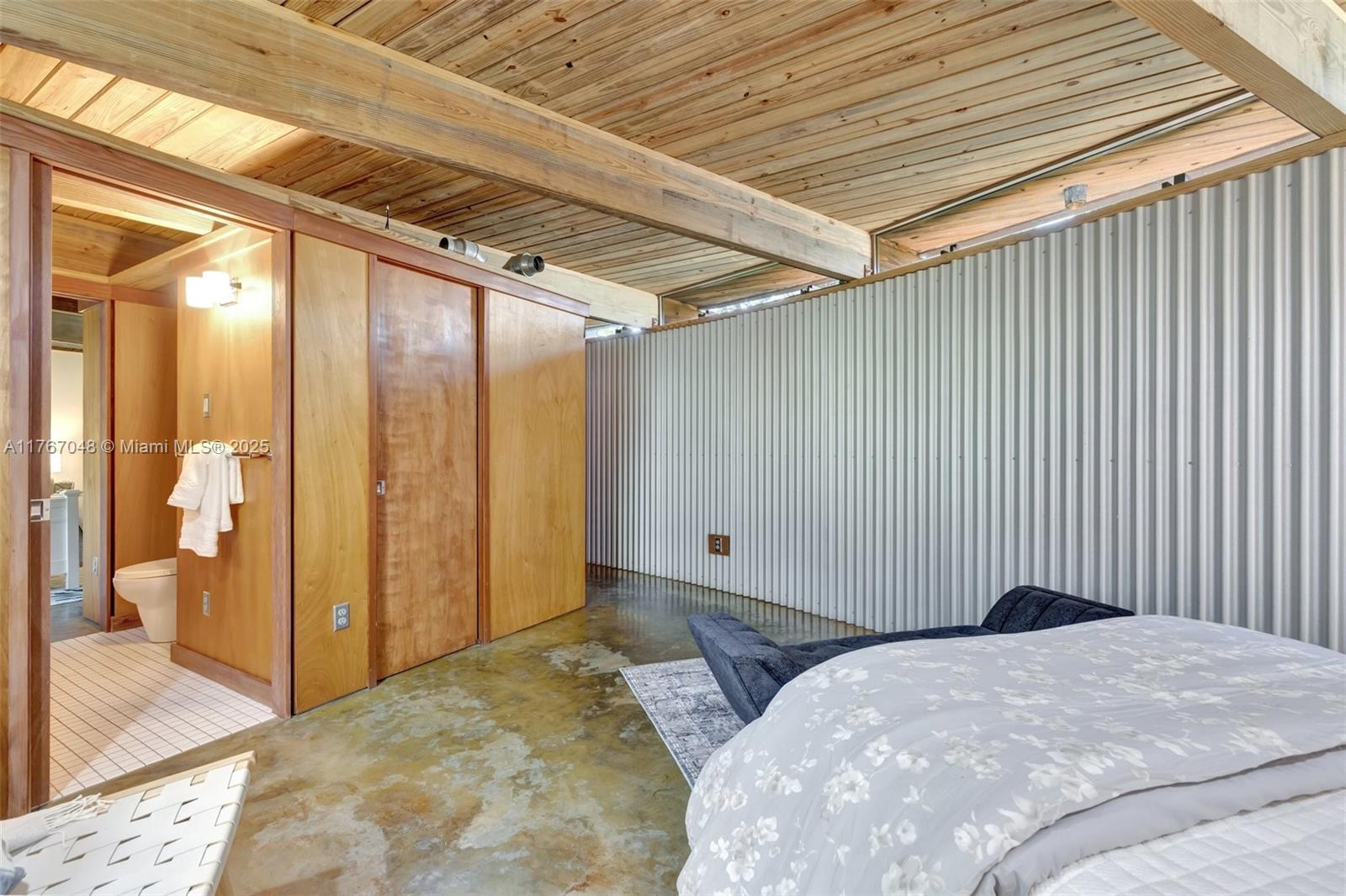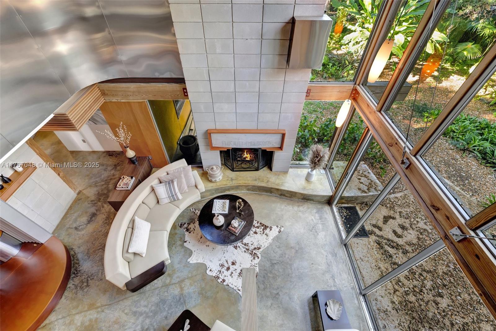 "The Fox Den," an architectural masterpiece by Scott DiStefano, blends contemporary design with organic materials in the Frank Lloyd Wright tradition. This 4-bedroom, 3.5-bath home sits on a 10,500 sq ft wooded lot in Riverland Woods. Features include exposed concrete, timber framing, copper fascia, and stainless steel elements throughout. The versatile floor plan offers a loft space and attached studio/office with separate entrance. Custom built-ins and strategic windows frame views of the landscaped grounds. Distinguished by galvalum cladding and corrugated metal, the home boasts concrete floors and appliances. Located minutes from downtown Fort Lauderdale, this internationally recognized residence represents organic contemporary architecture at its finest.