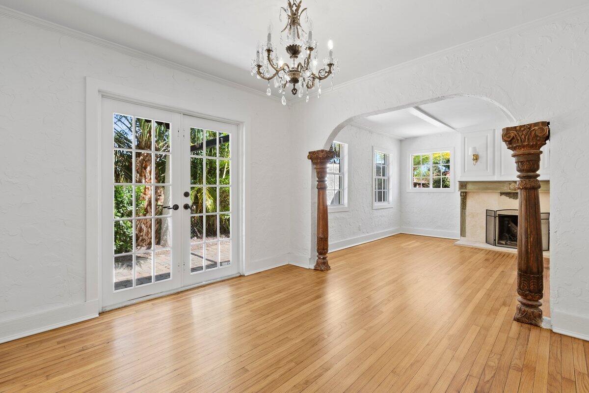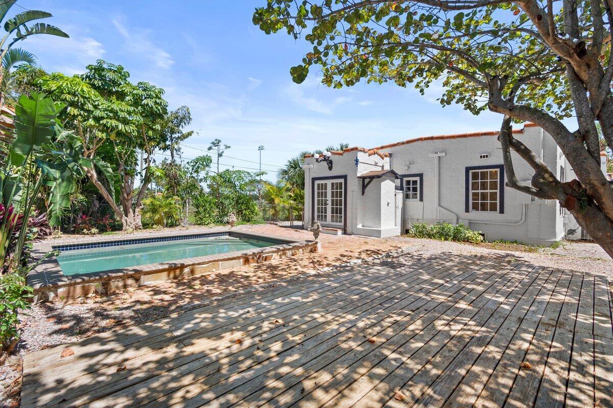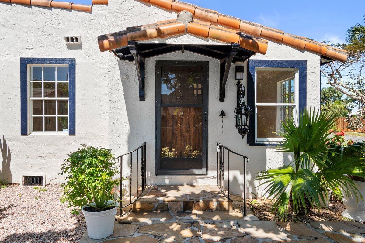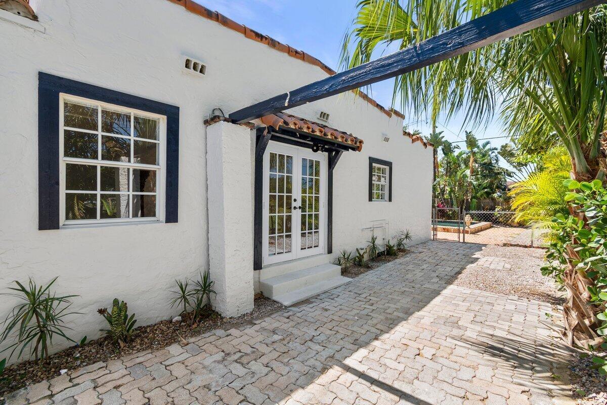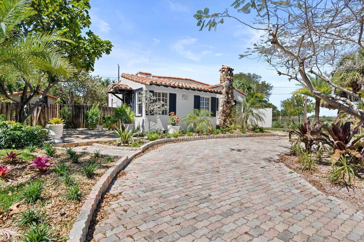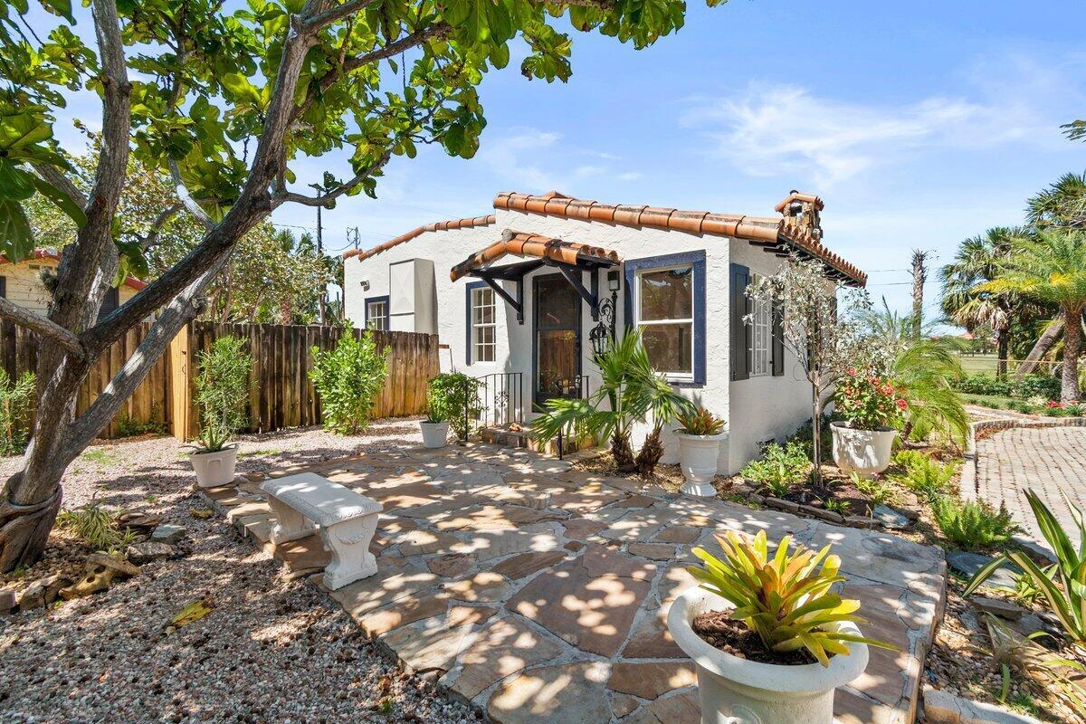 Welcome to this beautiful 2-bedroom, 1-bathroom home located in the highly sought-after historic Vedado neighborhood of West Palm Beach. Built in 1925, this Spanish bungalow exudes timeless charm with its spacious living areas, rich historical details, and modern updates.As you approach the home, you'll be greeted by a large paved driveway on a corner lot, complemented by lush landscaping that enhances the curb appeal. Enter through the distinctive pecky cypress door and step into a home that immediately captivates with its stunning red oak floors, intricate ceiling moldings, and a cozy working fireplace with a beautifully crafted mantel, adding an extra layer of warmth and charm to the living room. Wood columns beautifully separate the living room from the kitchen,