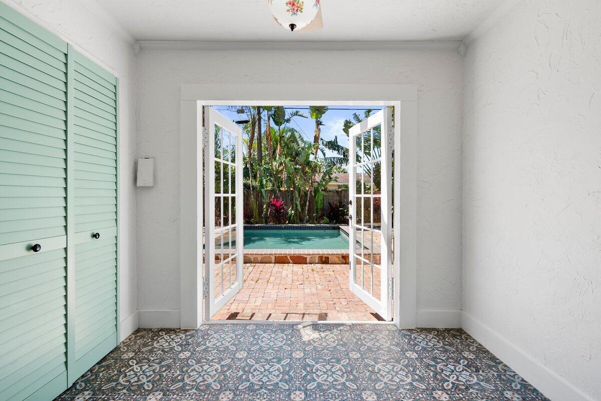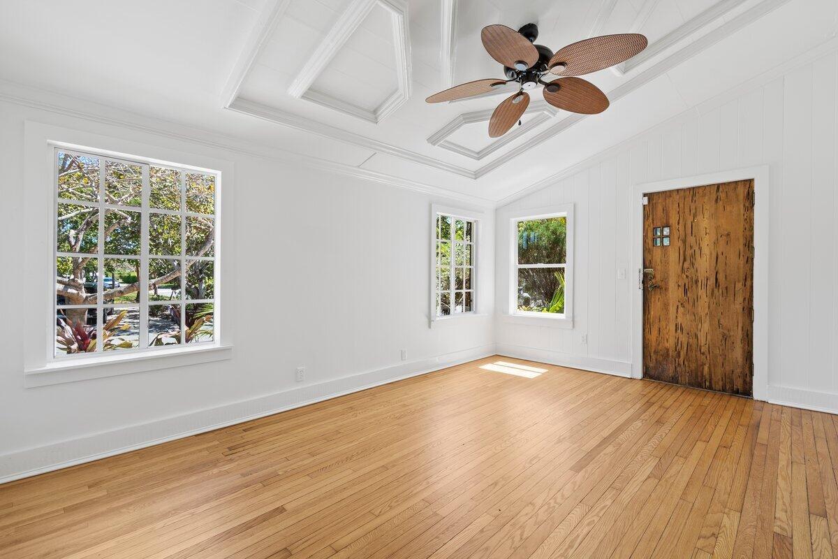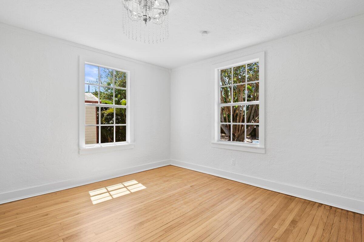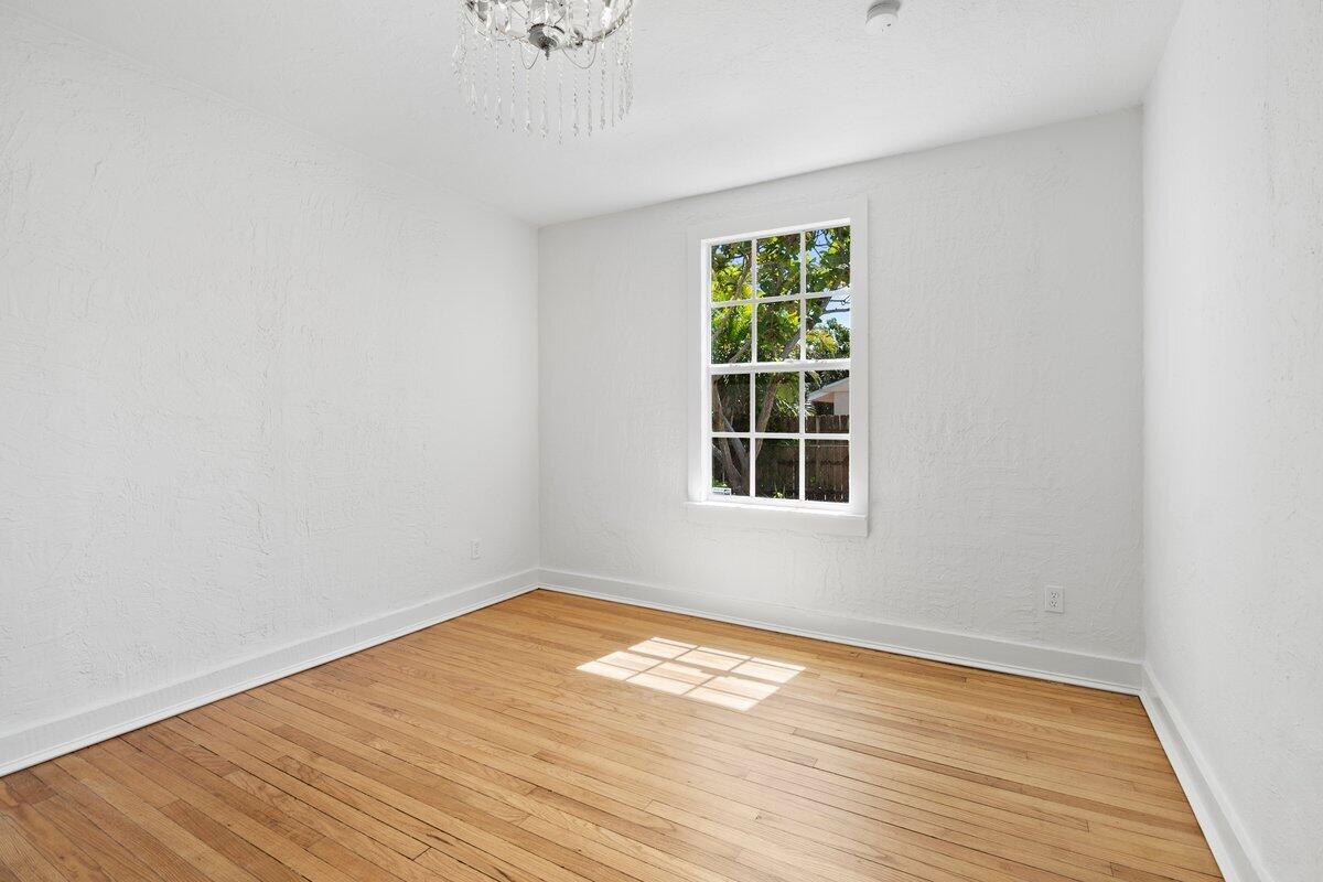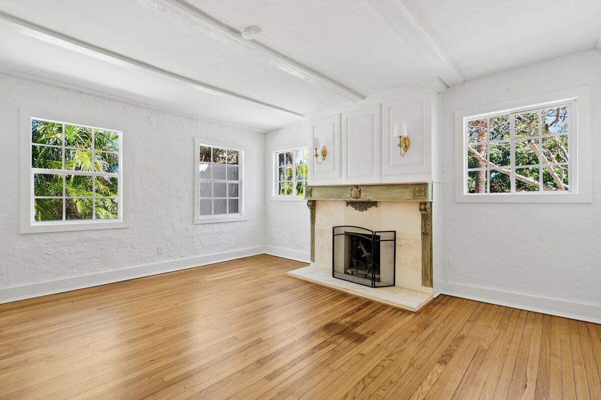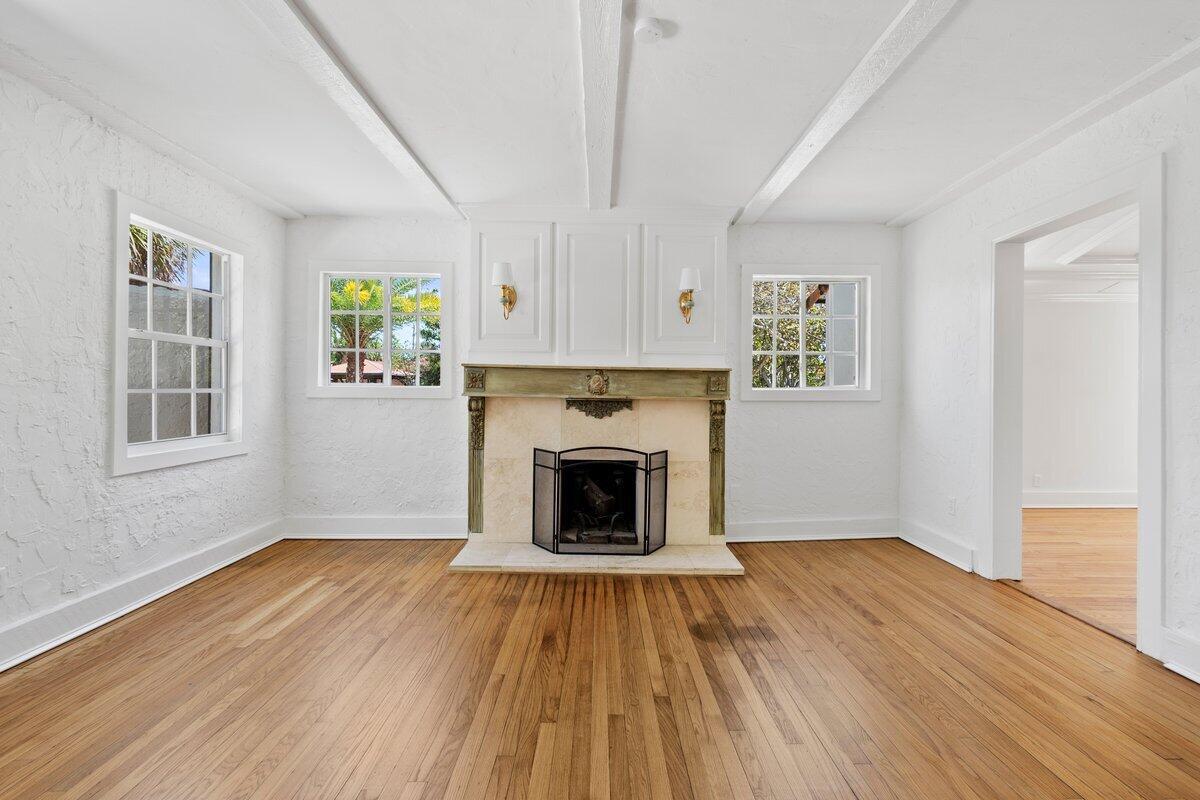 Welcome to this beautiful 2-bedroom, 1-bathroom home located in the highly sought-after historic Vedado neighborhood of West Palm Beach. Built in 1925, this Spanish bungalow exudes timeless charm with its spacious living areas, rich historical details, and modern updates.As you approach the home, you'll be greeted by a large paved driveway on a corner lot, complemented by lush landscaping that enhances the curb appeal. Enter through the distinctive pecky cypress door and step into a home that immediately captivates with its stunning red oak floors, intricate ceiling moldings, and a cozy working fireplace with a beautifully crafted mantel, adding an extra layer of warmth and charm to the living room. Wood columns beautifully separate the living room from the kitchen,