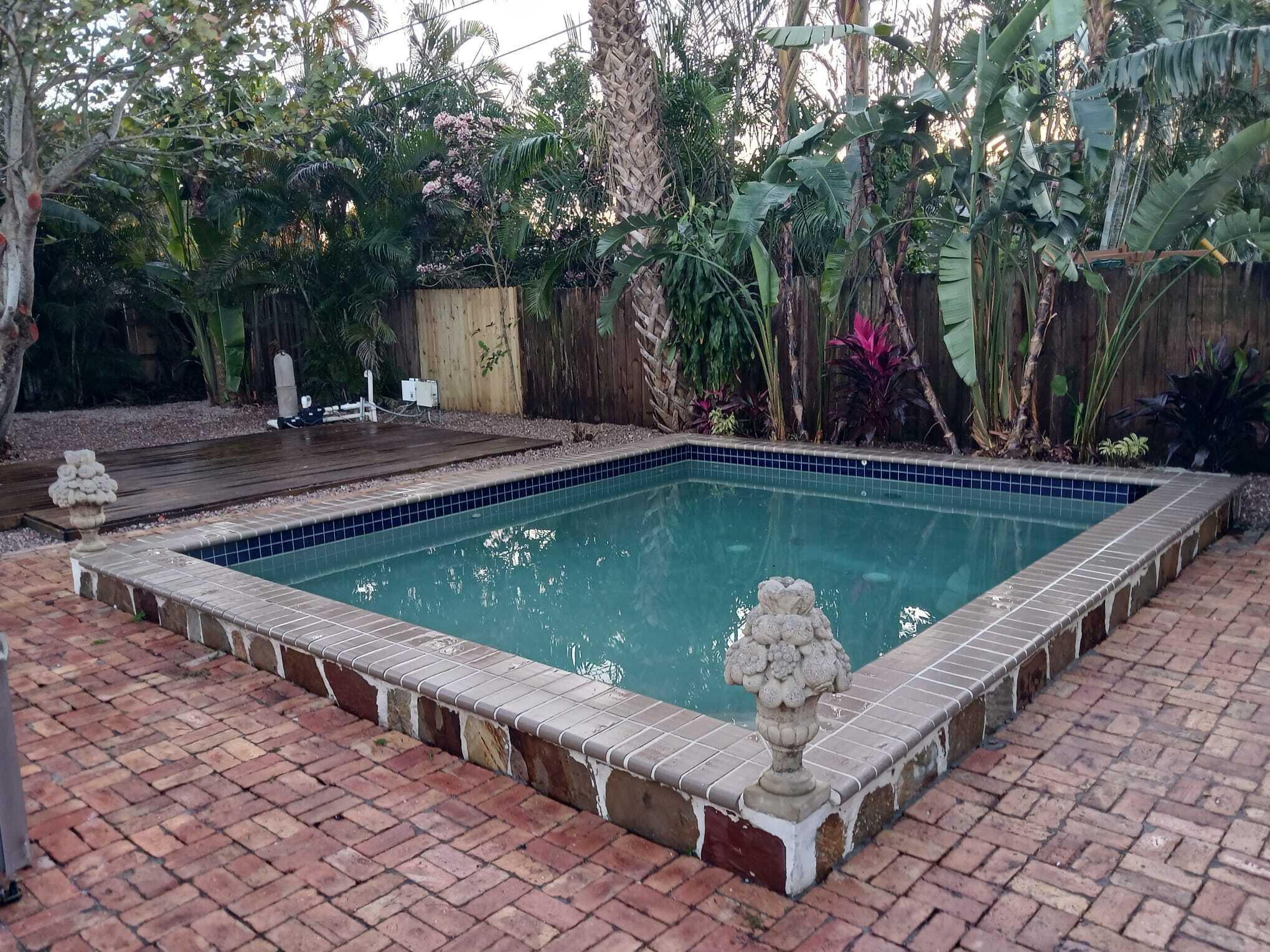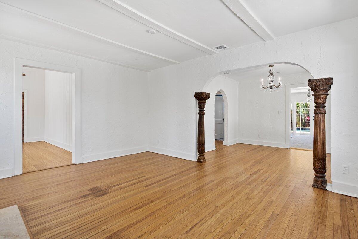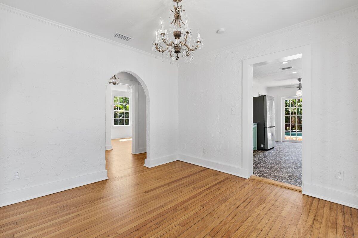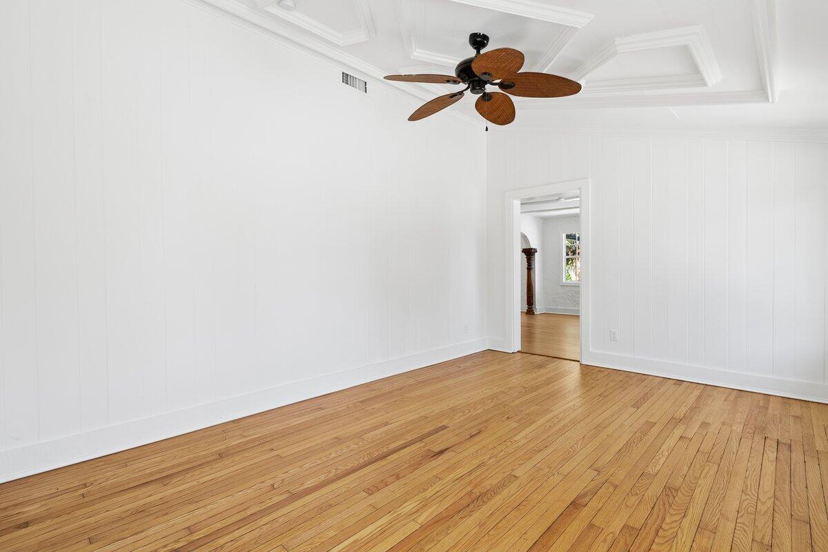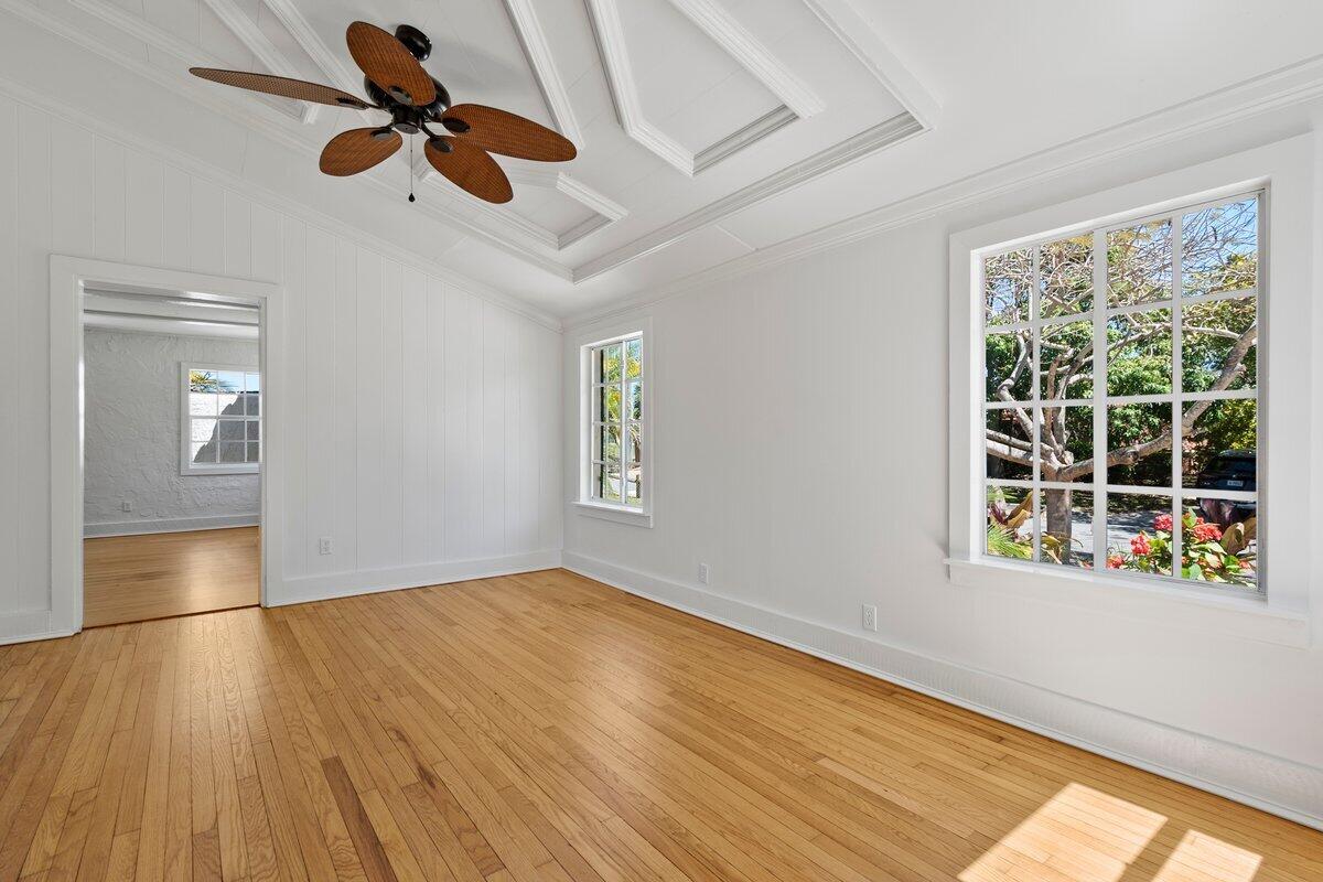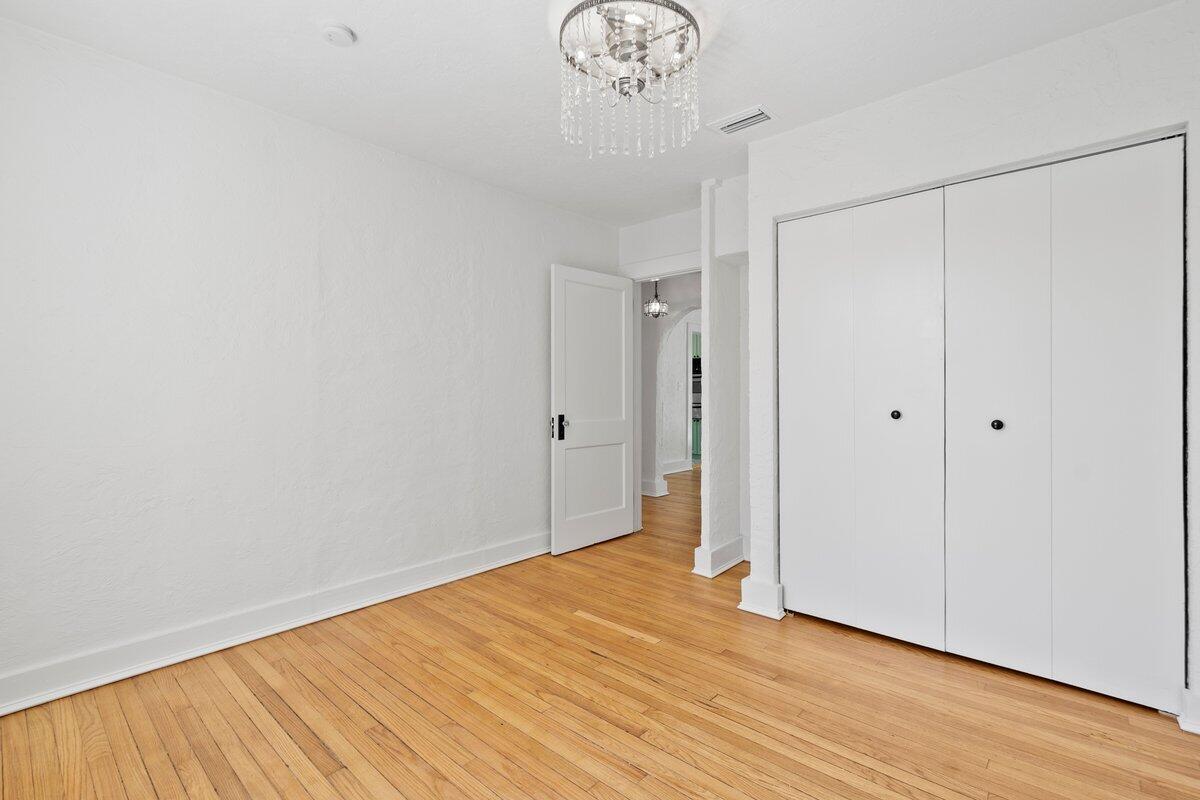 Welcome to this beautiful 2-bedroom, 1-bathroom home located in the highly sought-after historic Vedado neighborhood of West Palm Beach. Built in 1925, this Spanish bungalow exudes timeless charm with its spacious living areas, rich historical details, and modern updates.As you approach the home, you'll be greeted by a large paved driveway on a corner lot, complemented by lush landscaping that enhances the curb appeal. Enter through the distinctive pecky cypress door and step into a home that immediately captivates with its stunning red oak floors, intricate ceiling moldings, and a cozy working fireplace with a beautifully crafted mantel, adding an extra layer of warmth and charm to the living room. Wood columns beautifully separate the living room from the kitchen,