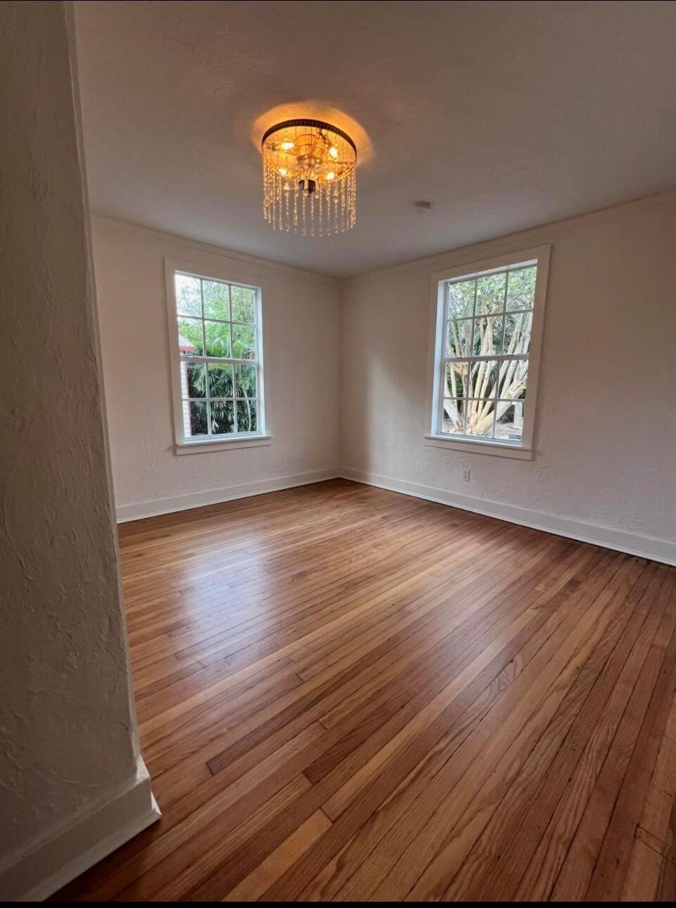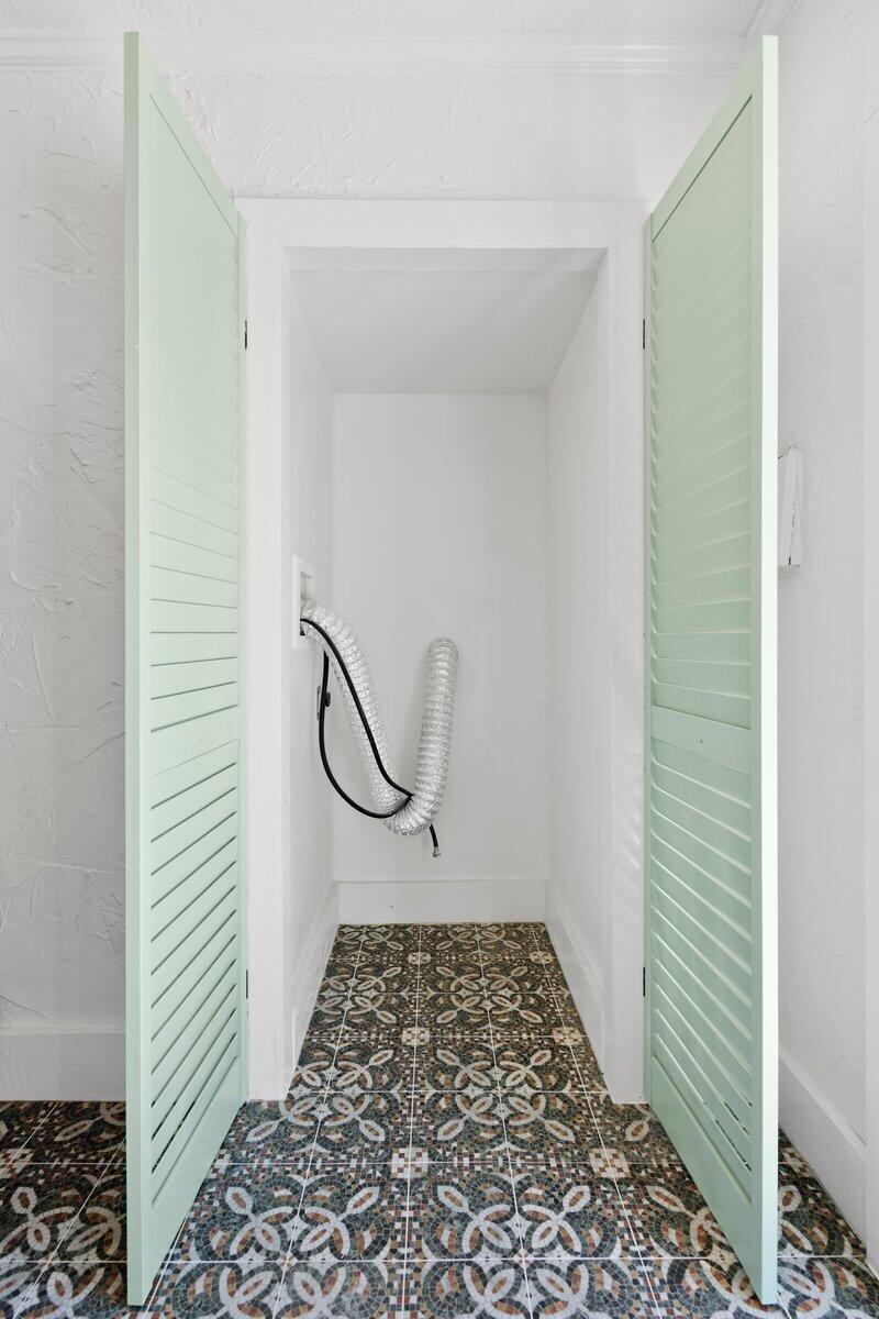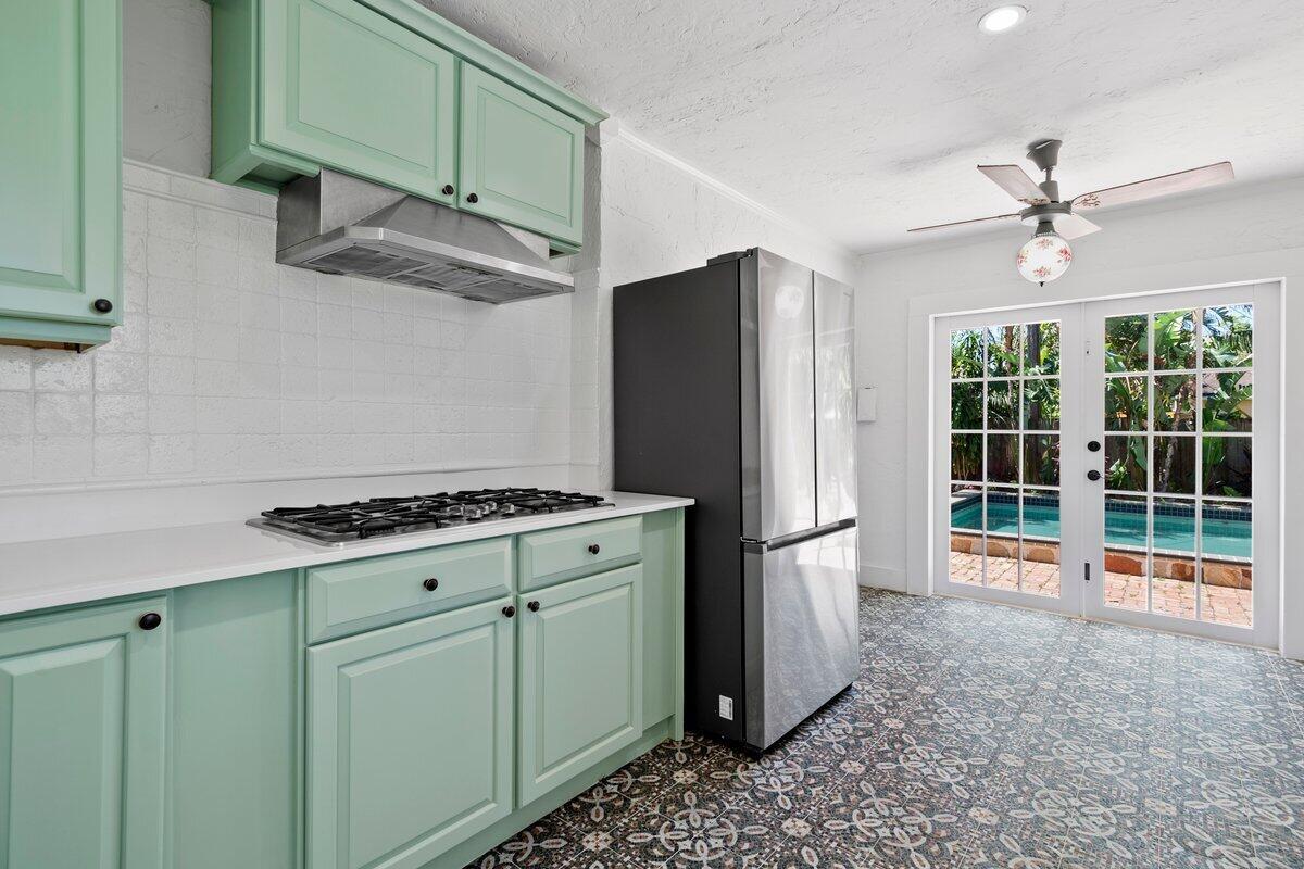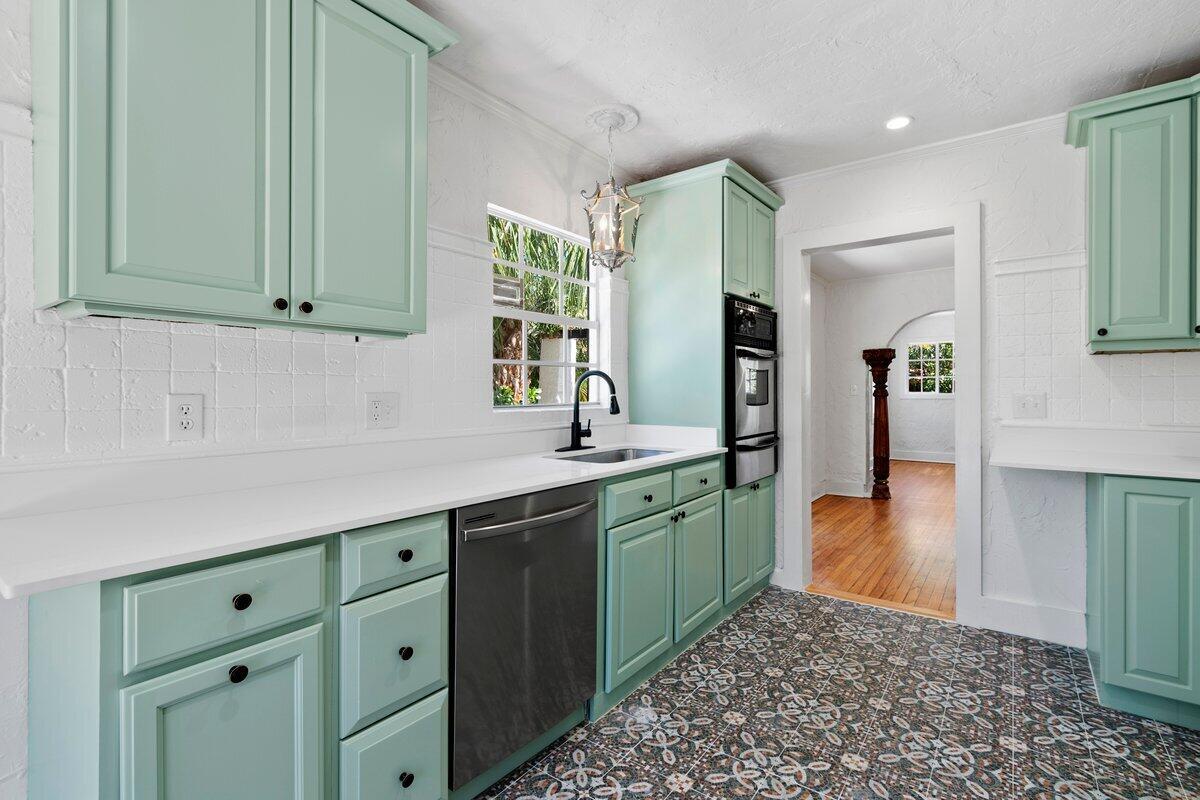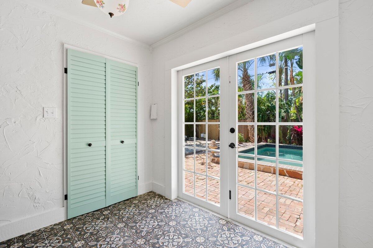 Welcome to this beautiful 2-bedroom, 1-bathroom home located in the highly sought-after historic Vedado neighborhood of West Palm Beach. Built in 1925, this Spanish bungalow exudes timeless charm with its spacious living areas, rich historical details, and modern updates.As you approach the home, you'll be greeted by a large paved driveway on a corner lot, complemented by lush landscaping that enhances the curb appeal. Enter through the distinctive pecky cypress door and step into a home that immediately captivates with its stunning red oak floors, intricate ceiling moldings, and a cozy working fireplace with a beautifully crafted mantel, adding an extra layer of warmth and charm to the living room. Wood columns beautifully separate the living room from the kitchen,