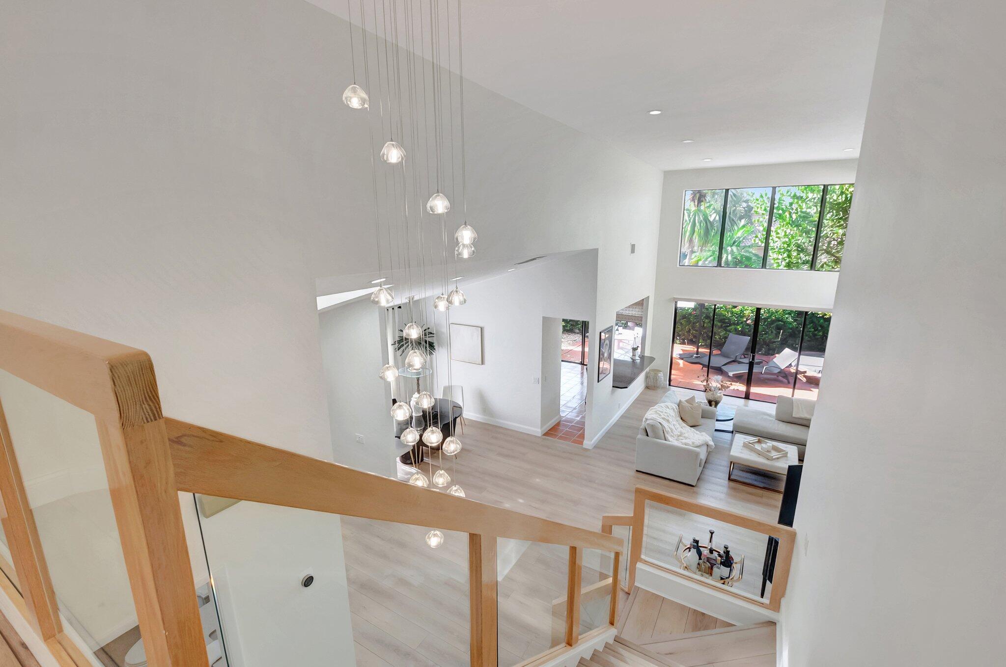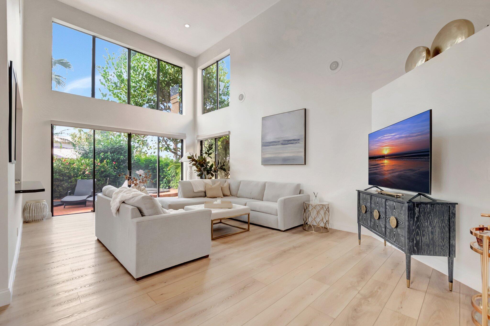 Step into this light-filled, newly renovated residence where timeless style meets modern comfort. The open floor plan and soaring ceilings create a grand yet welcoming ambiance, and the expansive windows draw you to the outdoor oasis, perfect for everyday living or elegant entertaining.The expansive primary suite is thoughtfully situated on the main floor and offers a true retreat, complete with a beautifully remodeled spa-inspired bathroom, dual walk-in closets, and generous additional storage. Also on the main level is a flexible space ideal as a den, office, or guest bedroom, paired with another fully updated bathroom for added convenience.