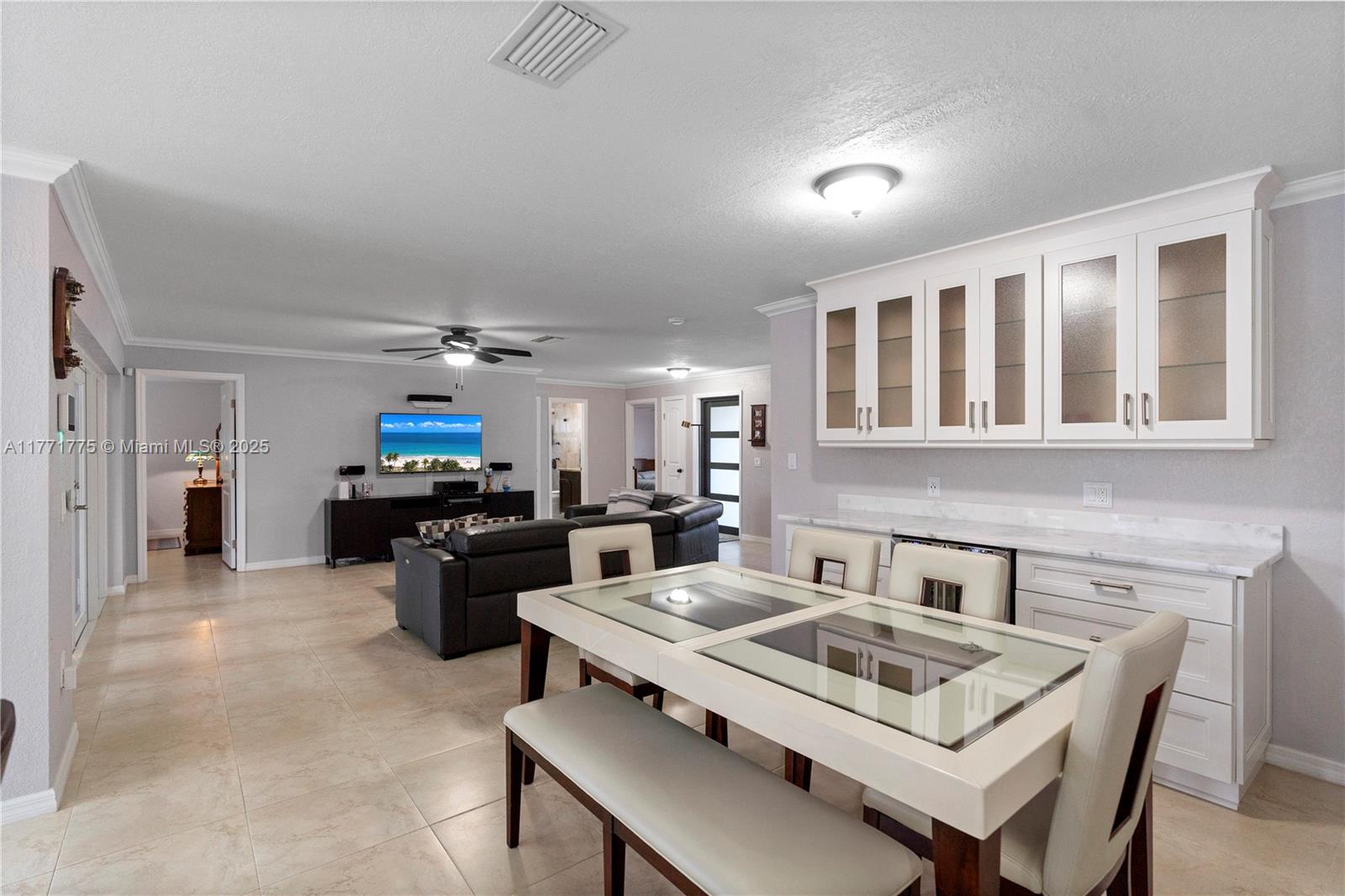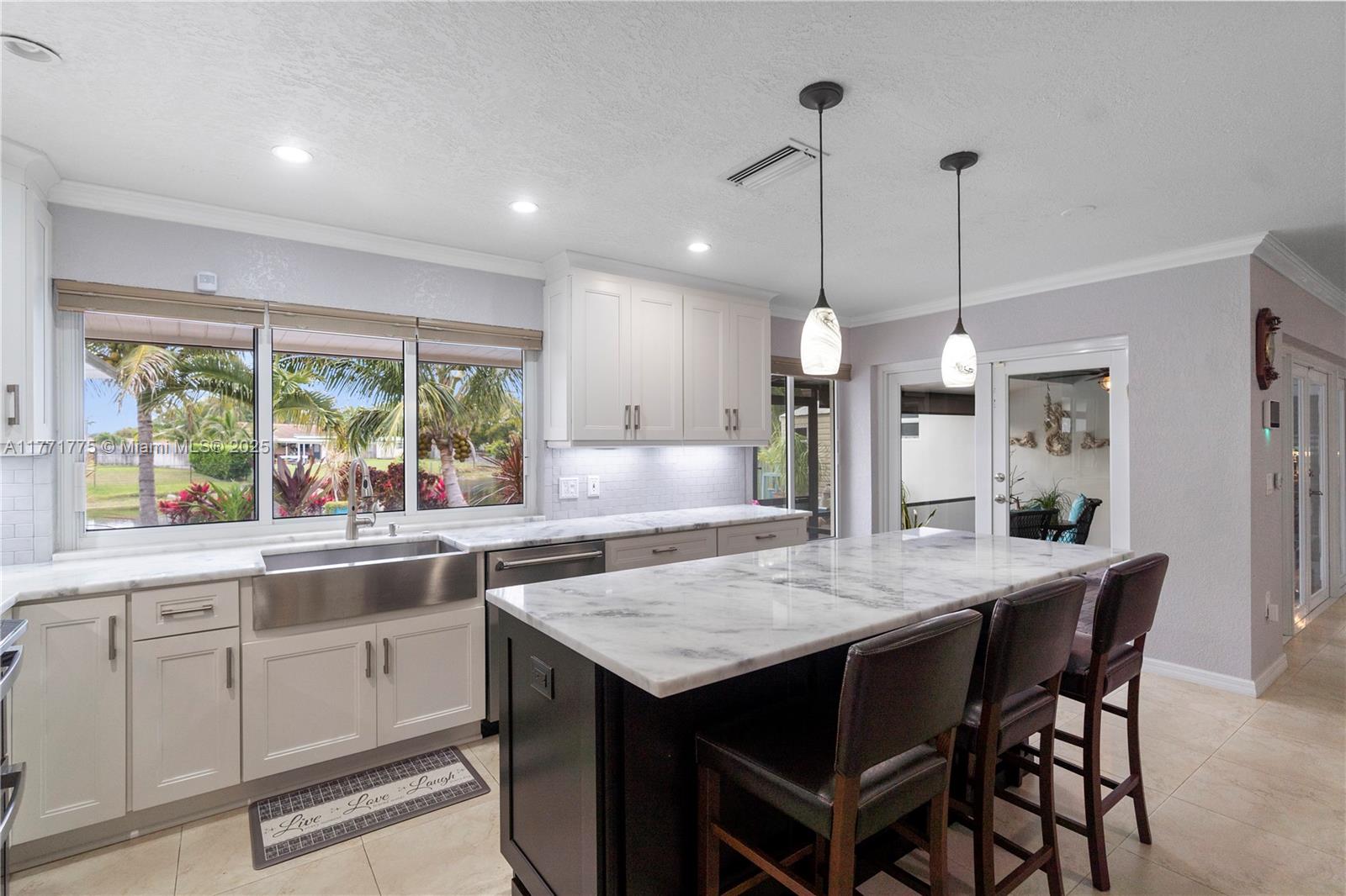 Stunning waterfront pool home, Highly upgraded thru-out, Quartz countertops, White wood cabinets, Stainless steel kitchen appliances, GE dual oven & cook top, Under cabinet lighting, Bar with wine refrigerator, Remodeled bathrooms, Updated porcelain tile flooring, Hurricane impact windows & doors, New A/C 2024 with 9 years left on warranty, Tankless water heater, Vivint security system with 3 cameras, Finished garage under A/C, Updated insulated garage door & motor, New exterior paint & stucco 2023, Low maintenance salt water pool, Wood waterfront dock, Expansive exterior lighting, Large gazebo, No maintenance putting green on side of house, 3 storage sheds. 1 with power & more!
