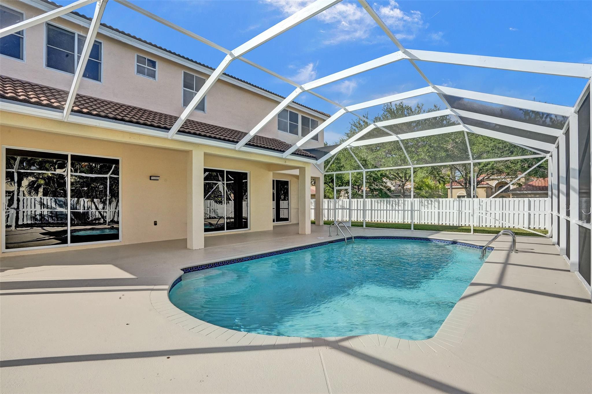 Beautiful Weston 5 bedroom / 3 full bathroom salt water pool home in the exclusive gated community of 'The Falls'. 2022 S-tile roof! First floor den can be converted to 5th bedroom. Primary Bedroom has 2 walk-in closets, ensuite bathroom with dual sinks, a separate shower and Roman size Jacuzzi tub. Brick paver walkway leads to your double door entry. Dramatic volume living ceilings make this home feel extra spacious. Large eat-in kitchen with plenty of cabinets and pantry, granite counters, and stainless appliances. Huge private fenced backyard great for a play area and pets. Fully screened pool with safety fence and covered patio. Walking distance to Eagle Point Elementary and Tequesta Trace Middle schools. Zoned for Cypress Bay High. Great schools and a neighborhood to raise a family!
