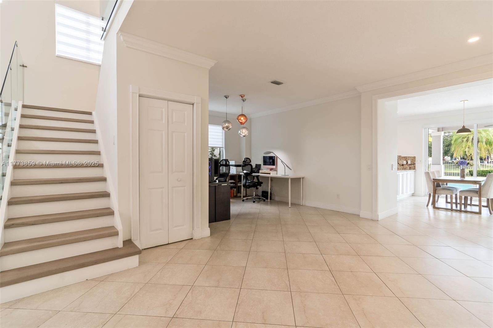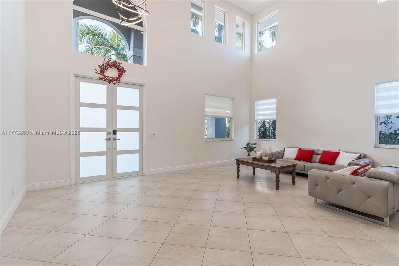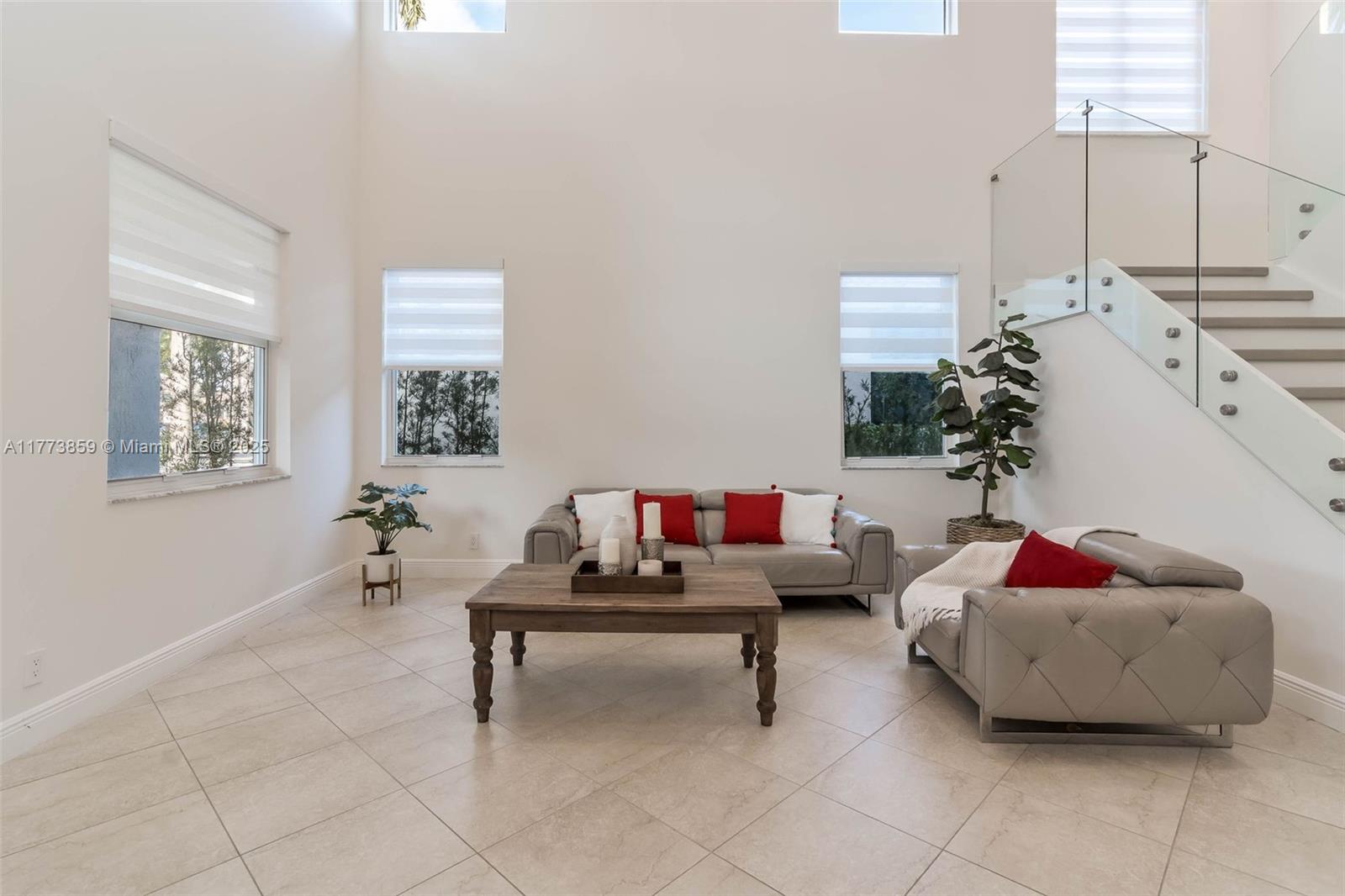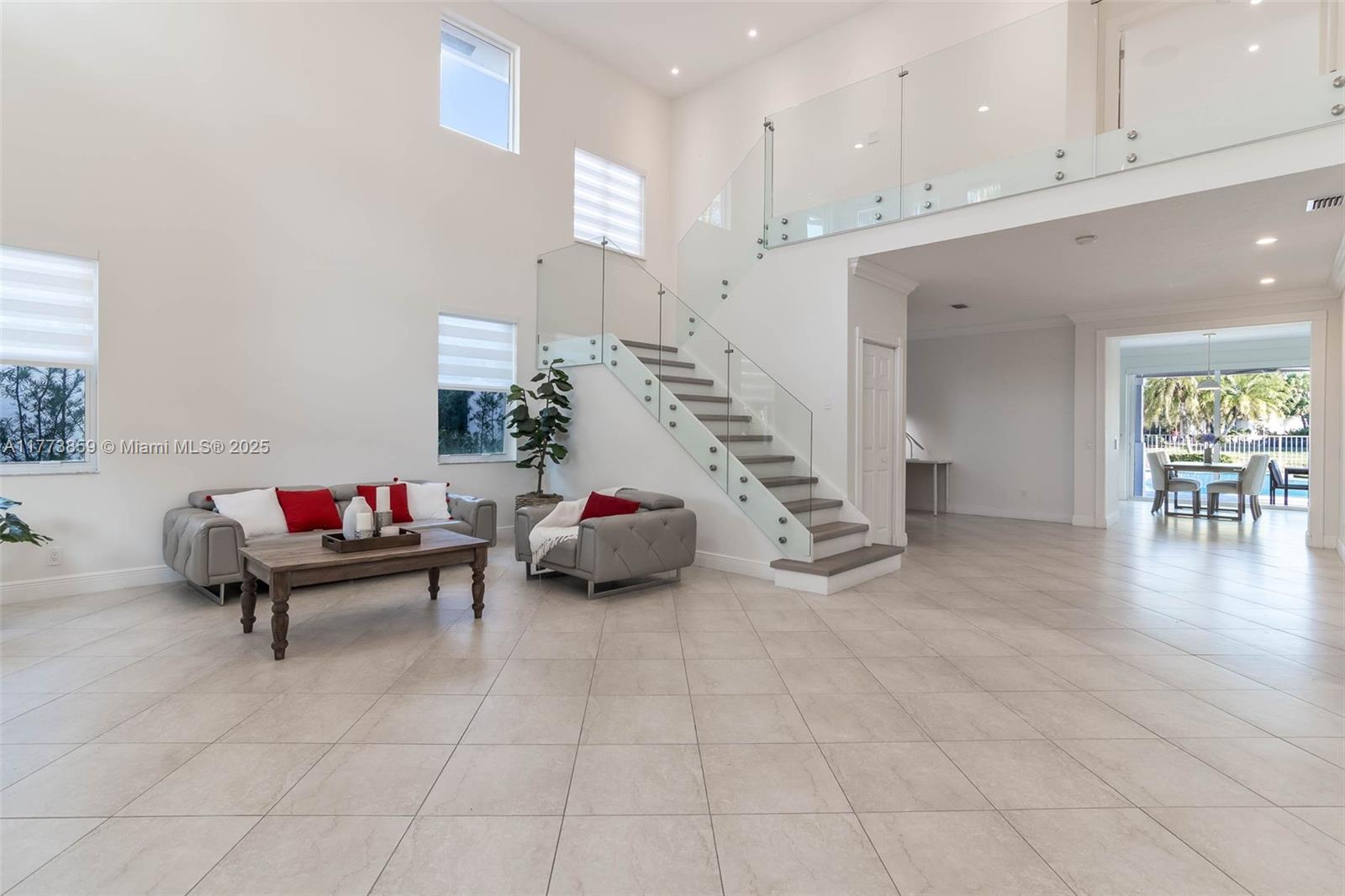 IMPACT WINDOWS & DOORS throughout, this home blends luxury & security. Beautiful Lake home offers an impressive sense of space with soaring ceilings and expansive living areas, designed for both everyday comfort and effortless entertaining. The open-concept kitchen flows seamlessly into the spacious family room, ideal for gatherings large or small. Enjoy the convenience of a full bedroom and bath on the first floor. Upstairs, sleek glass stair rails and wood flooring add a touch of elegance throughout. The expansive primary suite is a true retreat, featuring a serene sitting area and spa-inspired bathroom, all overlooking panoramic lake views. Step outside to your private oasis: a covered patio, sparkling Salt pool, and marble deck await, set against the tranquil lake backdrop.