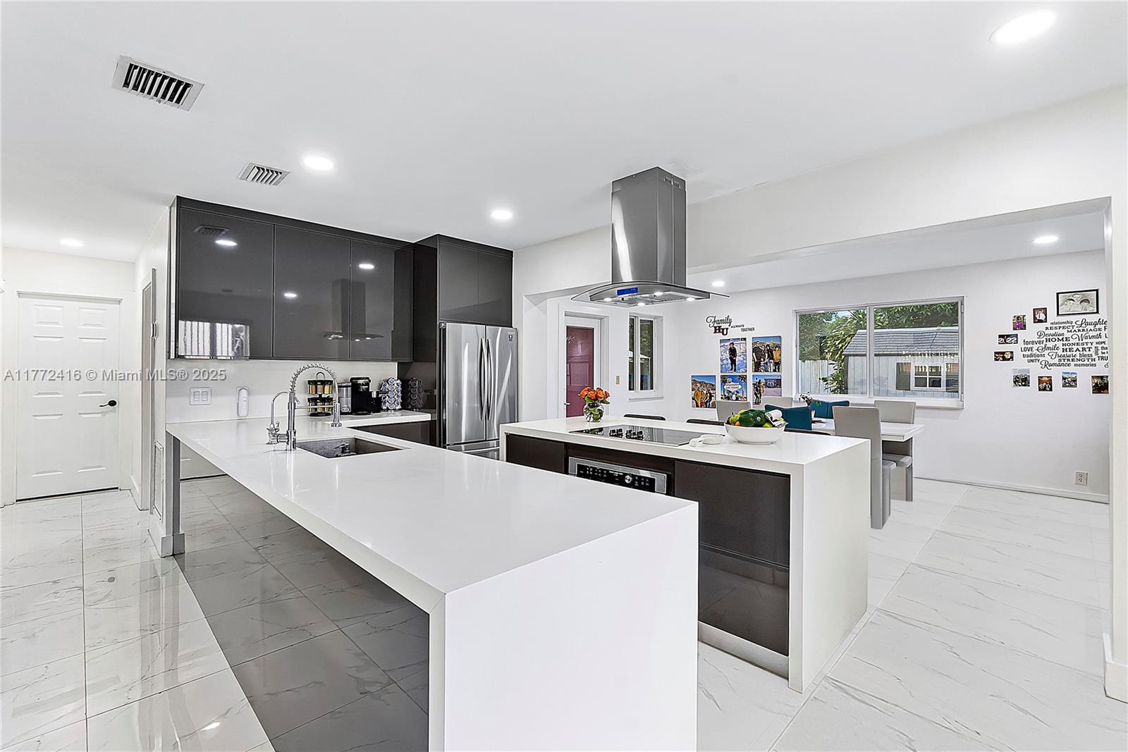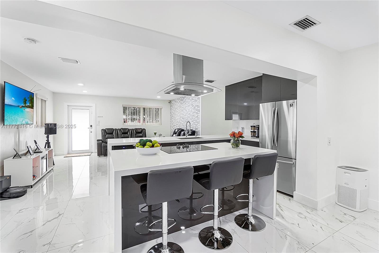 Fully renovated 3-bedroom, 2-bathroom home in the heart of Hollywood, The open concept living space is highlighted by a jaw-dropping quartz waterfall kitchen island, elegant soft close cabinetry, a built-in wine cooler, and stainless steel appliances, making it a dream for both cooking and entertaining. With Calacatta porcelain tile throughout the main living areas and bathrooms, paired with LED recessed lighting, Impact windows, and doors provide security and energy efficiency, no cast iron pipes, Titan tankless water heater, A/C unit, smart door look/unlock monitoring system, all renovation and update done late 2021 including the replacement of the roof, plenty room for pool. This home is truly move-in ready