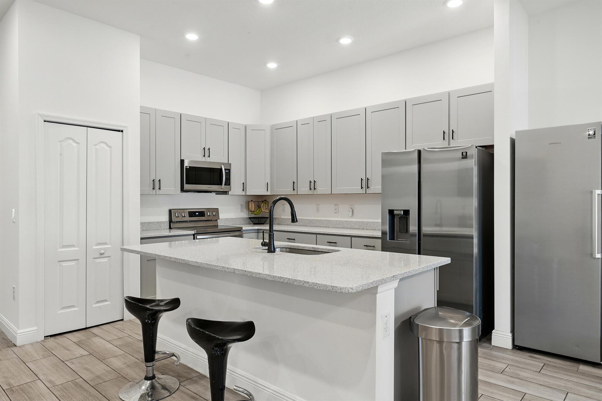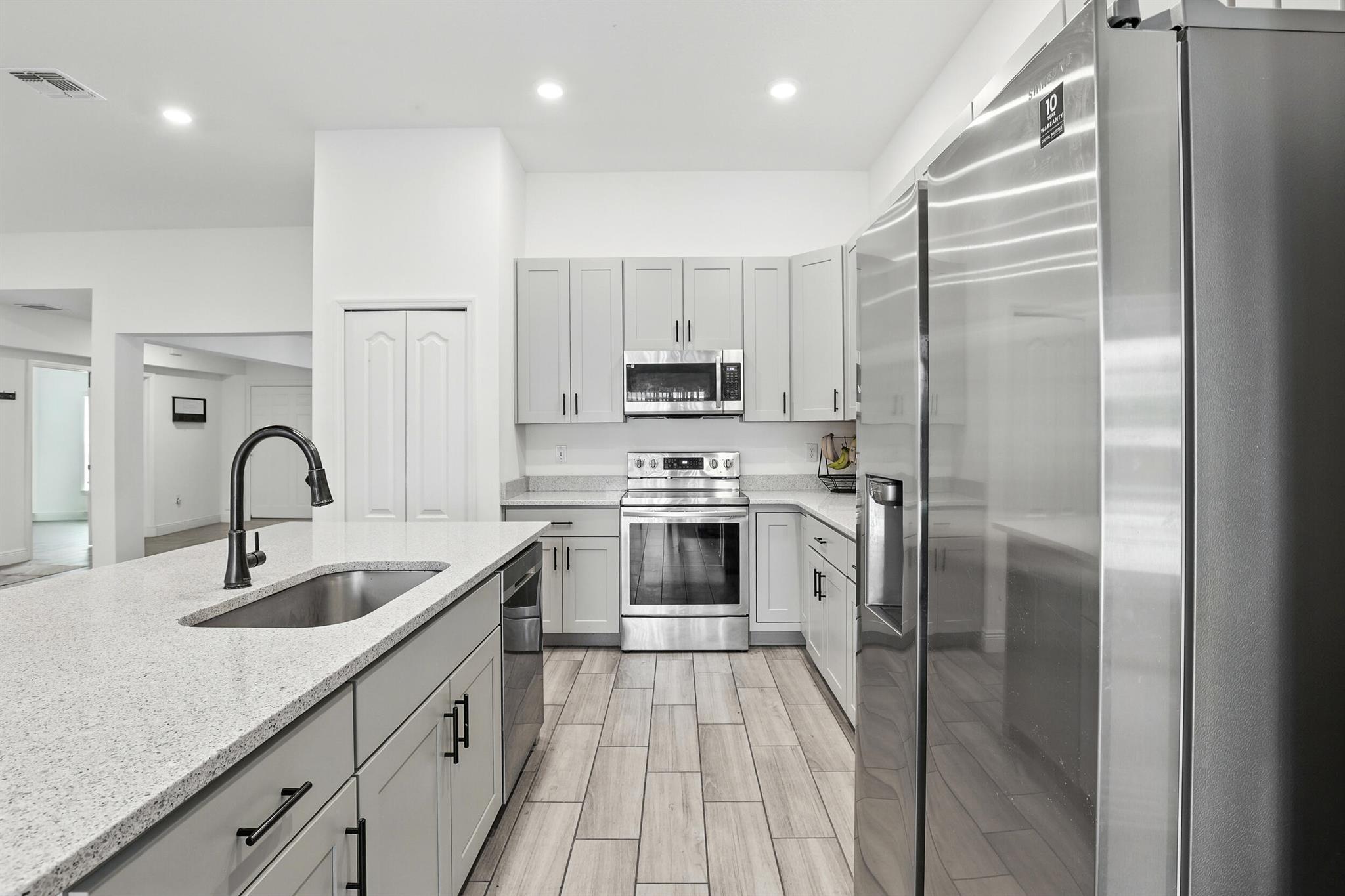 Welcome to Woodland Trails, where comfort meets convenience. Built in 2021, this spacious CBS home offers 4 bedrooms, 3 full baths, plus a versatile den for office or flex use. The open-concept design highlights a modern kitchen flowing into the living area, ideal for today's lifestyle. Features include a 3-car garage, fully fenced yard, lush landscaping, gazebo, and shed. Solar panels will be paid off at closing, providing energy efficiency and long-term savings. With NO HOA, enjoy the freedom to personalize your space. Ideally located near Tradition, shopping, dining, schools, I-95, and the Turnpike--offering quick access to everything Port St. Lucie and the Treasure Coast have to offer. Note: one or more photos are virtually staged.