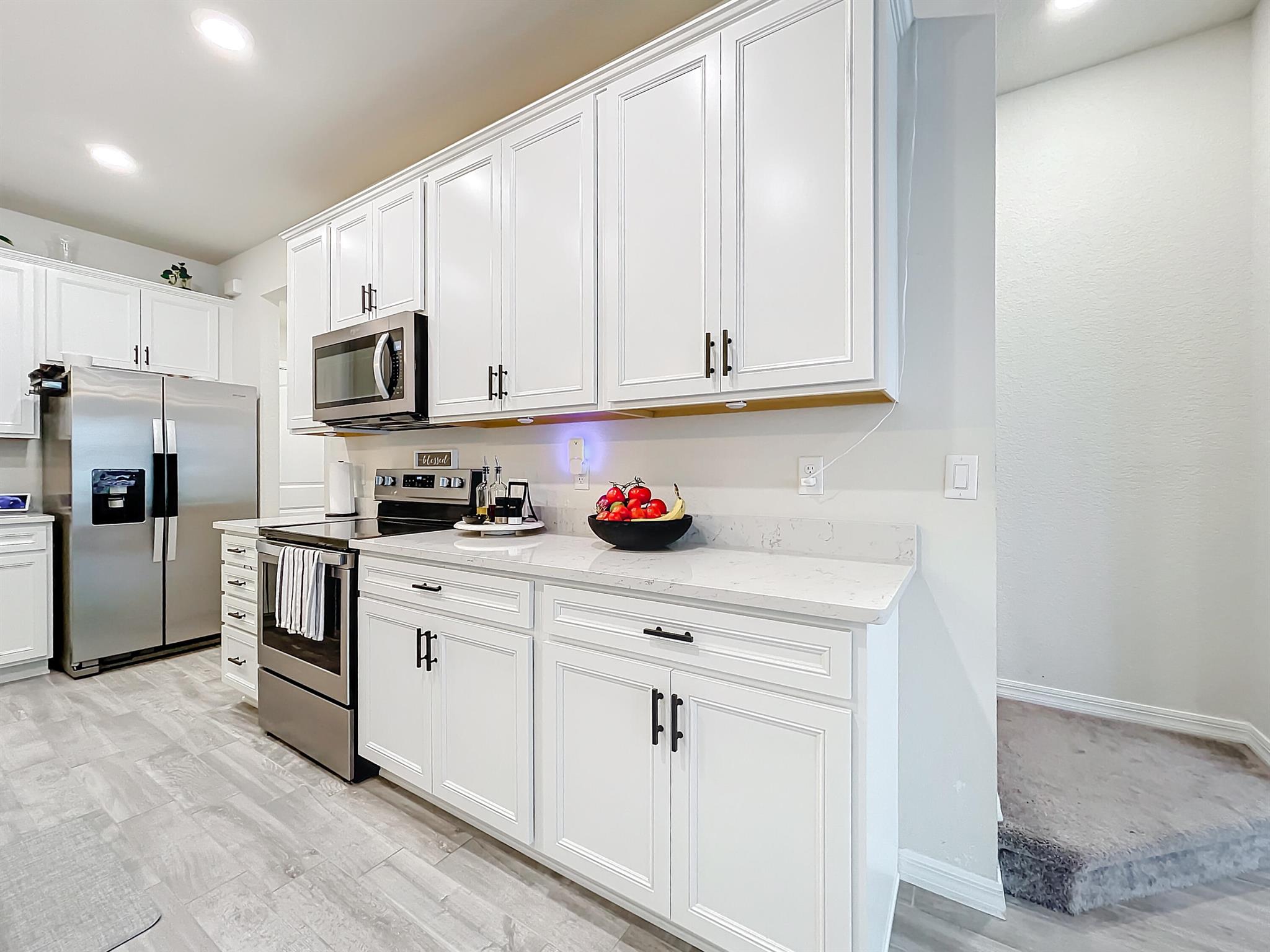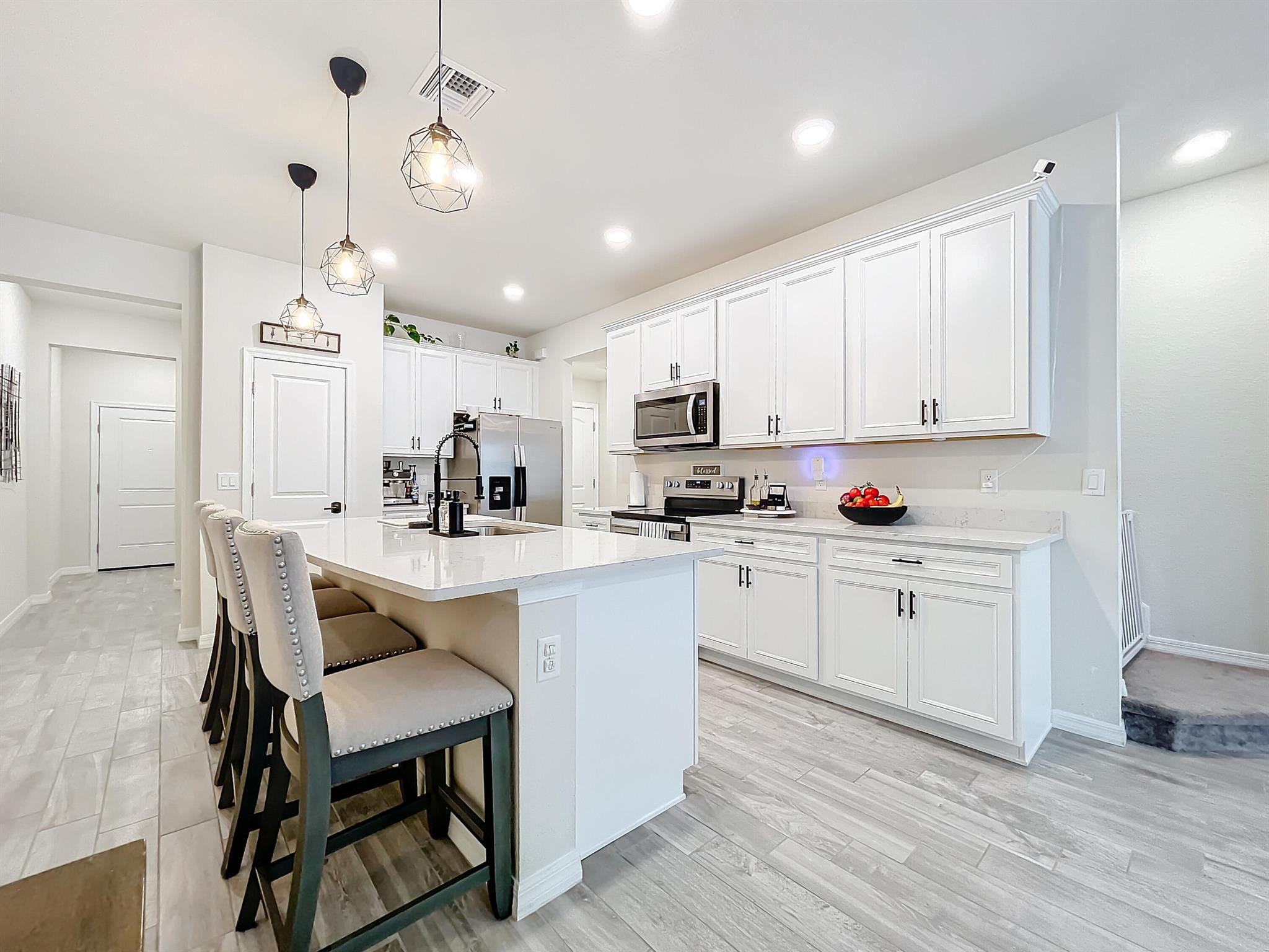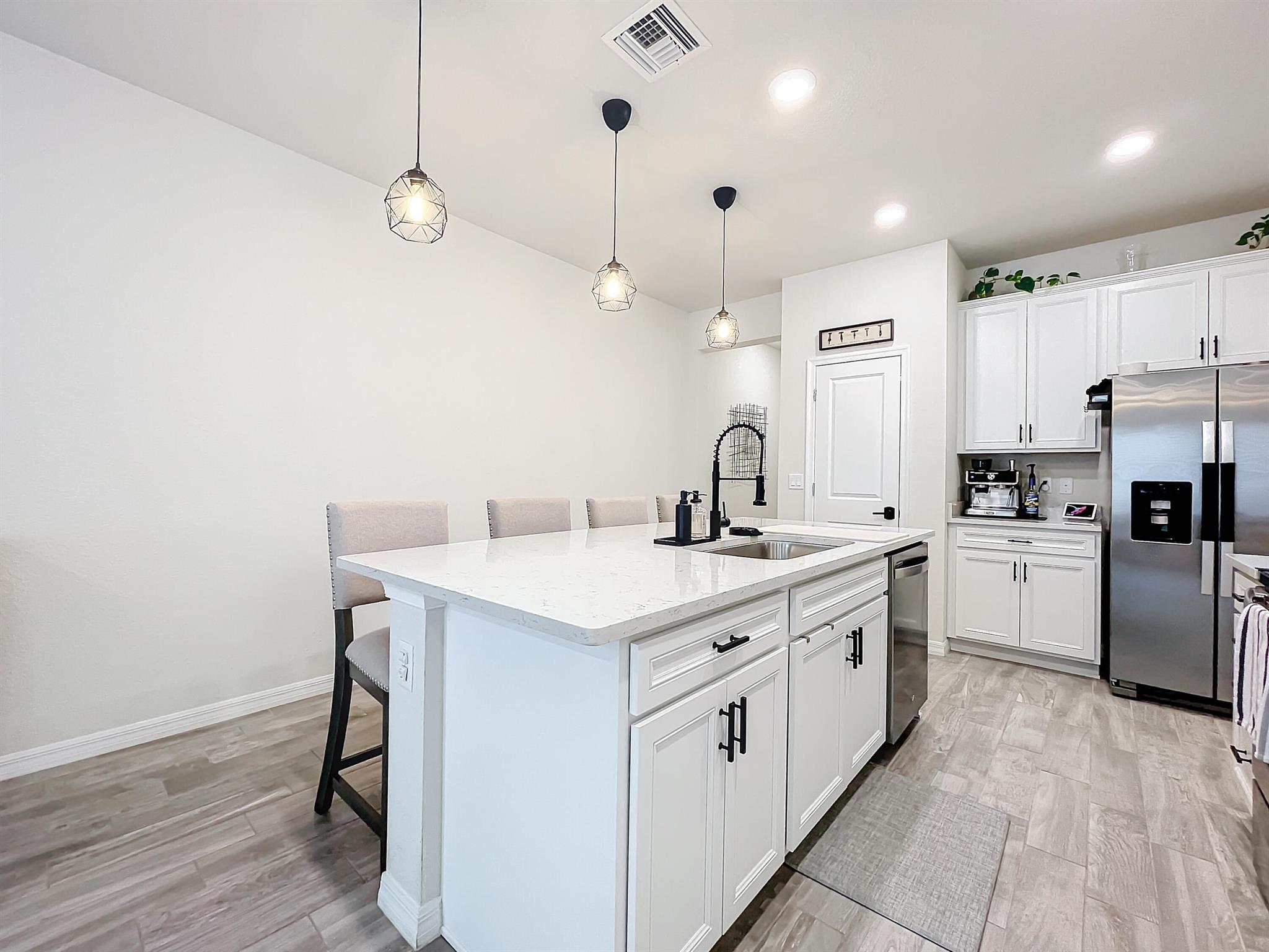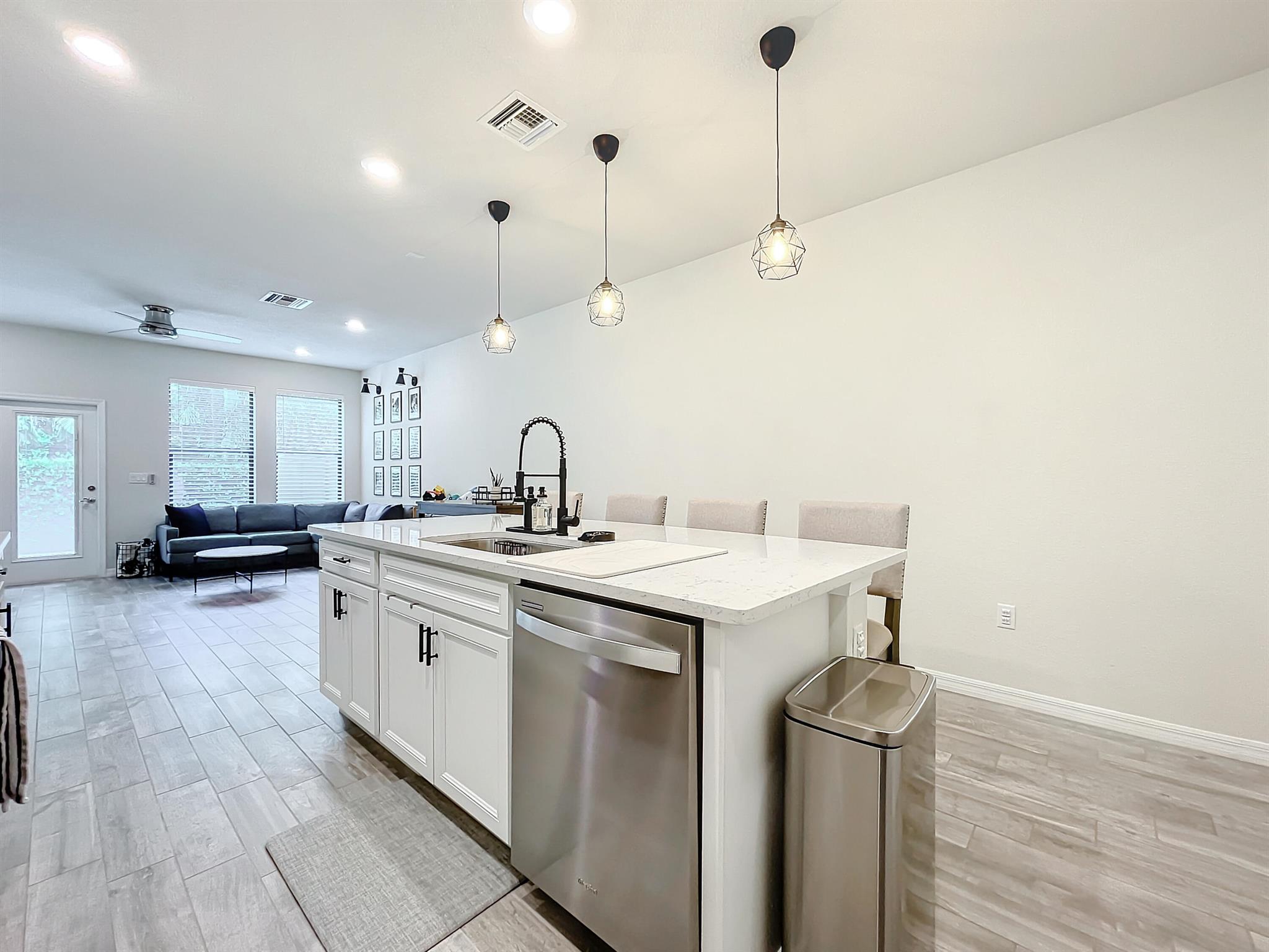 Nestled within the gated community of Preston Square, this spacious and bright 3-bedroom, 2.5-bathroom townhouse offers modern living with thoughtful upgrades. Built just 5 years ago, the home features gorgeous wood tile flooring throughout the first floor. The kitchen boasts 42-inch cabinets, tasteful pendant lights, and extra recessed lighting, providing the perfect ambiance for cooking and entertaining. You will also find quartz countertops in both the kitchen and bathrooms, as well as beautifully upgraded bathroom vanities, adding a touch of luxury to your daily routine. Recently, the dryer was replaced and upgraded, ensuring maximum efficiency and convenience. The front of the home has also been enhanced with fresh new plants and landscaping, adding to the home's curb appeal.