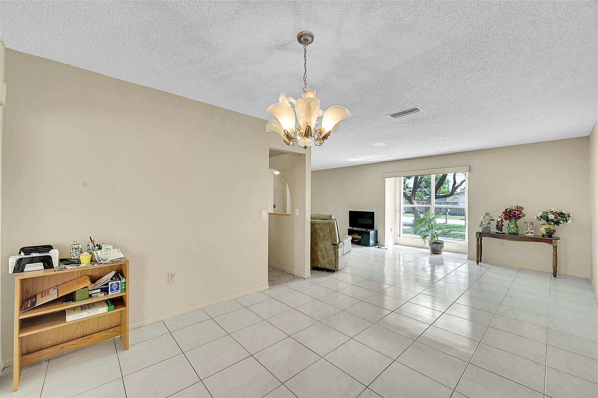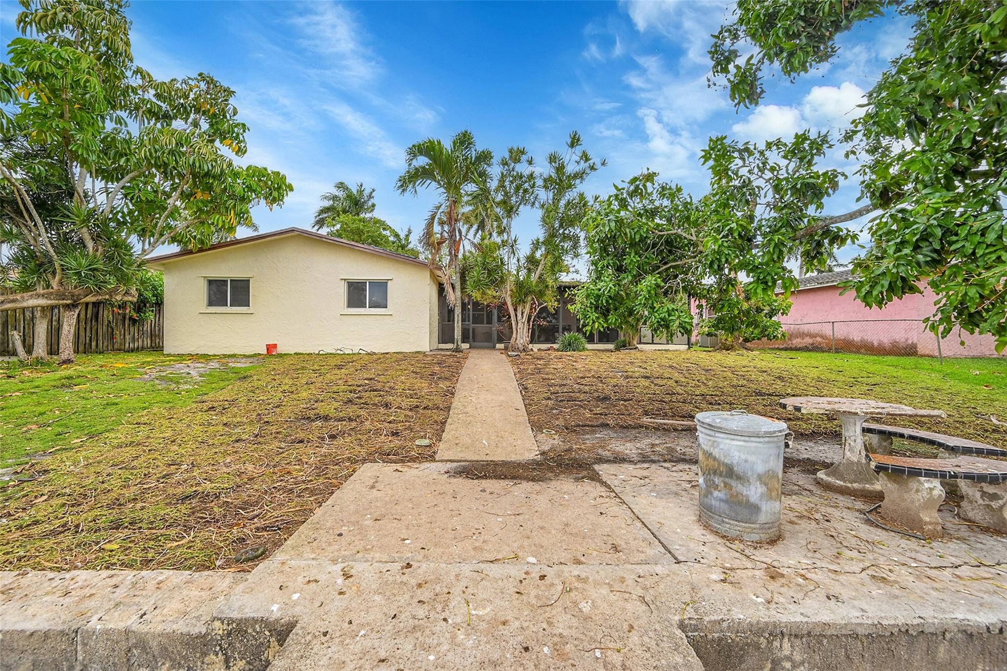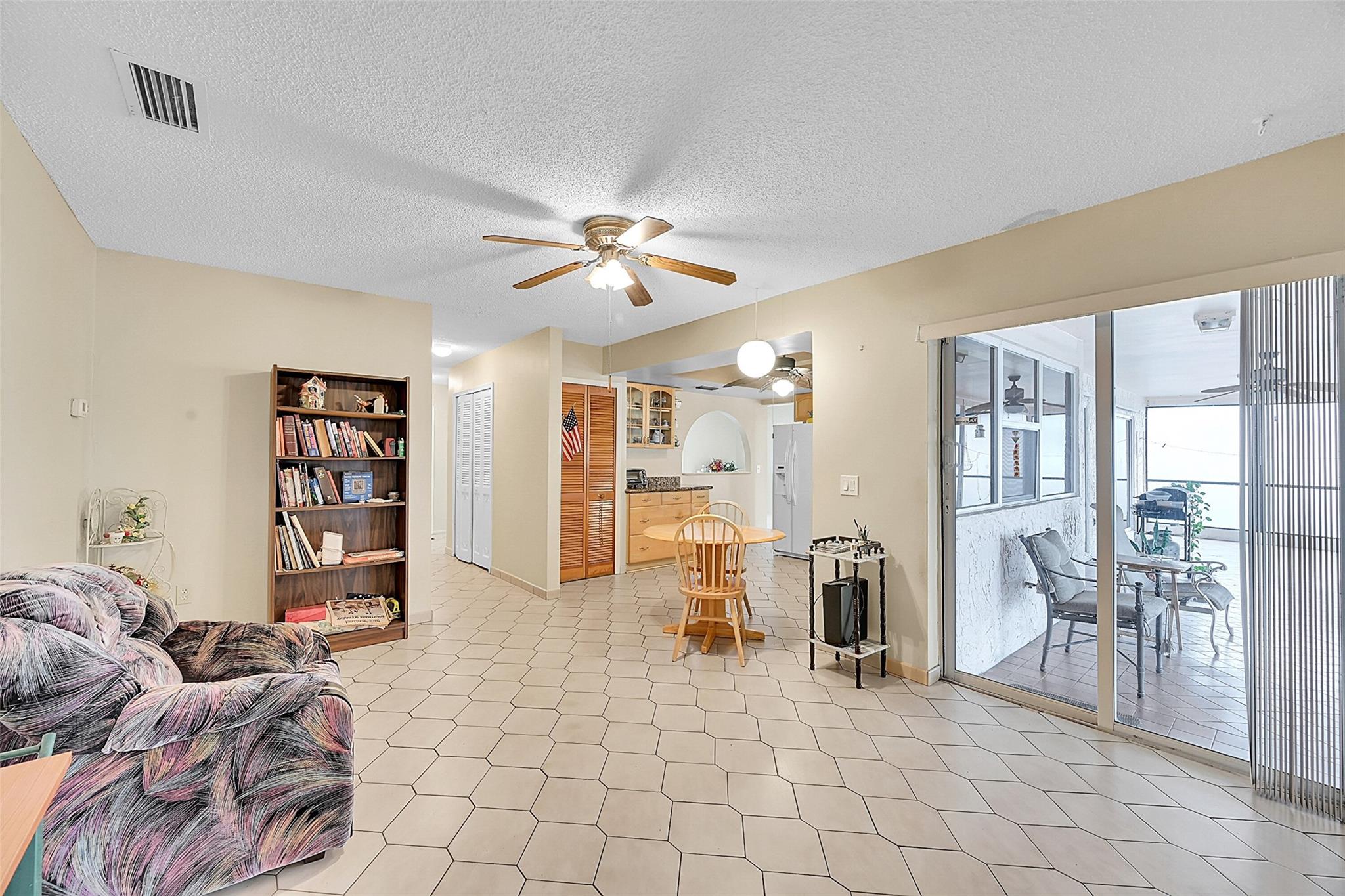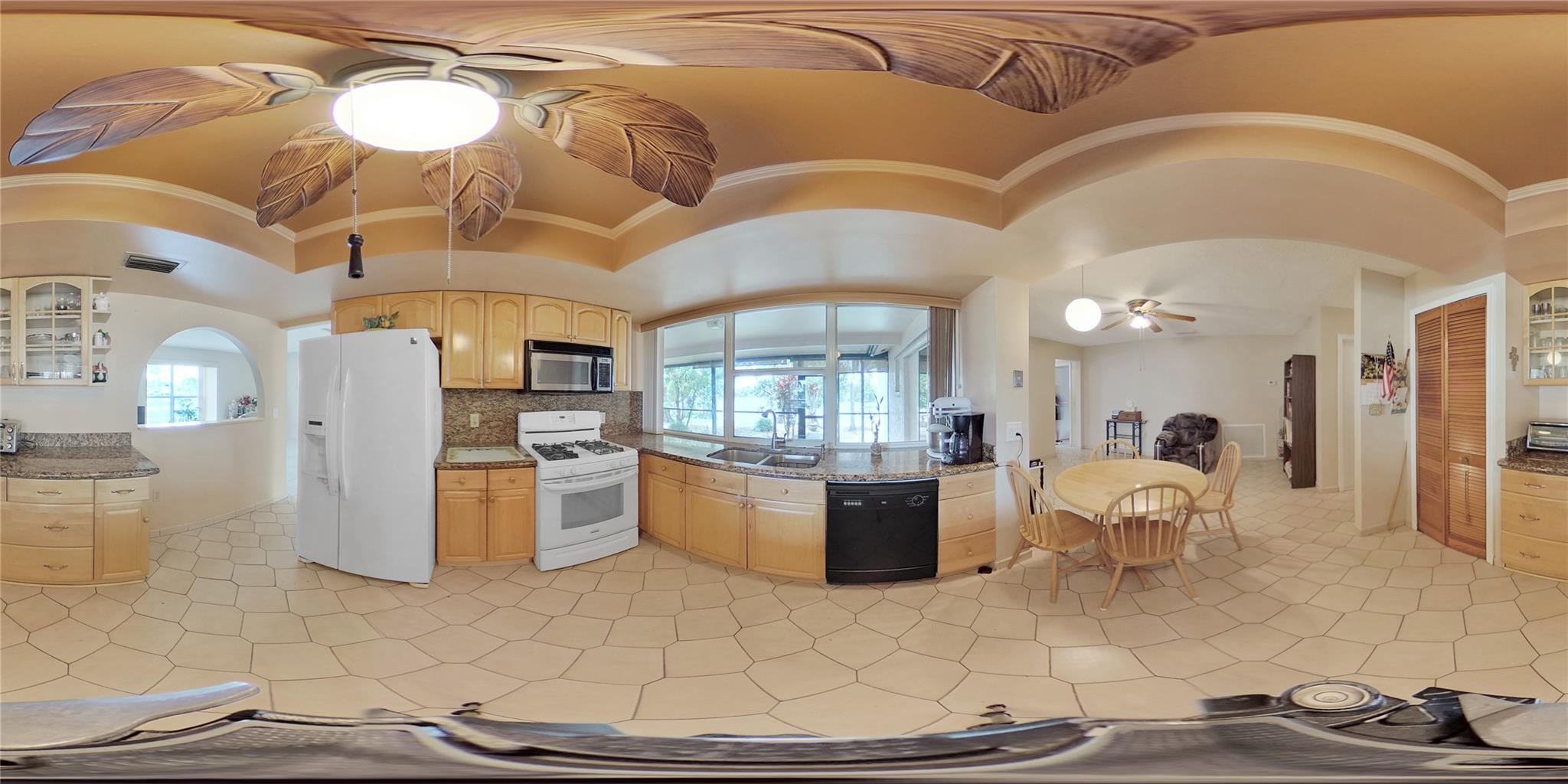 Gorgeous water view from this 3 Bedroom/ 2 Bathroom house with 2-car garage on the wide canal in Sunrise Golf Village. No HOA! Kitchen has Granite countertops, wood cabinetry, and a gas range. Neutral tile flooring throughout with carpet in the master bedroom. Gas water heater. Central AC 2021. New sprinkler pump which is fed off the canal. Split bedroom plan. Combination of hurricane panels and a few Impact windows. Huge screened in back patio with insulated roof and gutters. Circle driveway. Big back yard with plenty of room for a pool.