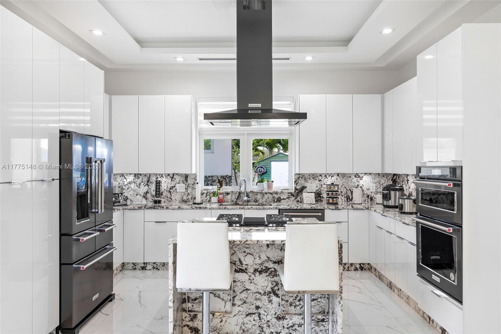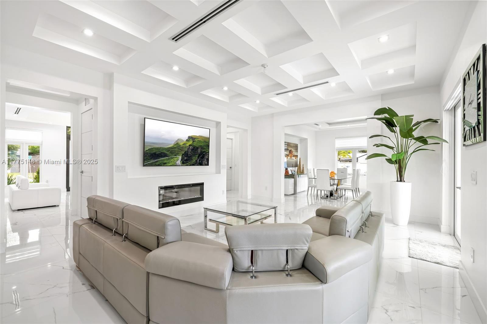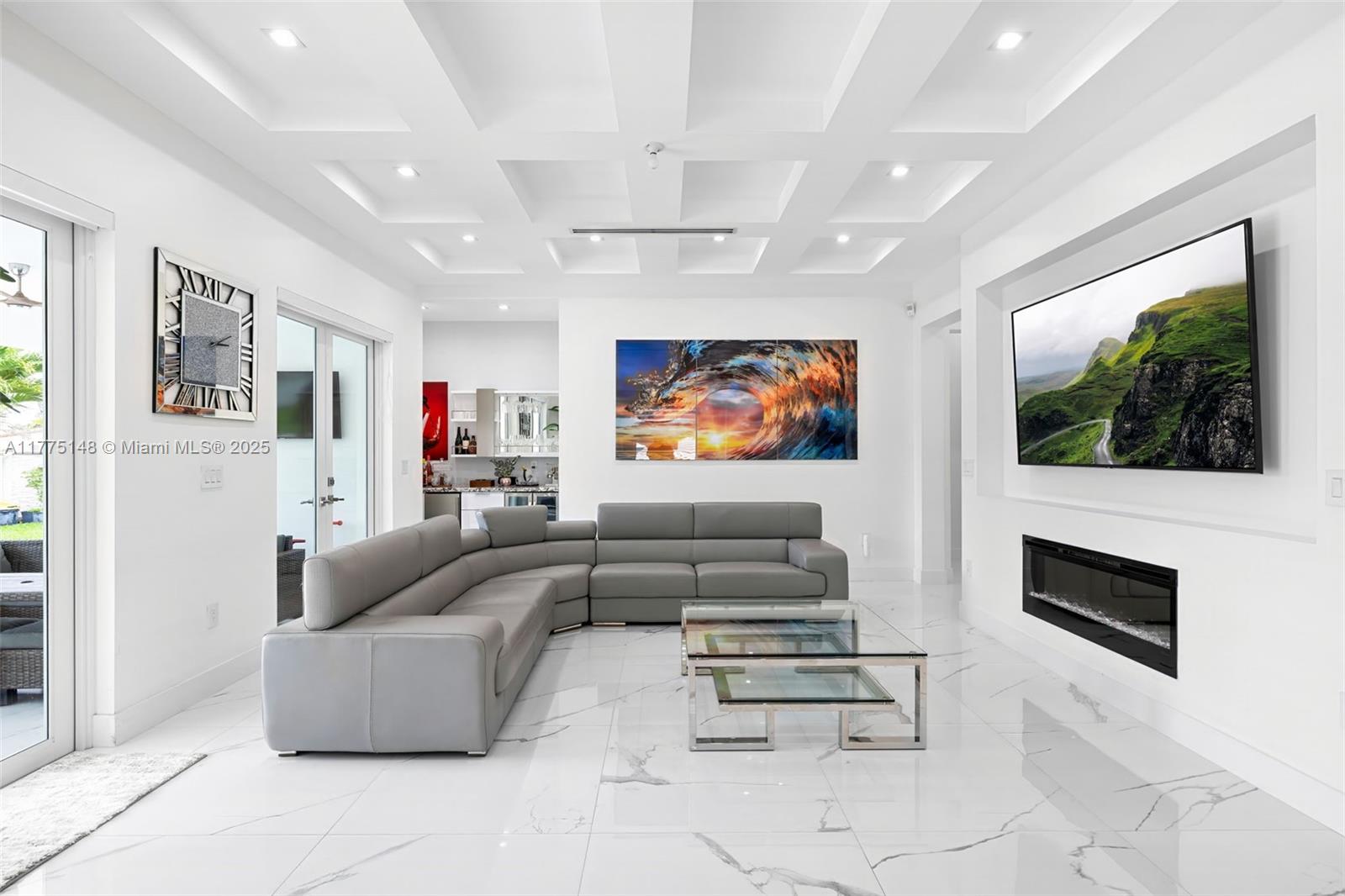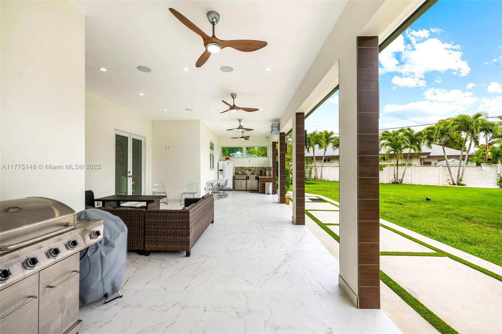 This exceptional property is situated in a coveted neighborhood. On a 24,075 sqft lot, it features 4 bedrooms 4 bathrooms and an extra room that serves as flexible space. Completely remodeled, it boasts 2022 updates to the roof, electric, and plumbing. The interior showcases elegant Spanish porcelain floors and 10.6 ft ceilings, with both indoor and outdoor kitchens adorned with quartzite counters, seamlessly connecting the spaces, and perfect for entertaining. Impact-resistant windows and doors offer security, while LED lighting throughout enhances the home’s bright and vibrant feel. A gas meter powers appliances reducing electricity costs. Additional highlights include two 2020-installed AC units, a security system, and a turbine sprinkler system, ensuring convenience and peace of mind.