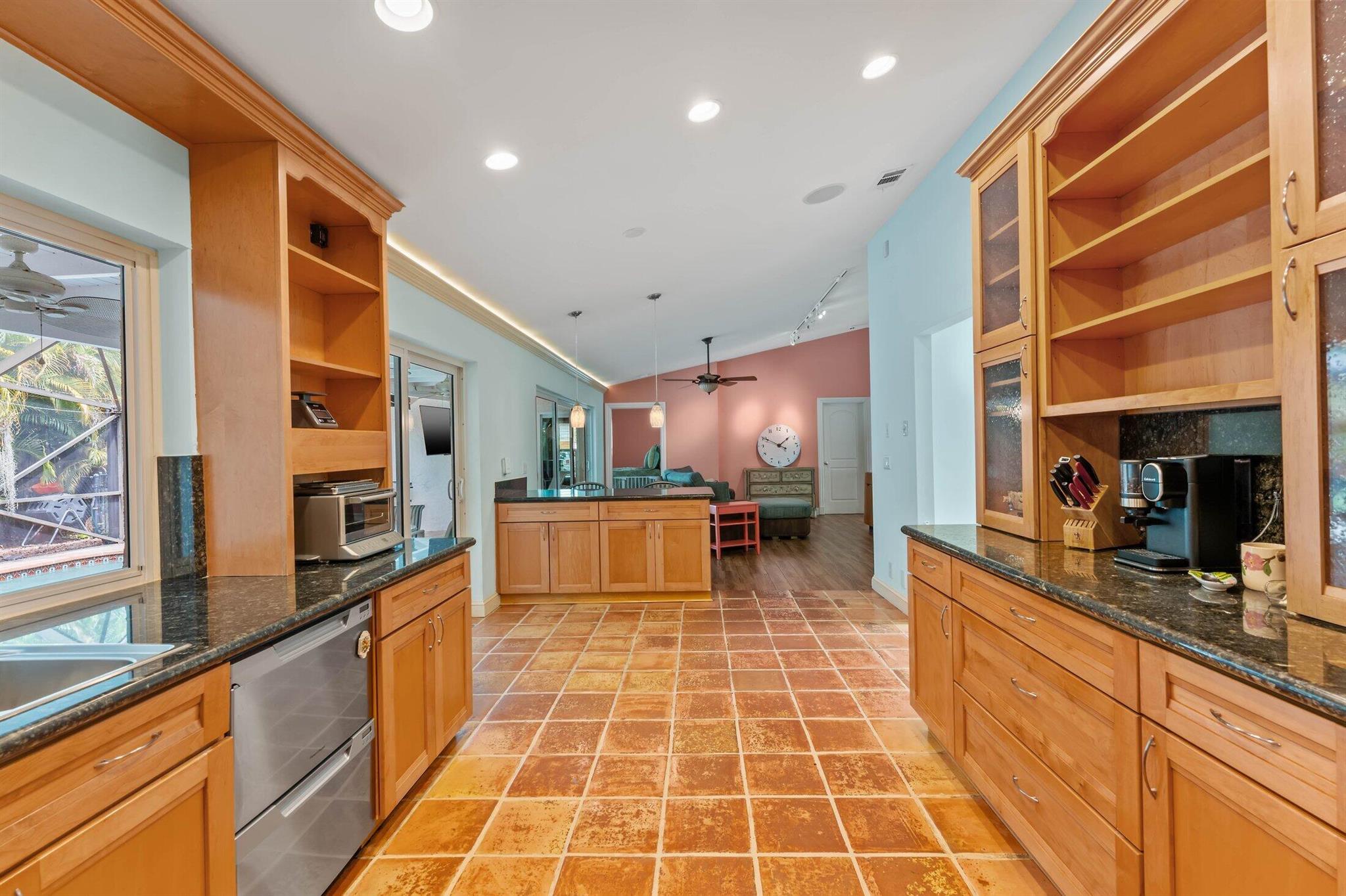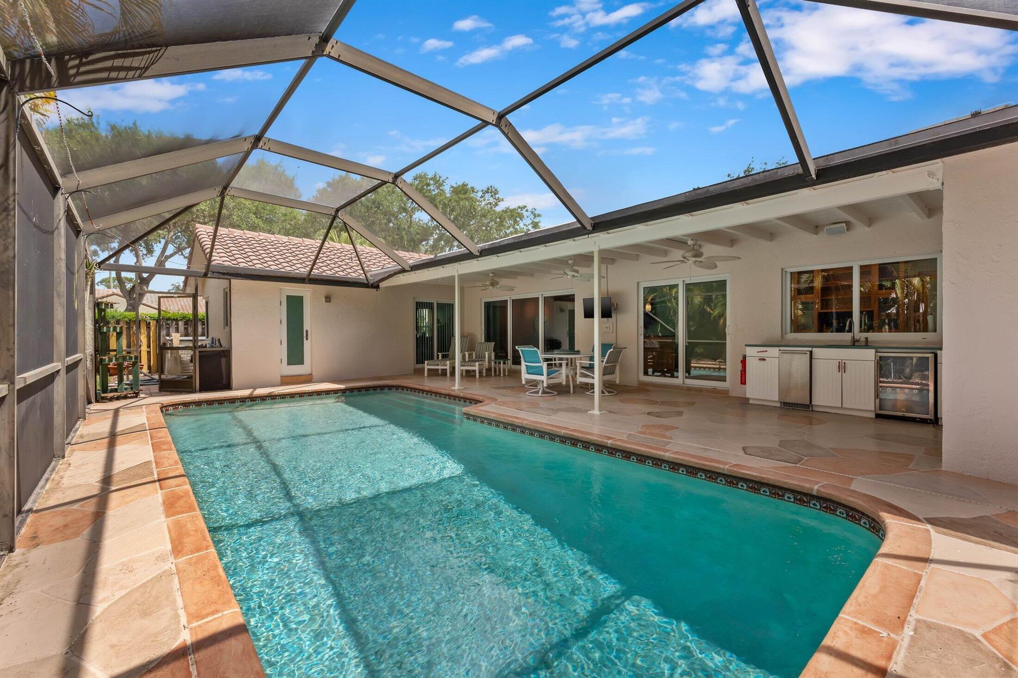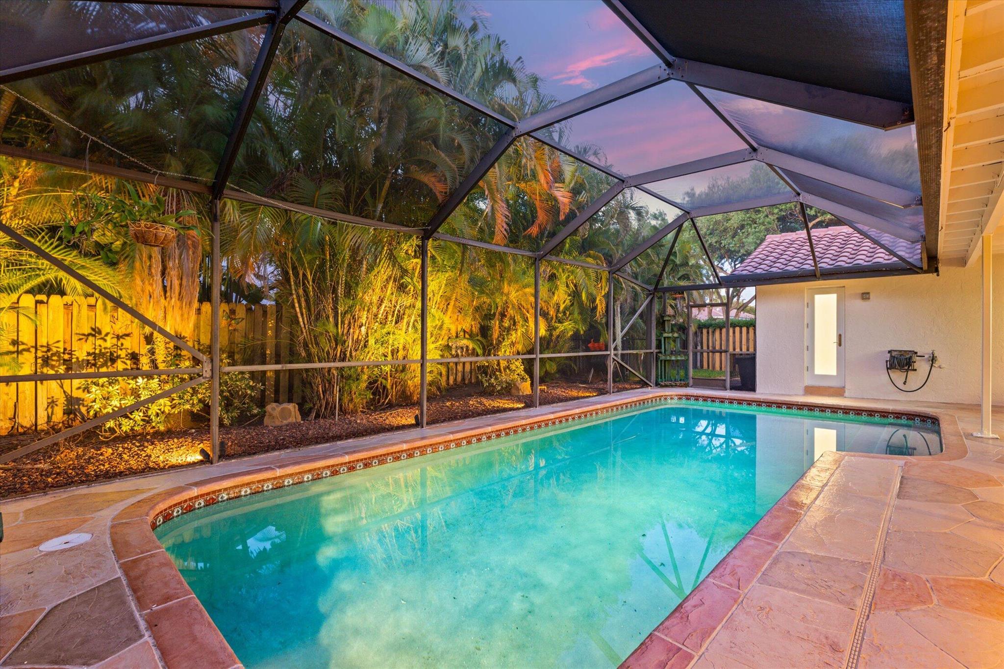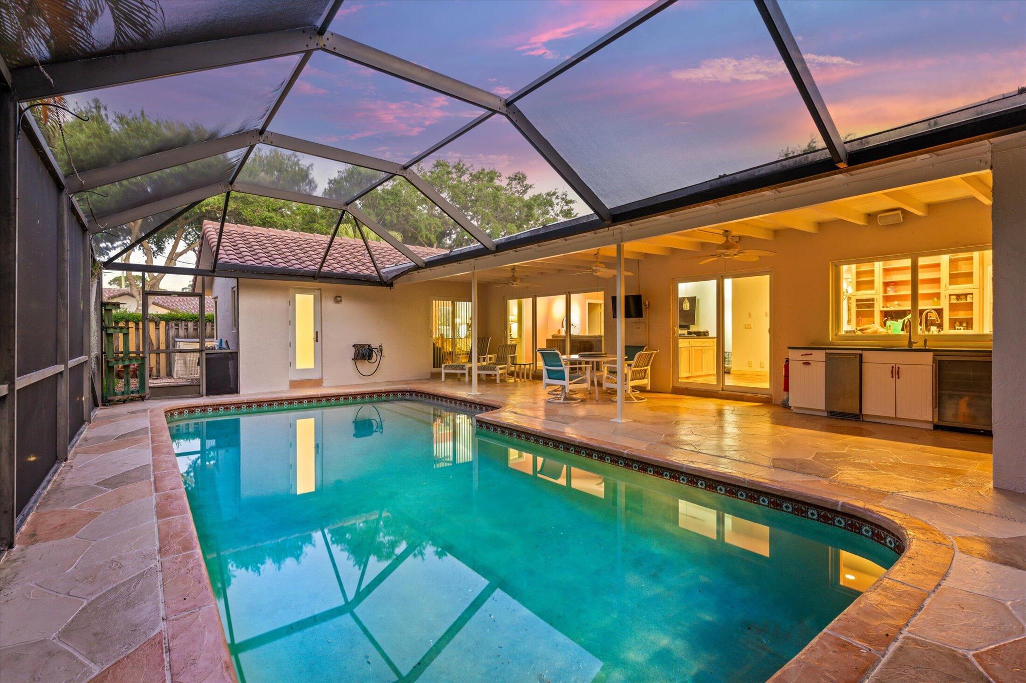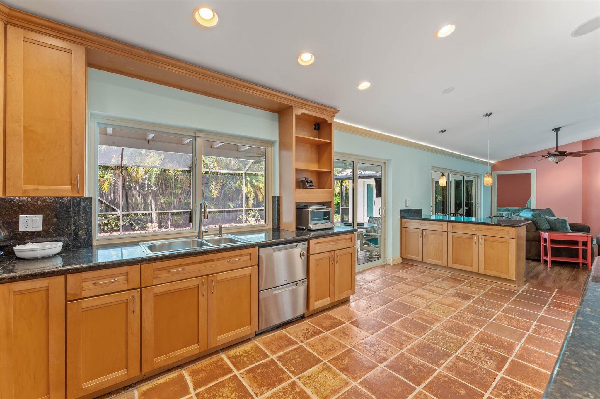 Welcome to your dream home nestled in the picturesque neighborhood of Lakewood Oaks in Boca Raton! This charming single-family residence boasts four spacious bedrooms and two beautifully renovated bathrooms, a family room, separate living room and dining room with skylights, a large kitchen with Pantry and laundry room.Step inside through the front wrought iron entry and open garden into the foyer. You will discover an open concept home with tall ceilings, beautiful Mexican Tile, and a floor plan that can easily accommodate many different living options. The kitchen gleams with stainless steel appliances, a sink overlooking your pool & yard, plus plenty of cabinets, some with glass fronts, granite countertops and breakfast bar area.
