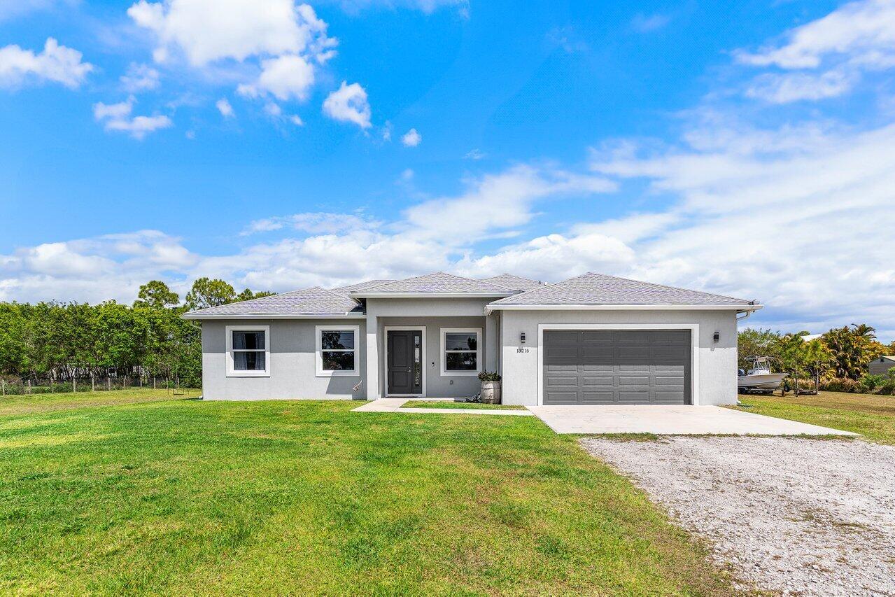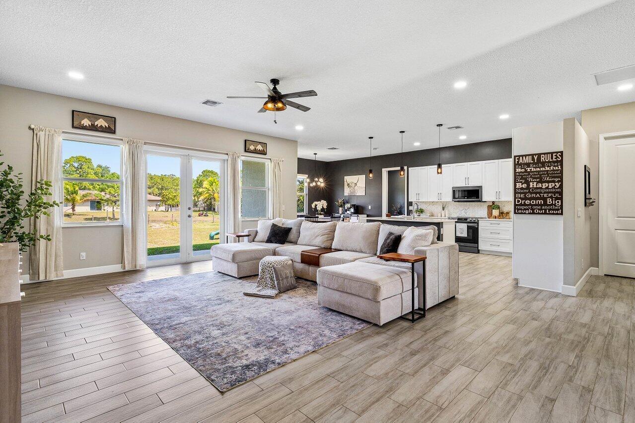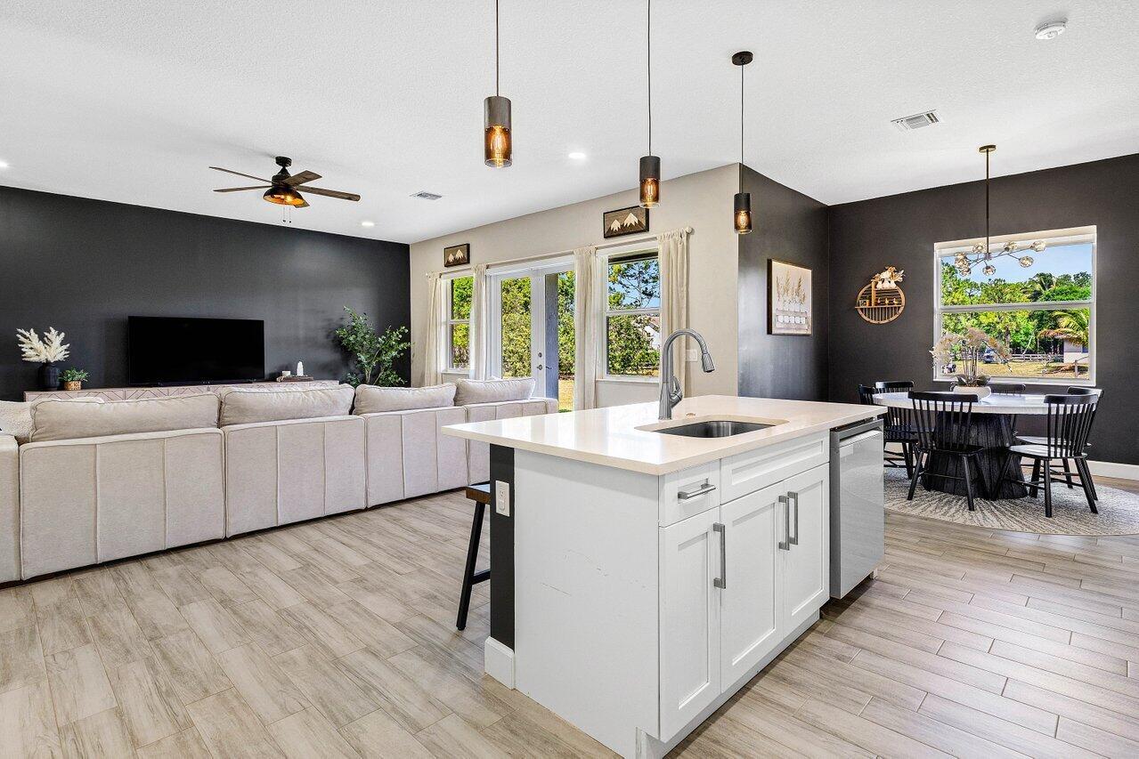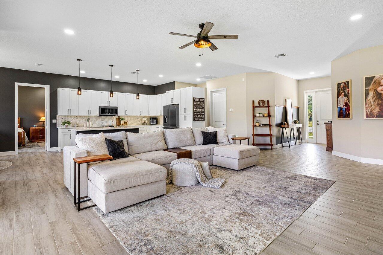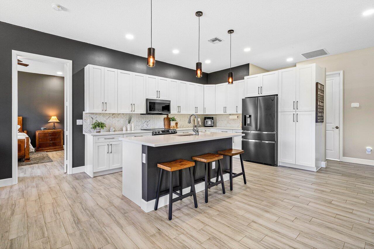 WELCOME HOME This well appointed 2021 built gem is resting on a premium 1.15 acre lot and boasting 4 true bedrooms, PLUS den, 2 full baths, 2 car garage, upgrades galore, hurricane impact windows and doors throughout and this beauty is in a superb location! ENTERING you will discover that this home is on a fully fenced high and dry lot with no pond and a covered entry that brings you inside where you are greeted by a 12' x 6' foyer, volume ceilings, abundance of natural lighting and gorgeous kitchen that features; smart Samsung stainless steel appliance package, white Carrara quartz counter tops, herringbone granite backsplash, spacious island with bar, 42 inch shaker style and soft close cabinetry, pantry and overlooks the abundant green space. PASSING THROUGH you will find (CLICK)