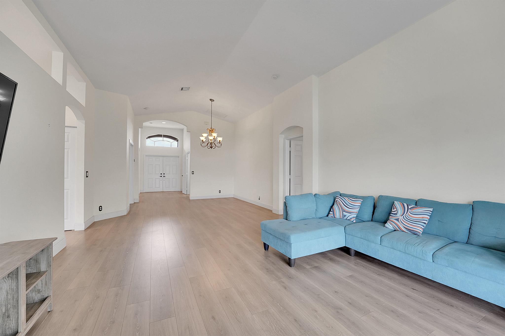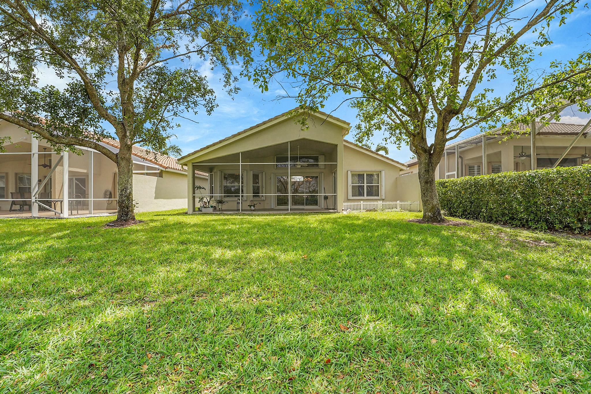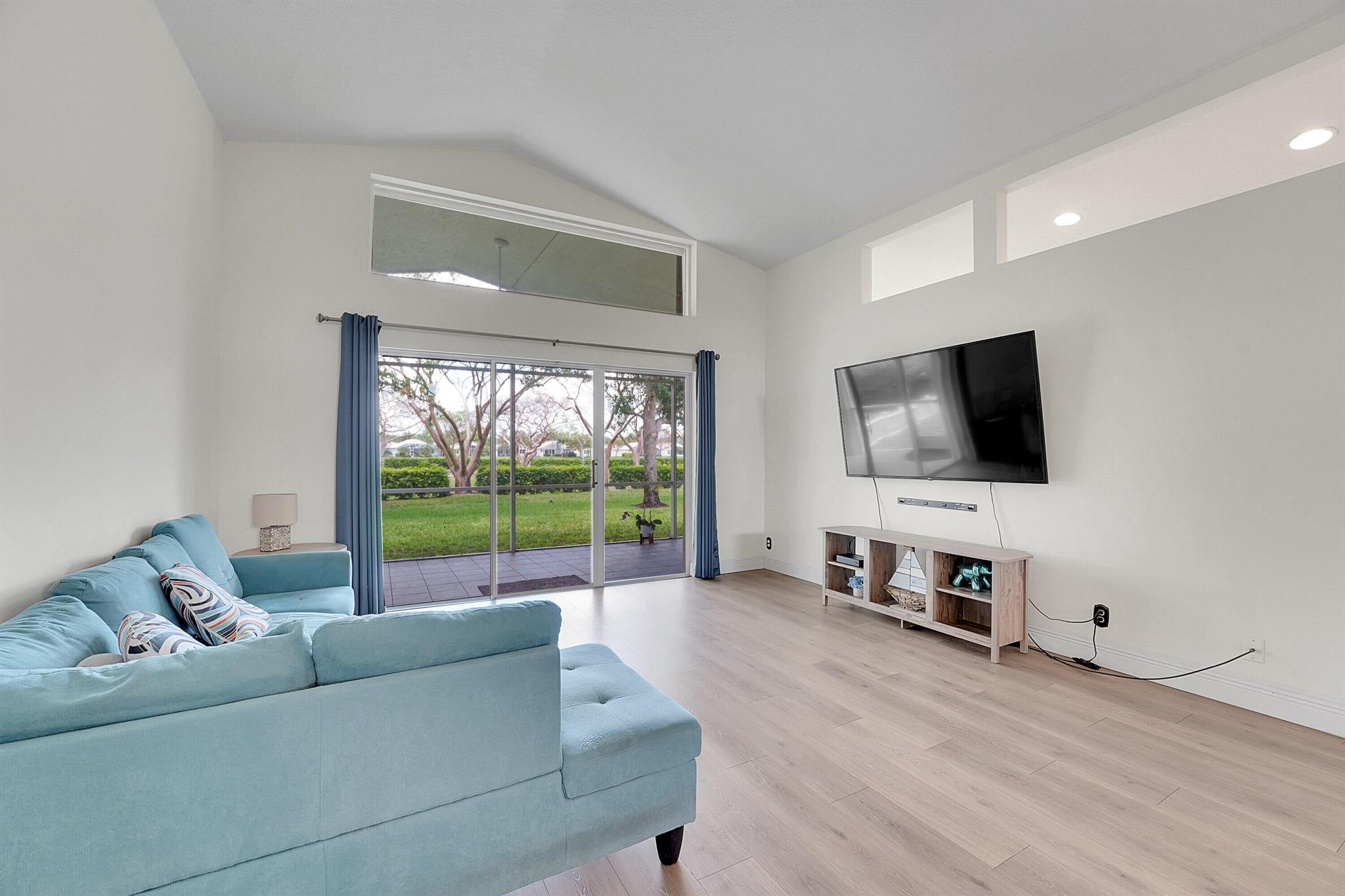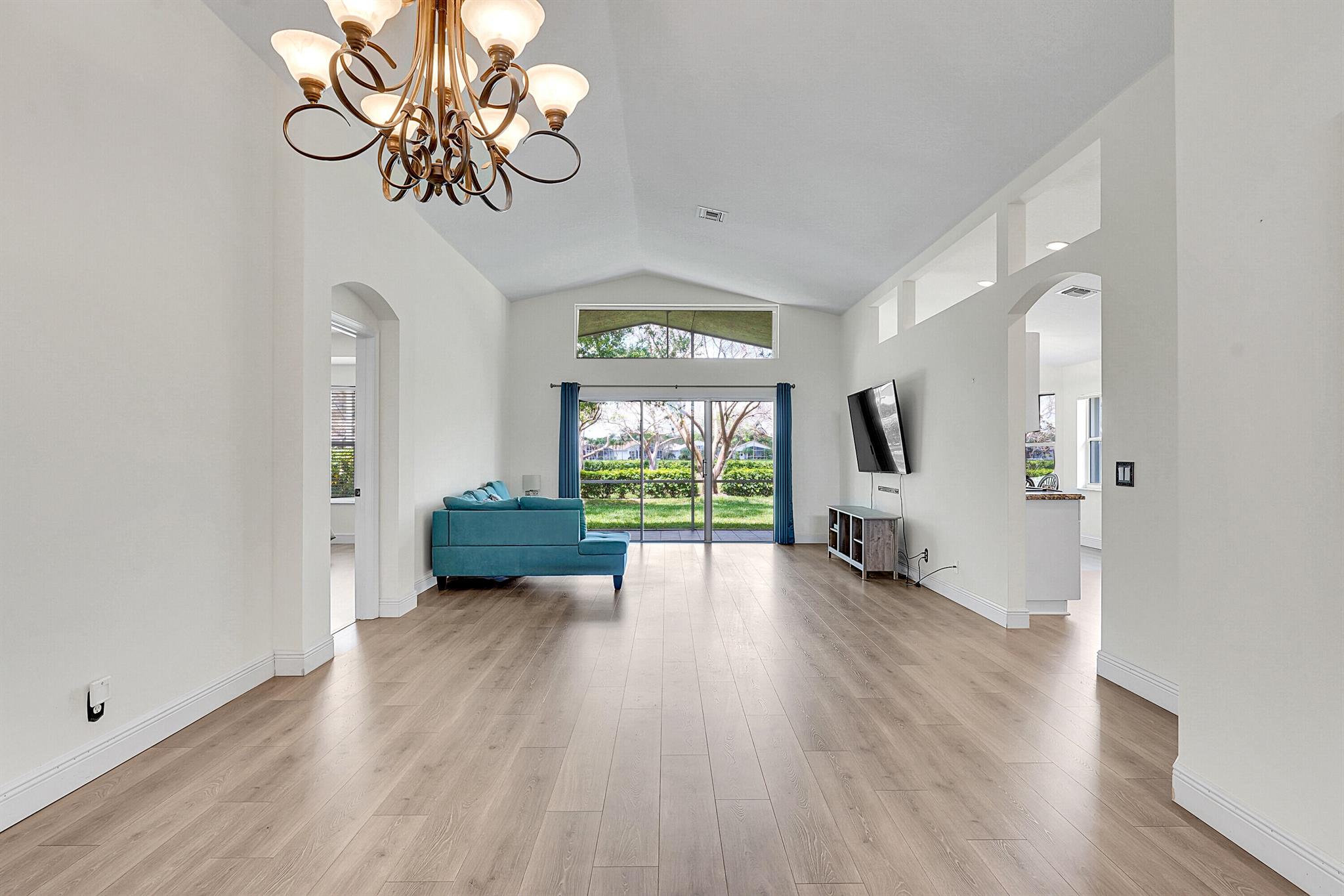 Beautifully upgraded 3BR/2BA - Ferrera model offers a spacious open-concept design enhanced by vaulted cathedral ceilings, creating a dramatic flow and stunning views of the tree-lined, private backyard. The kitchen features crisp white cabinetry, granite countertops, stainless steel appliances, and modern fixtures. New grey-toned wood-style laminate flooring runs throughout the main living areas and bedrooms, accented by upgraded extended base moldings. The owner's suite includes a tray ceiling, two walk-in closets (one with a custom California-style organizer), and a recently renovated en-suite bath with an oversized step-in shower and dual vanities. Relax and unwind on the covered and screened patio, which spans the back of the home and offers peaceful views of the lush private yard.