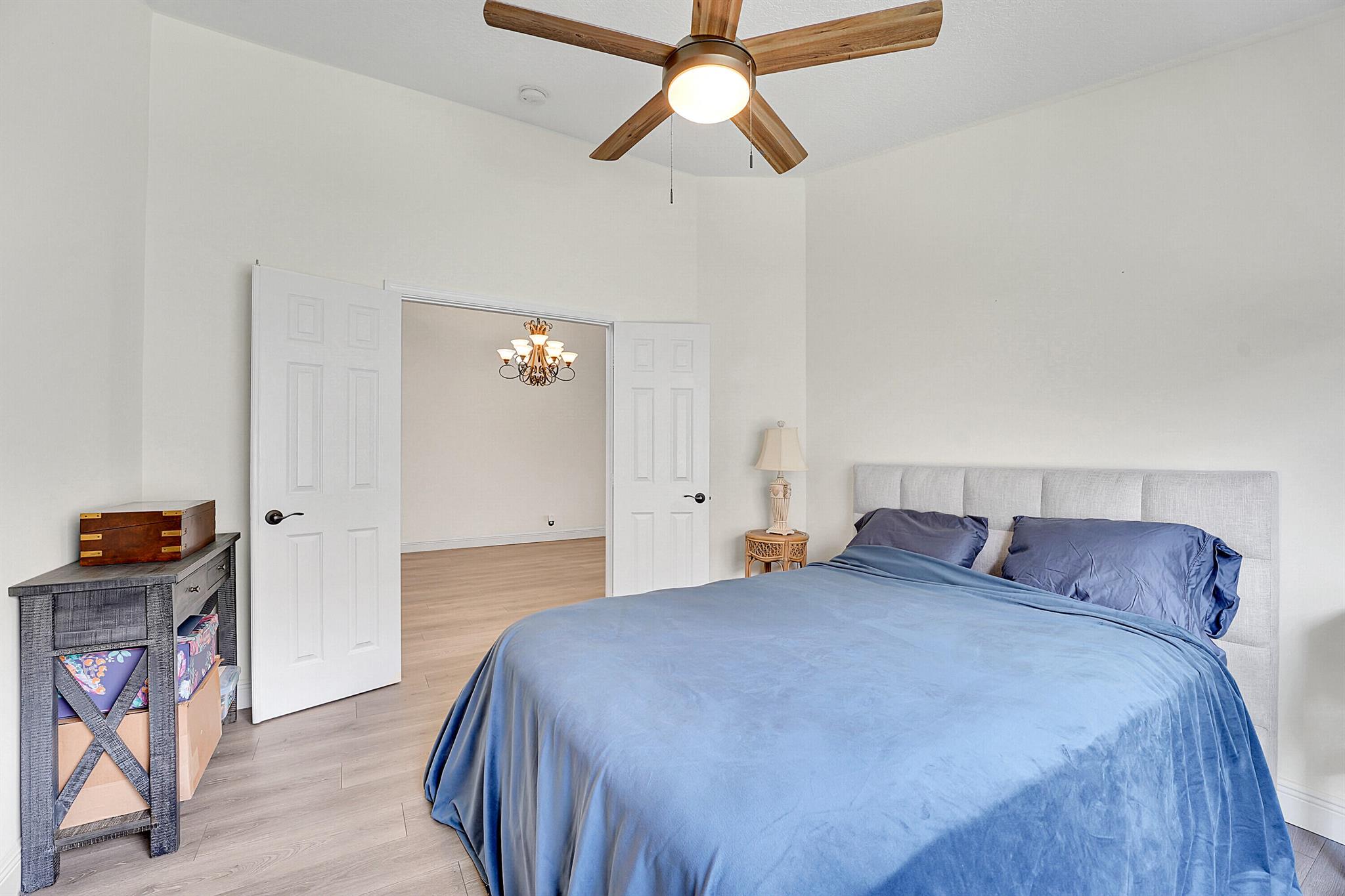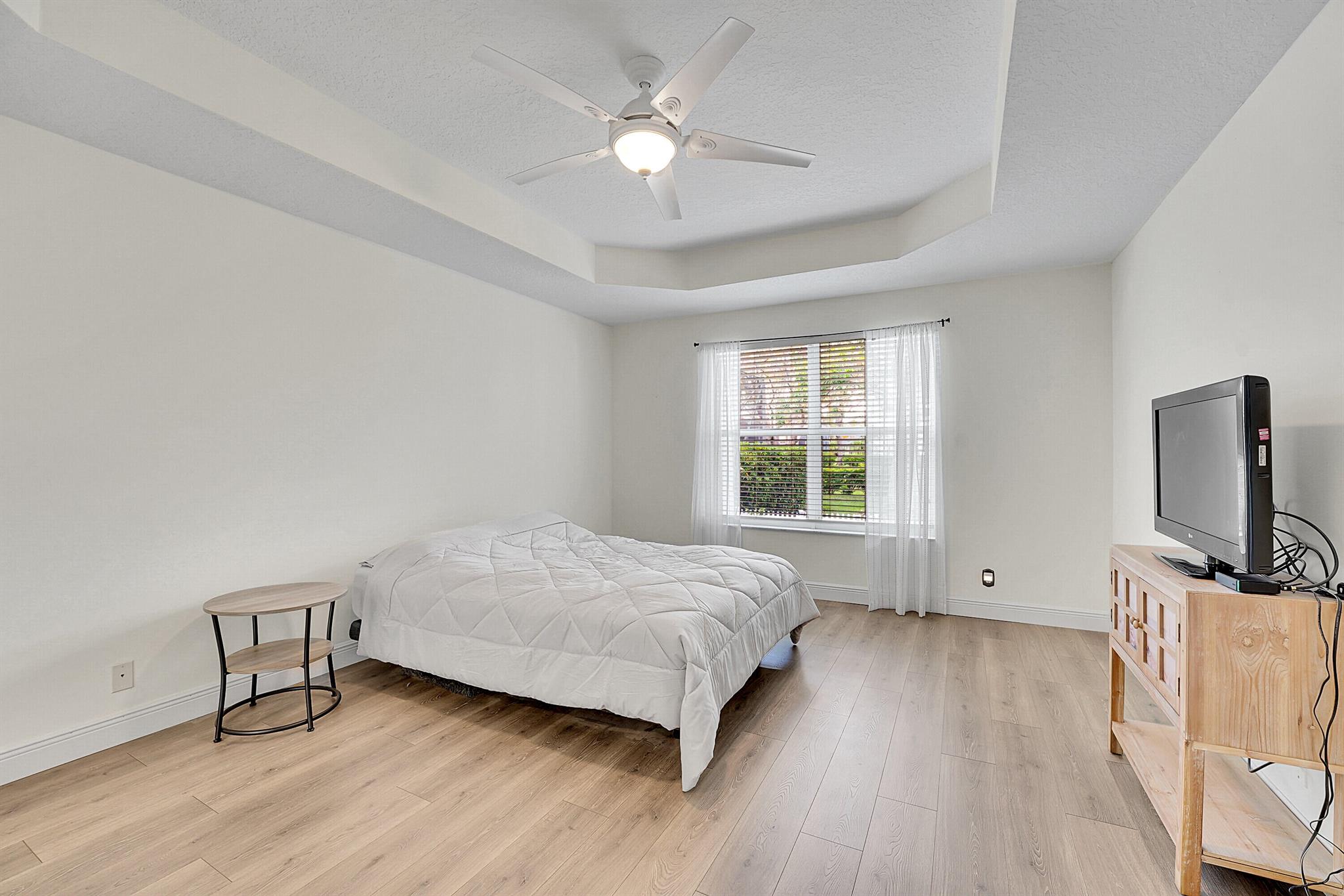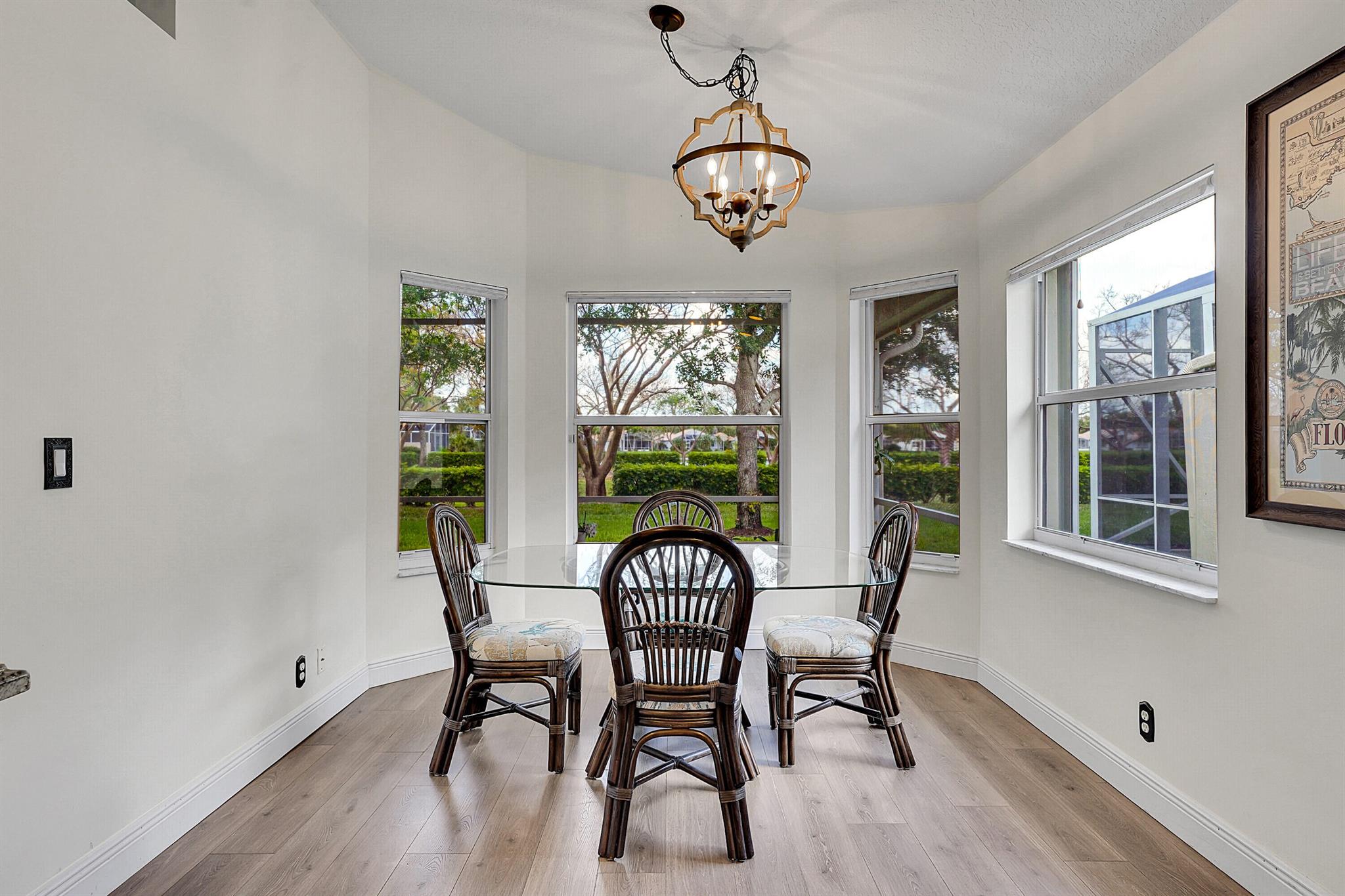 Beautifully upgraded 3BR/2BA - Ferrera model offers a spacious open-concept design enhanced by vaulted cathedral ceilings, creating a dramatic flow and stunning views of the tree-lined, private backyard. The kitchen features crisp white cabinetry, granite countertops, stainless steel appliances, and modern fixtures. New grey-toned wood-style laminate flooring runs throughout the main living areas and bedrooms, accented by upgraded extended base moldings. The owner's suite includes a tray ceiling, two walk-in closets (one with a custom California-style organizer), and a recently renovated en-suite bath with an oversized step-in shower and dual vanities. Relax and unwind on the covered and screened patio, which spans the back of the home and offers peaceful views of the lush private yard.