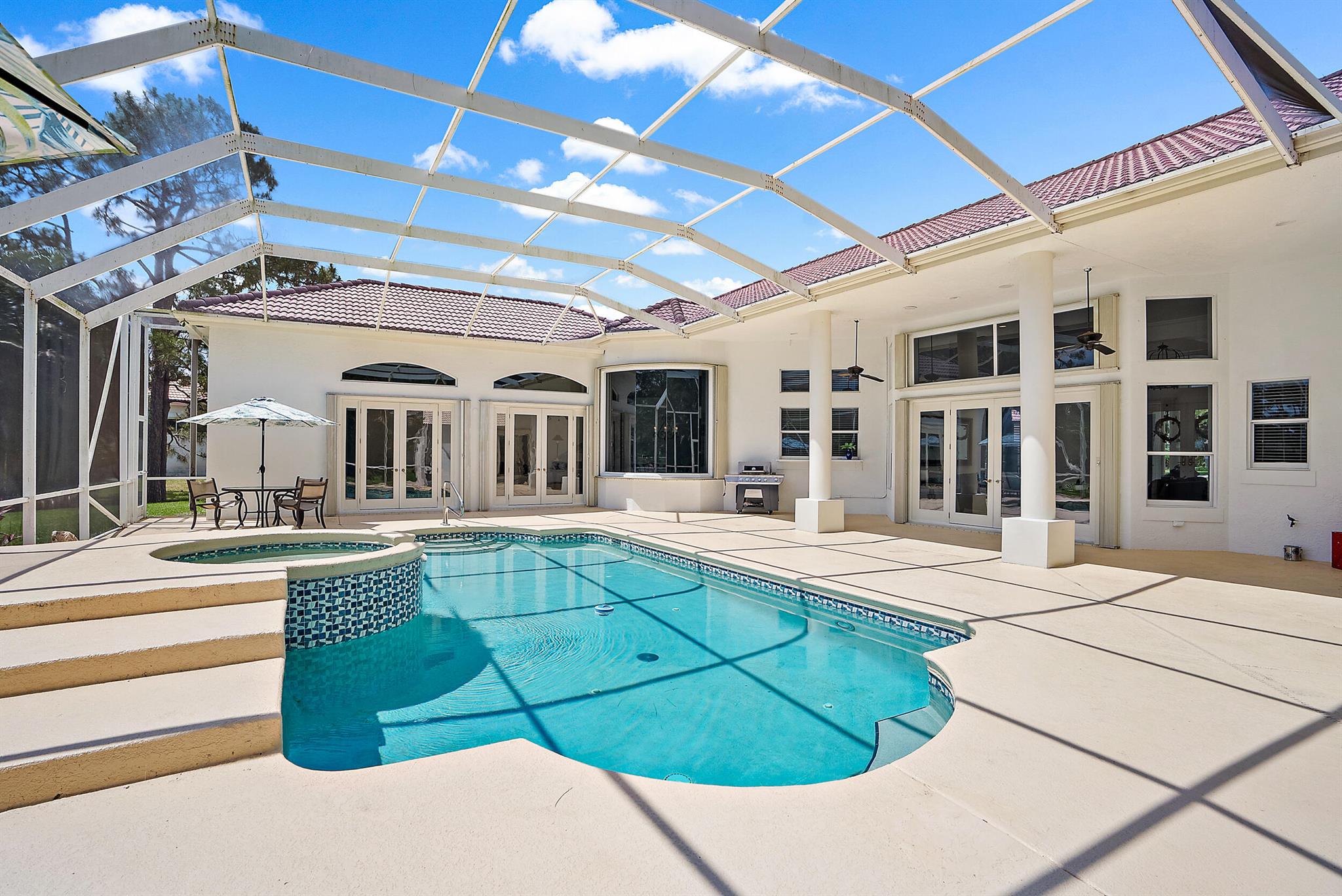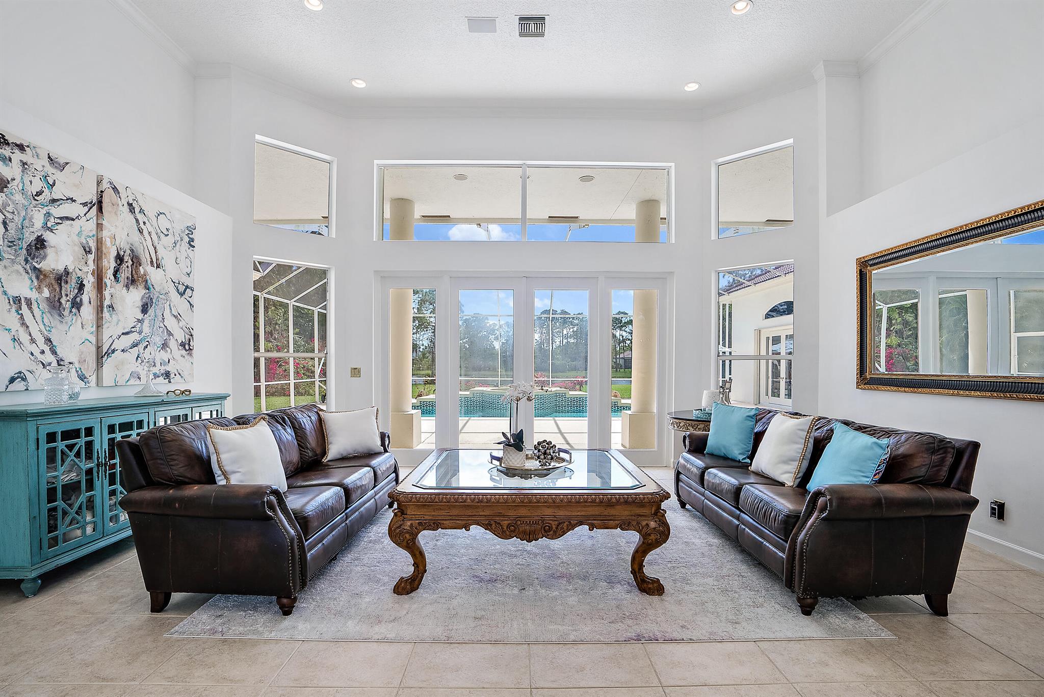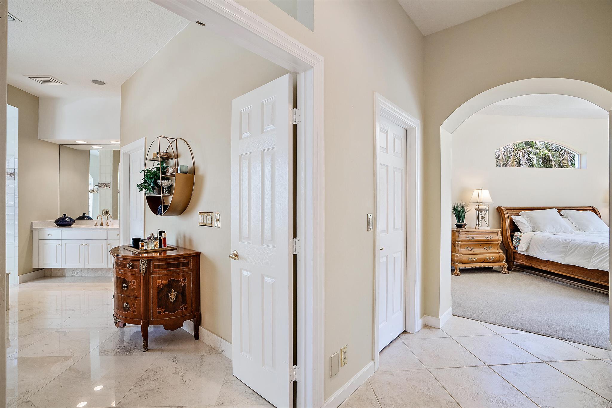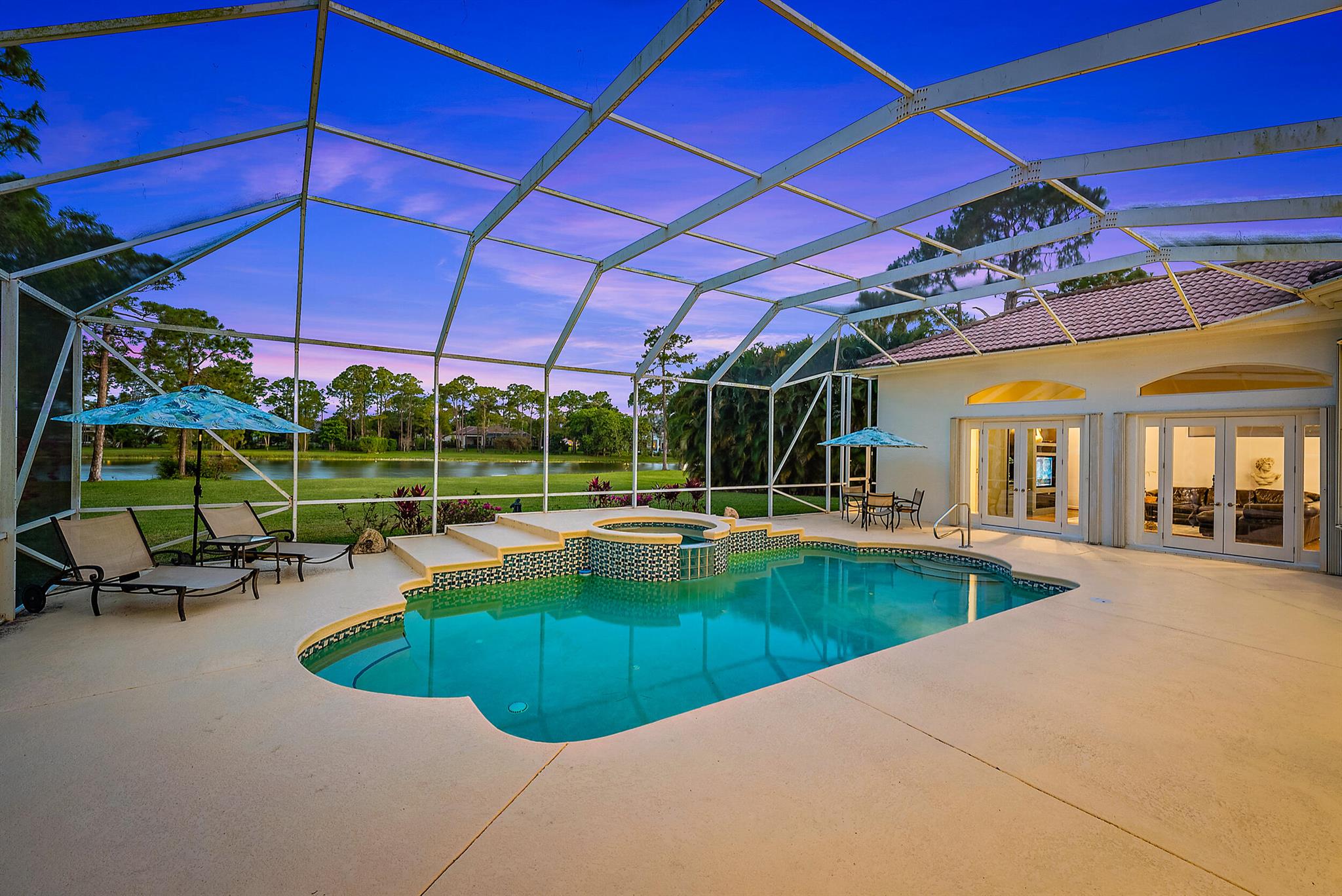 Welcome to your own 1.05 ACRE ESTATE located in the sought-after Bay Hill Estates neighborhood of Palm Beach Gardens. From the moment you approach the magnificent property, you'll be wowed by the dramatic circular driveway and regal Porte Cochere entry, flanked by lion statues. Perfect for entertaining and casual living, the open floor plan has expansive views of the lake from most of the windows in the home. Soaring 18-foot ceilings in the living room provide major architectural drama, while the outdoor pool and open patio draws one's eye outside to the tropically landscaped property. Enjoy immense privacy as you're secluded from neighbors. Three full bedrooms, including a spacious 15ft x 24ft Primary Bedroom, plus a convertible bedroom/den/office. Both secondary bedrooms are en suite.