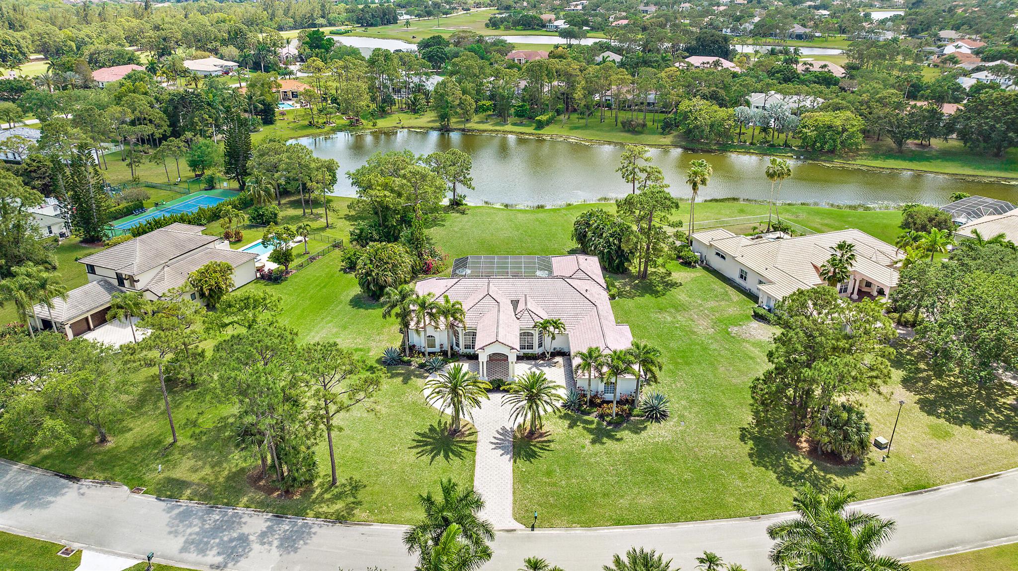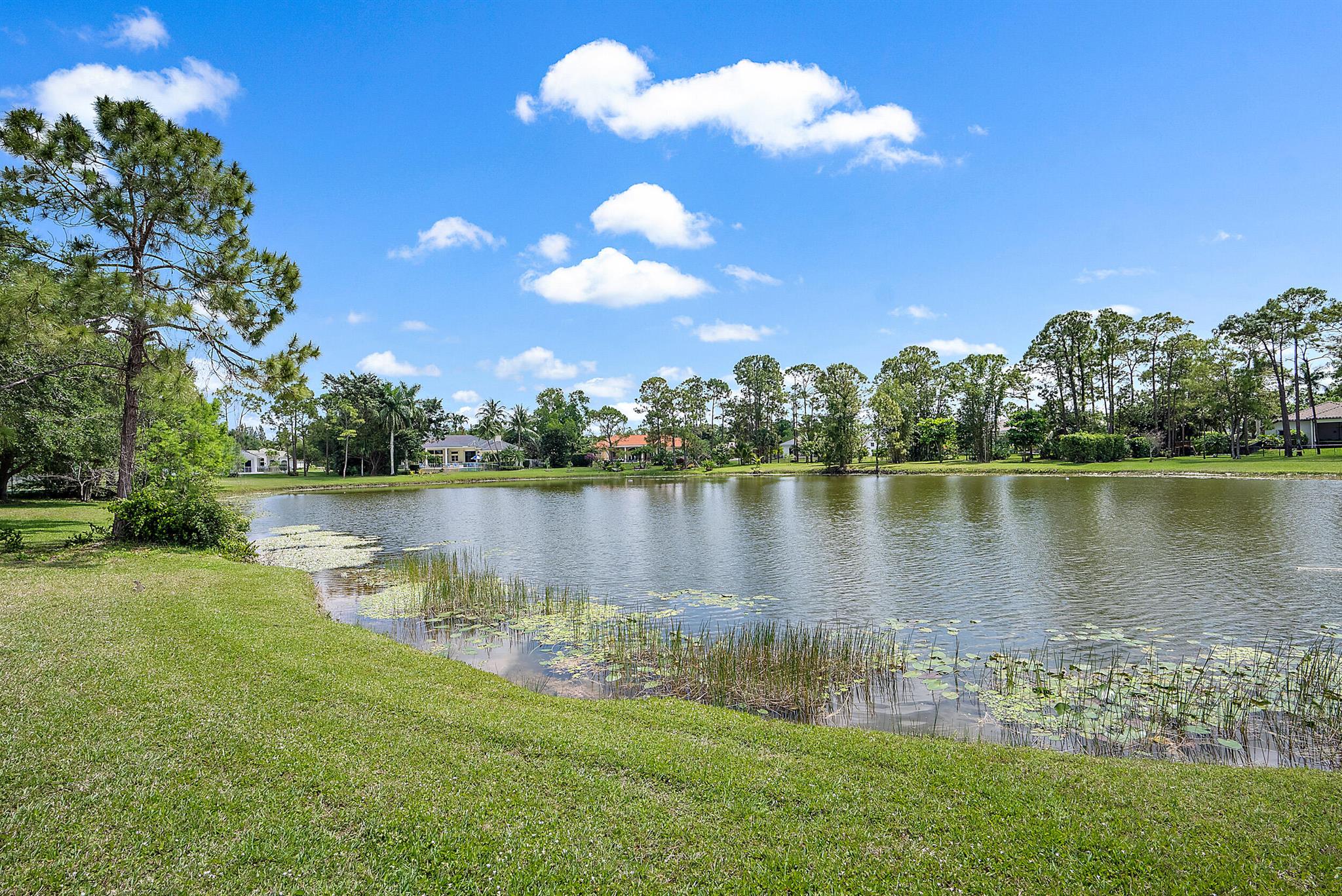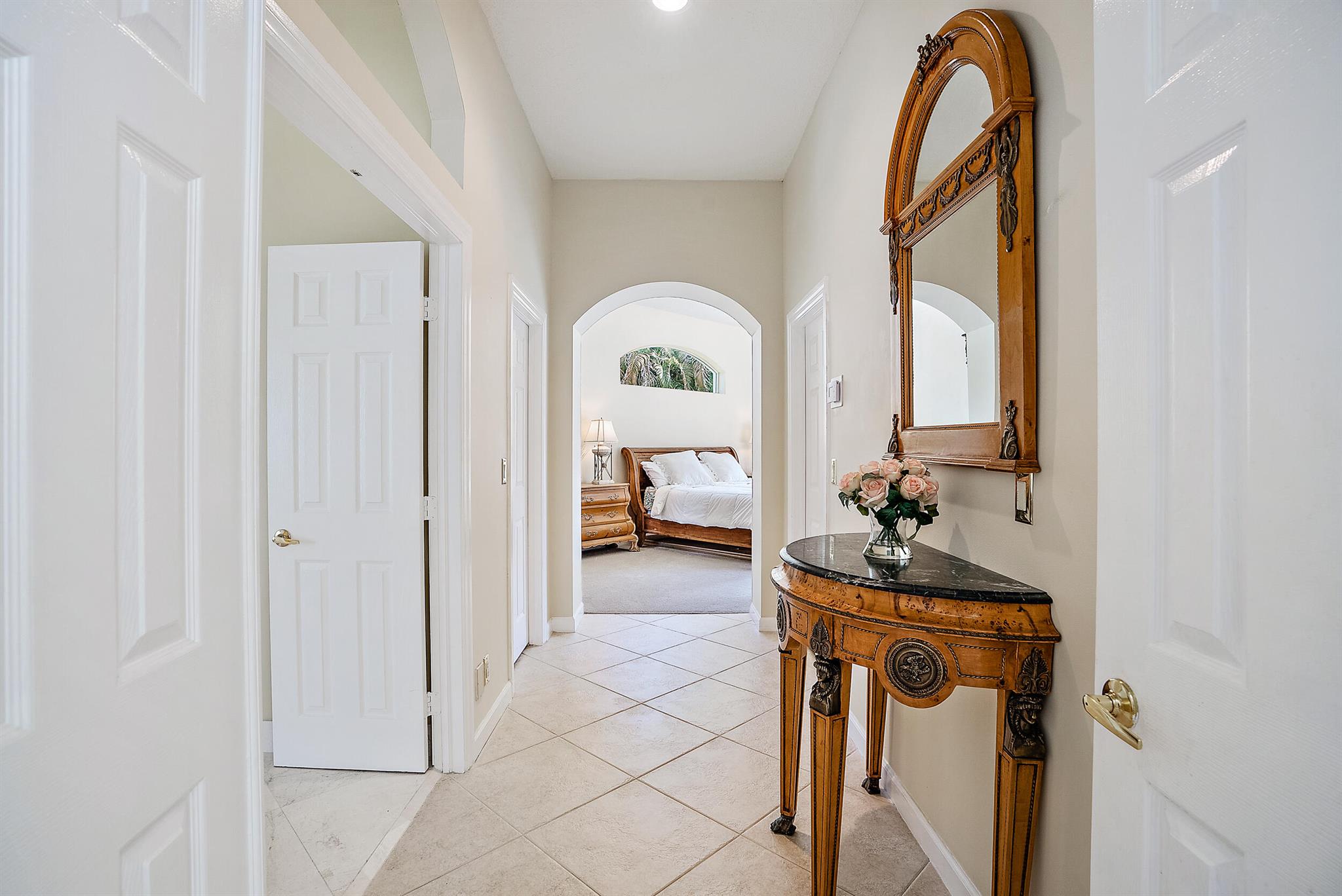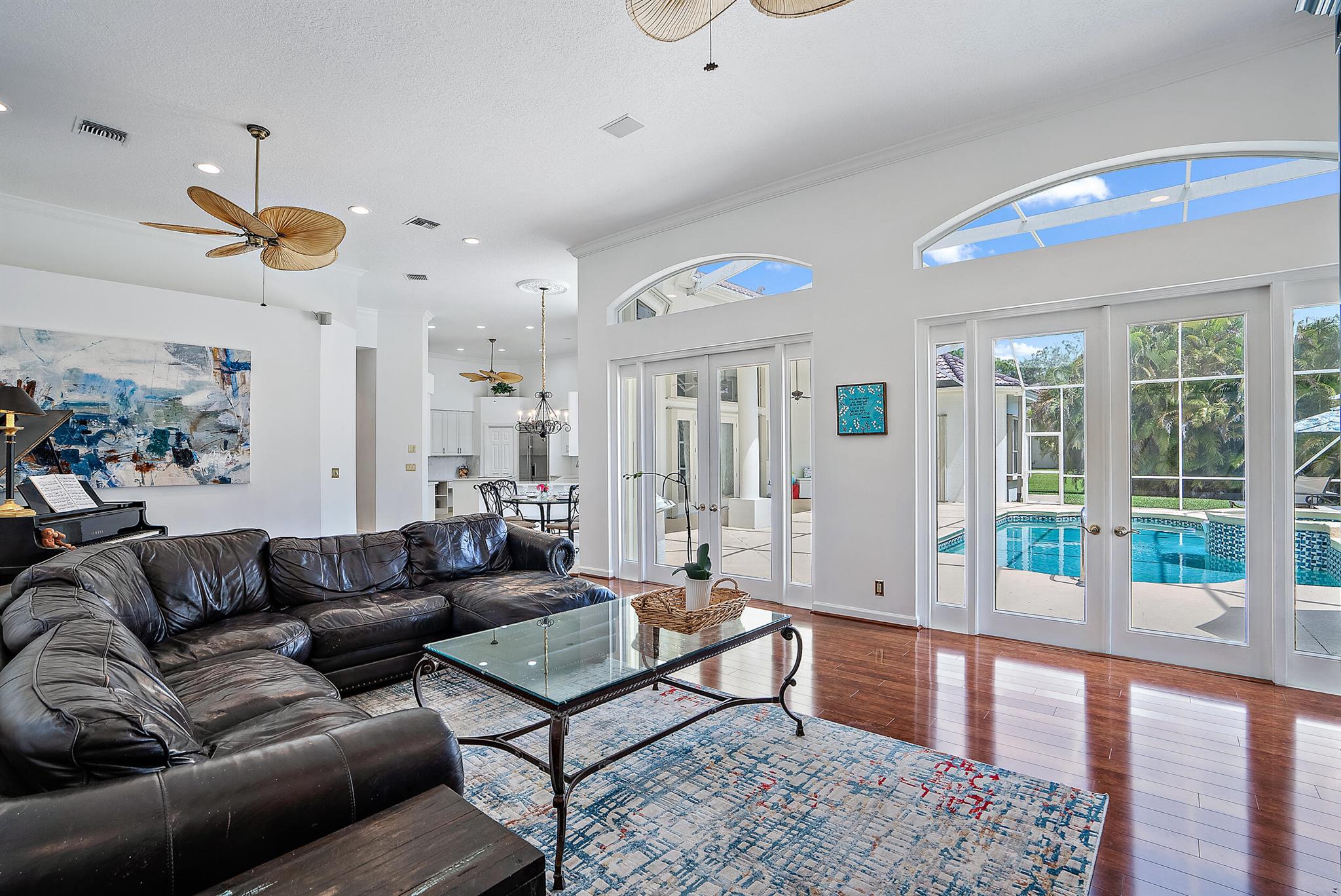 Welcome to your own 1.05 ACRE ESTATE located in the sought-after Bay Hill Estates neighborhood of Palm Beach Gardens. From the moment you approach the magnificent property, you'll be wowed by the dramatic circular driveway and regal Porte Cochere entry, flanked by lion statues. Perfect for entertaining and casual living, the open floor plan has expansive views of the lake from most of the windows in the home. Soaring 18-foot ceilings in the living room provide major architectural drama, while the outdoor pool and open patio draws one's eye outside to the tropically landscaped property. Enjoy immense privacy as you're secluded from neighbors. Three full bedrooms, including a spacious 15ft x 24ft Primary Bedroom, plus a convertible bedroom/den/office. Both secondary bedrooms are en suite.