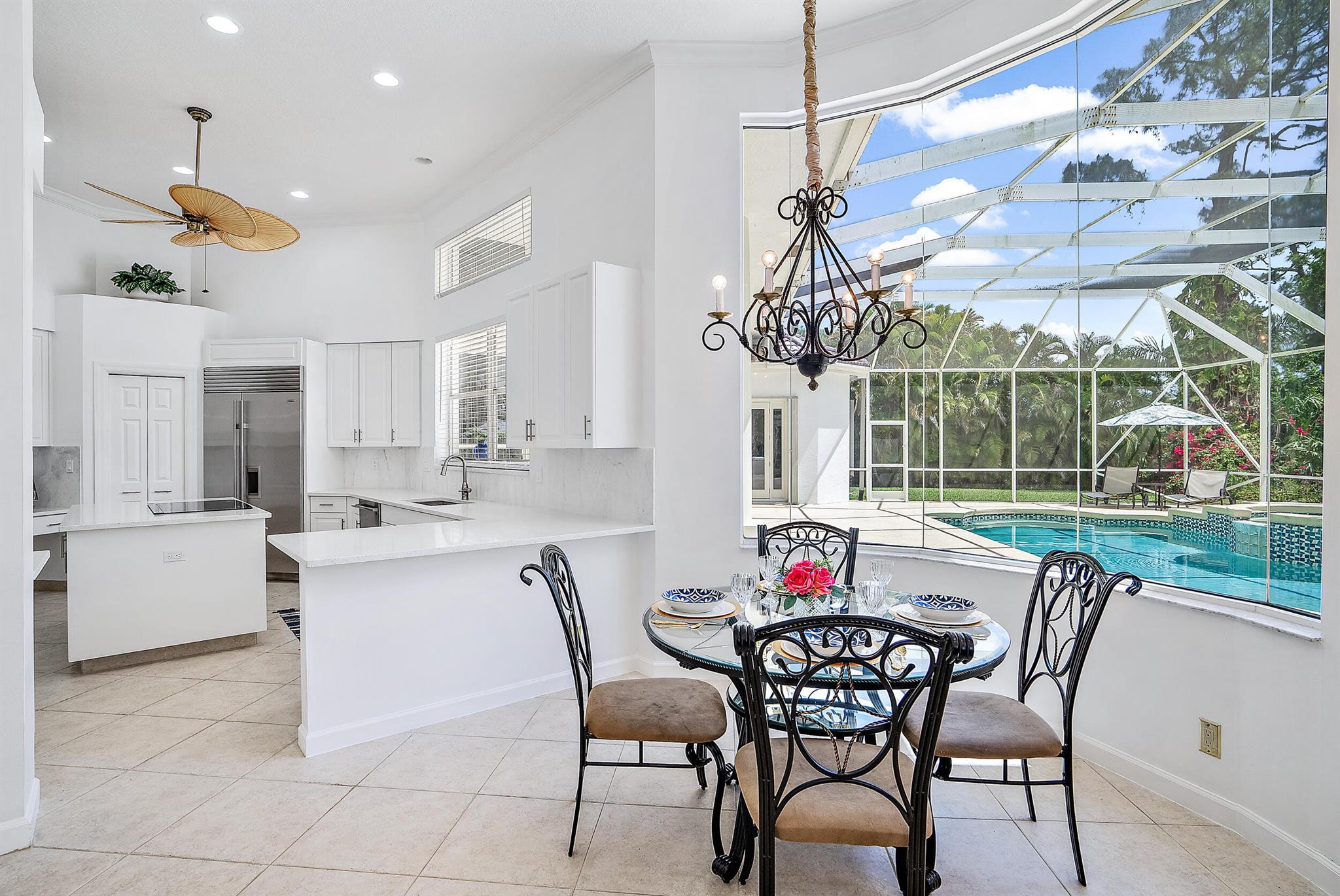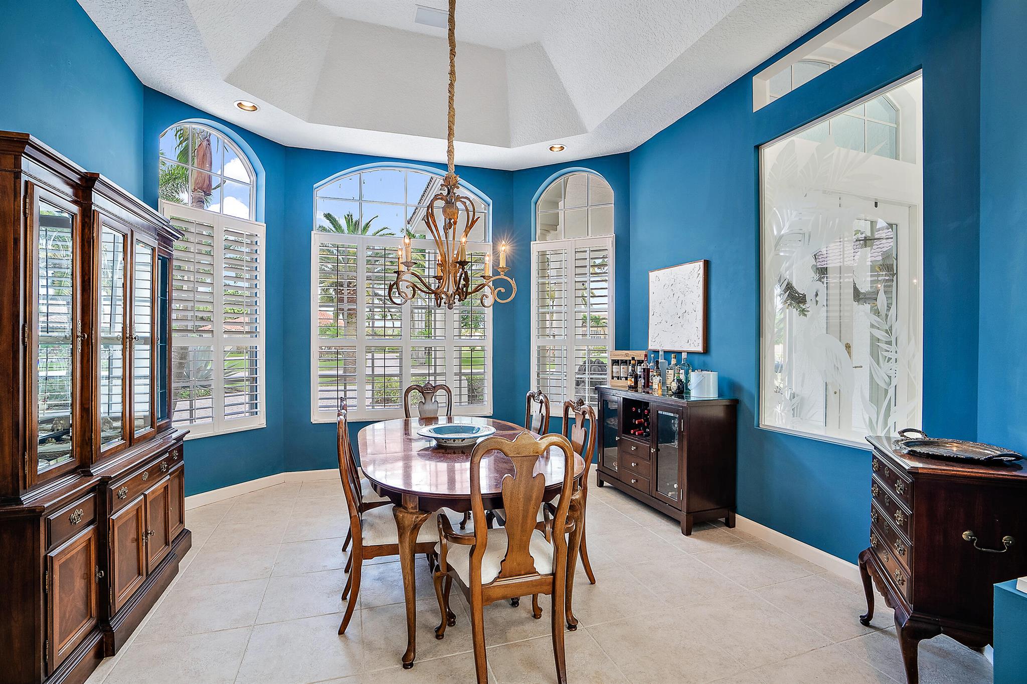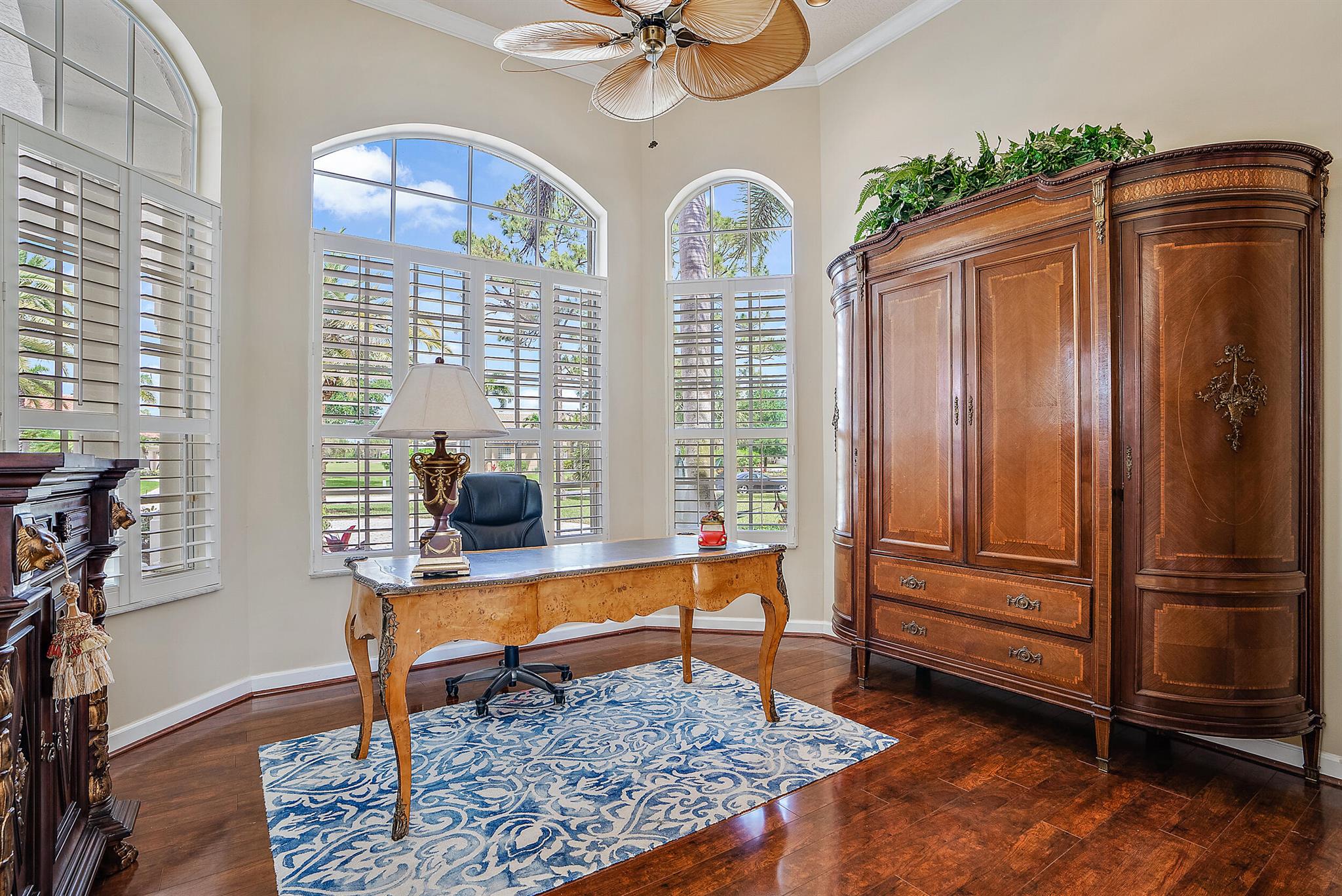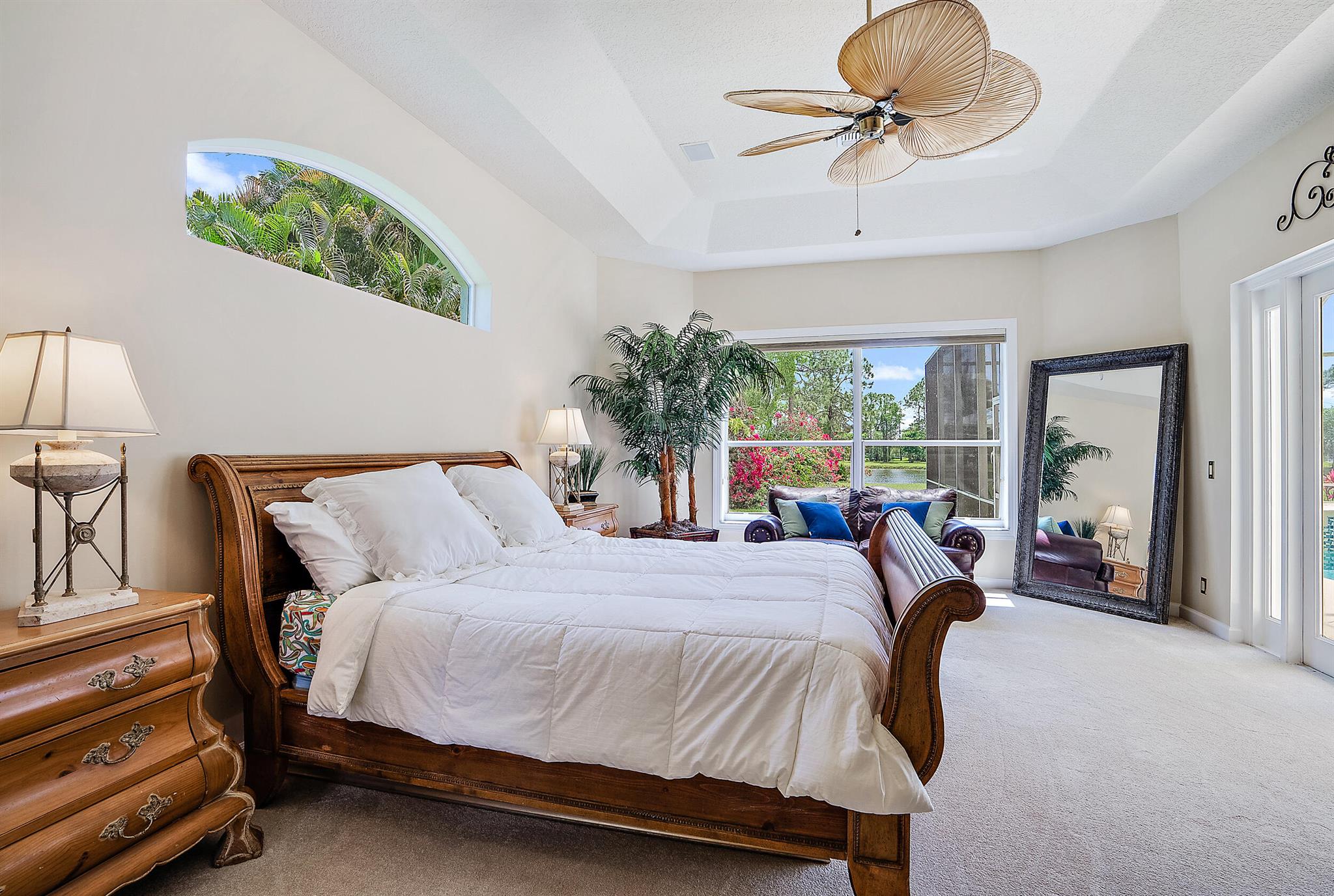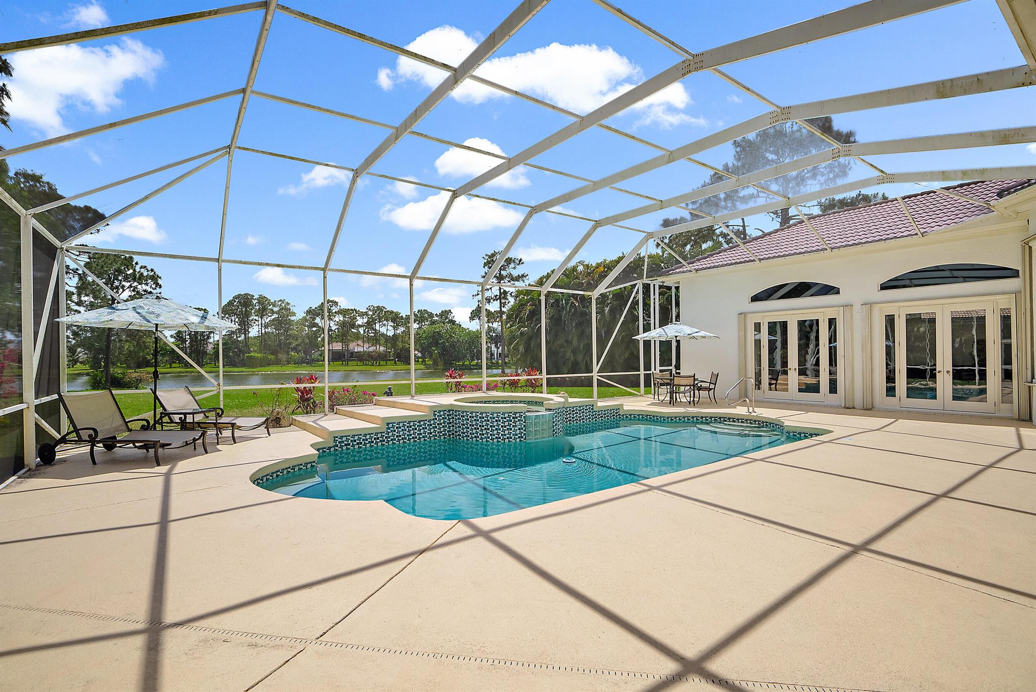 Welcome to your own 1.05 ACRE ESTATE located in the sought-after Bay Hill Estates neighborhood of Palm Beach Gardens. From the moment you approach the magnificent property, you'll be wowed by the dramatic circular driveway and regal Porte Cochere entry, flanked by lion statues. Perfect for entertaining and casual living, the open floor plan has expansive views of the lake from most of the windows in the home. Soaring 18-foot ceilings in the living room provide major architectural drama, while the outdoor pool and open patio draws one's eye outside to the tropically landscaped property. Enjoy immense privacy as you're secluded from neighbors. Three full bedrooms, including a spacious 15ft x 24ft Primary Bedroom, plus a convertible bedroom/den/office. Both secondary bedrooms are en suite.