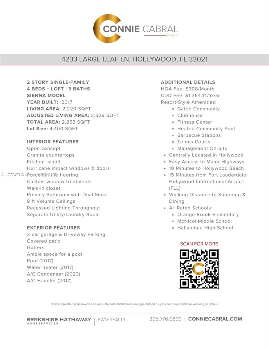 WELCOME TO PARKVIEW IN HOLLYWOOD, FLORIDA JUST MINUTES FROM THE BEACH! THE 2-STORY SINGLE-FAMILY HOME FEATURES 4 BEDROOMS, SPACIOUS LOFT, AND 3 FULL BATHROOMS. THE SIENNA MODEL OFFERS 2,220 SQFT OF THOUGHTFULLY PLANNED LIVING SPACE, HURRICANE IMPACT WINDOWS & DOORS. THE KITCHEN OFFERS AN OPEN CONCEPT, GRANITE COUNTERTOPS, A GENEROUS ISLAND PERFECT FOR ENTERTAINING AND AMPLE STORAGE. UNWIND OUTDOORS ON THE COVERED PATIO OR TAKE ADVANTAGE OF THE 2-CAR GARAGE. THE PRIVATE GATED COMMUNITY OFFERS RESORT-STYLE AMENITIES INCLUDING A CLUBHOUSE WITH A FITNESS CENTER AND A PARK WITH PLAYGROUND. MINUTES FROM THE EXPRESSWAY, AVENTURA MALL, HARDROCK CASINO AND THE INFAMOUS HOLLYWOOD BOARDWALK.