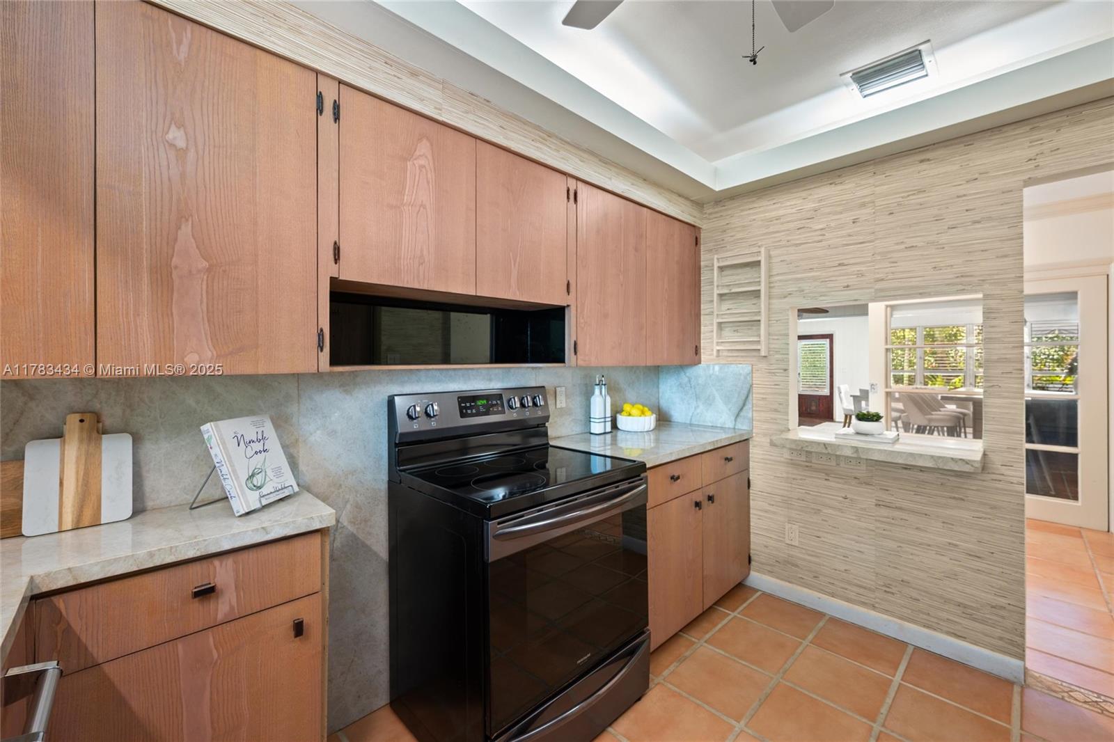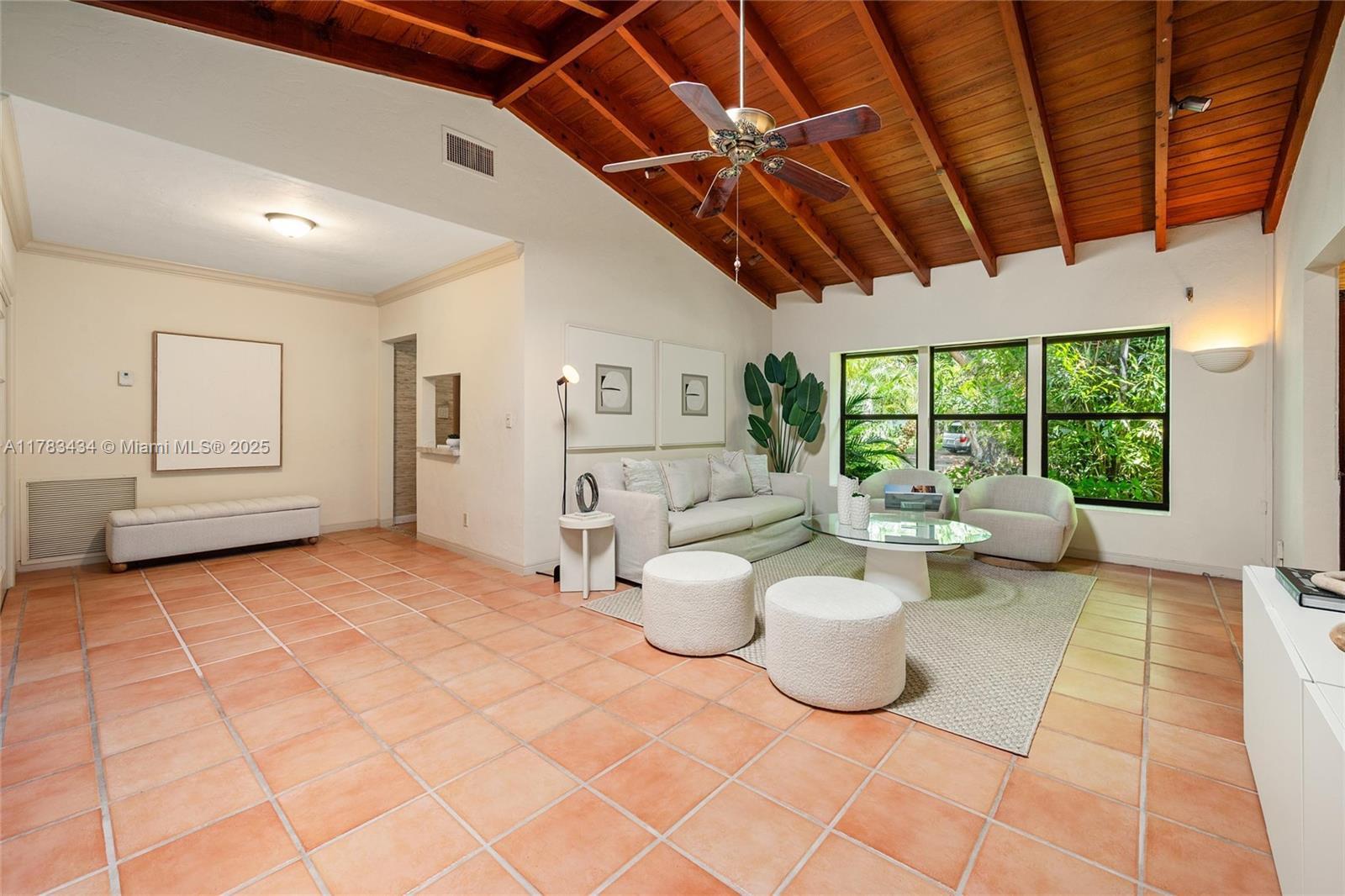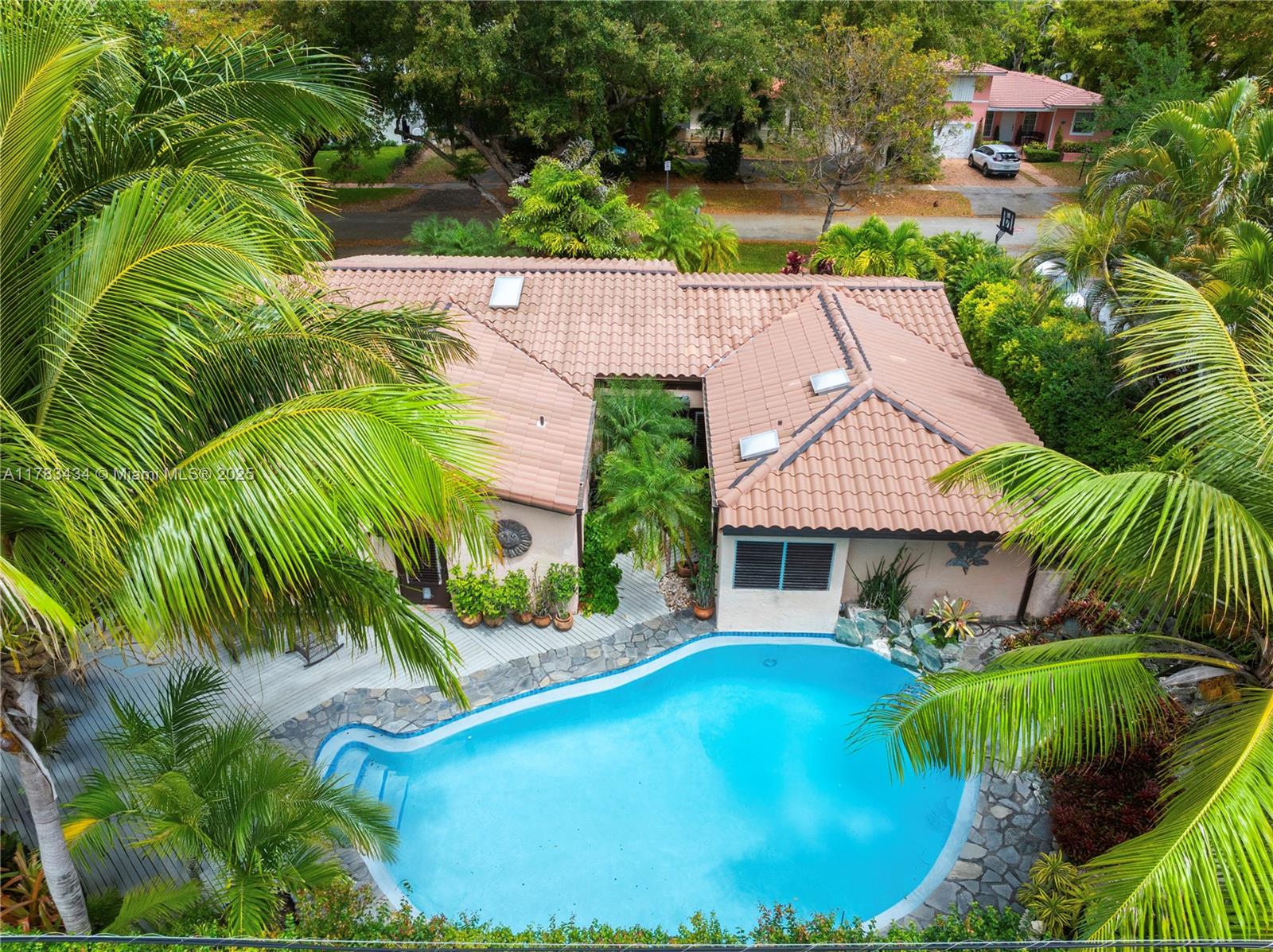 Tucked away on a lush lot in coveted Coral Gables, this meticulously maintained tropical oasis brims w/warmth, character & potential. Its premier location 1 blk from UM places this classic mid-century home in the heart of walkable Coral Gables. Tidy interiors feature: vaulted ceilings, crown molding; built-ins; tile floors; skylights & impact windows. Graciously scaled living rm. Family rm invites nature indoors. Updated kitchen w/Viking appliances & pass-thru to dining area. Primary suite boasts spa-style shower, 2 walk-ins & patio access; 2nd bdrm w/patio access + flexible extra space for 3rd bdrm or office w/ full bath. Beautiful resort-style backyard anchored by waterfall pool, deck & mature palms. Enchanting & timeless, this lovely little paradise is a hidden gem.