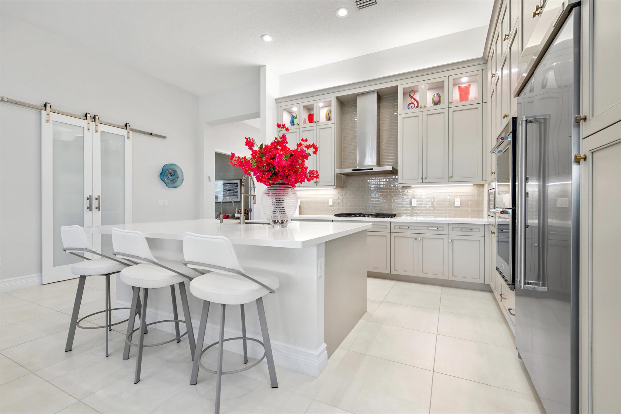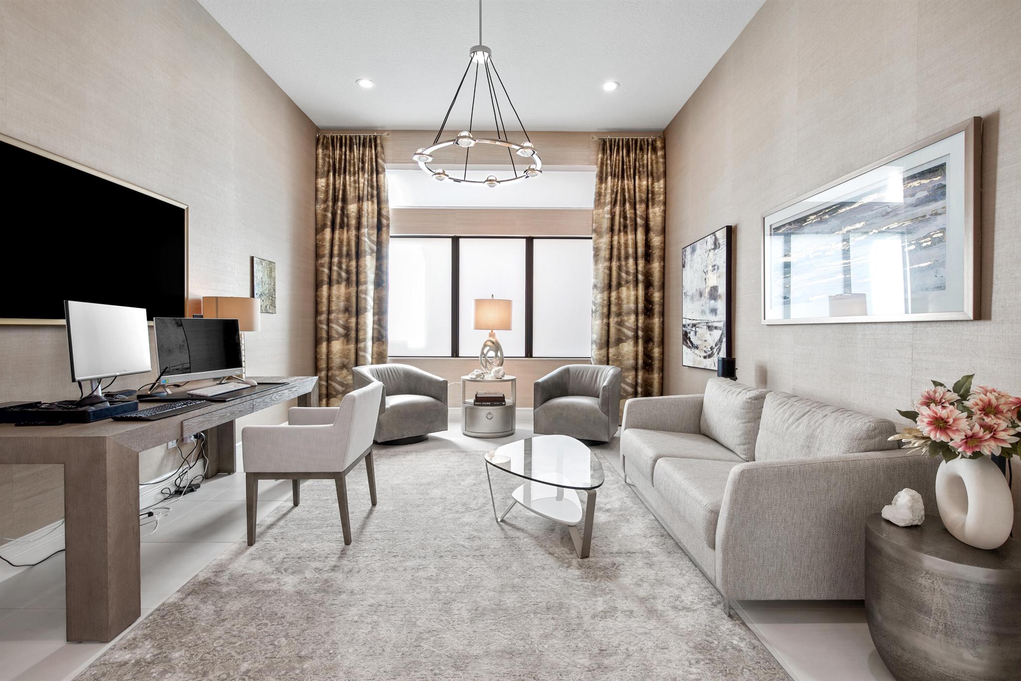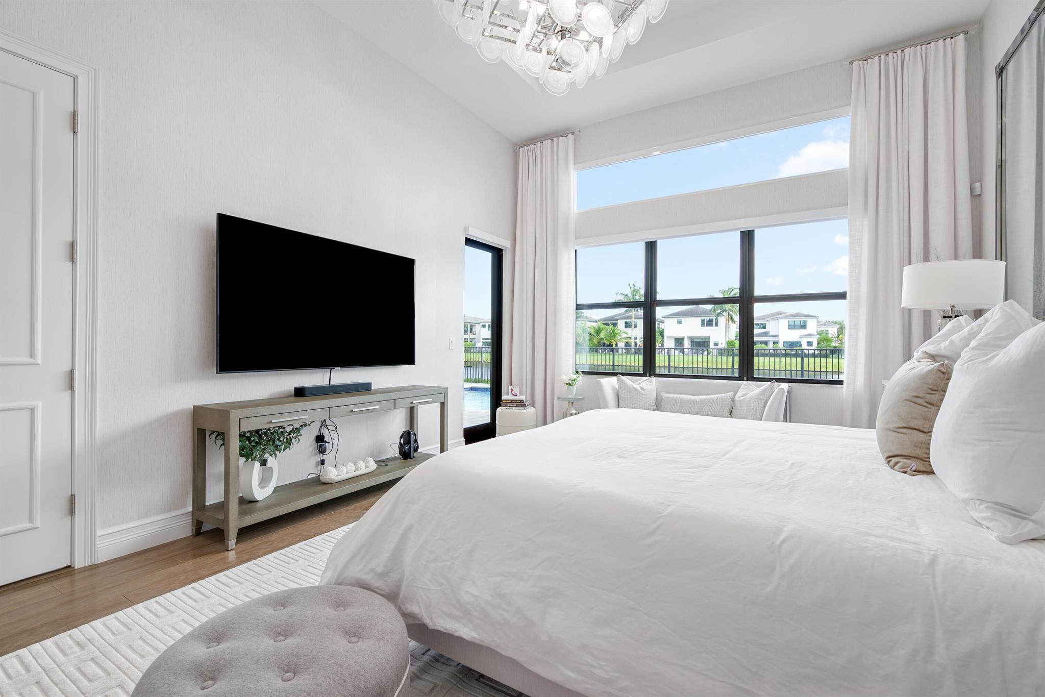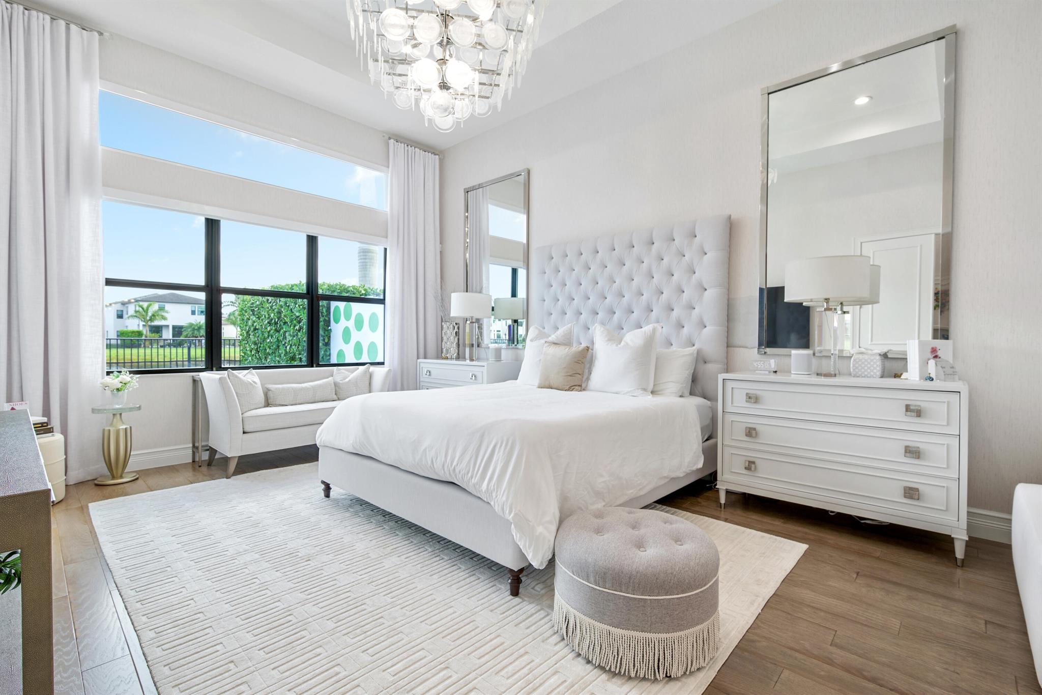 Welcome to 9046 Chauvet Way, an exquisite lakefront residence in the prestigious Boca Bridges community. A sophisticated example of contemporary luxury, this rarely available Adriana model features 5 bedrooms, 4 and a half bathrooms, den/office, chef's kitchen and loft. An expanded circular driveway sets the stage for the elegance within. Step thru the grand two-story entrance into a light-filled, airy foyer that immediately impresses. A decadent den/office offers the perfect blend of comfort and functionality for work or relaxation. The chef's kitchen is a culinary dream, outfitted with premium KitchenAid appliances, an expansive island, custom cabinetry with recessed lighting, and a walk-in pantry with stylish barn doors.