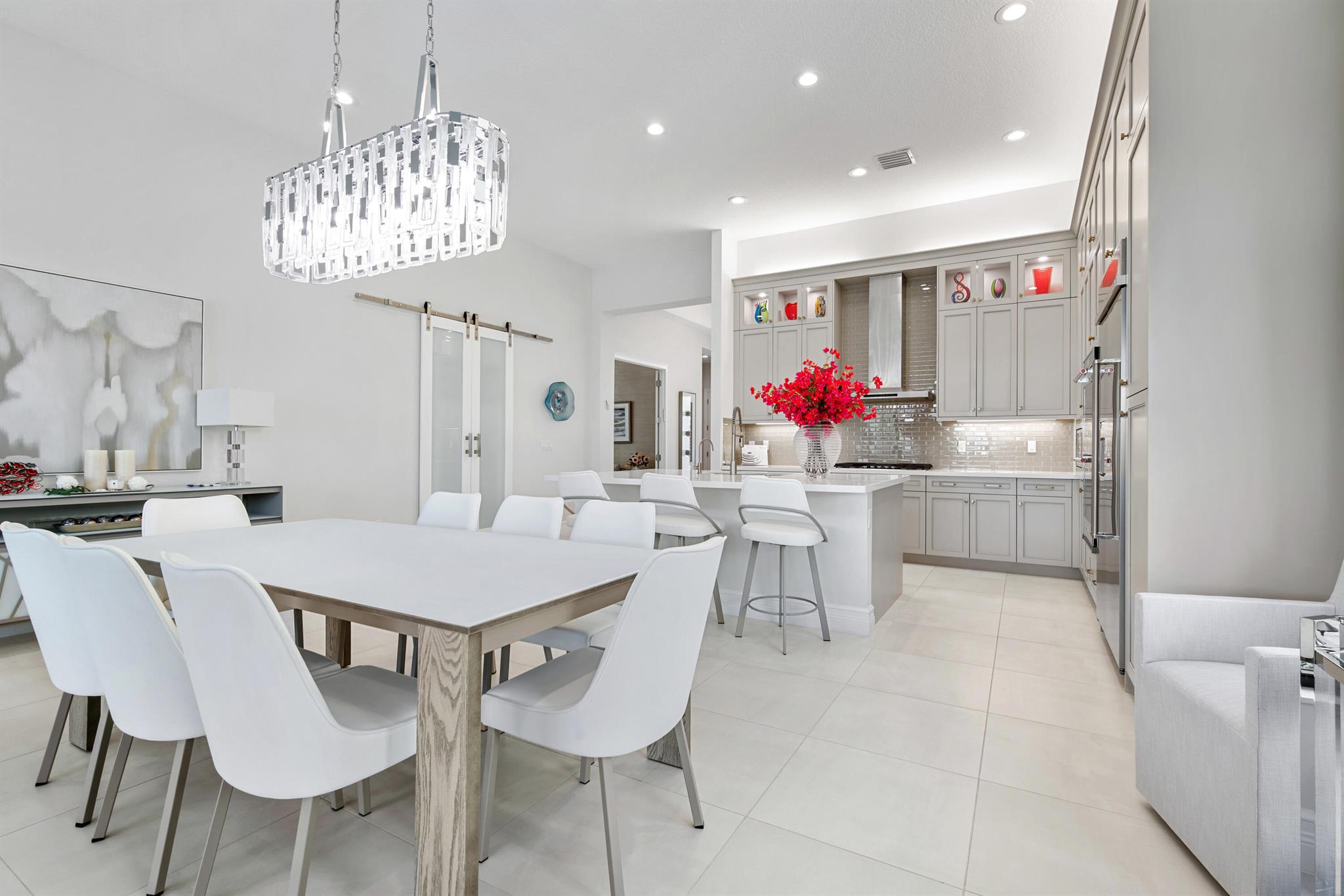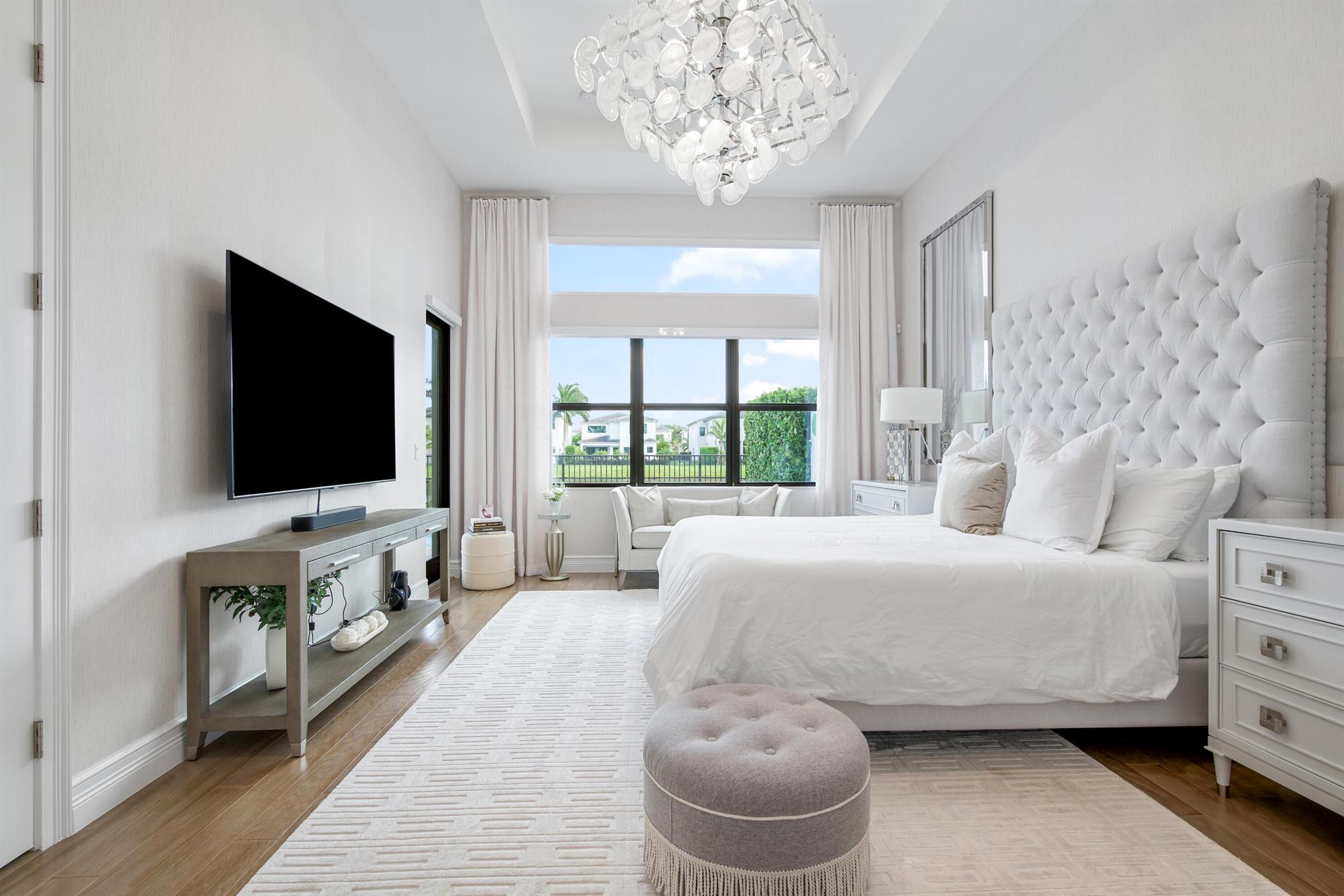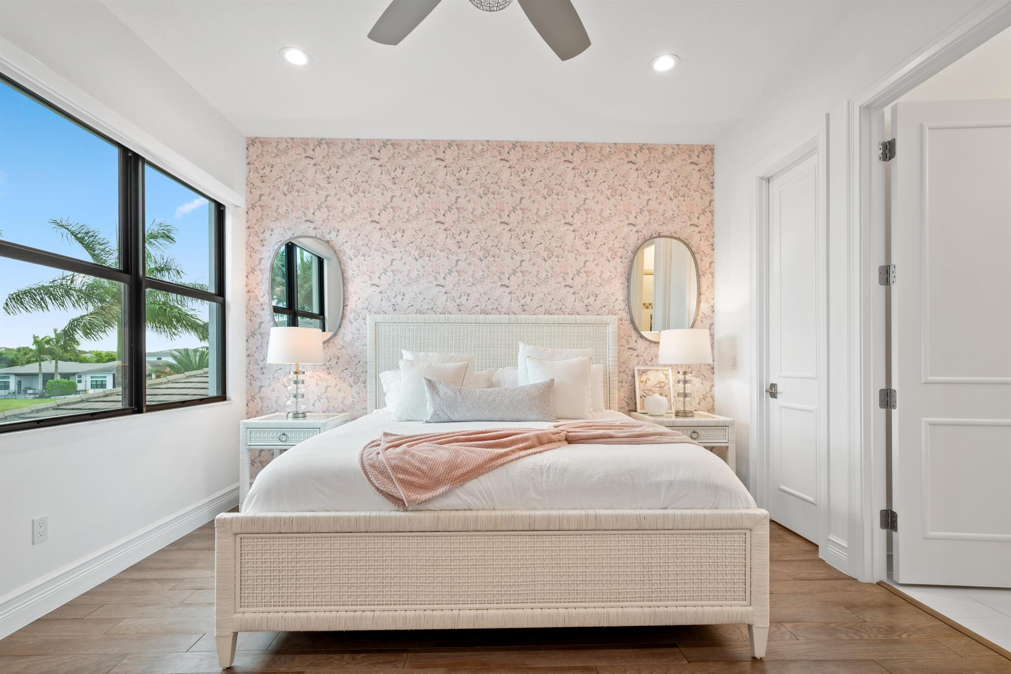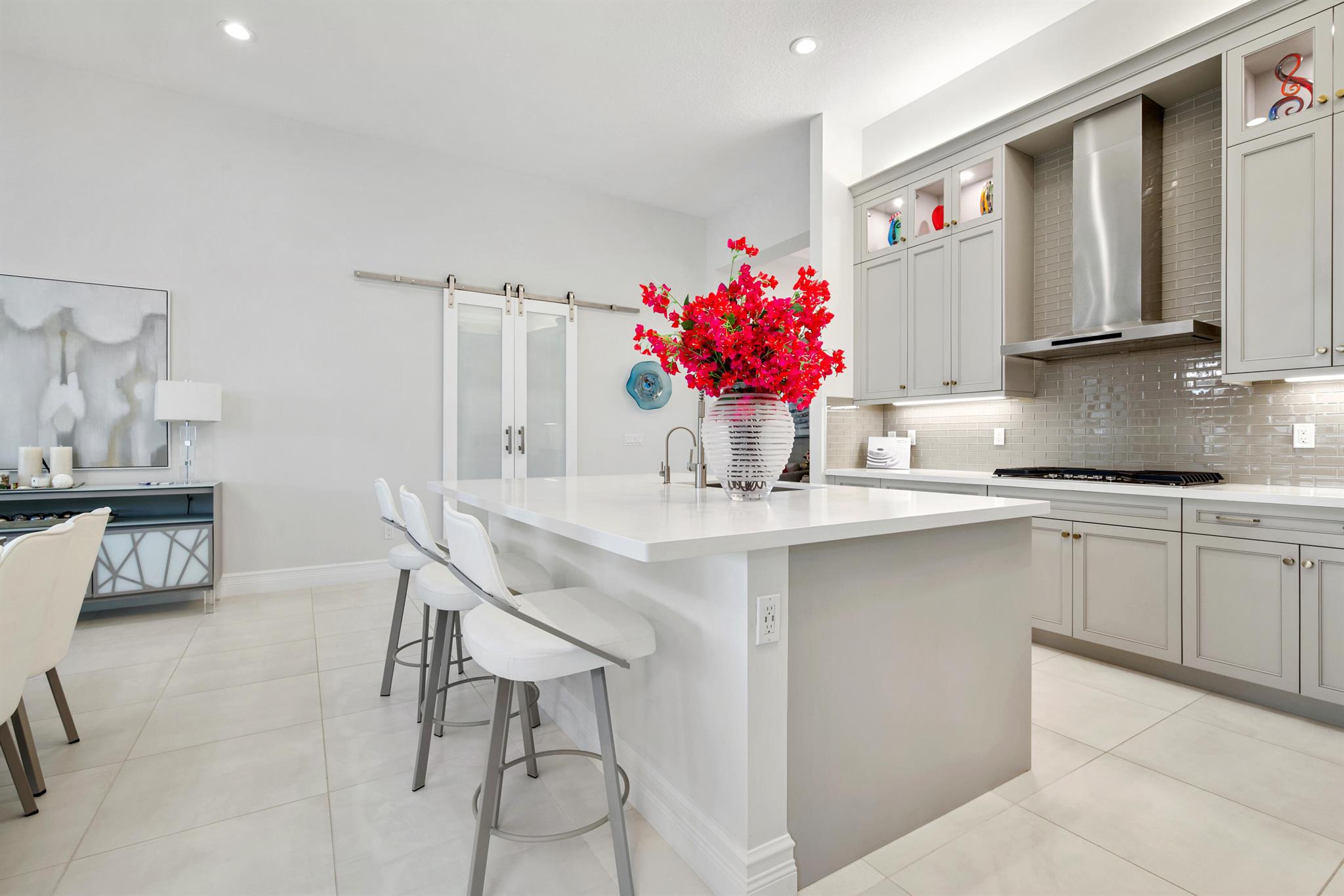 Welcome to 9046 Chauvet Way, an exquisite lakefront residence in the prestigious Boca Bridges community. A sophisticated example of contemporary luxury, this rarely available Adriana model features 5 bedrooms, 4 and a half bathrooms, den/office, chef's kitchen and loft. An expanded circular driveway sets the stage for the elegance within. Step thru the grand two-story entrance into a light-filled, airy foyer that immediately impresses. A decadent den/office offers the perfect blend of comfort and functionality for work or relaxation. The chef's kitchen is a culinary dream, outfitted with premium KitchenAid appliances, an expansive island, custom cabinetry with recessed lighting, and a walk-in pantry with stylish barn doors.