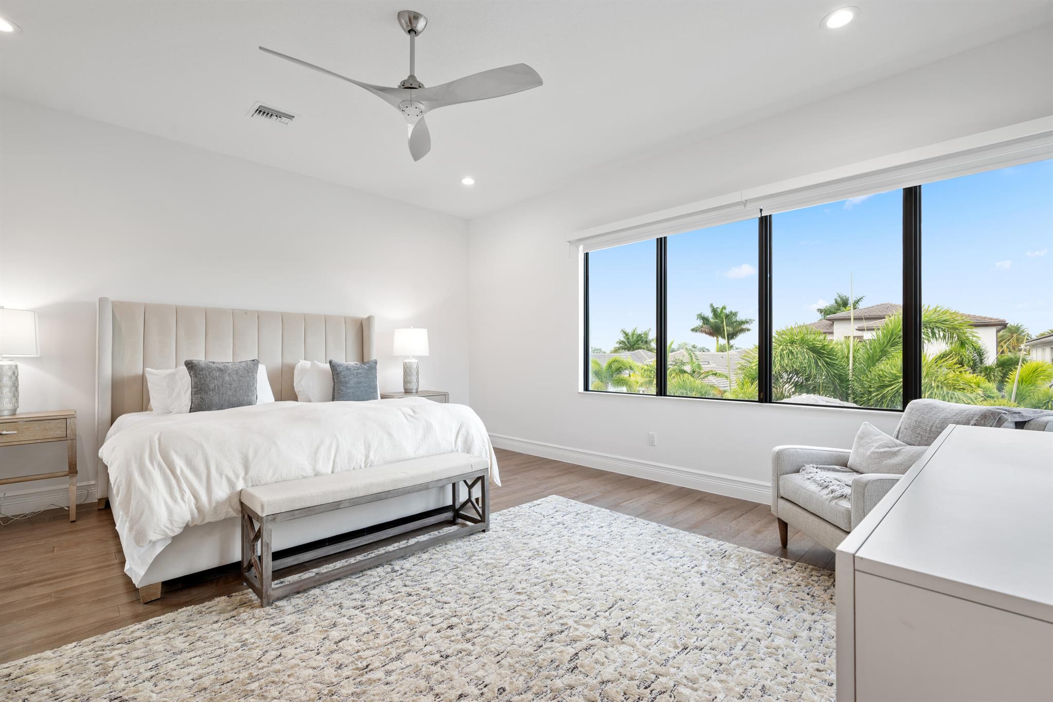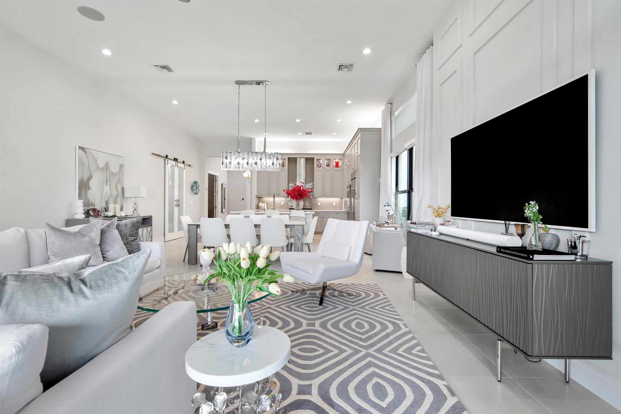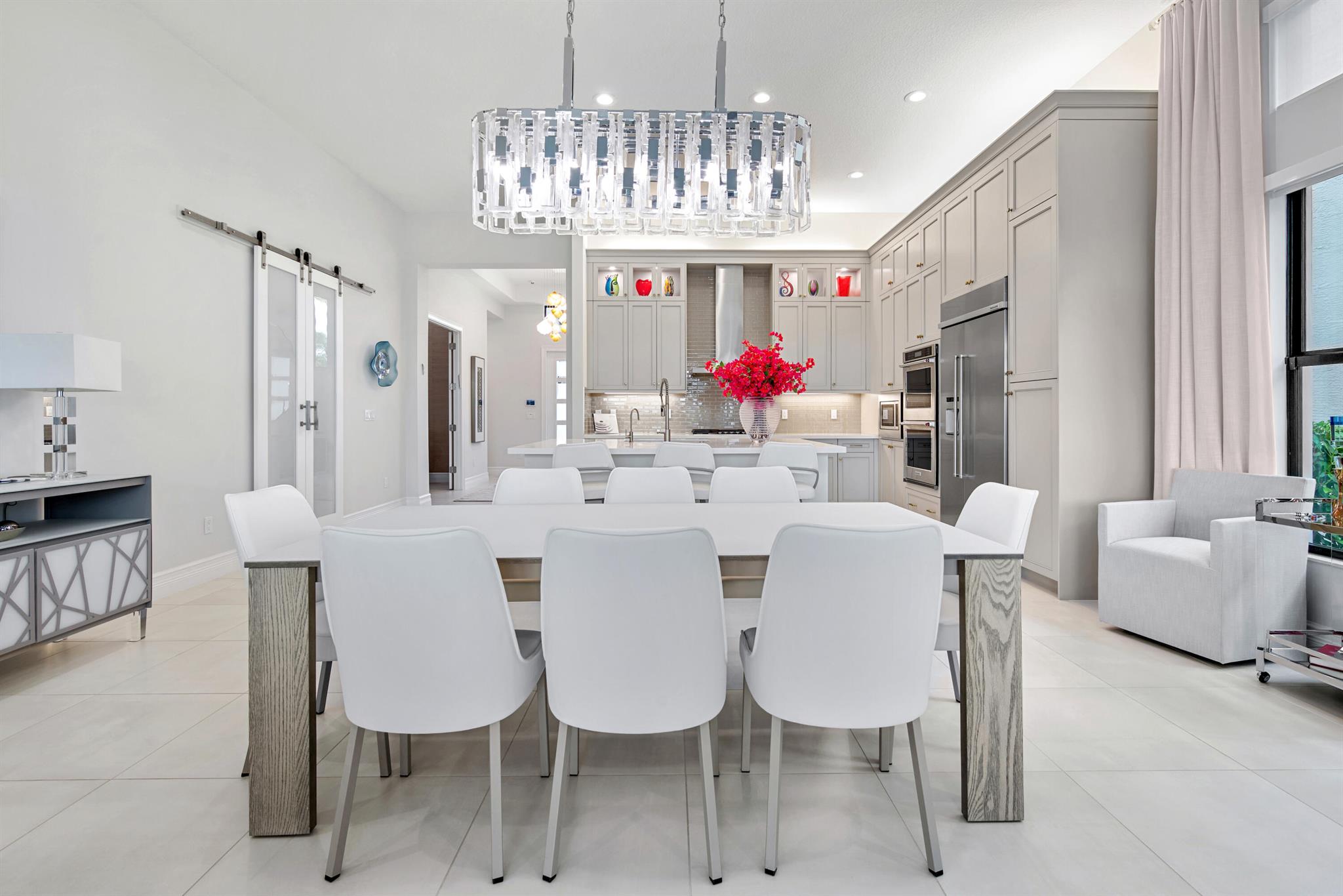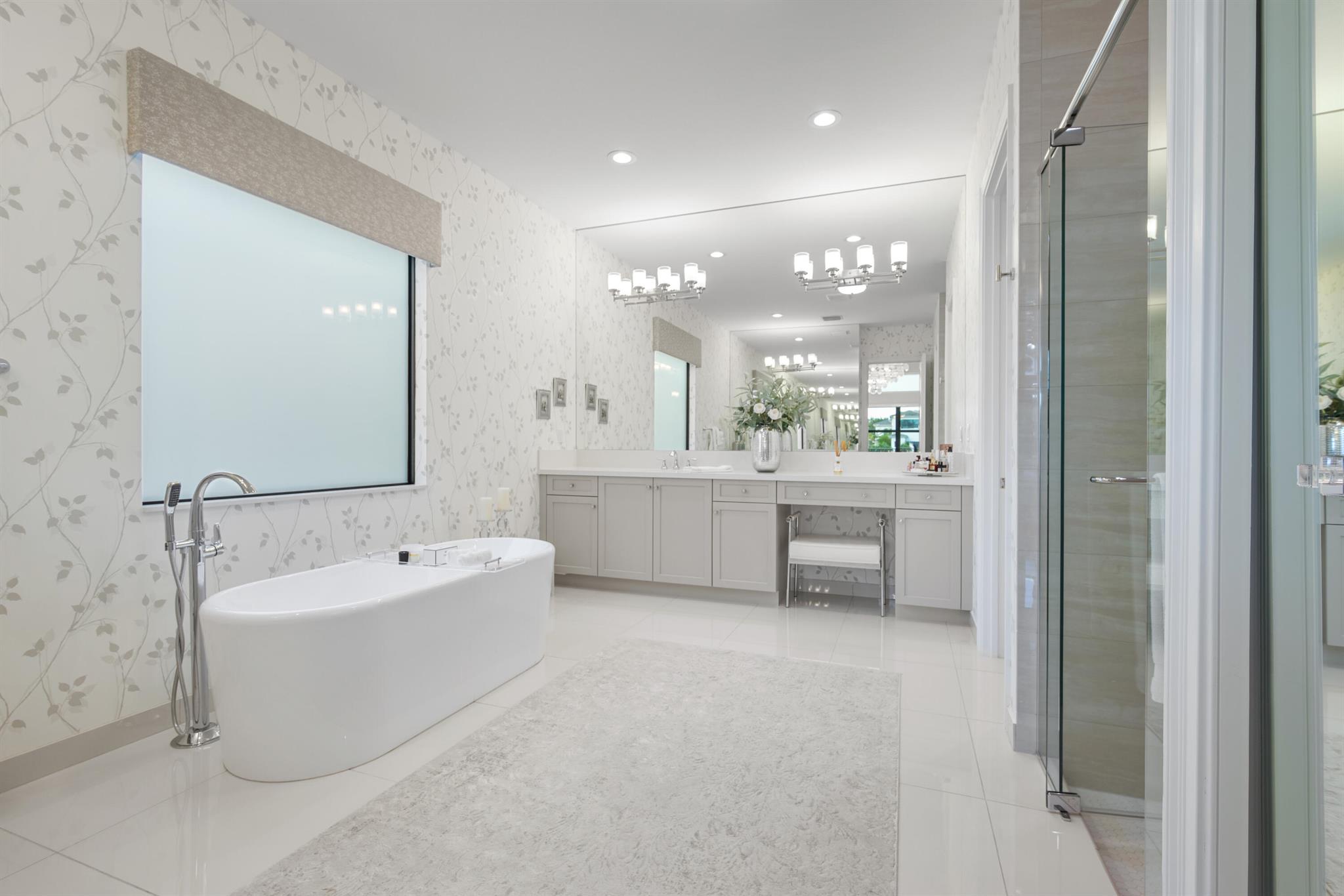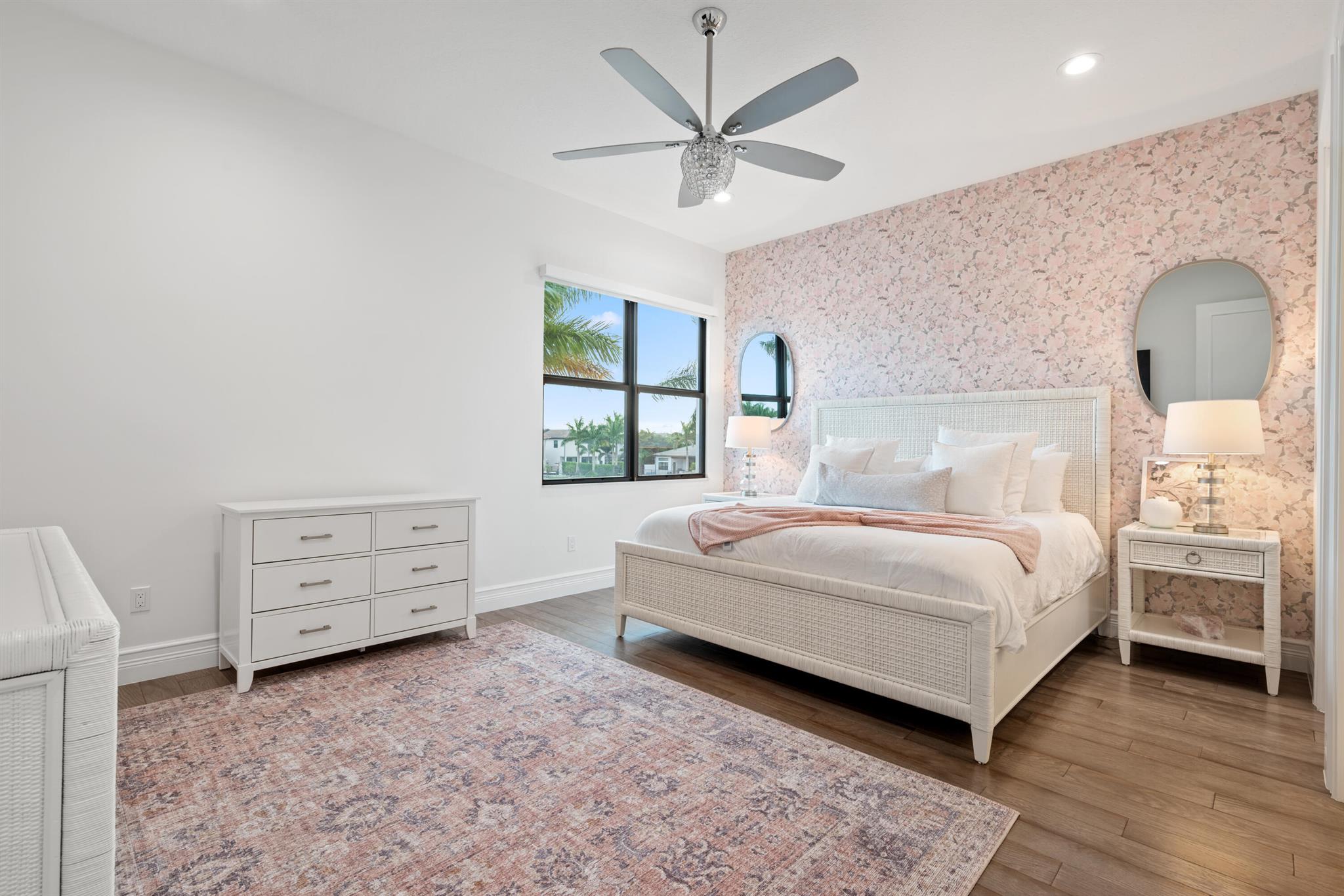 Welcome to 9046 Chauvet Way, an exquisite lakefront residence in the prestigious Boca Bridges community. A sophisticated example of contemporary luxury, this rarely available Adriana model features 5 bedrooms, 4 and a half bathrooms, den/office, chef's kitchen and loft. An expanded circular driveway sets the stage for the elegance within. Step thru the grand two-story entrance into a light-filled, airy foyer that immediately impresses. A decadent den/office offers the perfect blend of comfort and functionality for work or relaxation. The chef's kitchen is a culinary dream, outfitted with premium KitchenAid appliances, an expansive island, custom cabinetry with recessed lighting, and a walk-in pantry with stylish barn doors.