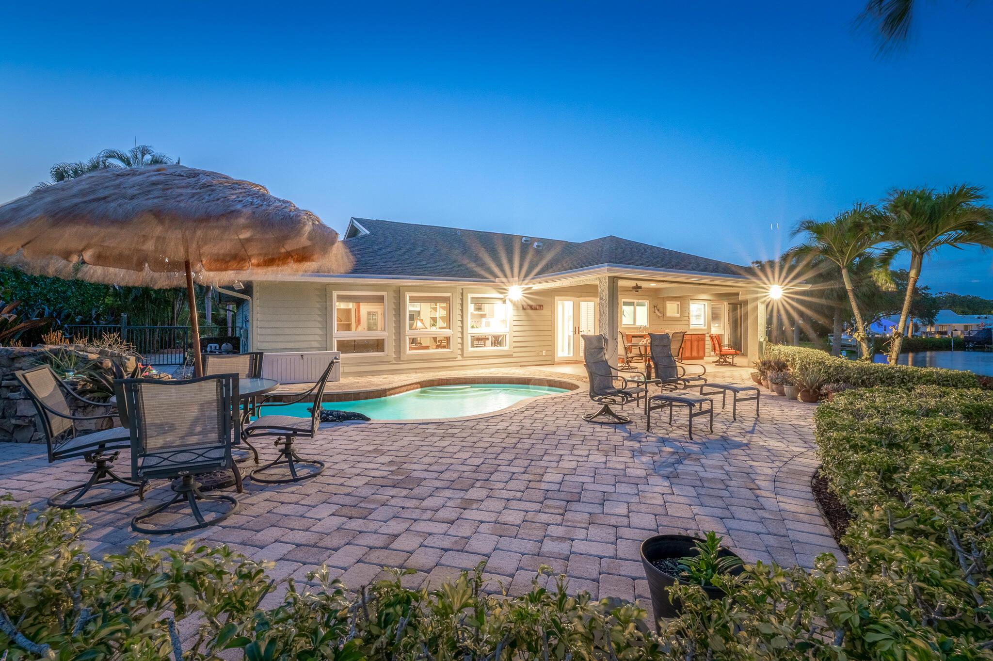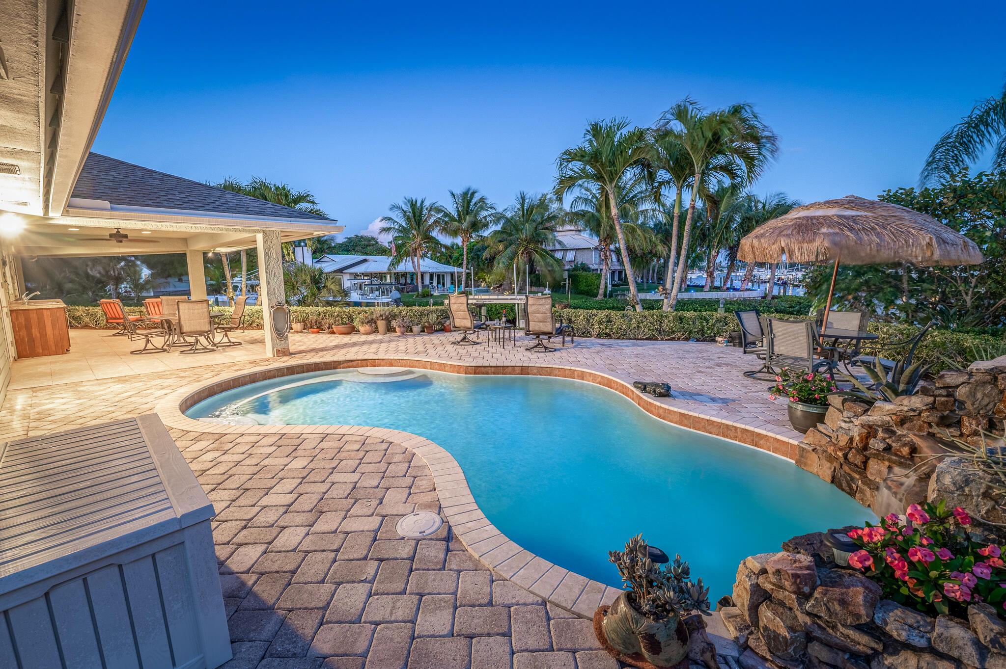 Fully Furnished & Turnkey, Beautiful Waterfront Pool Home, hardwood floors, lush landscaping. Very gently lived in by since 2006 w/approximately 147' water frontage on over .5-acre lot with views of Manatee Pocket. 40' dock w/a Hi-Tide 12,000 lb lift with TEC Remote Control & 4 new pilings added in 2014. Brazilian Ipe' wood Dock equipped w/water, electricity, oversized mounted dock box, attached cleaning table. Easy, quick access to Manatee Pocket, no bridges to St Lucie Inlet. Have lunch by boat at a waterfront restaurant in the Pocket, then head to the Sandbar for all day fun in the sun, only 10-15 minutes by boat. Covered Paver Patio, Summer Kitchen, heated saltwater pool w/natural rock waterfall on the waterfront & Impact Glass windows. Clubhouse, Marina, Pickleball, 2 Pools