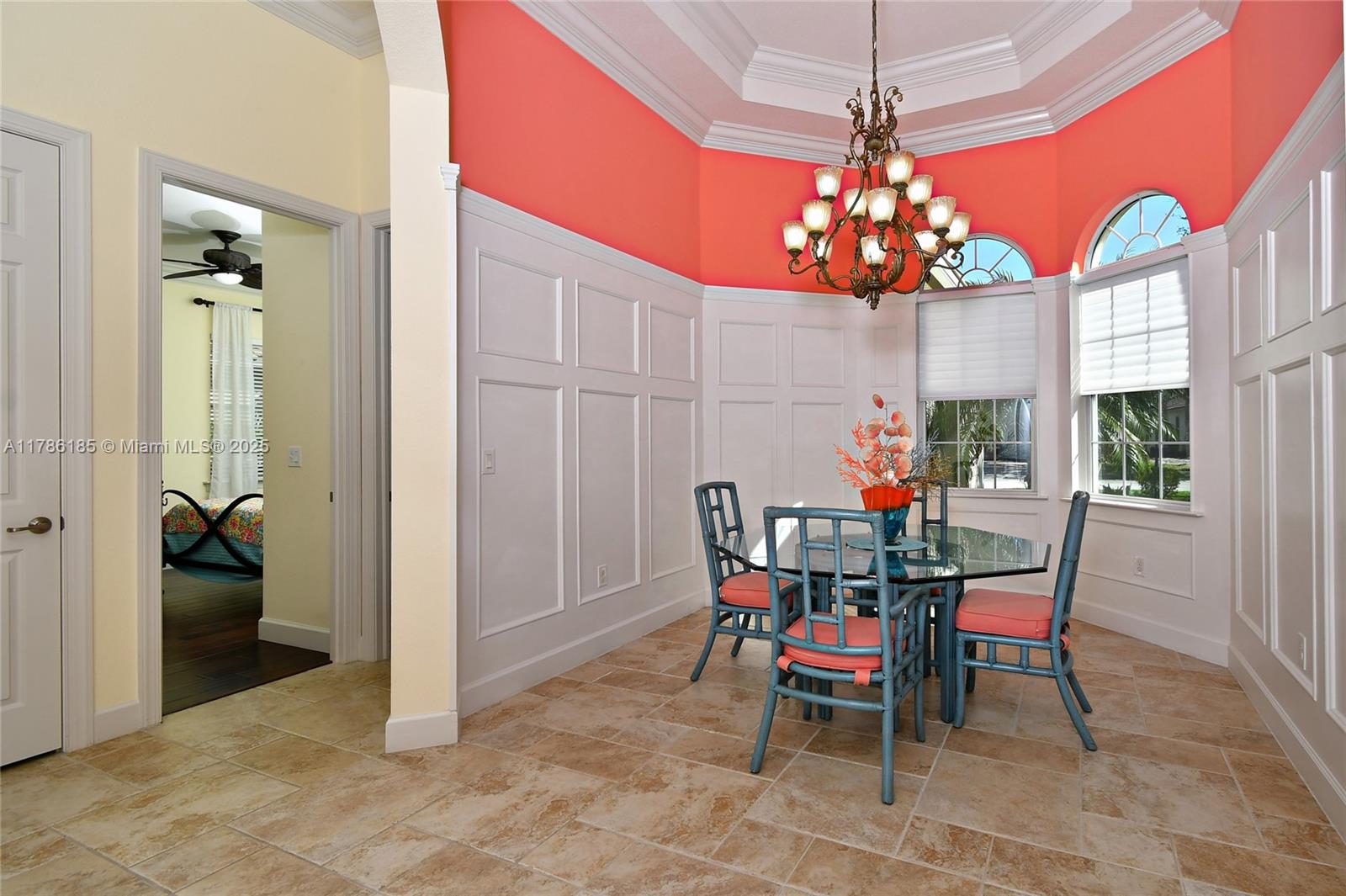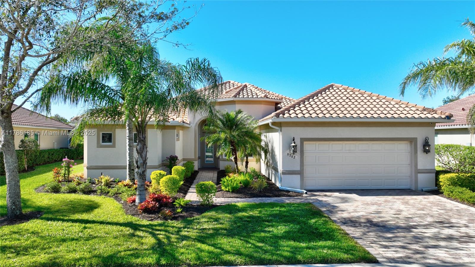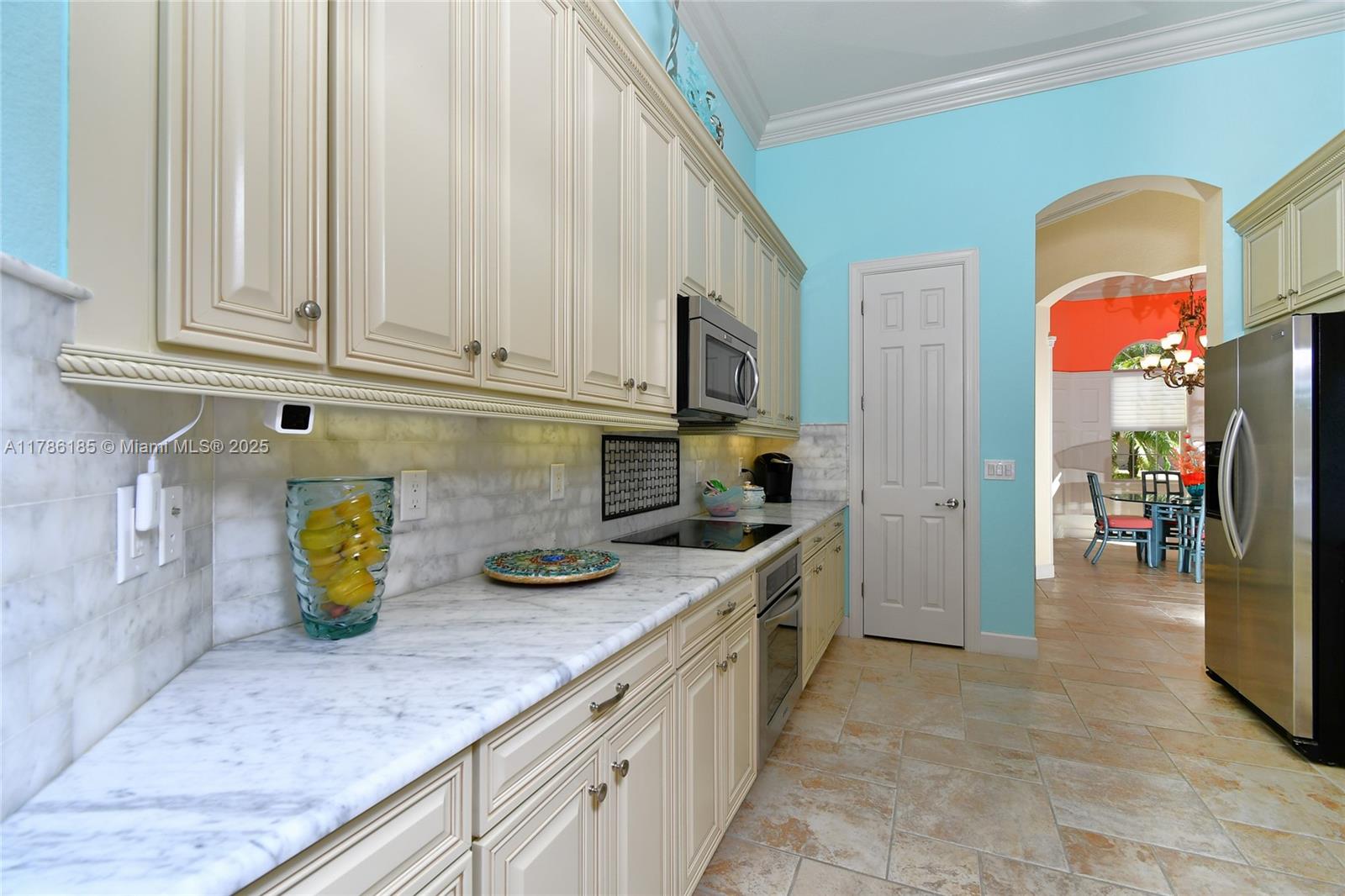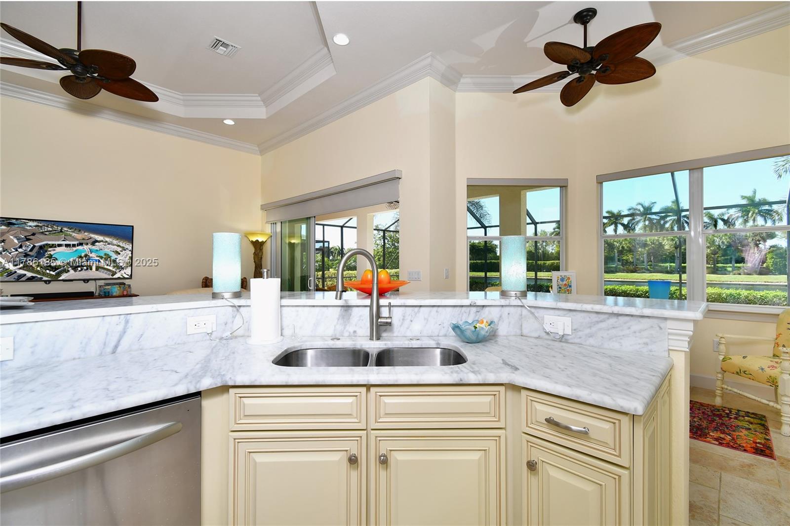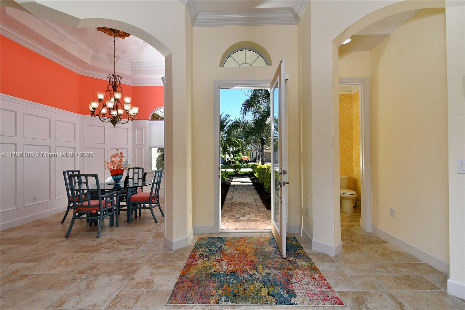 Upgrades galore! Kitchenaid appliances. Carrea marble countertops, hurricane impact windows throughout, custom cabinetry and a walk-in pantry. The great room is spacious thanks to the removal of the interior partition. Enjoy dinner on the oversized covered lanai by your solar heated saltwater pool and watch the sunset across the lake. The dramatic master suite opens to the lanai. The stunning wainscot dining room overlooks the newly landscaped garden. Upscale features include 12 ft. ceilings, tray ceilings, large crown molding, solid wood cabinetry, custom closet cabinetry in every closet, granite and wood floors with upgraded tiles, epoxy garage floor & extended garage. This is your dream home!