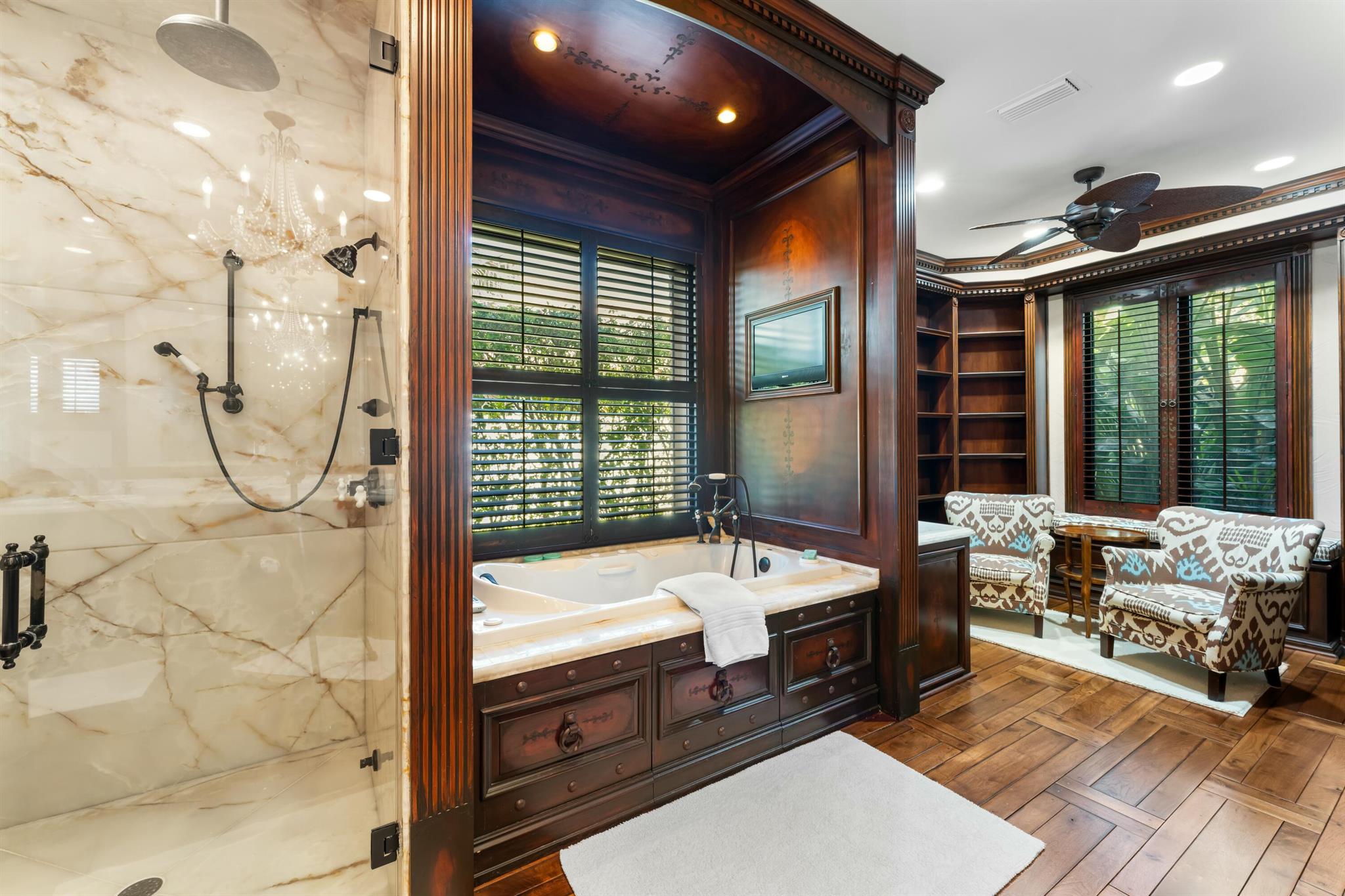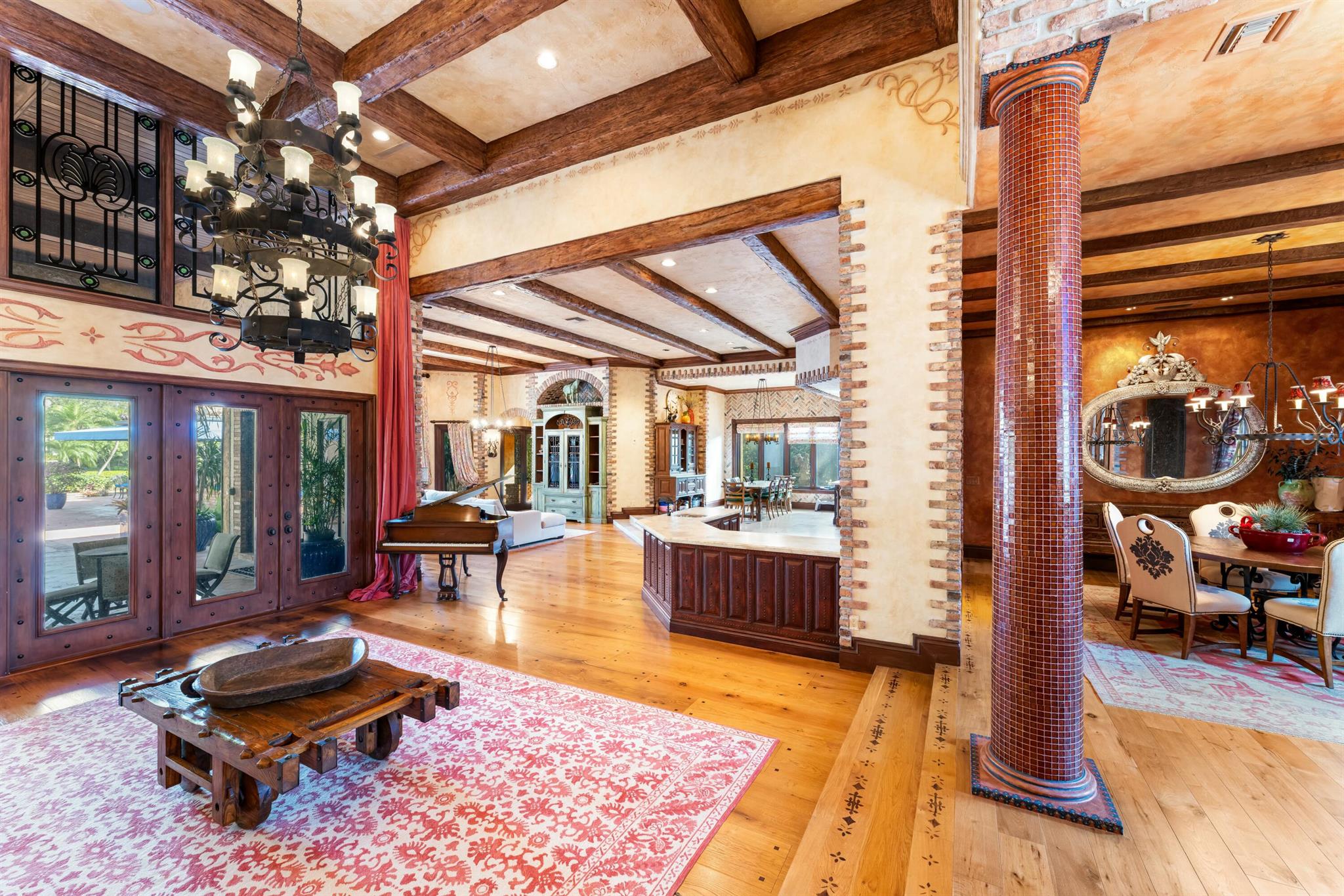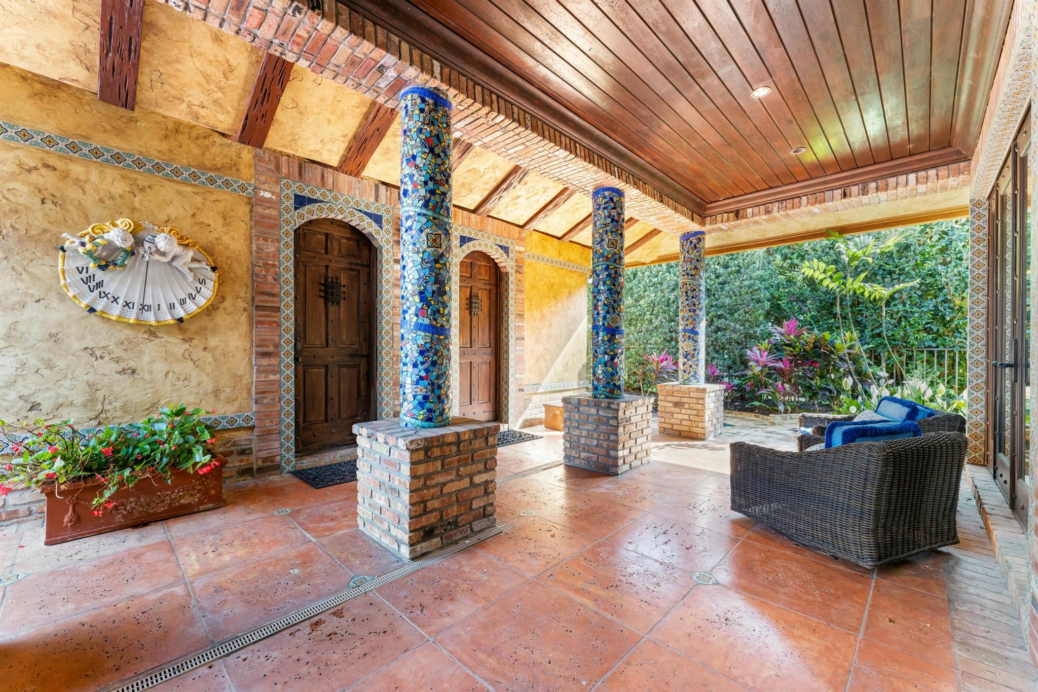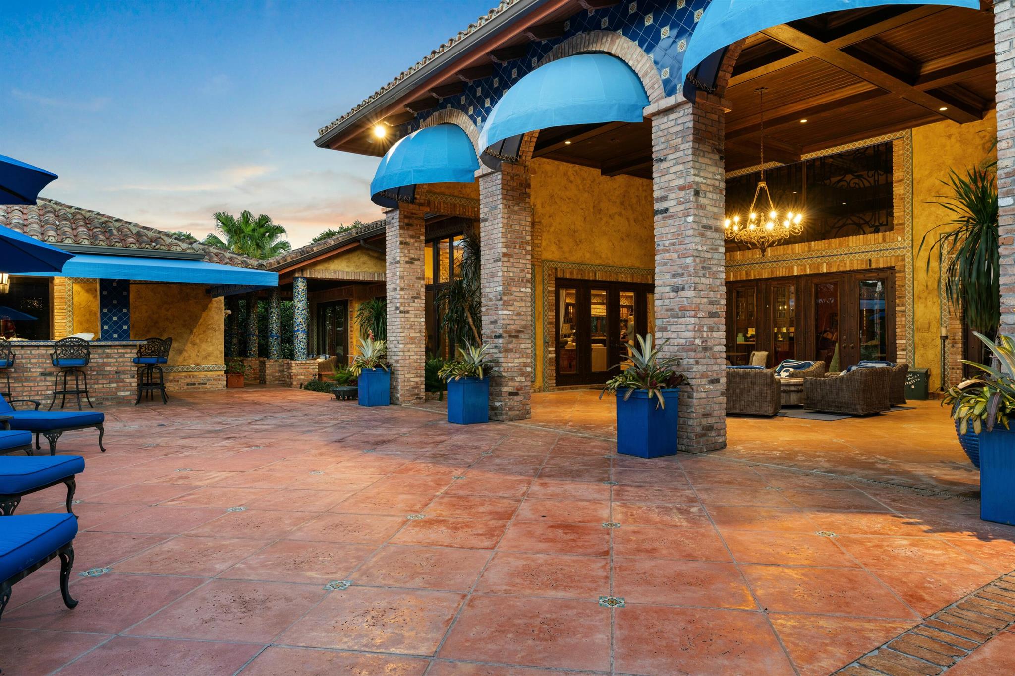 Located in the prestigious Frenchman's Creek Golf Club, this exceptional Old Spanish-style estate combines timeless elegance with modern comfort. Situated on a 30,000 sq ft lot with 107 feet of navigable waterfront and a private boat lift, this is a rare opportunity for boaters and luxury seekers alike.This single-story residence offers 7,840 total square feet, with 5,539 sq ft under air. The home features 5 bedrooms, 5 full bathrooms, and a powder room. One of the bedrooms is a detached guest house with stunning views of the water--ideal for guests seeking privacy and tranquility. The primary suite includes two private offices, creating a versatile space for work or relaxation.The interior boasts authentic Old Spanish character with expansive ceilings with pecky cypress beams.