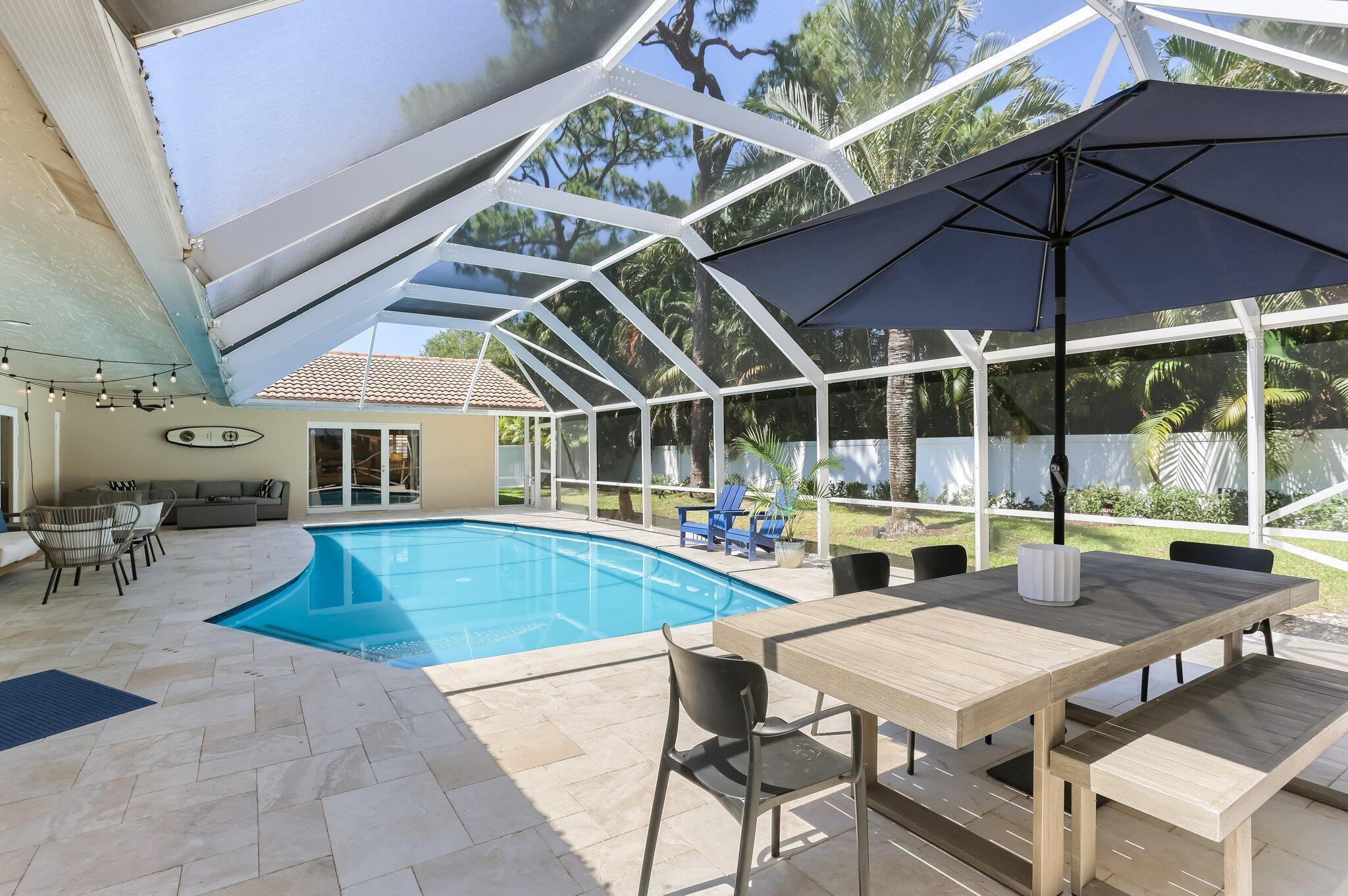 Located in the highly sought-after gated community of Estancia, this charming and meticulously maintained 4-bedroom, 2.5-bathroom home with a 2-car garage offers comfort, privacy, and a prime central Boca Raton location. Positioned on a quiet interior lot, the property offers added seclusion. Step inside to a freshly painted interior with new luxury vinyl flooring, refinished marble floors, LED lighting, plantation shutters, and built-in closets throughout. The expansive primary suite features a walk-in closet, additional closet space, dual vanity sinks, and a glass-enclosed shower. Enjoy outdoor living with a screen-enclosed marble patio, heated refinished pool w/ safety gate, and fenced yard. Impact windows and impact french doors, roof 2014, A/Cs 2020 & 2021, and hot water heaters 202