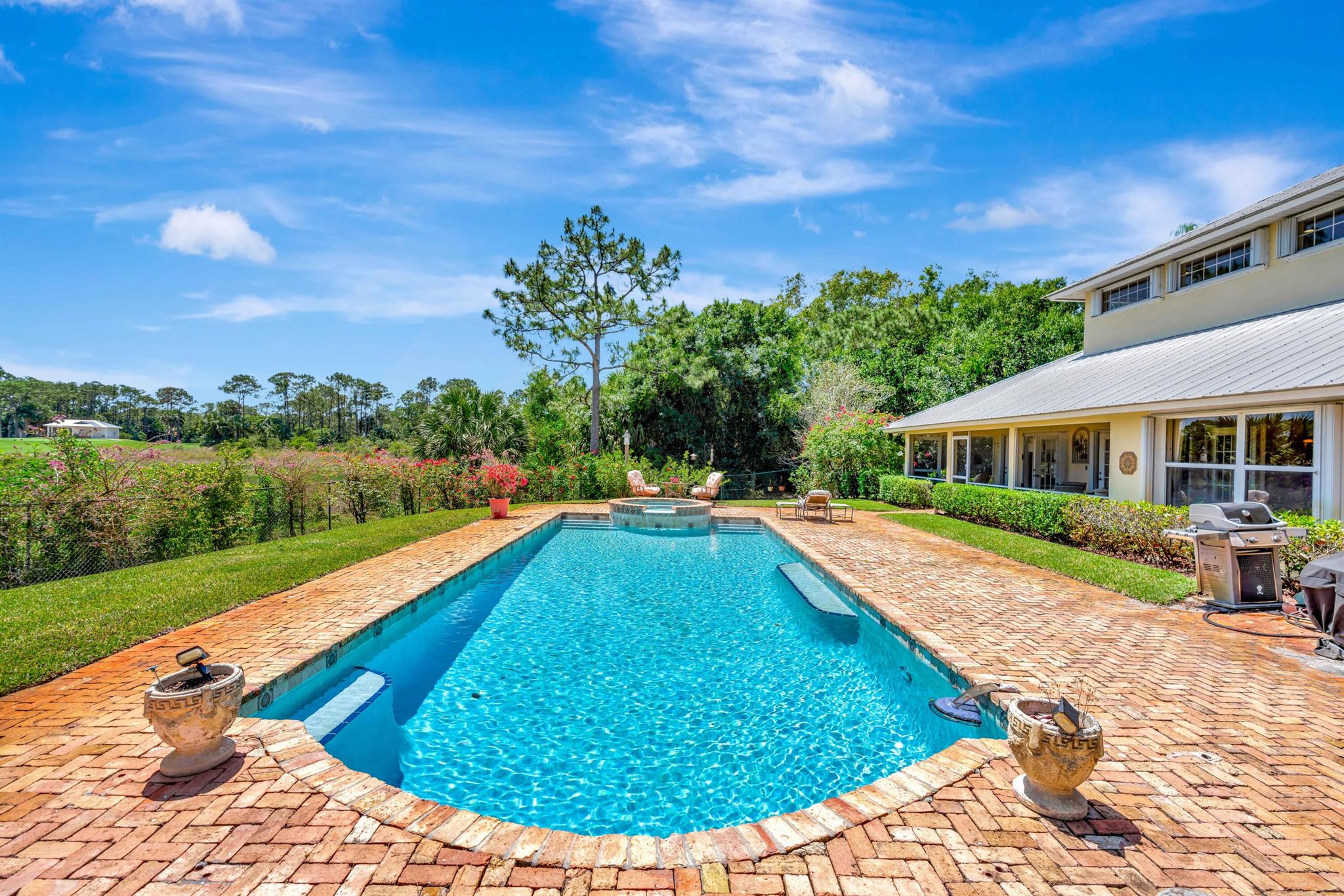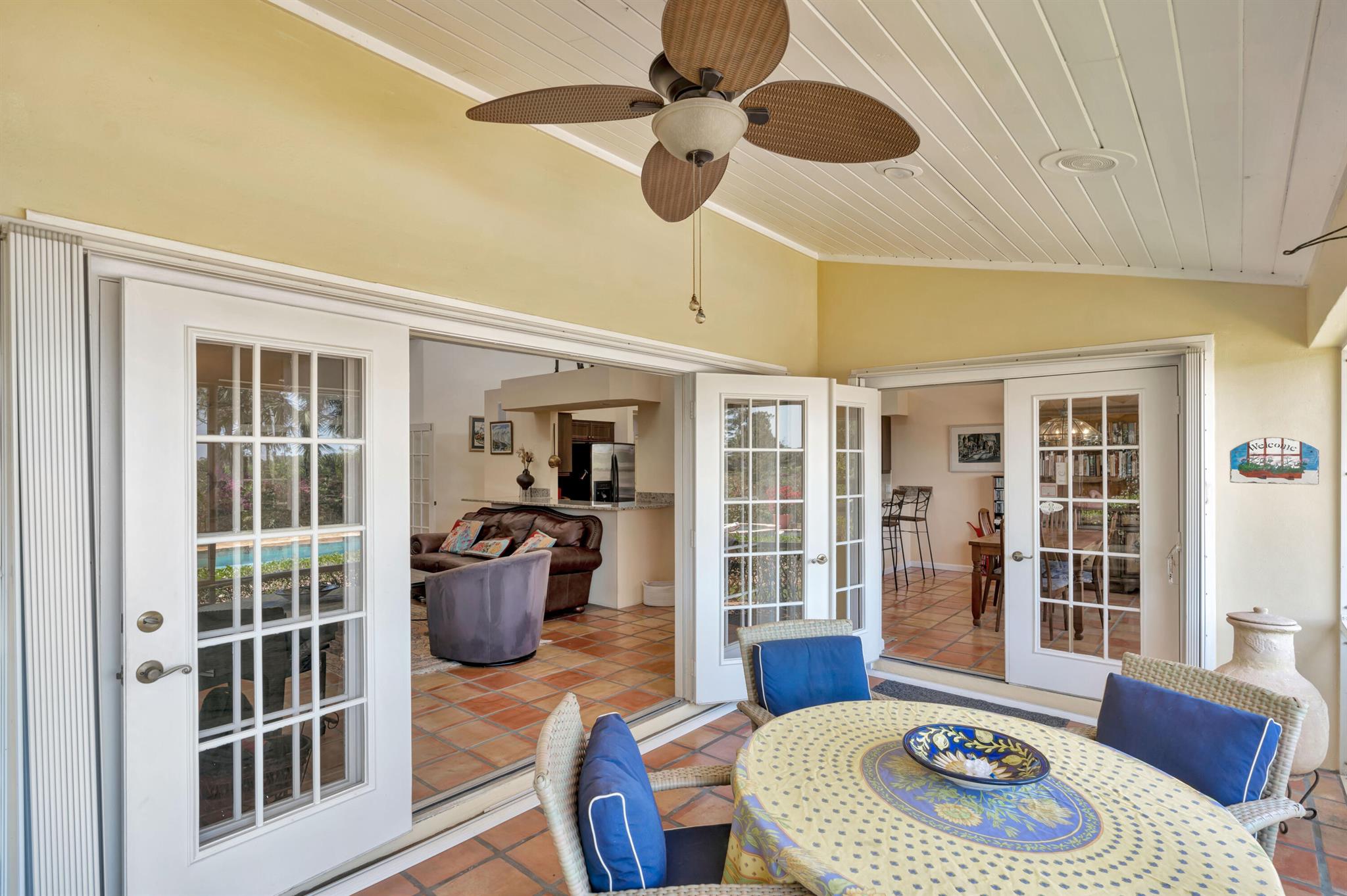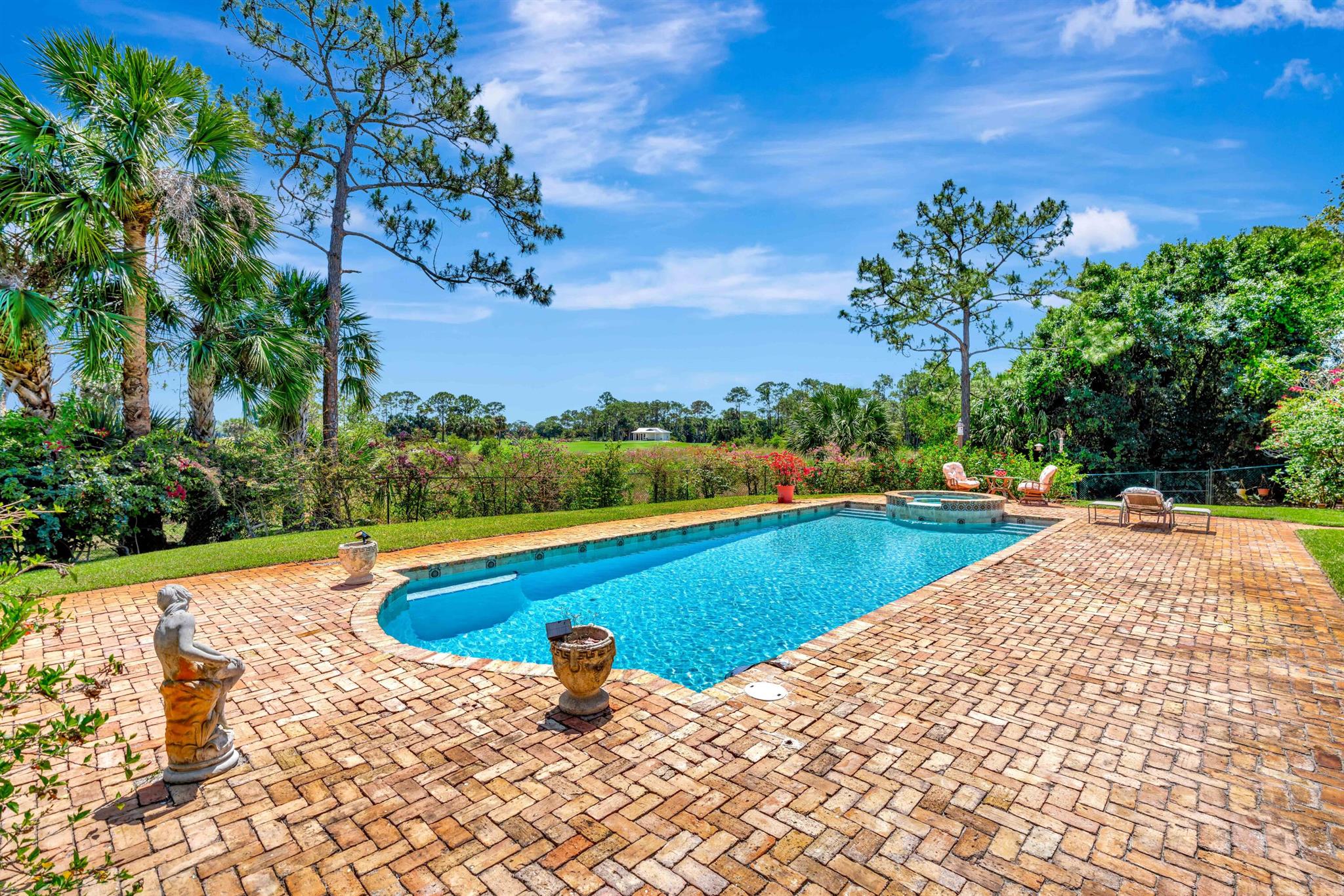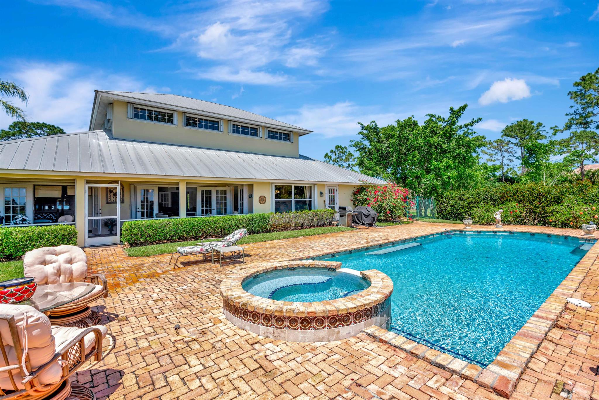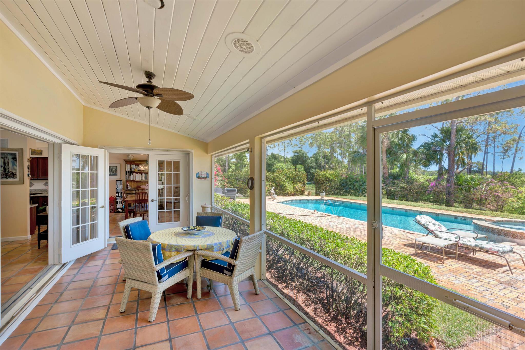 Old Trail at Ranch Colony is the ideal golf home -.9 acre set in a conservation area - commanding views of the fifth hole of the brand-new Gil Hanse designed course on the Jonathan's Landing Old Trail Golf Course. Stunning home with 18-foot ceiling has four bedrooms, two and one-half baths, office, large laundry room, and updated kitchen. Dining Room and large Florida Room overlook a landscaped, fenced yard with 40' pool set in brick paver pool deck. Hibiscus, and bougainvillea provide a colorful backdrop.House measures 2,288 SF under air and 3,308 SF total. Home updated in 2019 with new lighting system, new Trane HVAC, and new microwave. Master is large, with access to Florida room, and features a new bath in 2015 with walk-in shower and over-sized closet. 24/7 Manned Gate Community