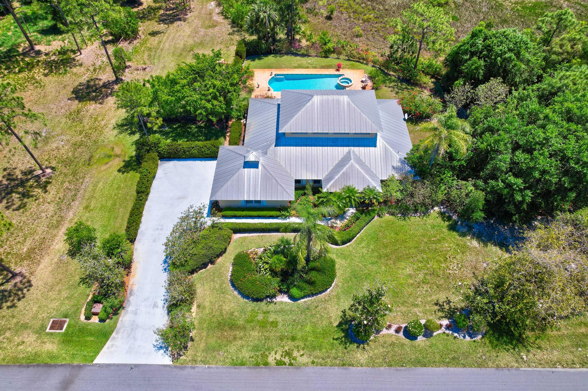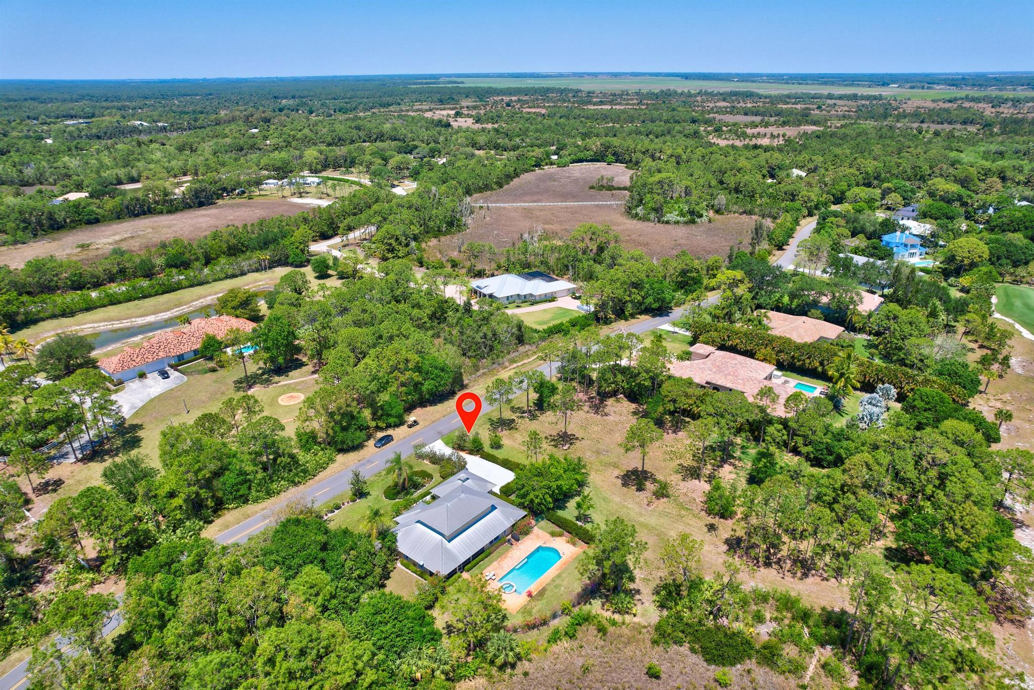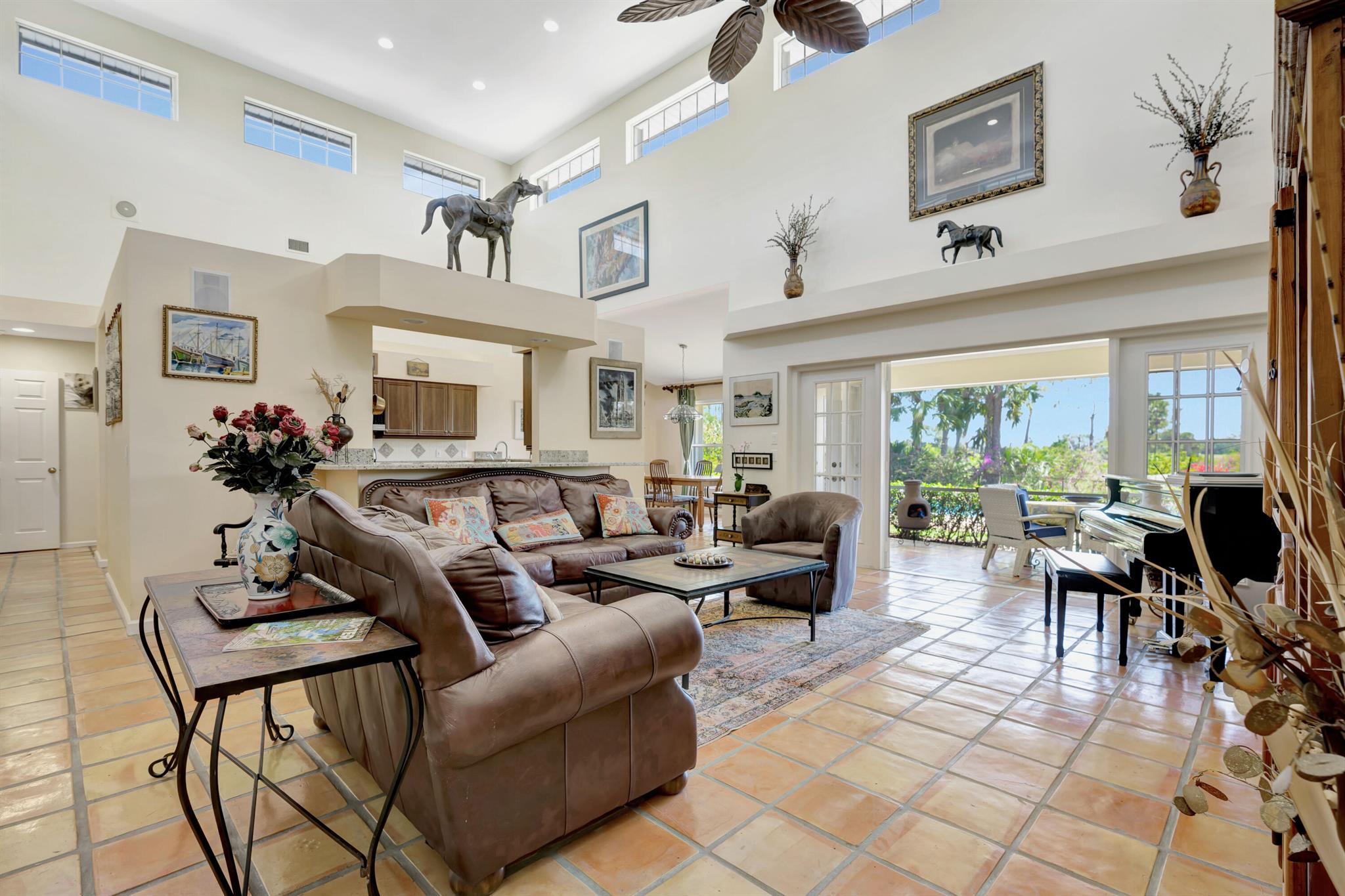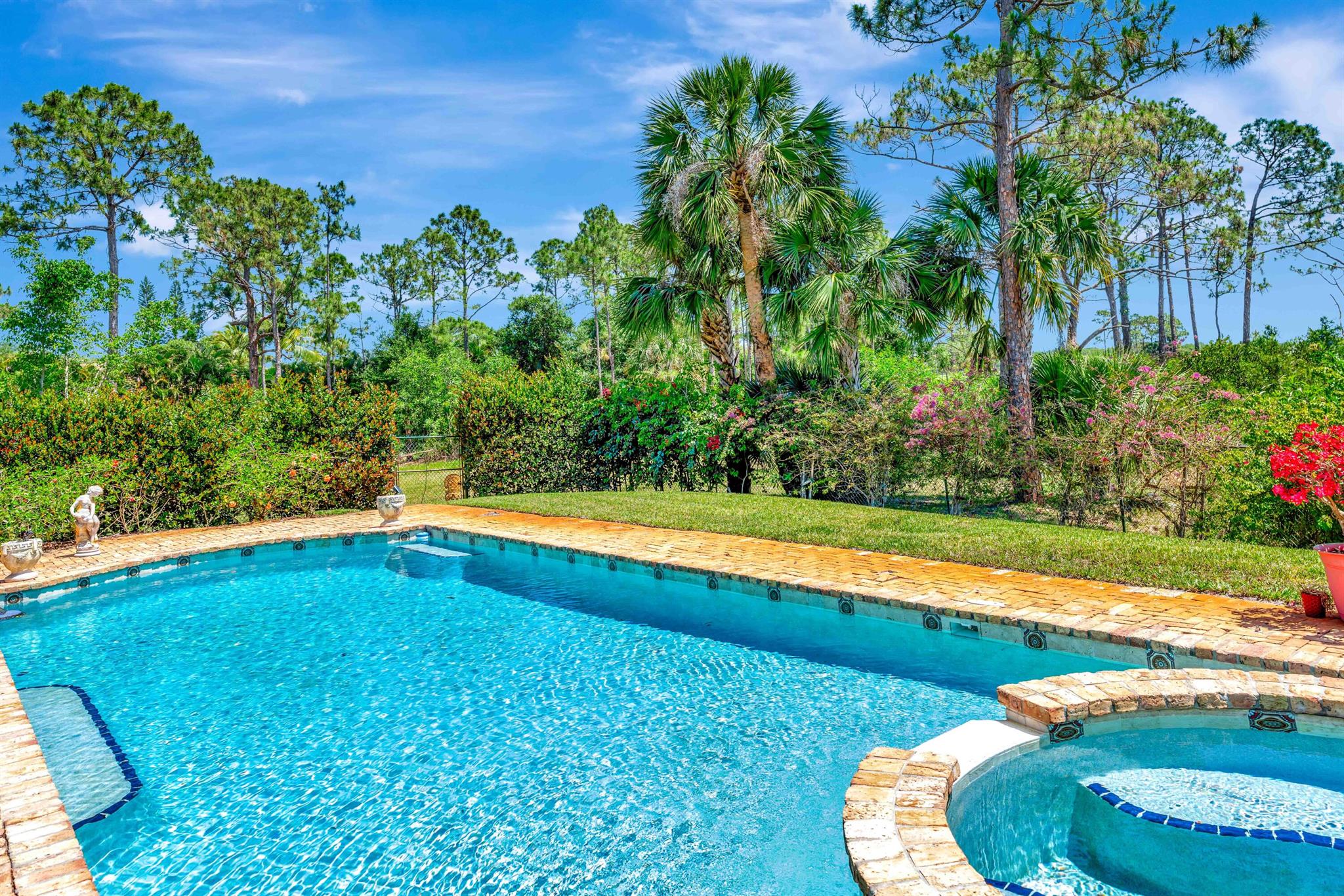 Old Trail at Ranch Colony is the ideal golf home -.9 acre set in a conservation area - commanding views of the fifth hole of the brand-new Gil Hanse designed course on the Jonathan's Landing Old Trail Golf Course. Stunning home with 18-foot ceiling has four bedrooms, two and one-half baths, office, large laundry room, and updated kitchen. Dining Room and large Florida Room overlook a landscaped, fenced yard with 40' pool set in brick paver pool deck. Hibiscus, and bougainvillea provide a colorful backdrop.House measures 2,288 SF under air and 3,308 SF total. Home updated in 2019 with new lighting system, new Trane HVAC, and new microwave. Master is large, with access to Florida room, and features a new bath in 2015 with walk-in shower and over-sized closet. 24/7 Manned Gate Community