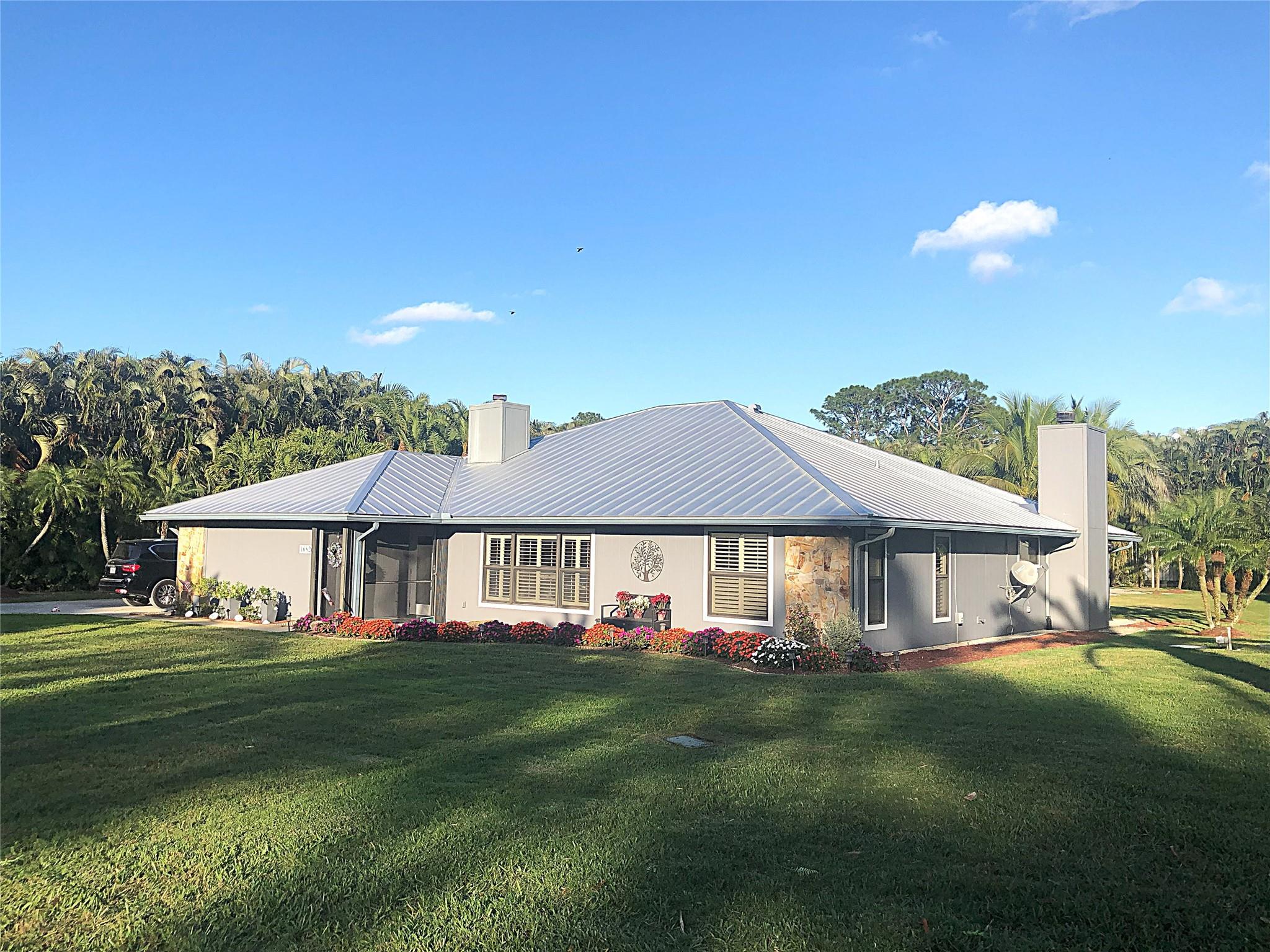 Beautiful 3/2, two car garage in Jupiter Farms featuring New 2024 standing seam metal roof on main and guest house, Main home is 2501 sf, under air with split plan. Completely Fenced In! Hurricane impact windows and sliders on main and guest house. Updated detached 500 sq ft 1b/1b guest house /or In- Law suite that is completely furnished with plantation shutters, full kitchen and bath, New tankless water heater, 2 ton a/c, TV, and an all in one Smart LG W/D combo. Main home features granite counter tops and ample cabinetry, pantry, 900 sf great room with fireplace, wet bar, LG appliances, convection oven, microwave, refrigerator, and dishwasher. Brand new W/D with 5 yr warranty. Two wood burning fireplaces, plantation shutters, new wood flooring throughout, 5 ton a/c.