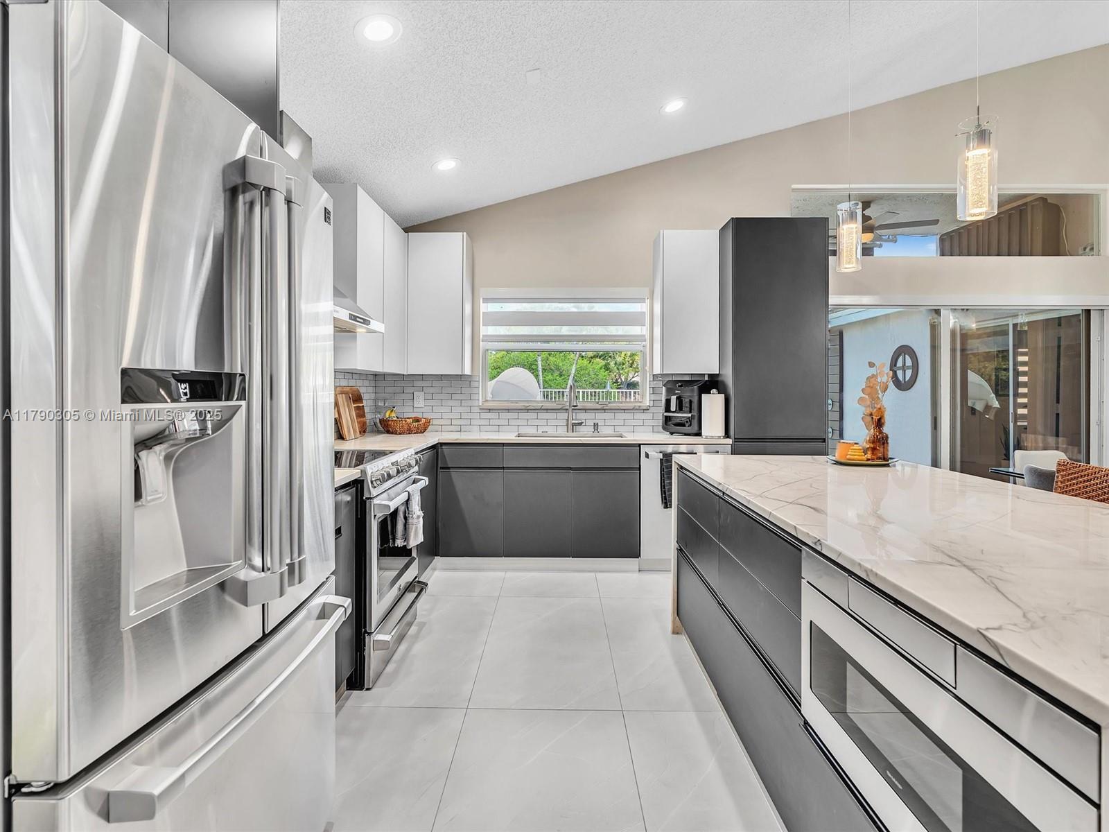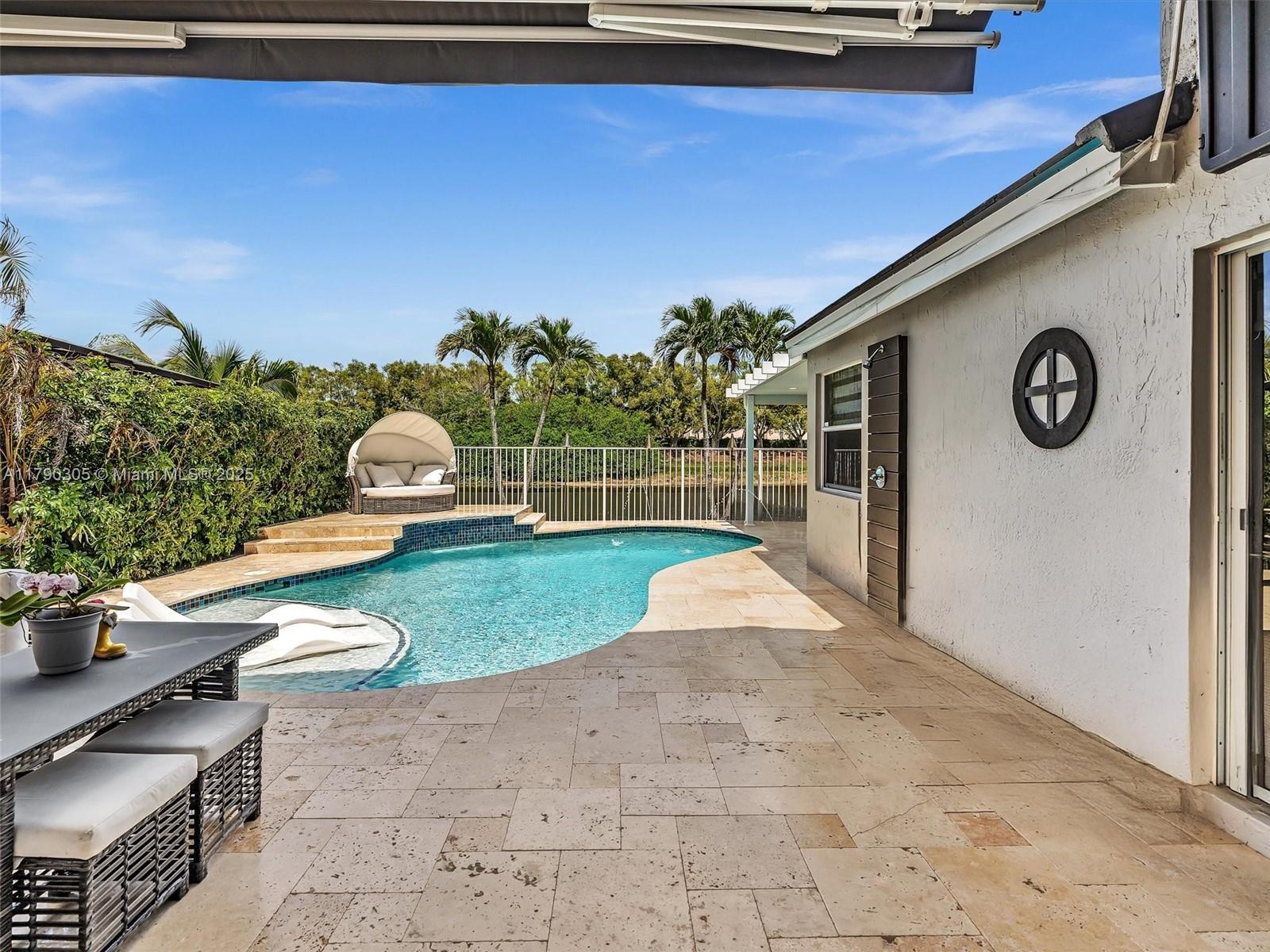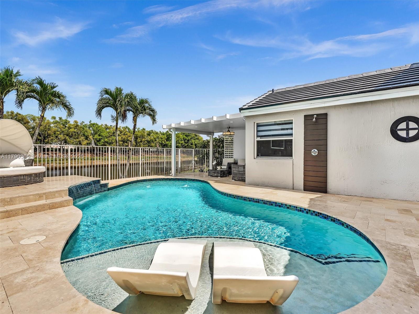 Stunning lakefront pool home in The Falls, Weston. Fully renovated & move-in ready! New 2025 roof, 2024 exterior paint, tile in living, luxury vinyl floor in bedrooms. Modern kitchen & baths with quartzite counters. Custom wall unit with electric fireplace. Saltwater pool with travertine deck, LED lights, and heater. Electric awnings, additional pergola, outdoor shower, aluminum fencing. 2023 Rheem A/C, zebra shades, electric rollers on sliders. Travertine paver driveway. Gated community with A+ schools. Easy to show!! Bring your buyers.
