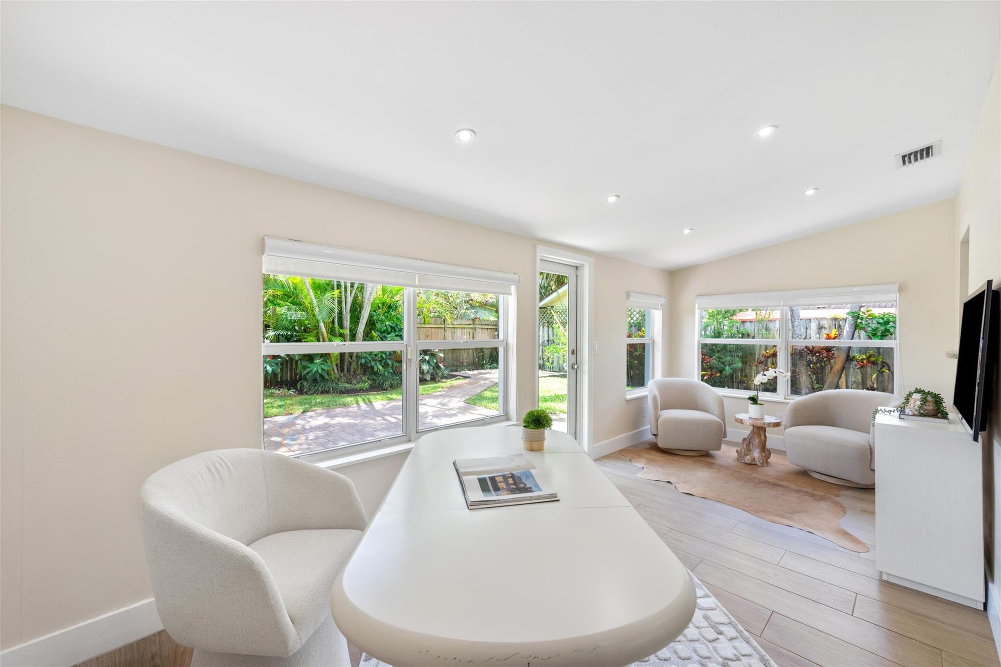 This home is in the sought-after Poinsettia Heights community combines original character with practical improvements. Featuring impact windows and doors, a newer roof (2012), and ceramic flooring with a wood-like appearance. The kitchen offers stainless steel appliances and granite countertops for daily functionality. Updated bathrooms include a rain shower, while the home's layout features a Florida room/den for additional living space. Practical elements include interior laundry, California closets for better organization, and a tankless water heater. Outside, find a fully fenced yard with tropical landscaping, a well-water sprinkler system, and space for a pool. One-car garage with overhead storage completes this solid property with inherent charm.
