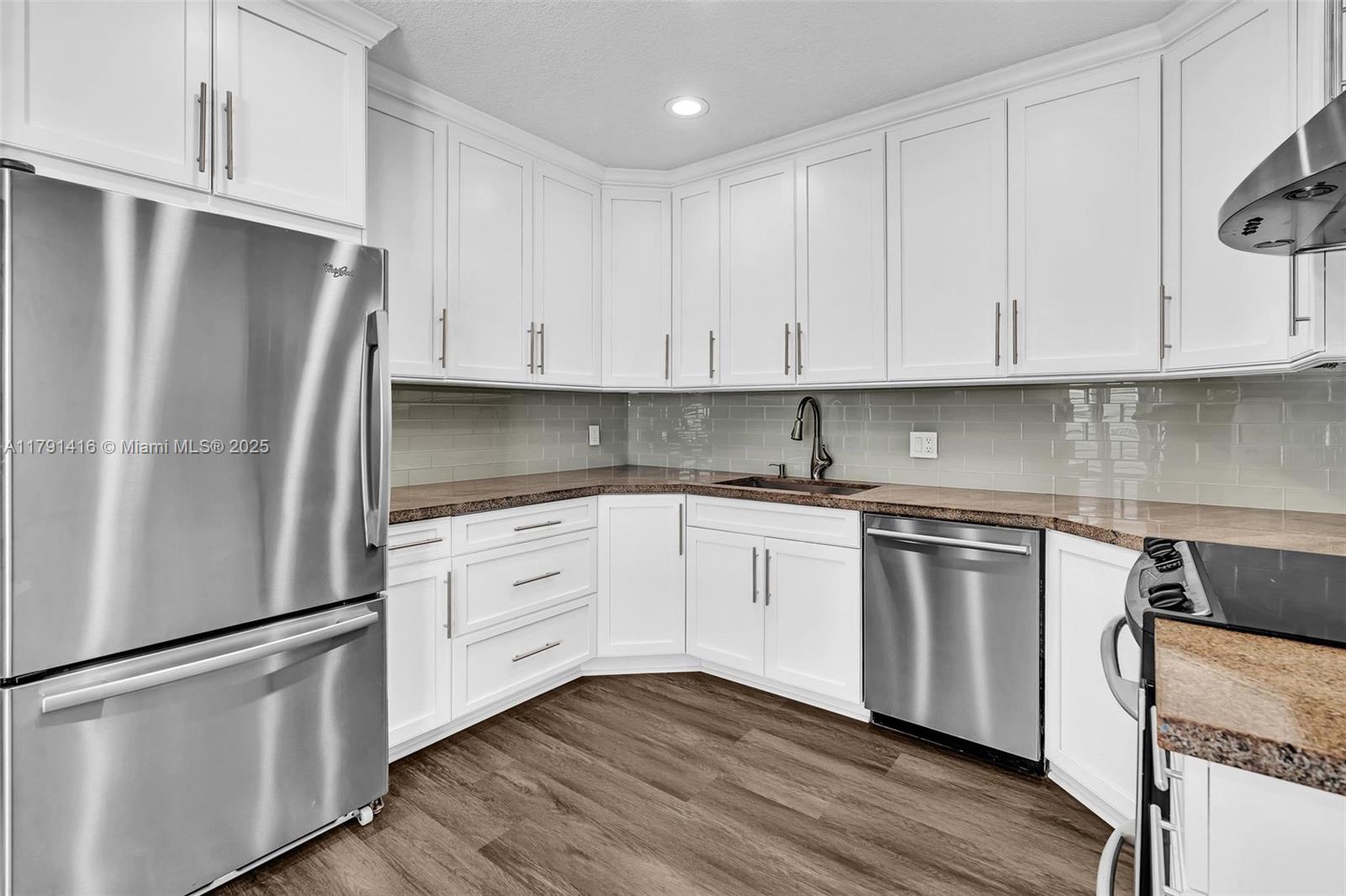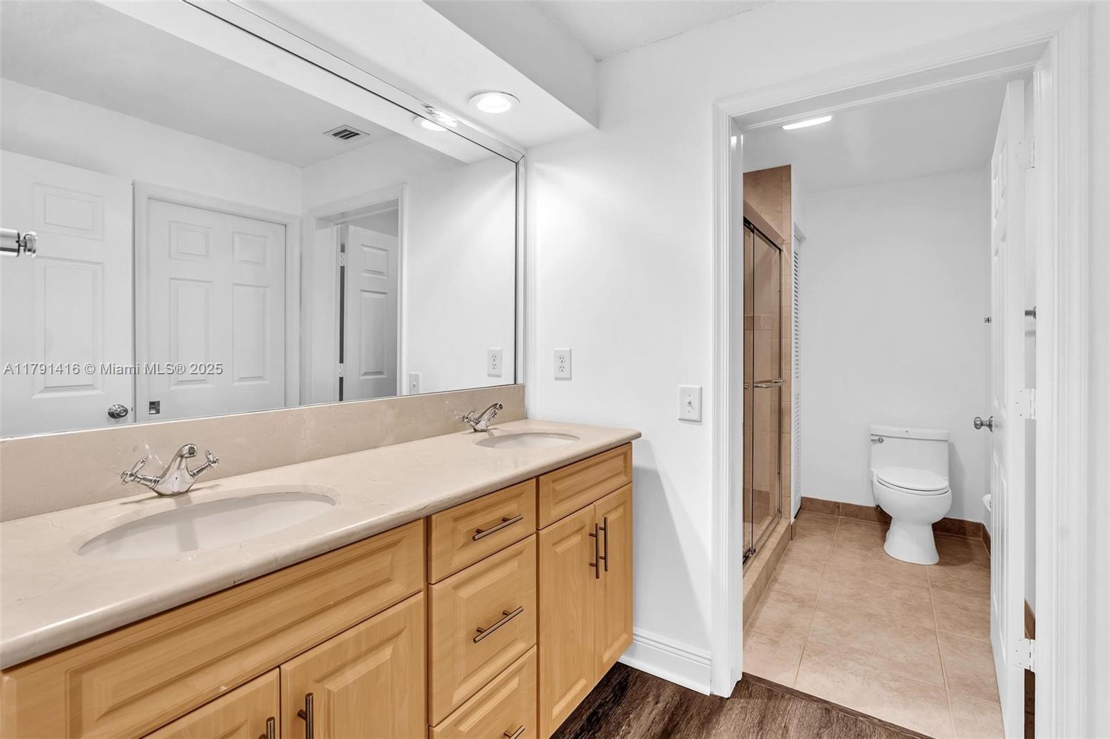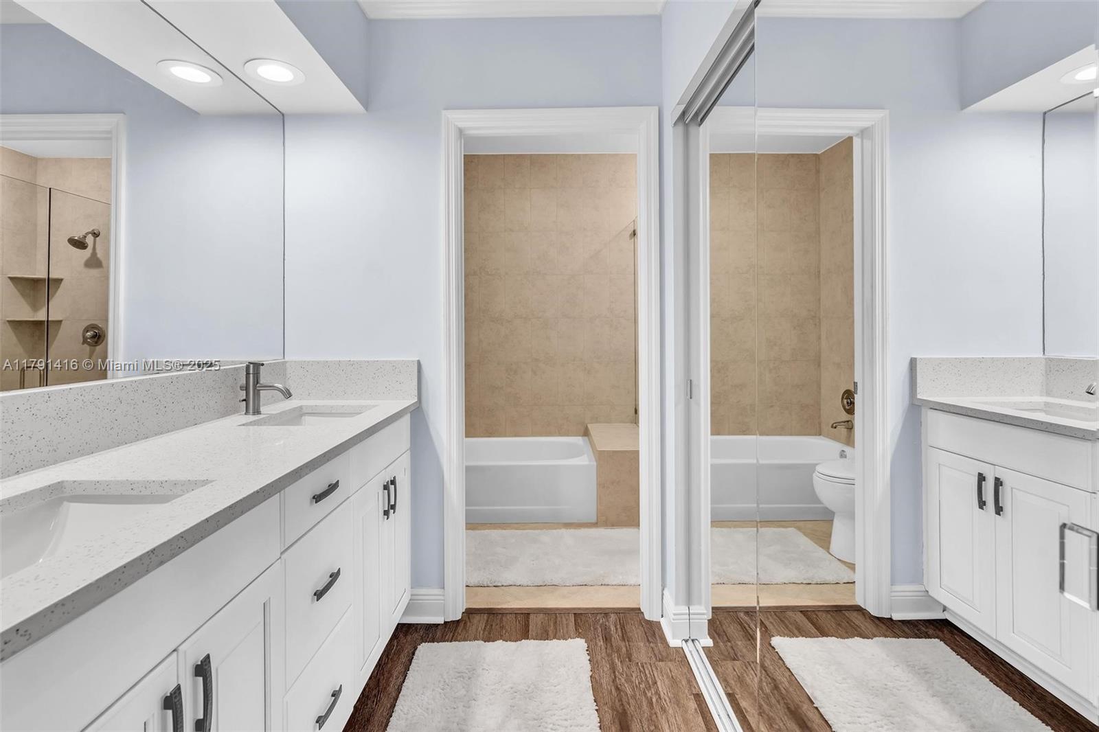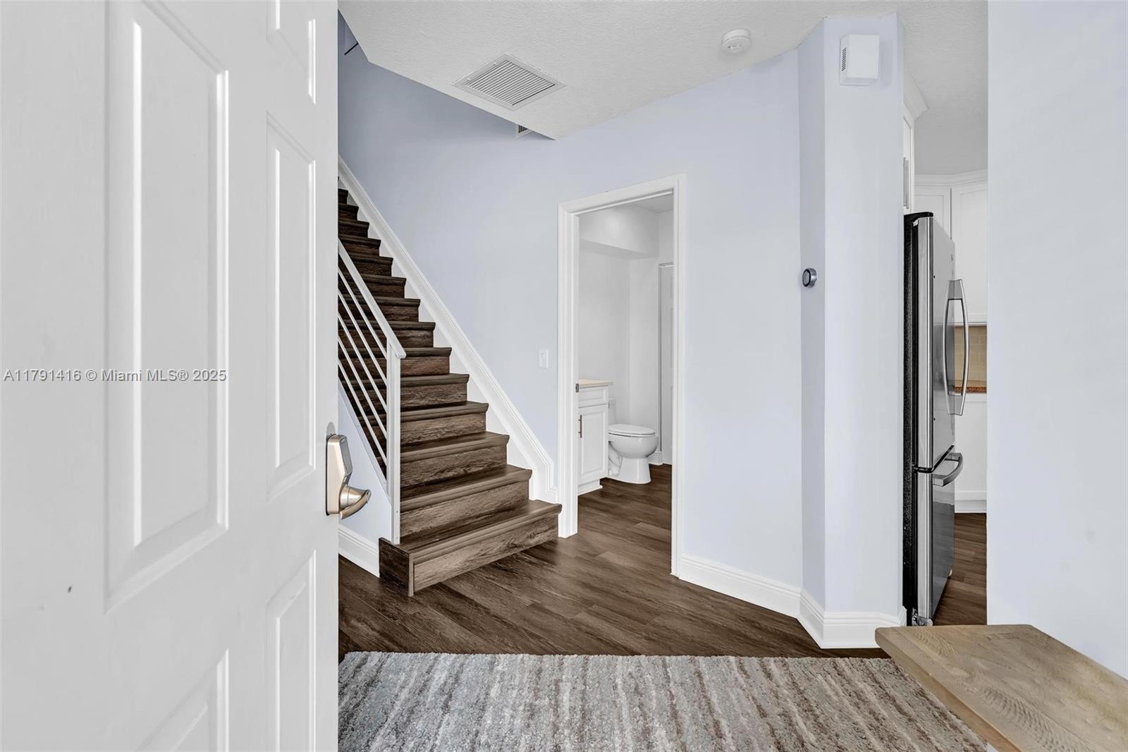 Welcome to this massive 2 story 3 bed +den (4th bedroom/office/den) 2.5 bath totally renovated incl NEW 2025 roof being done now and NEW 2025 exterior white paint. This home looks and feels like a single family home with the master bedroom down! Almost everything new new new in this house incl: new hardwood floors throughout, quartz countertops, new paint throughout, custom blinds, and more! Super sleek clean feel with the 2 master suites and both master baths up and down offering dual vanity sinks, tub and standup shower down; 2 outdoor spaces incl screened in porch down, patio up on the quiet water! Low hoa incl almost everything: exterior insurance, roof, lawn, alarm, water, cable and pool/spa, gym; Attached 2 car extra large new garage interior w/ new tile+paint!
