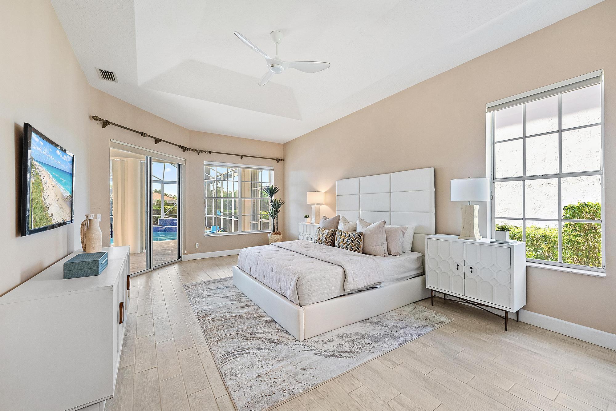 With incredible lake views from the front of this home, and an oversized pool and spa overlooking golf views in the back, this home is beautifully situated near the epicenter of Ibis. 3BR/3BA+Den home with a light and bright SOUTH EAST exposure in the rear of the home. The 2700 square feet under air expands graciously to the covered patio, and over-sized, fully screened-in lanai. This home boasts a 2013 roof, a resurfaced pool with new pavers (2017) and new pool pump in 2023. The generator was added in 2018 as was the hot water heater replaced in that same year. The dishwasher was updated in 2019 and Impact Glass front doors in 2021. Electric car 220 line added in 2024. The electrical box was replaced in 2022. Luxurious and stately, neutral designer touches throughout.