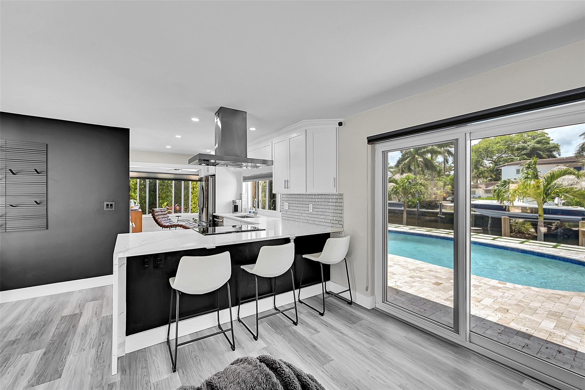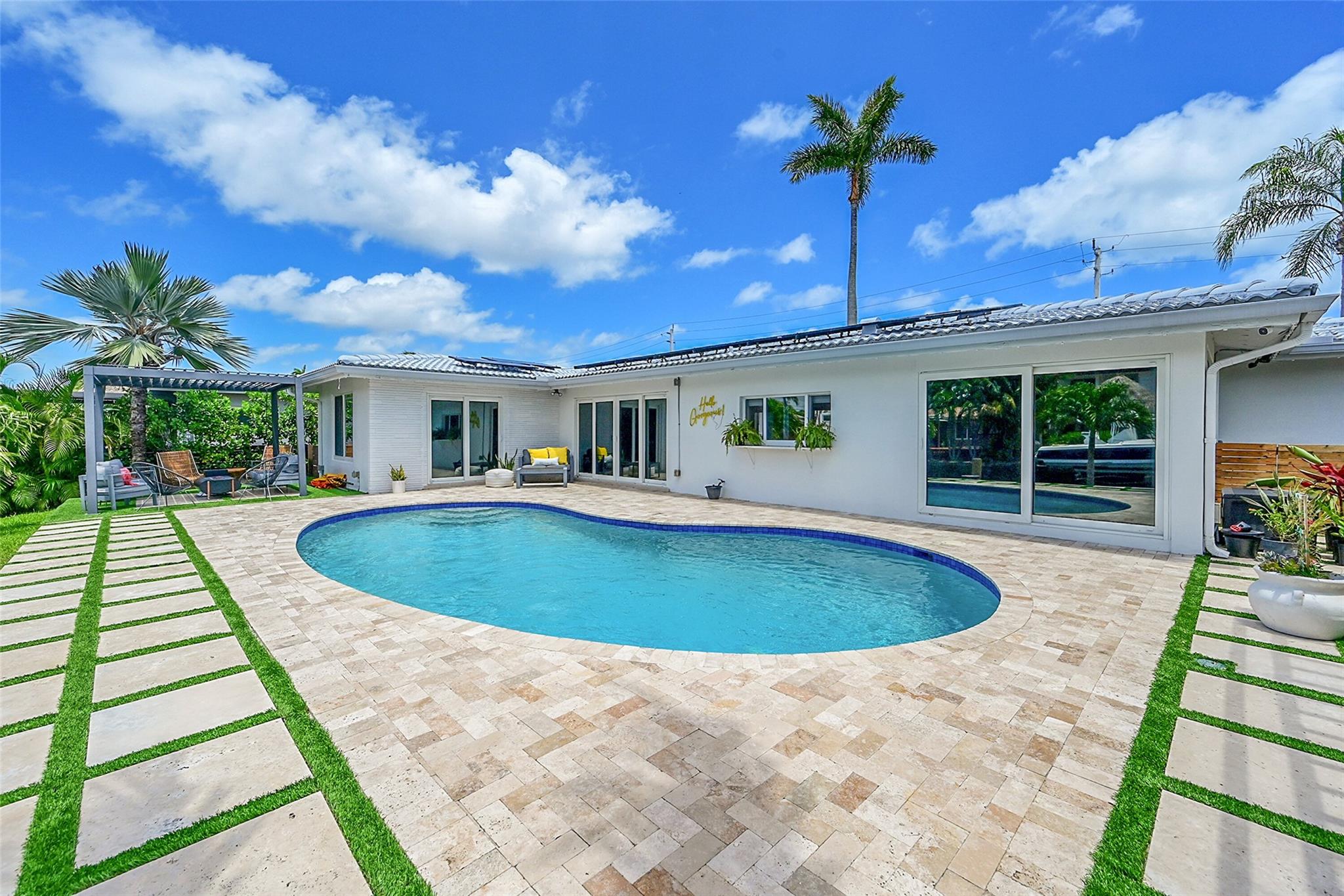 Beautifully remodeled waterfront home with ocean access in Pompano Beach. This 3 bed, 2 bath split floorplan home offers 80' of water frontage and a beautiful outdoor area perfect for entertaining. Solid wood cabinets, quartz countertops, stainless steel appliances, wine fridge, smart lighting, travertine pool deck and front walkway. Features include a saltwater pool, solar panels ($30 avg electric bill), EV charger, pantry, and interior laundry room. Hurricane impact windows and doors, and oversized 2-car garage door. Ample closet and storage space. Move right in- completely updated. No HOA.