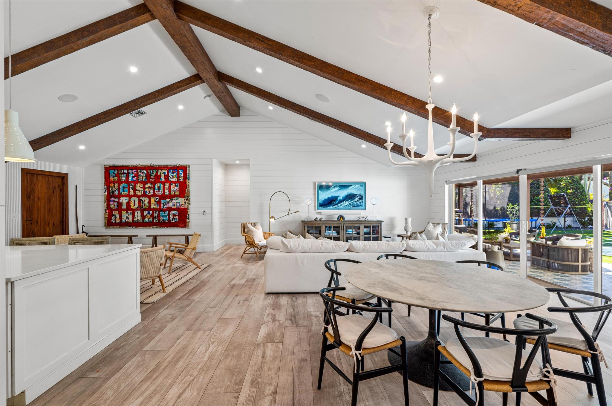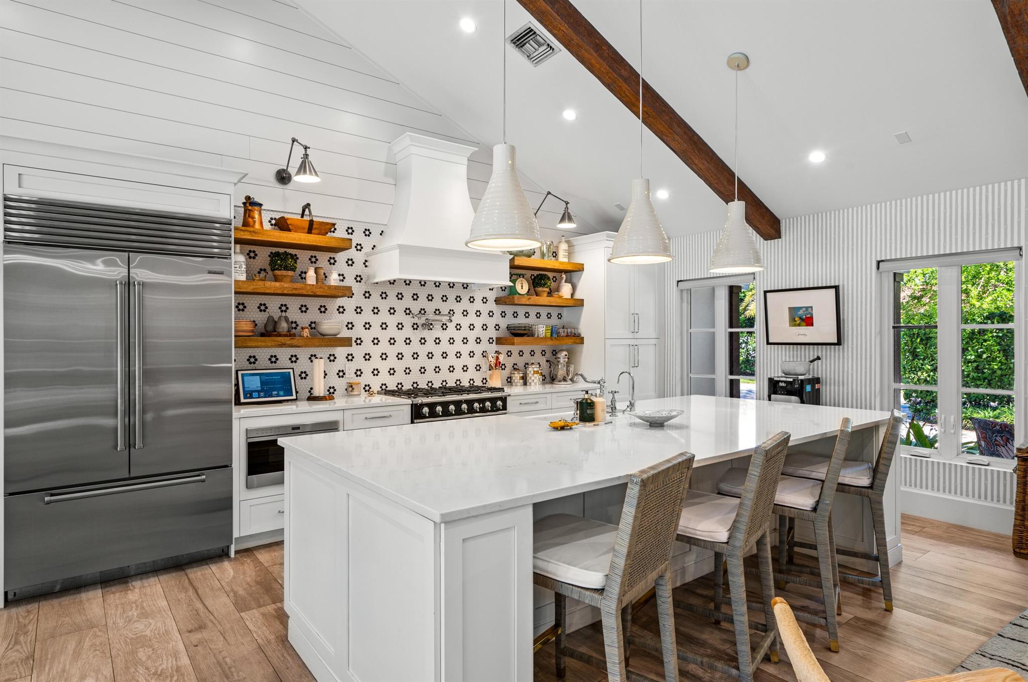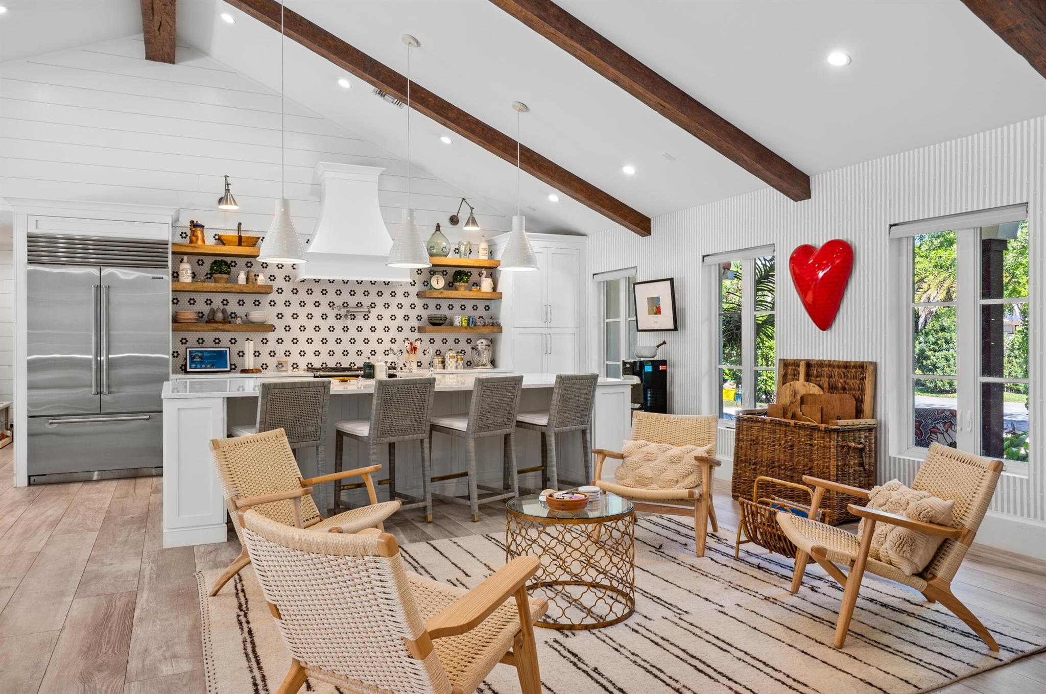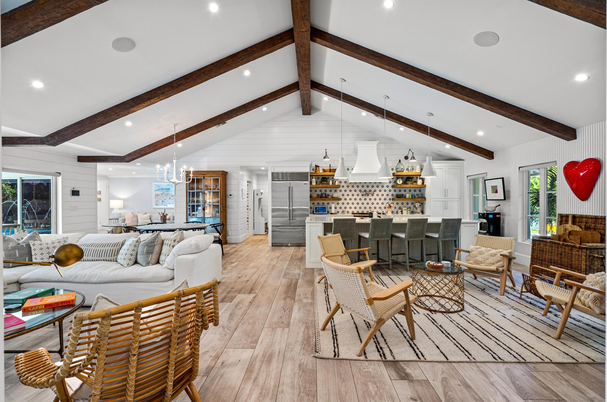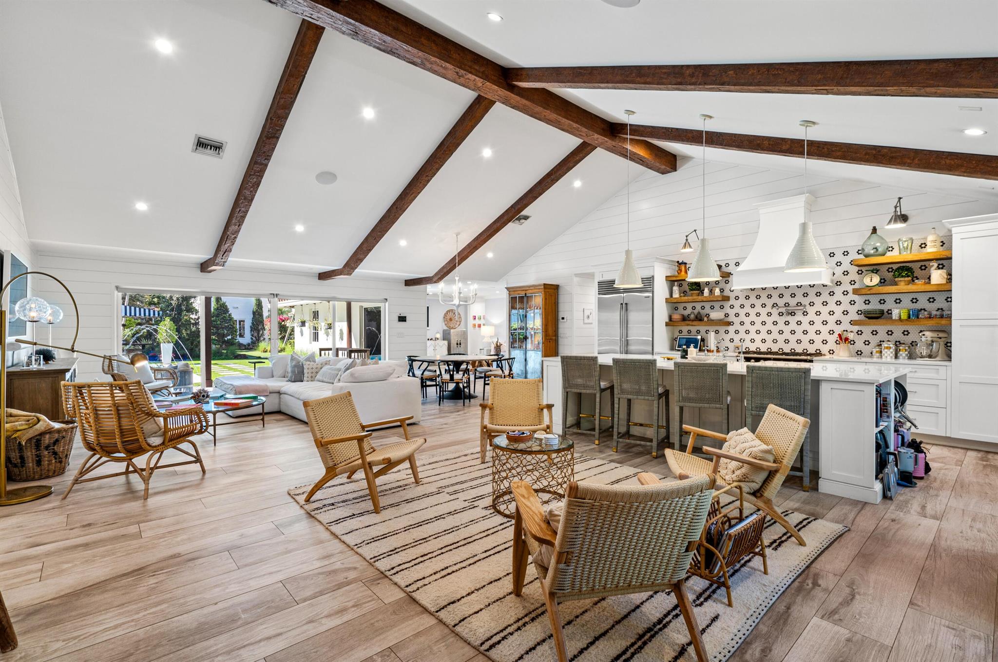 In keeping with Mizner's original Spanish Colonial architectural vision, the front facade is characterized by a triple colonnade of arches, accented with outriggers and wood columns; a front lanai with tongue/groove pecky cypress ceiling and imported hand-painted tile floor; an oversized custom pecky cypress entry door, and pecky cypress-clad garage doors. All of which compliments its contemporary coastal interior. The open floorplan flows from the foyer into a great room, at the heart of the residence, with vaulted rough sawn beam ceiling and shiplap wall treatment.